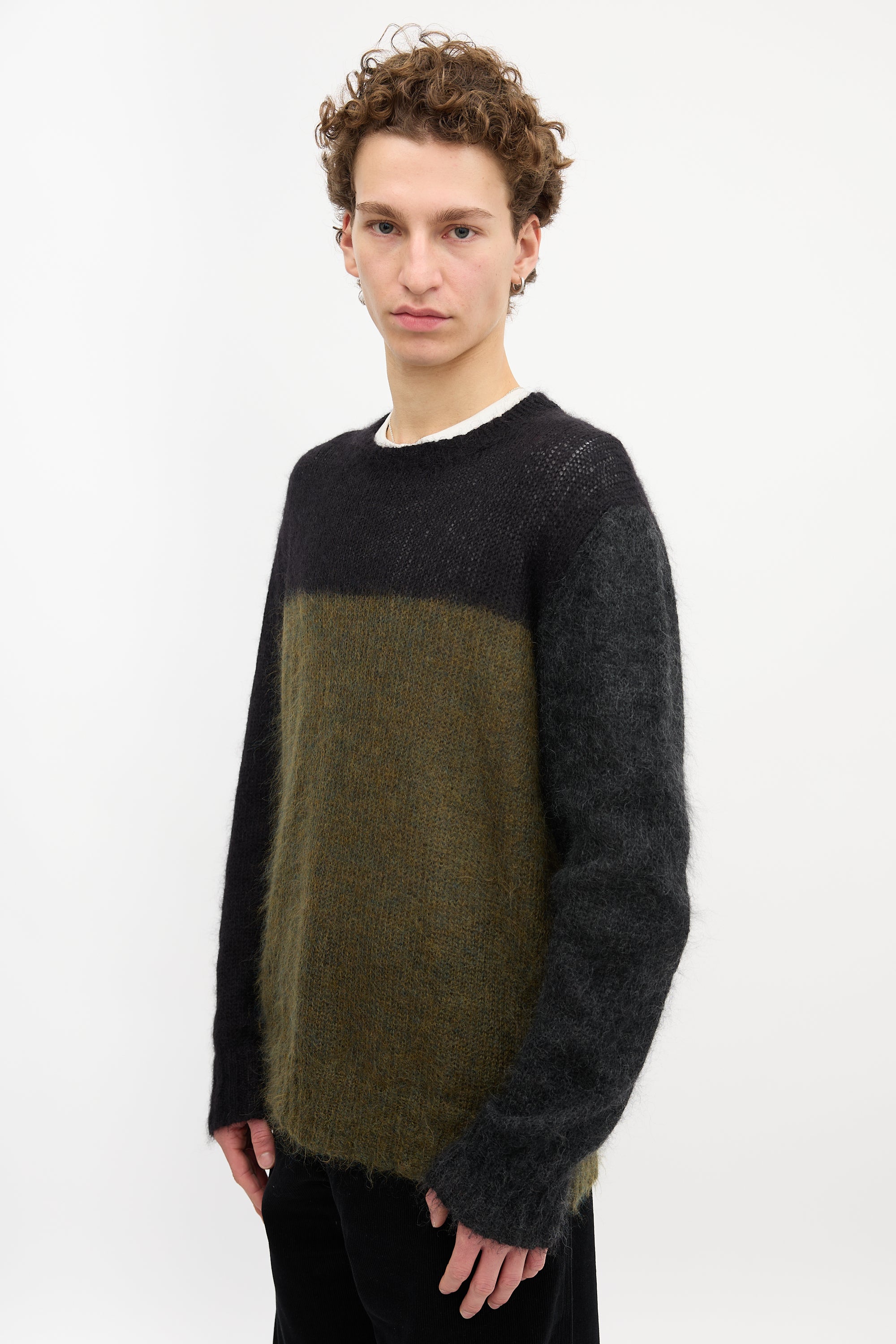 Pre-owned Marni black and green mohair blend colour block sweater featuring a crew neckline, one dark grey sleeve, and a ribbed hem and cuffs.
