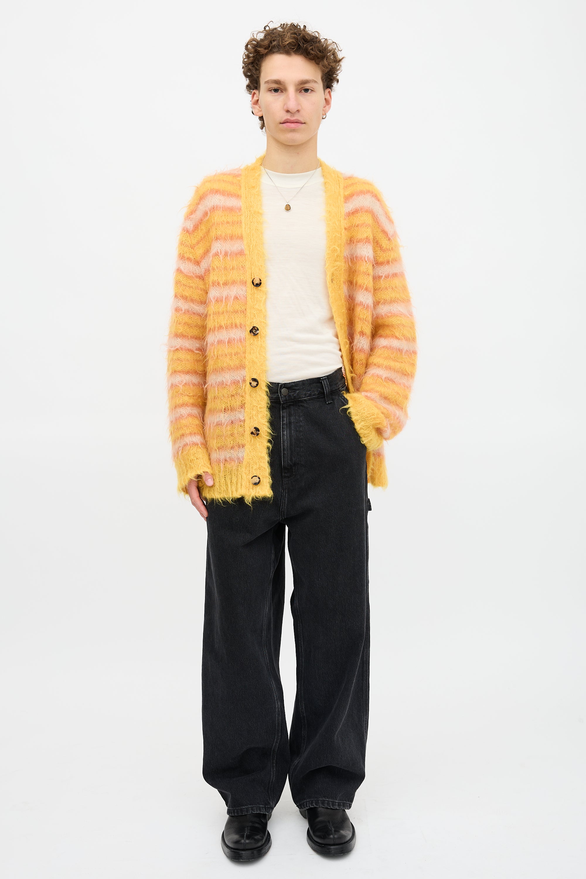 Pre-owned Marni yellow mohair blend cardigan featuring an orange and white striped pattern, button front, and ribbed trim.