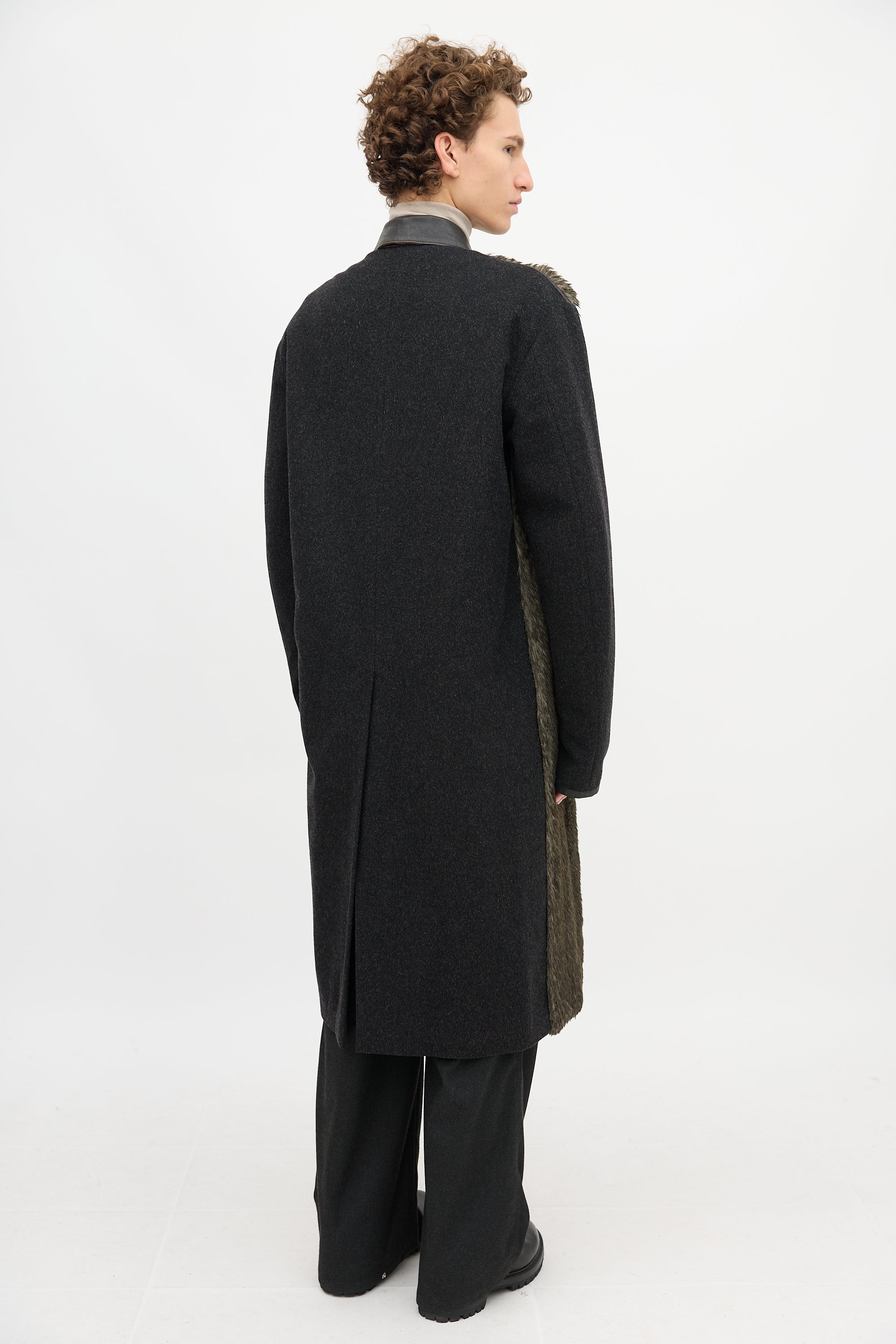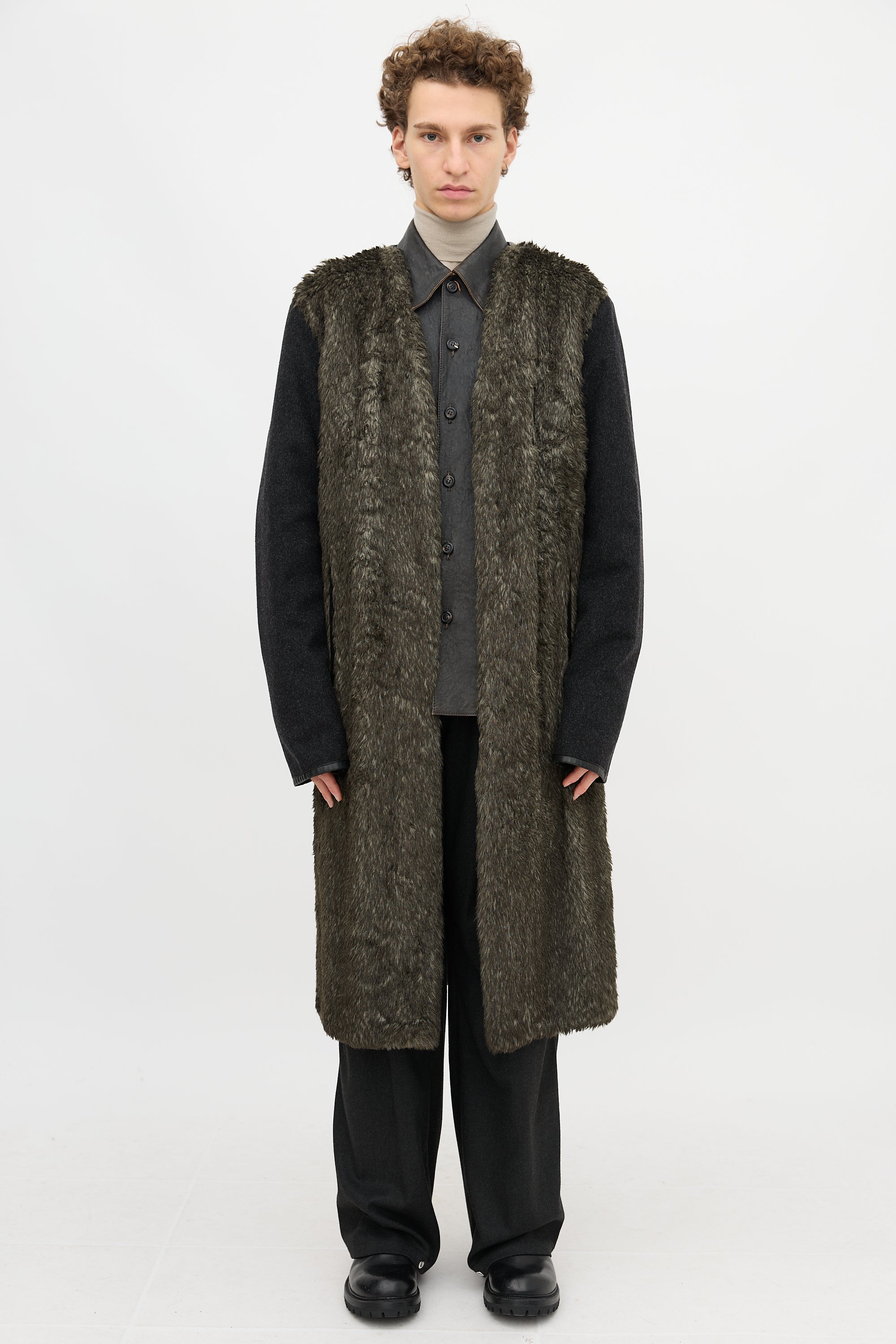 Pre-owned Prada 2009 dark grey wool and brown faux fur coat featuring open front, back vent, leather shoulder trim, and one interior pocket. Lined.
