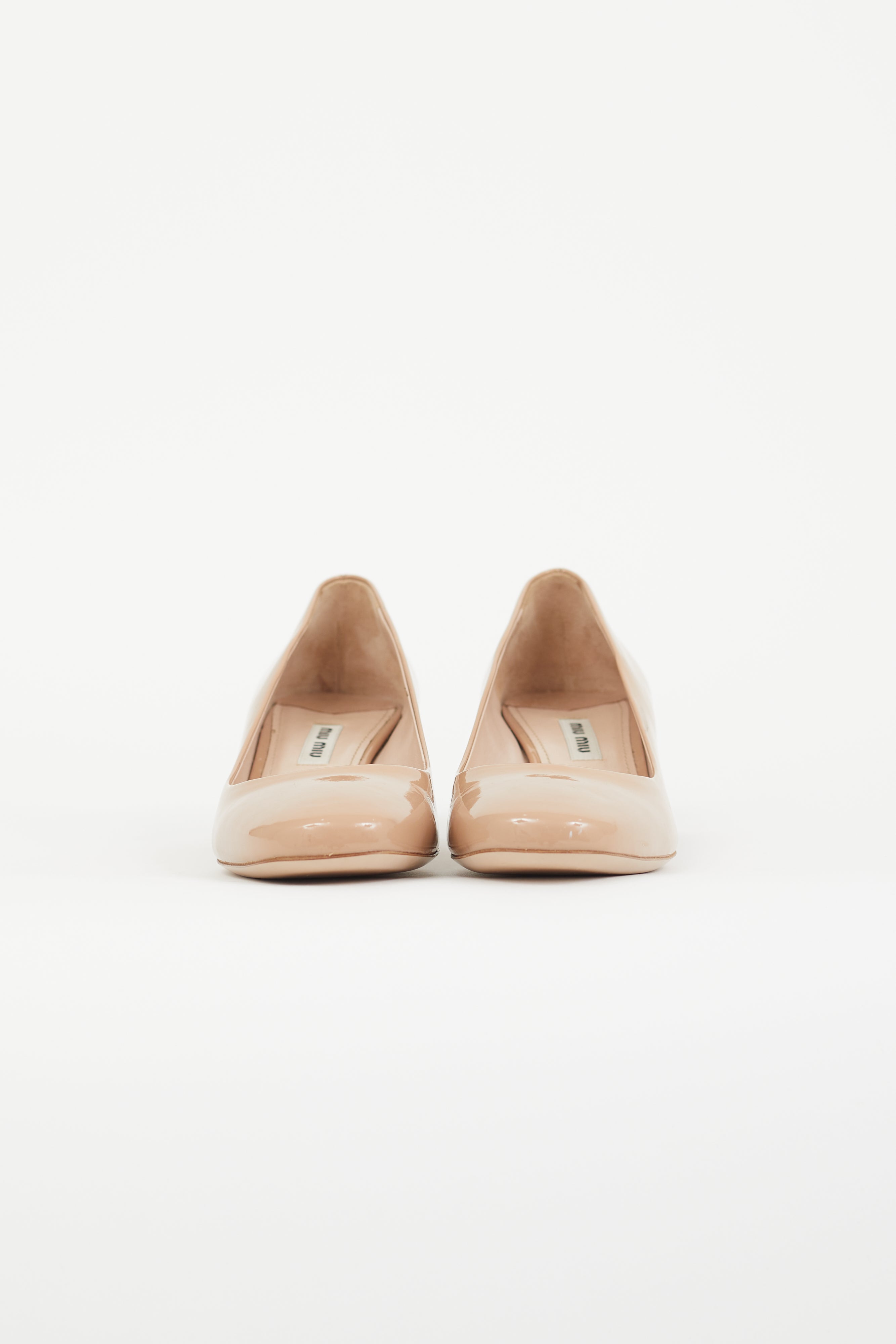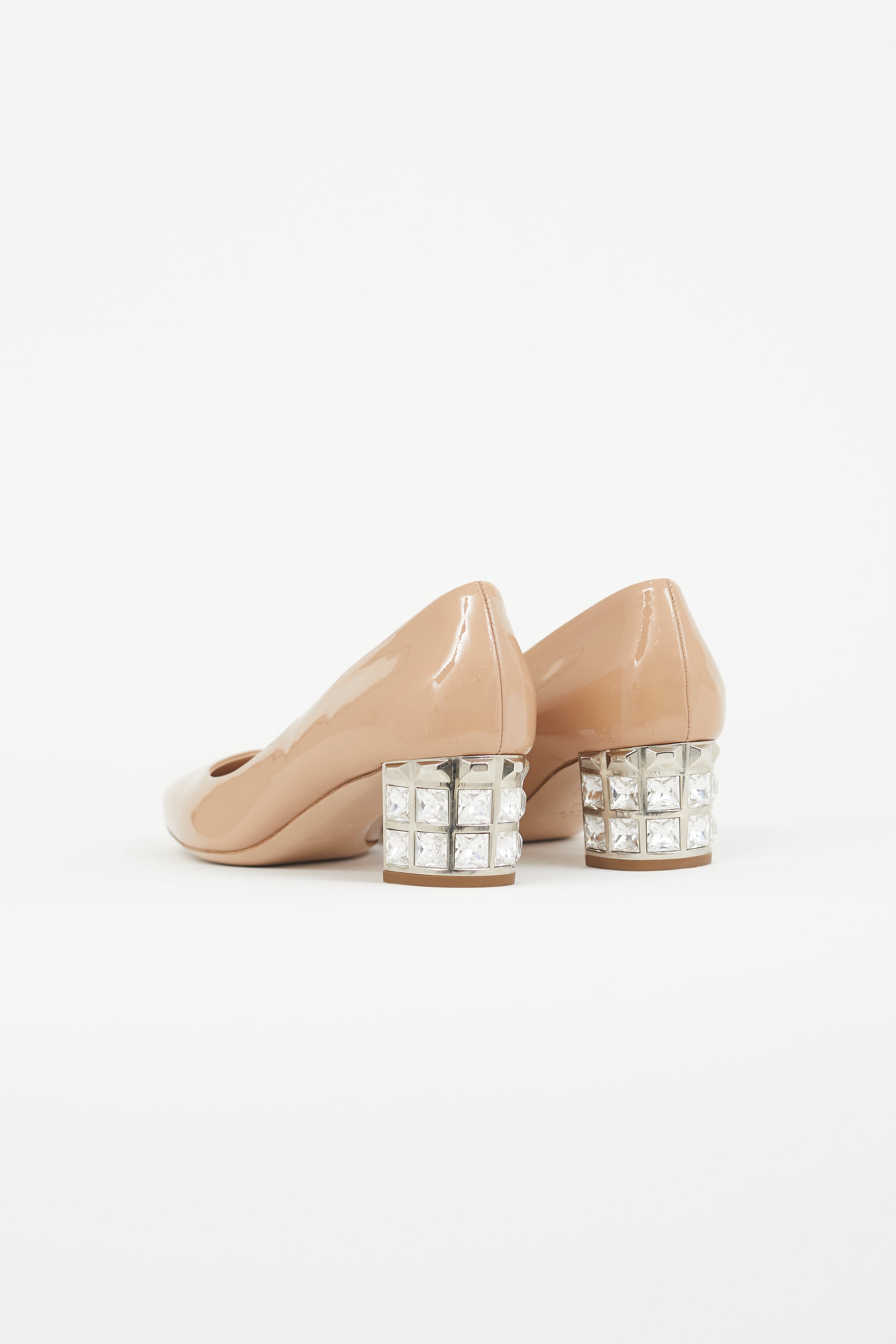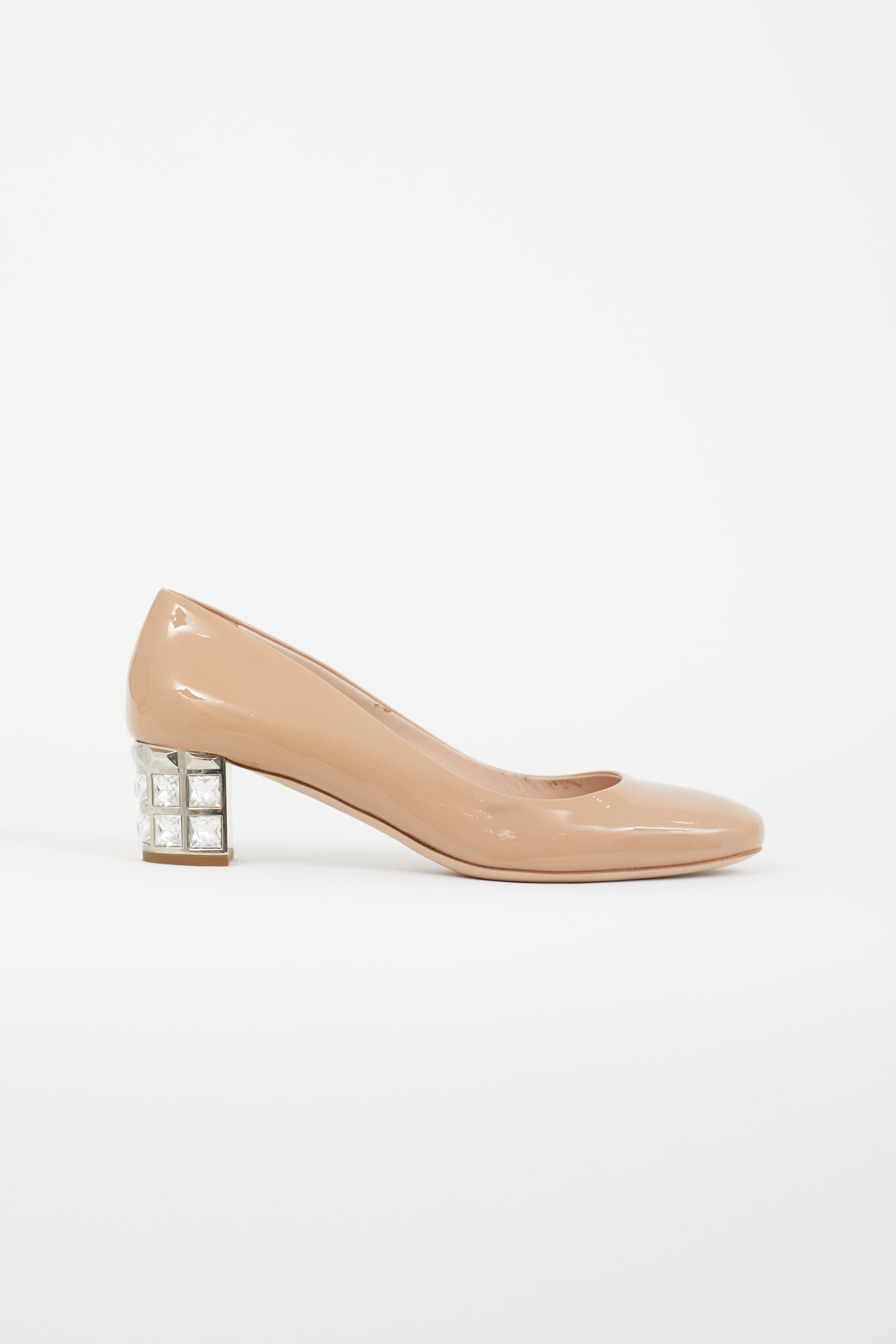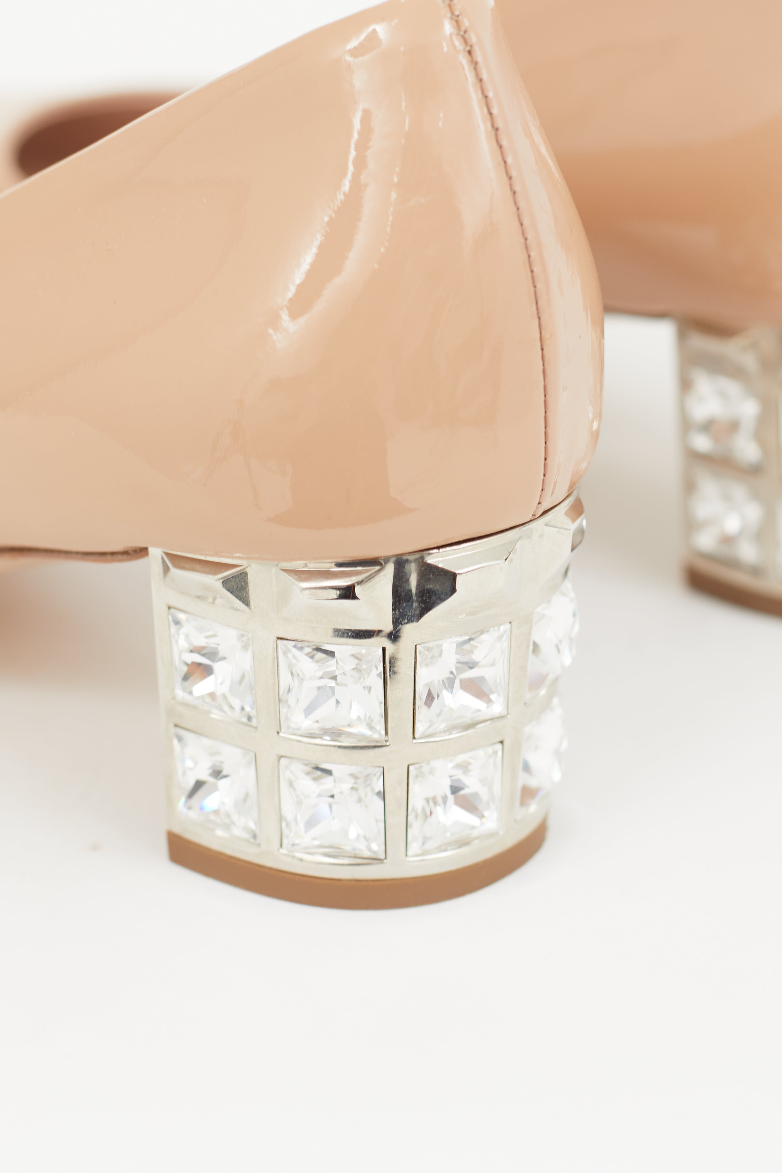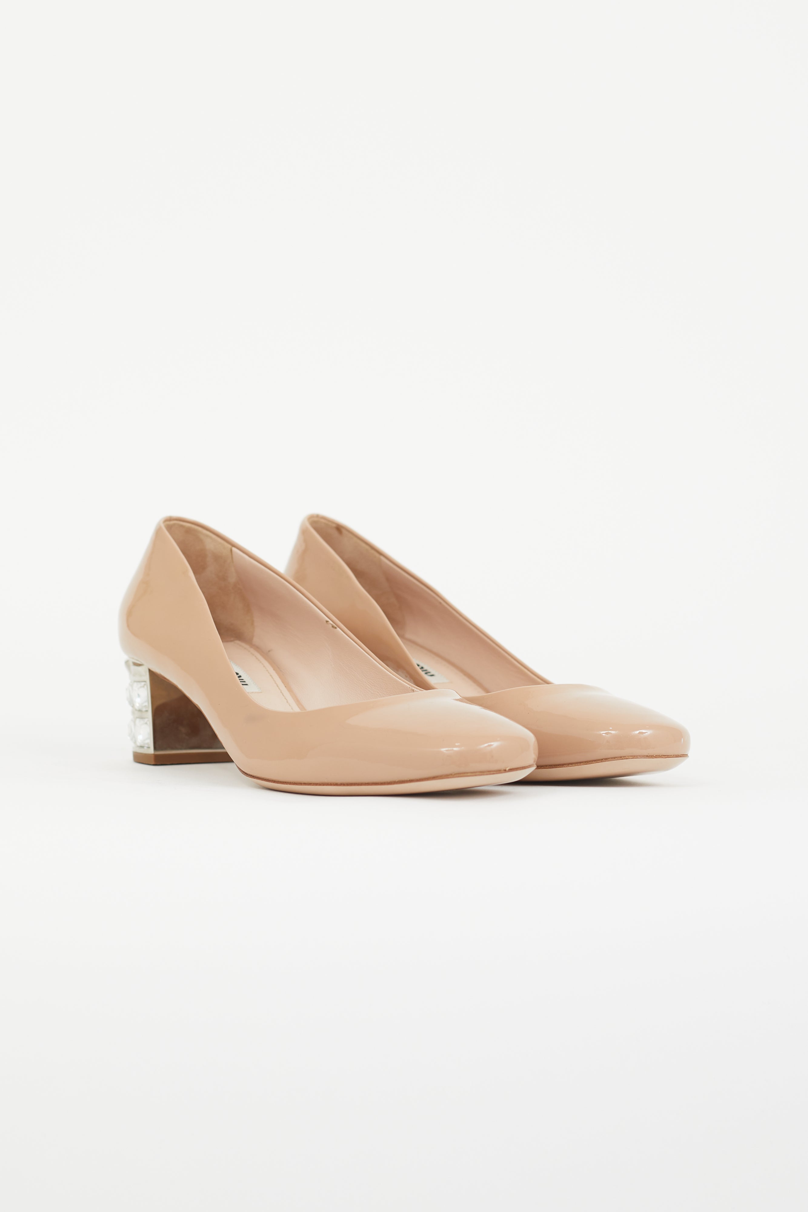 Pre-owned Miu Miu beige patent heel featuring tapered square toe, slip on entry, and crystal embellished block heel.