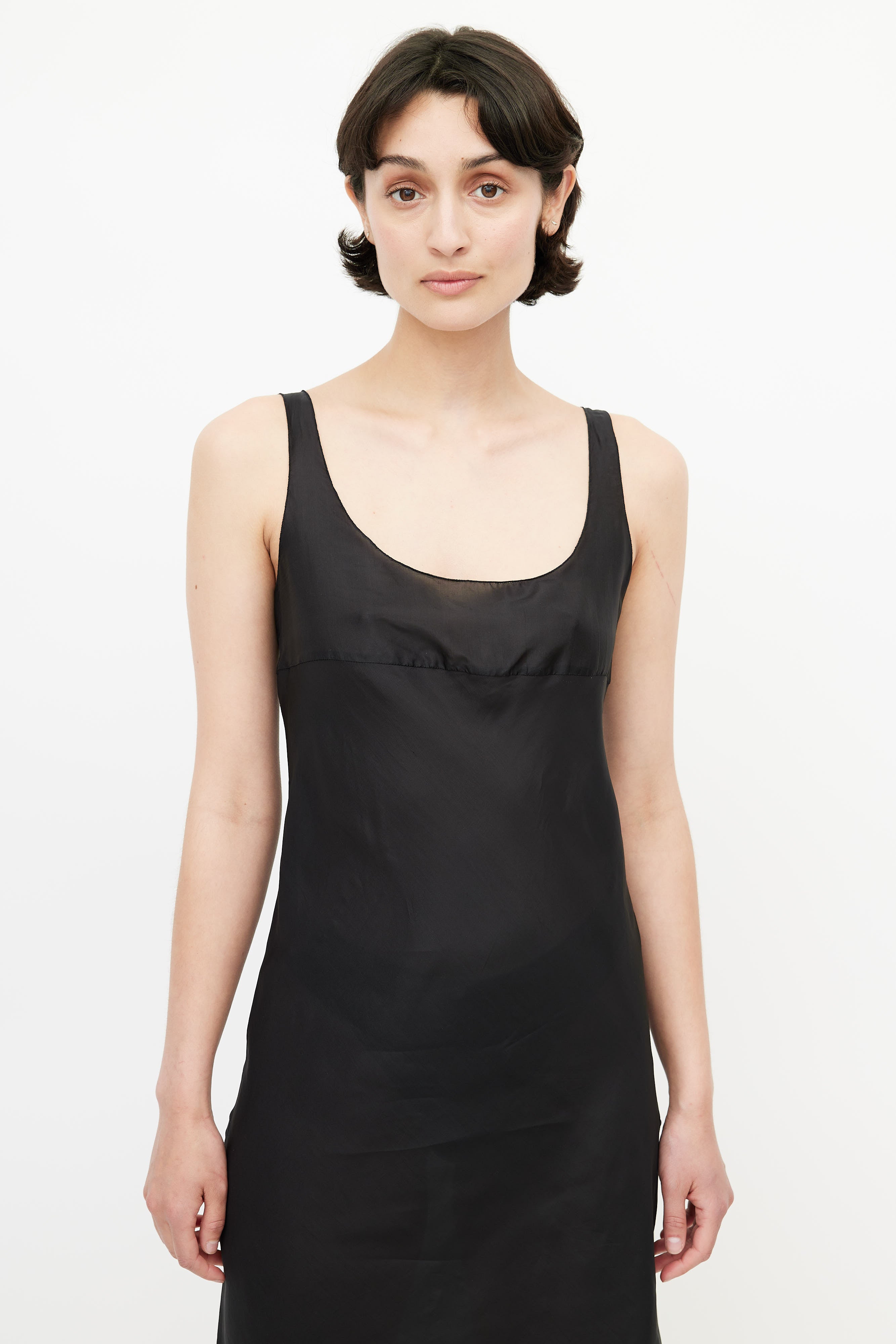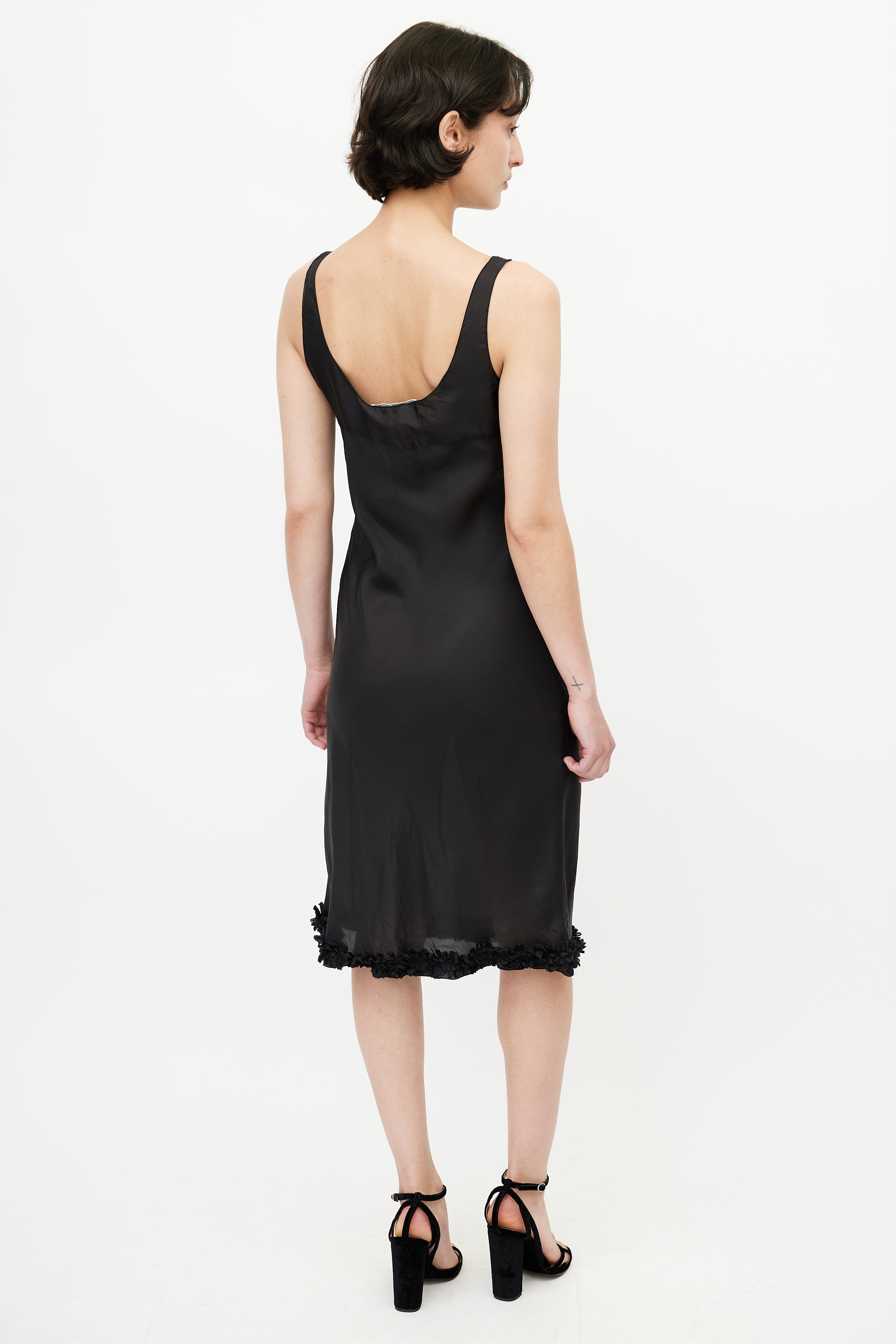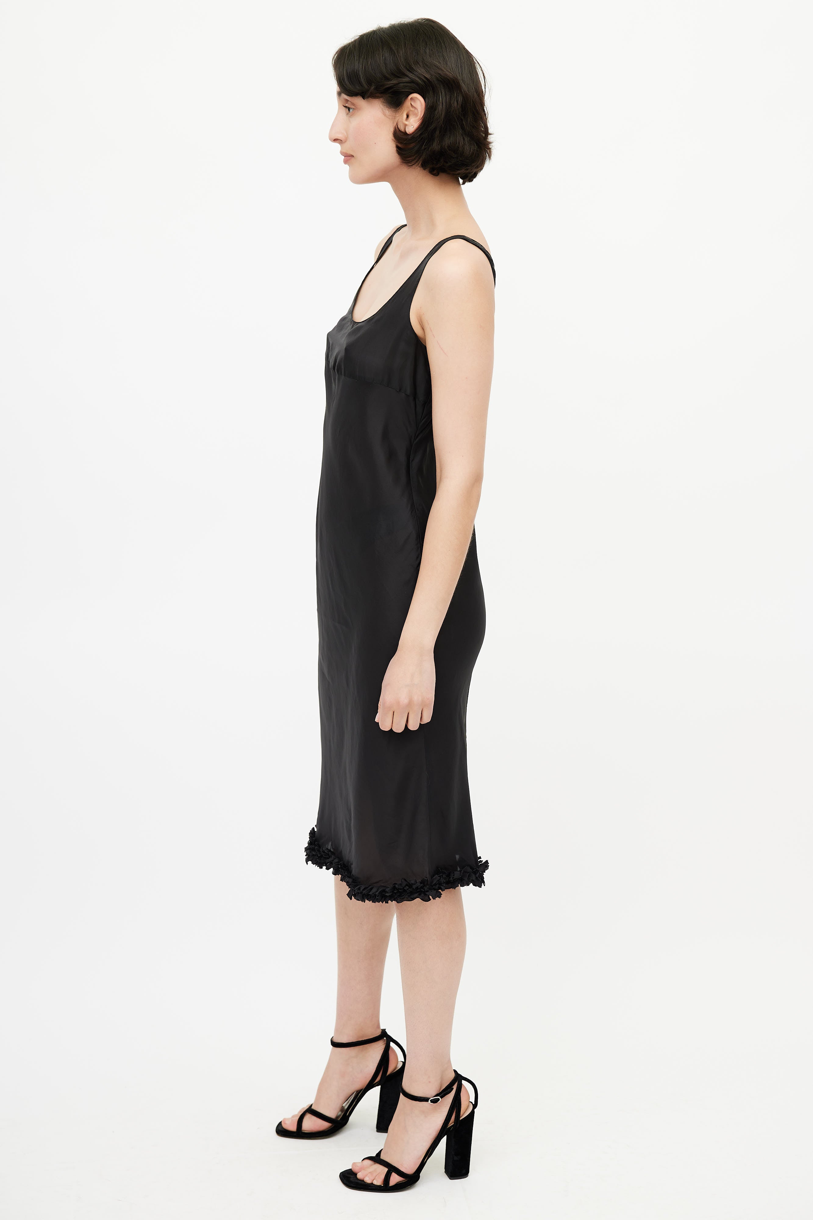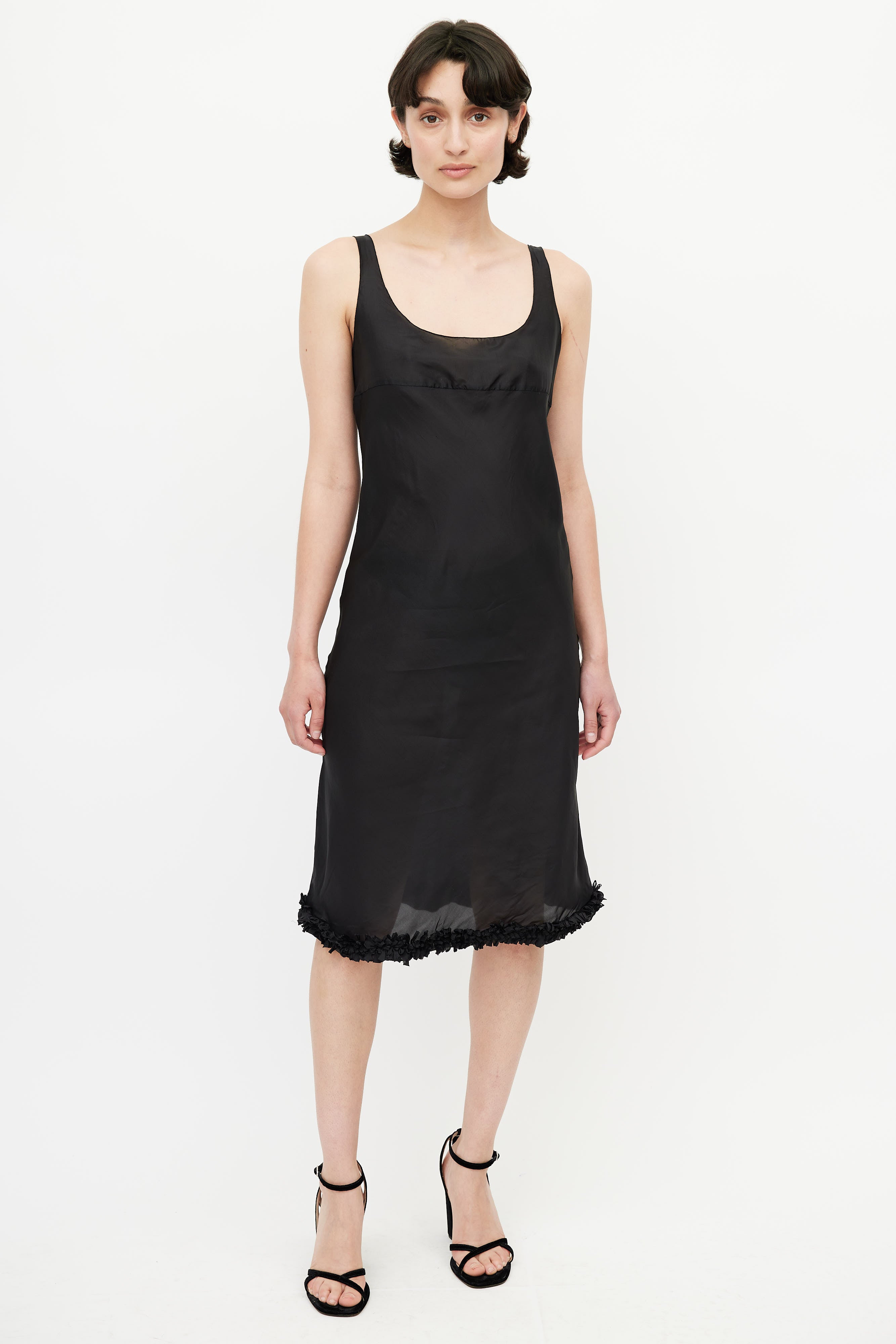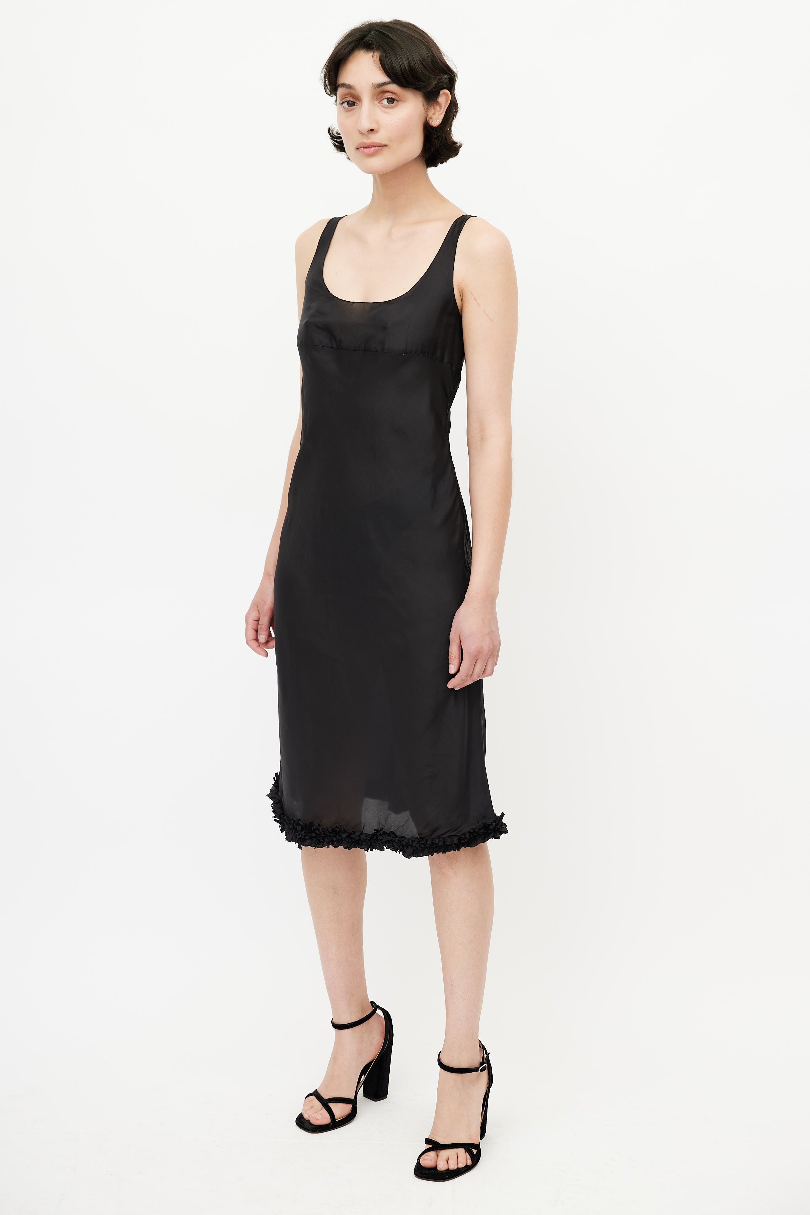 Pre-owned Miu Miu black slip dress featuring a scoop neckline, ruffled hem, and zip closure at left side.
