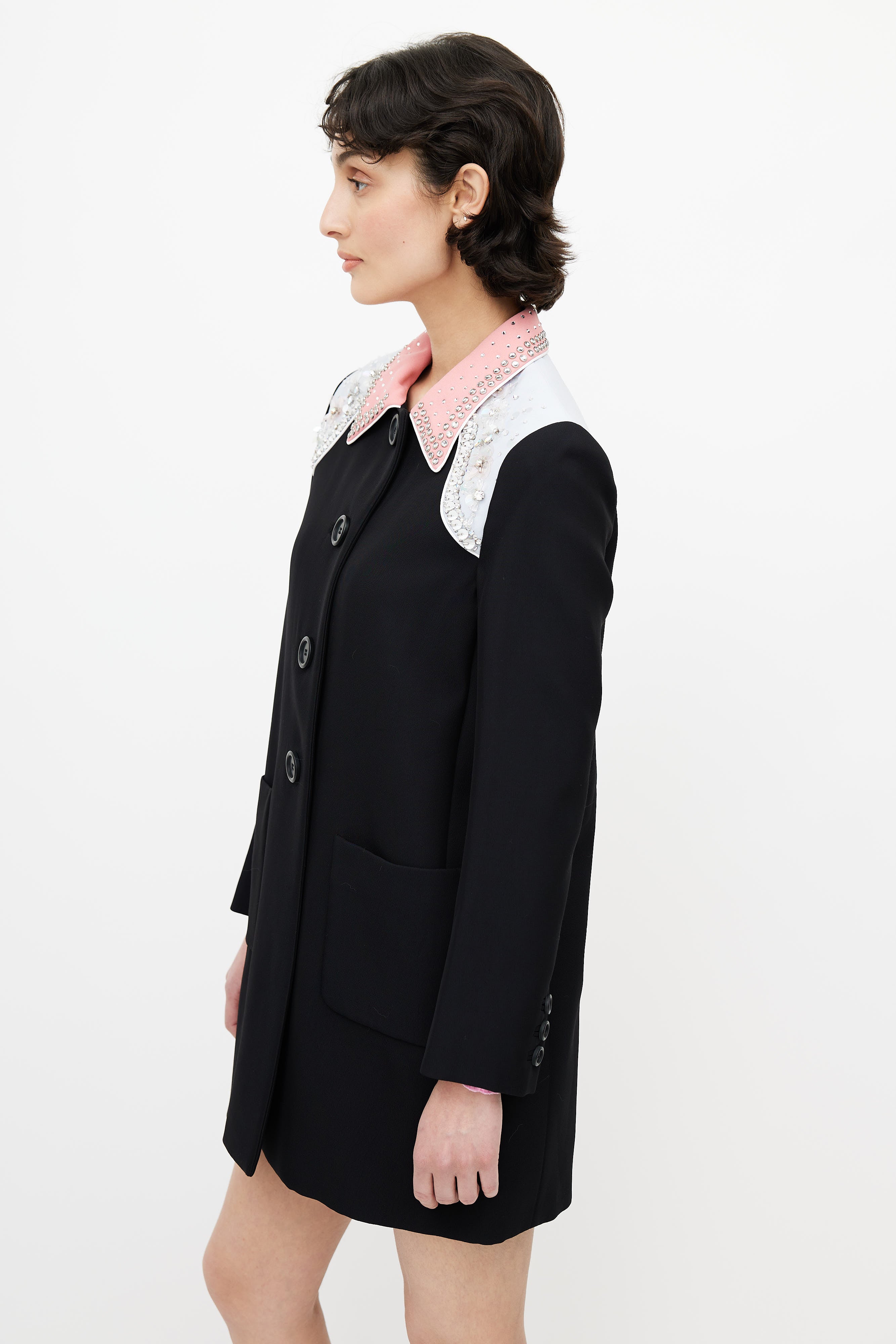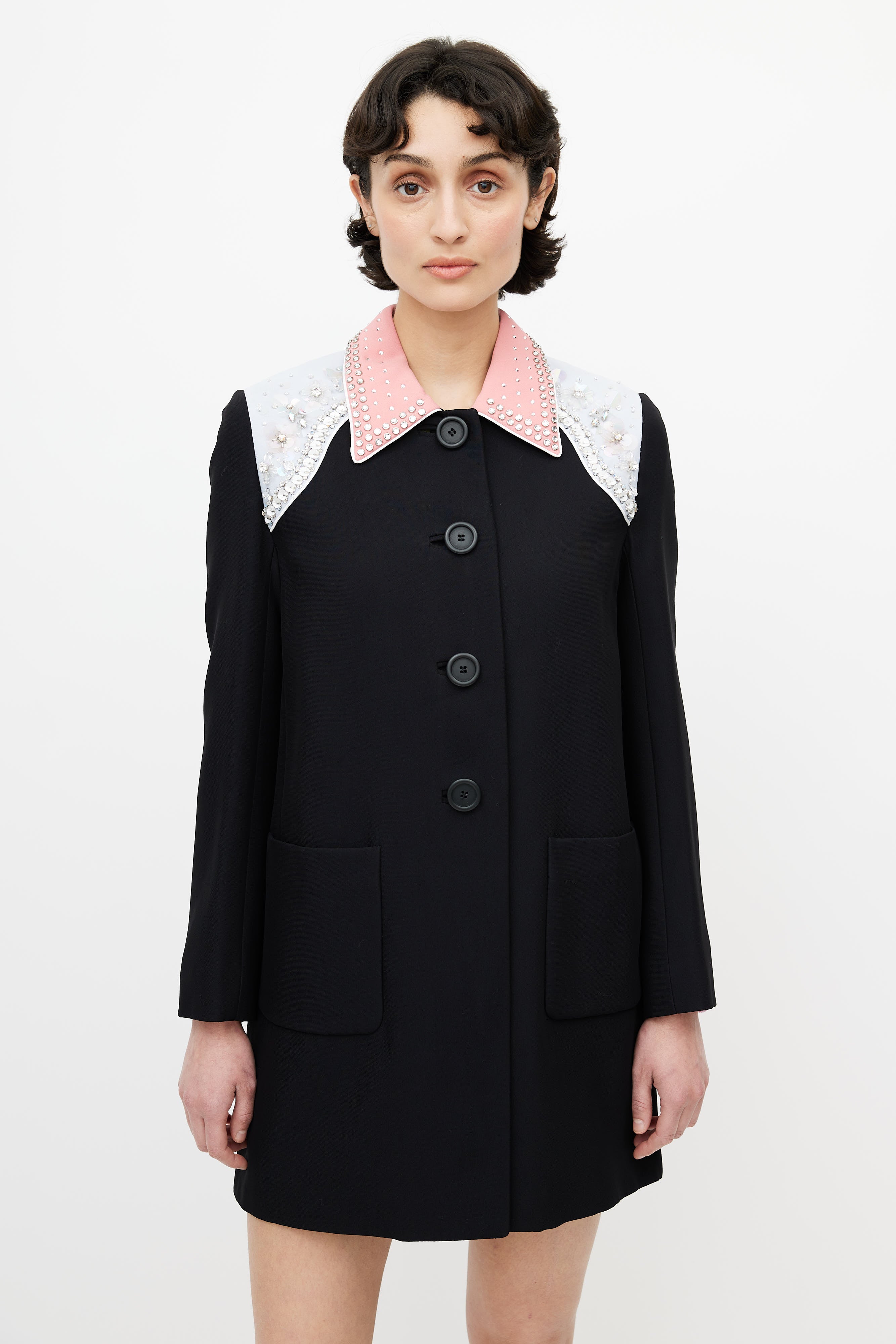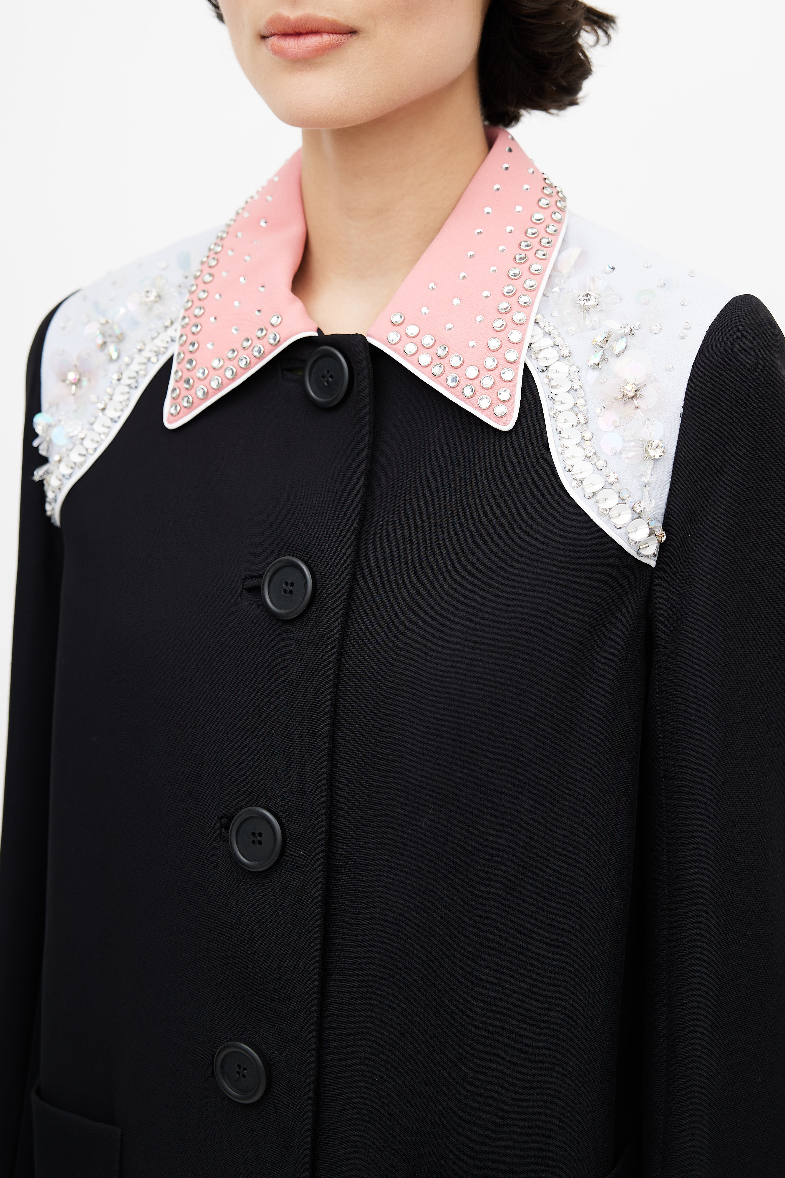 Pre-owned Miu Miu black coat featuring pink pointed collar, blue shoulders panel, sequin embellishment at shoulders, button up front, back vent, buttoned cuffs, and two patch pockets. Lined.