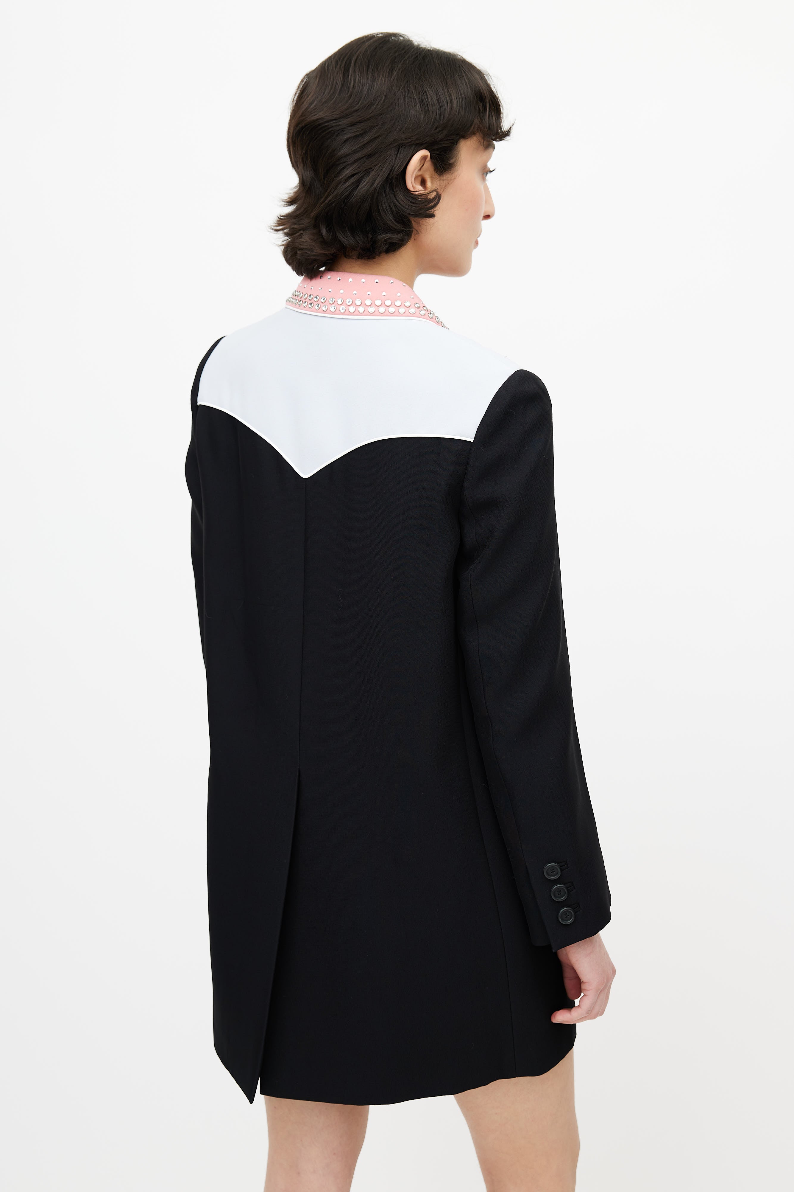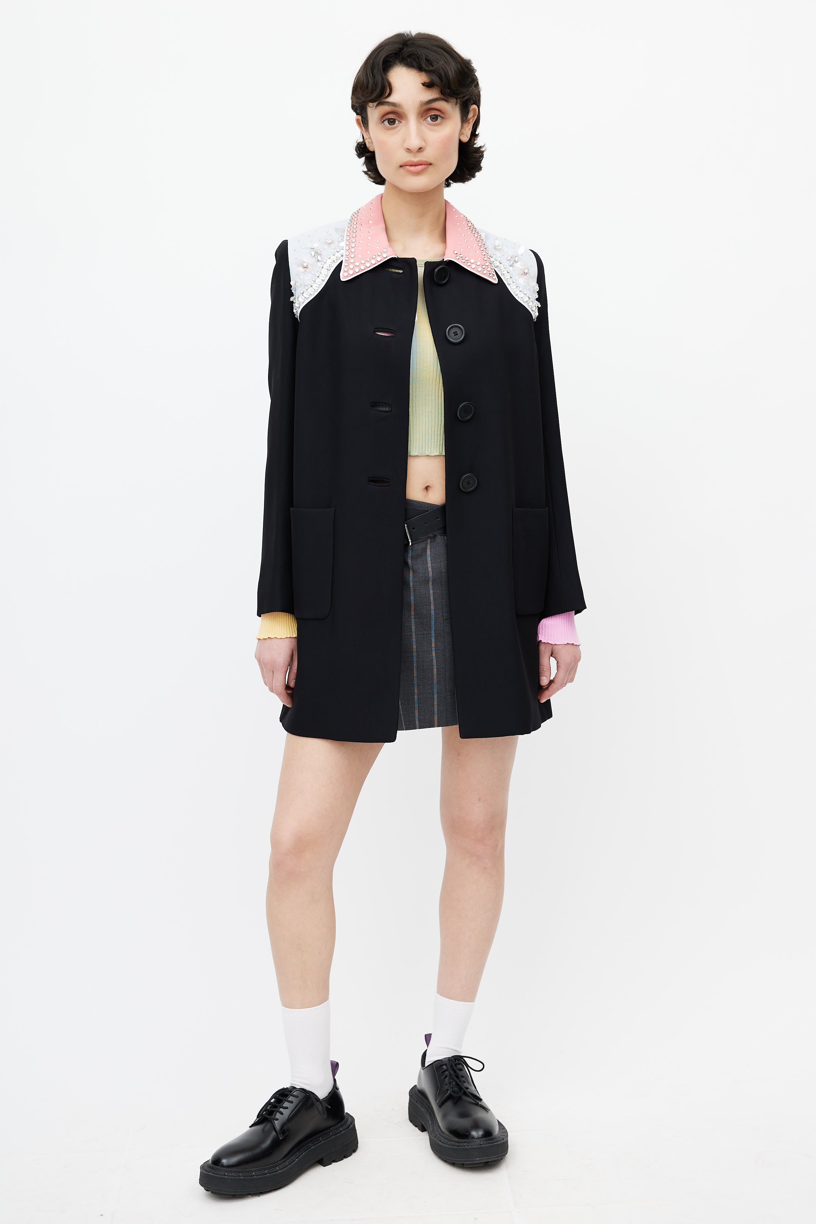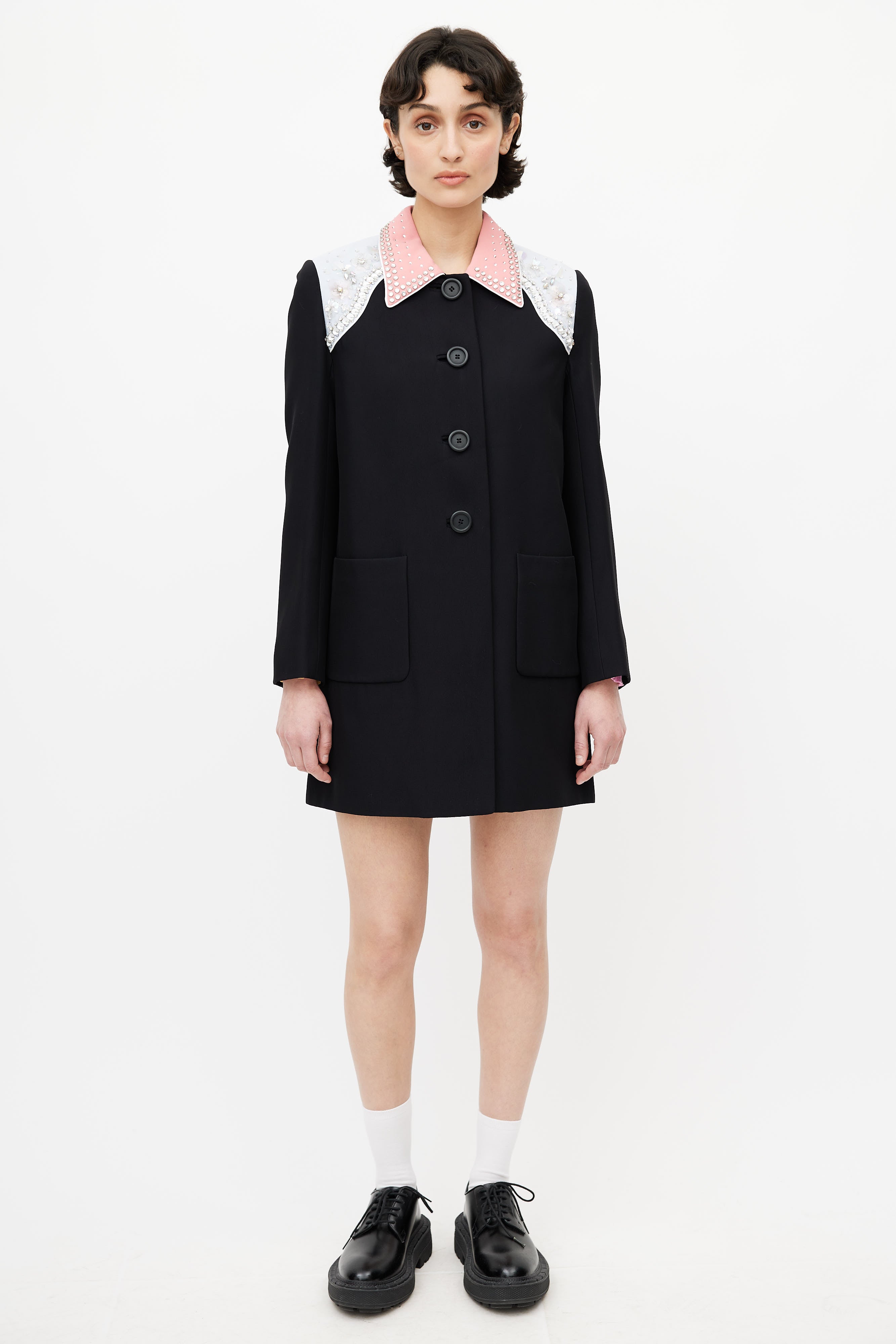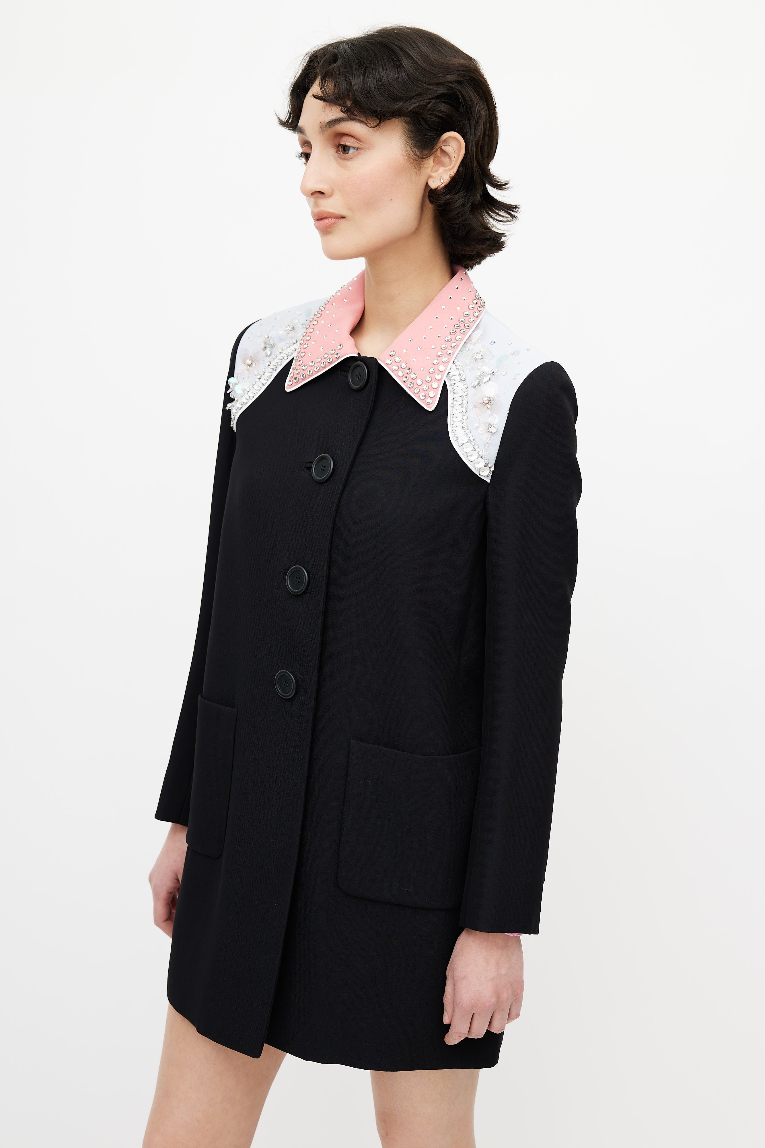 Pre-owned Miu Miu black coat featuring pink pointed collar, blue shoulders panel, sequin embellishment at shoulders, button up front, back vent, buttoned cuffs, and two patch pockets. Lined.