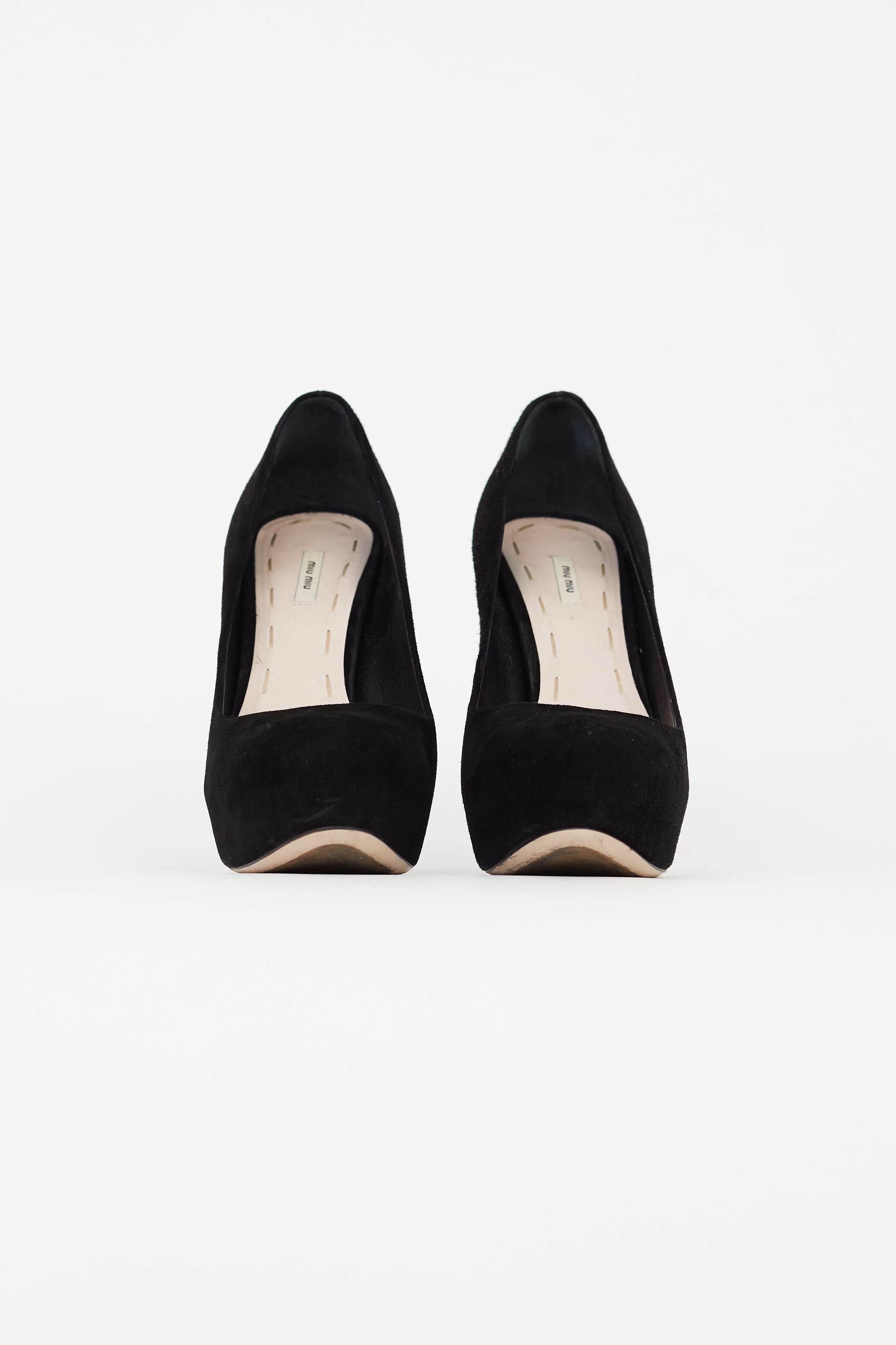 Pre-owned Miu Miu round toe platform pump in black, featuring a wrapped stiletto heel, suede upper, cream leather insole with stitched logo, and leather outsole. Comes with dust bags.