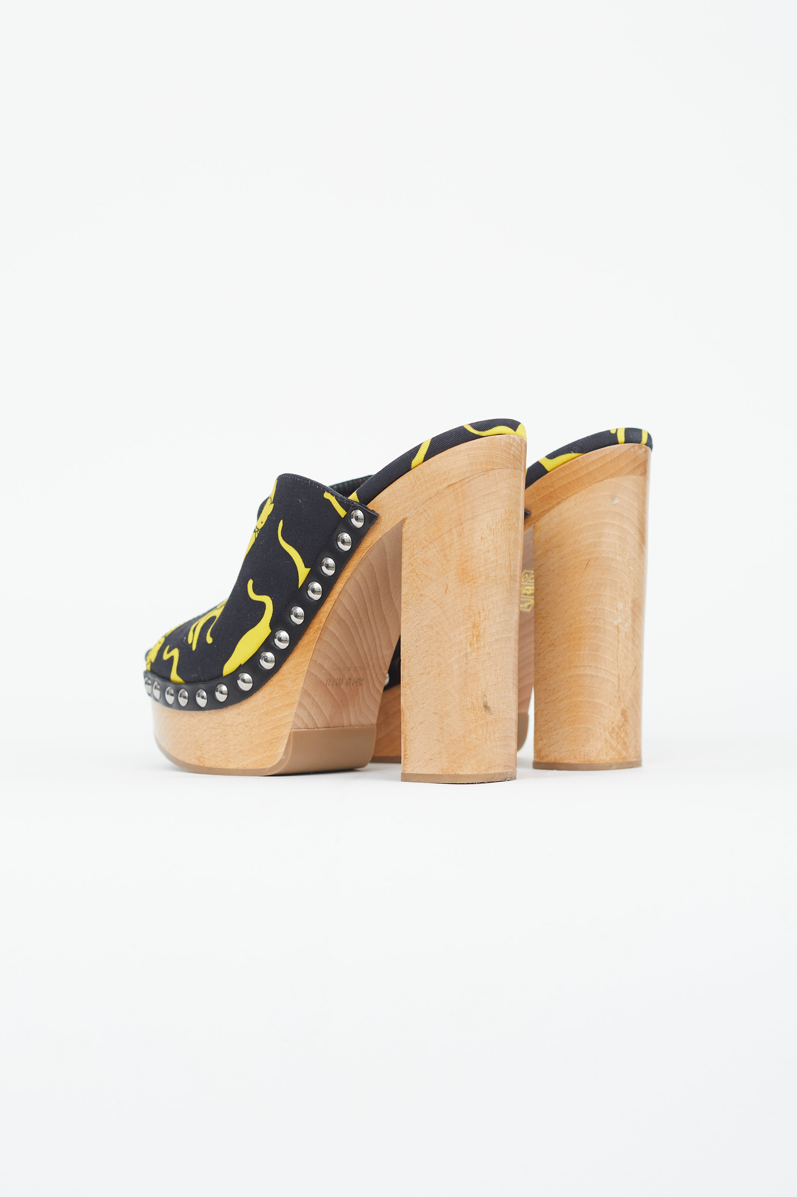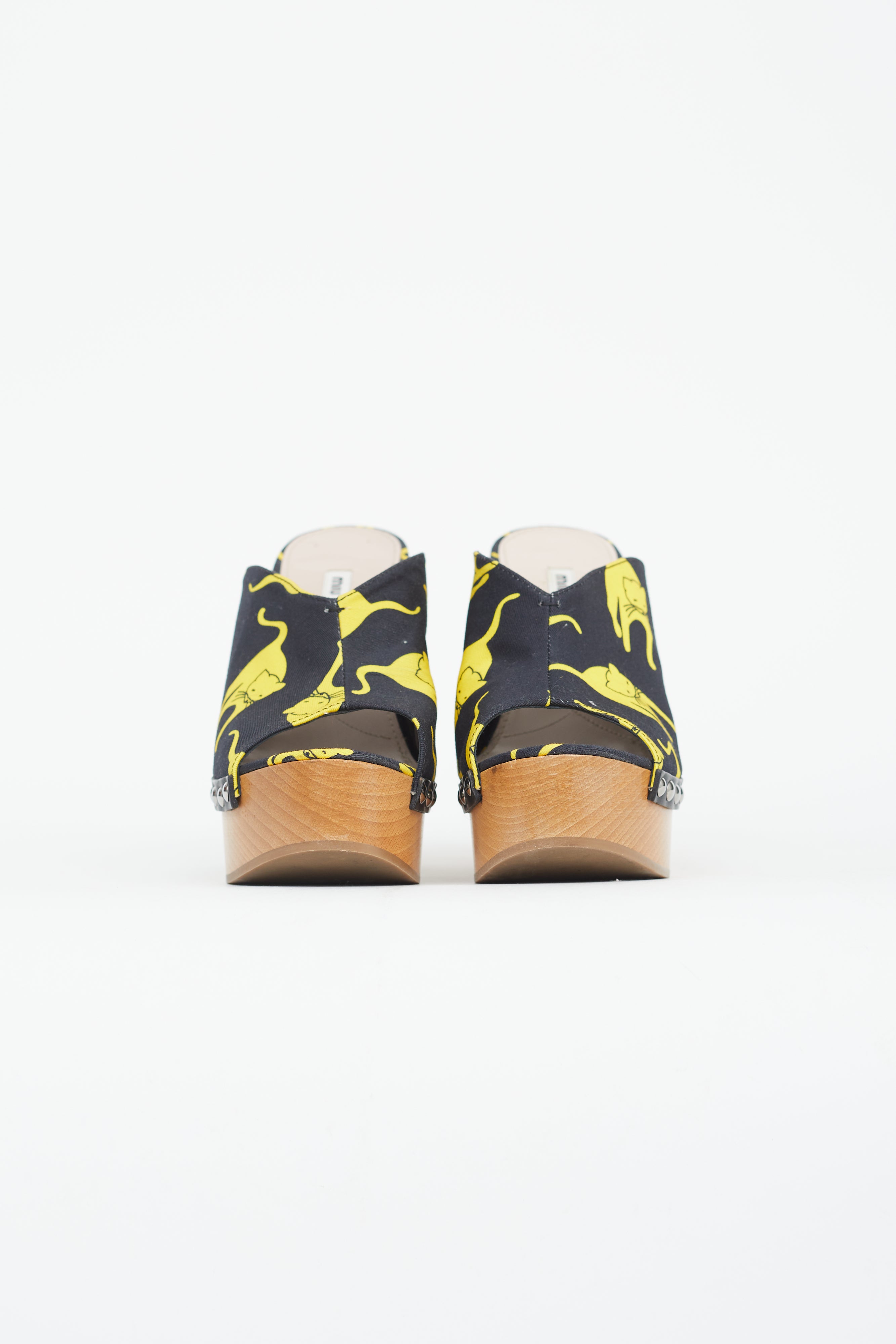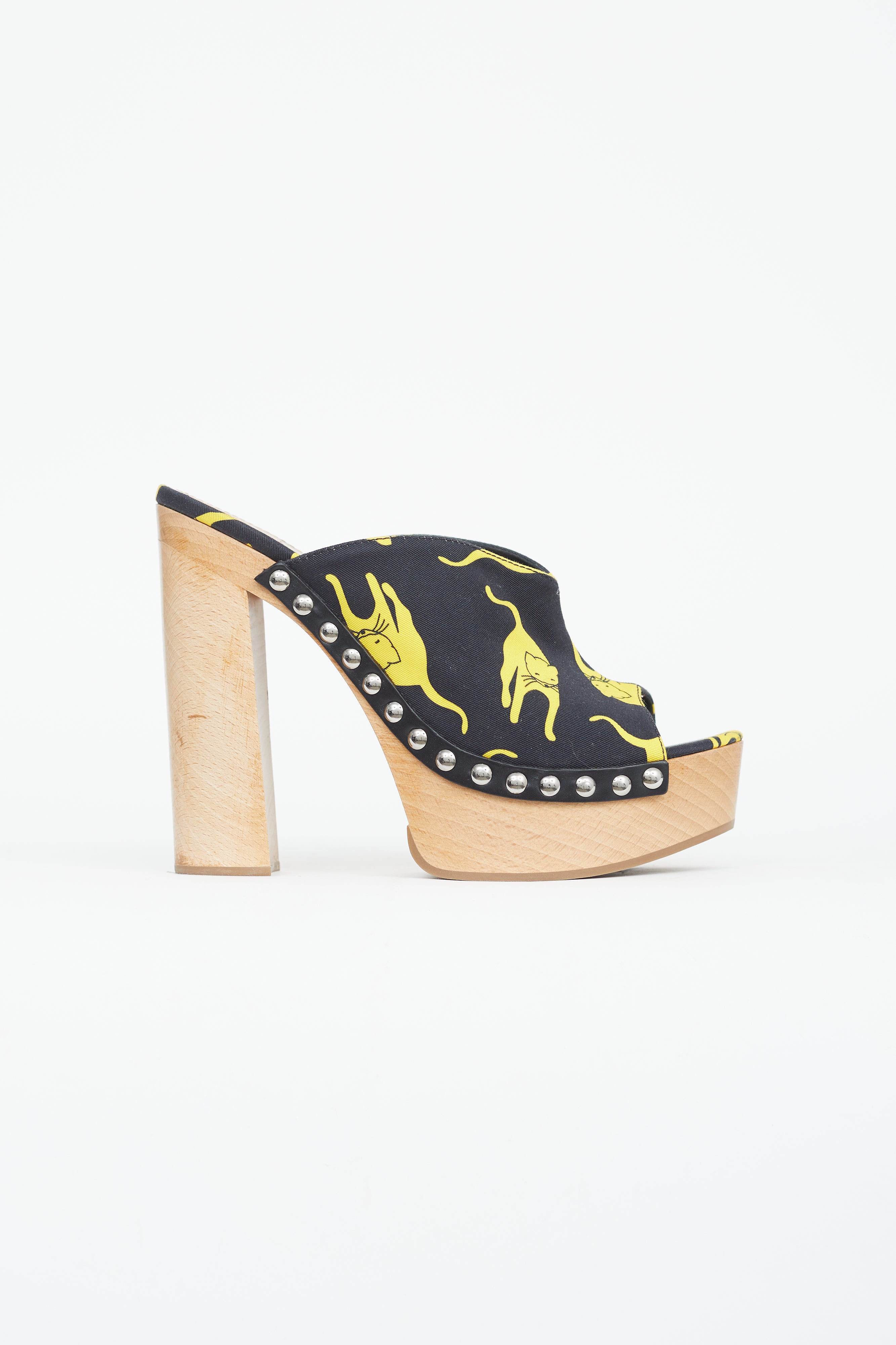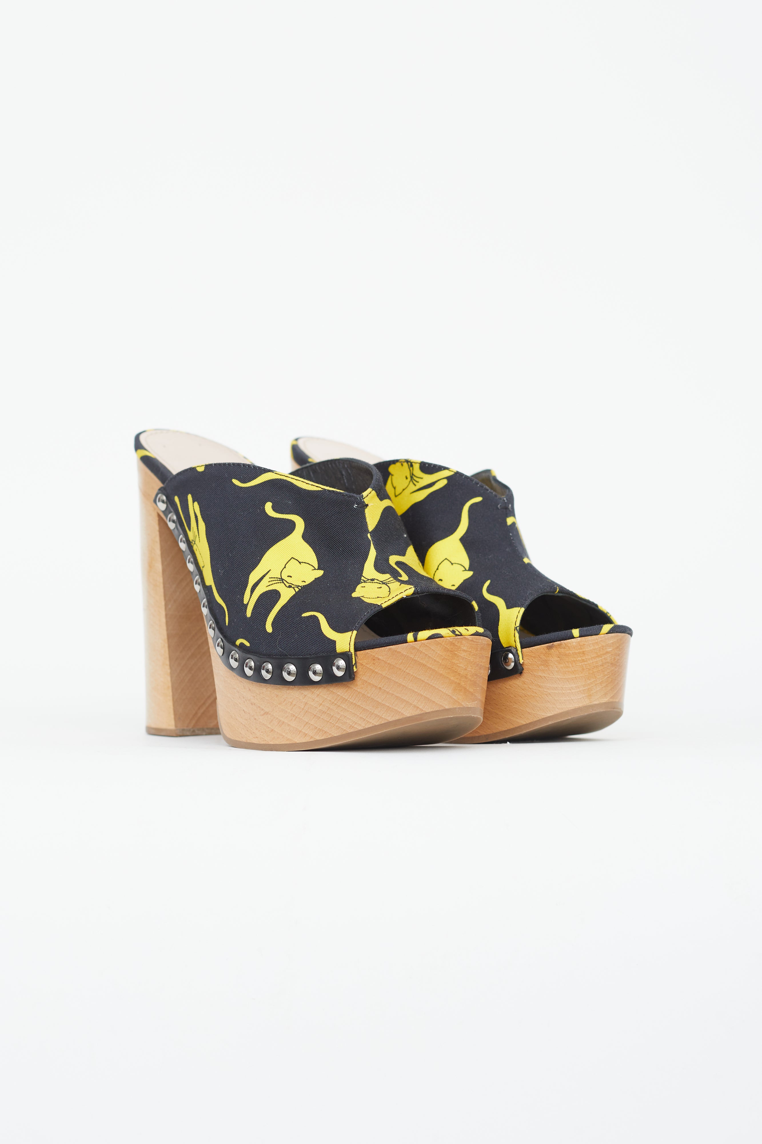 Pre-owned Miu Miu black and yellow printed mule featuring a wooden platform sole and heel, rubber outsole, slip on entry, peep toe, thick curved band across vamp, black base with yellow cat print throughout and silver tone studding at sides. Illustration by artist John Wesley.