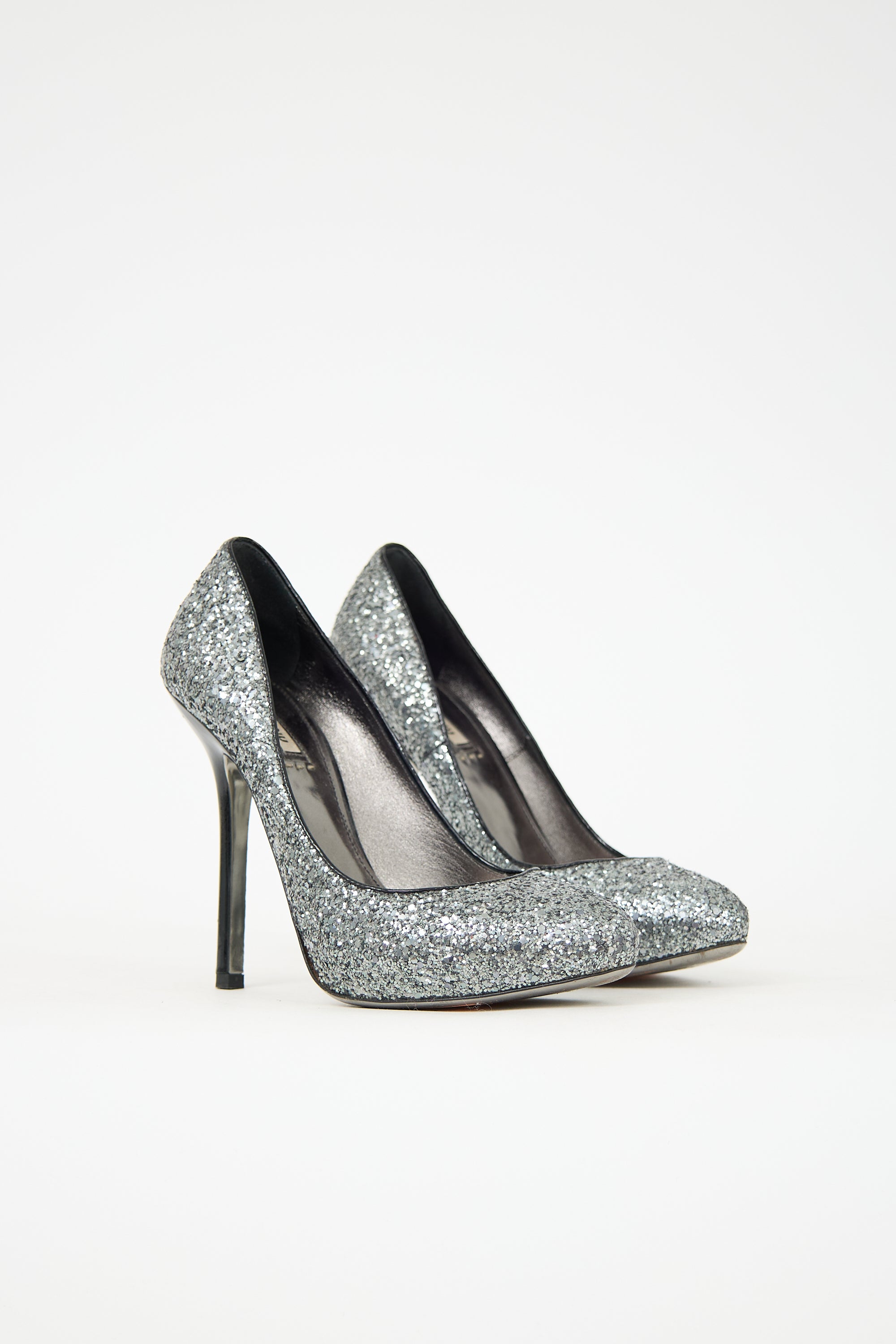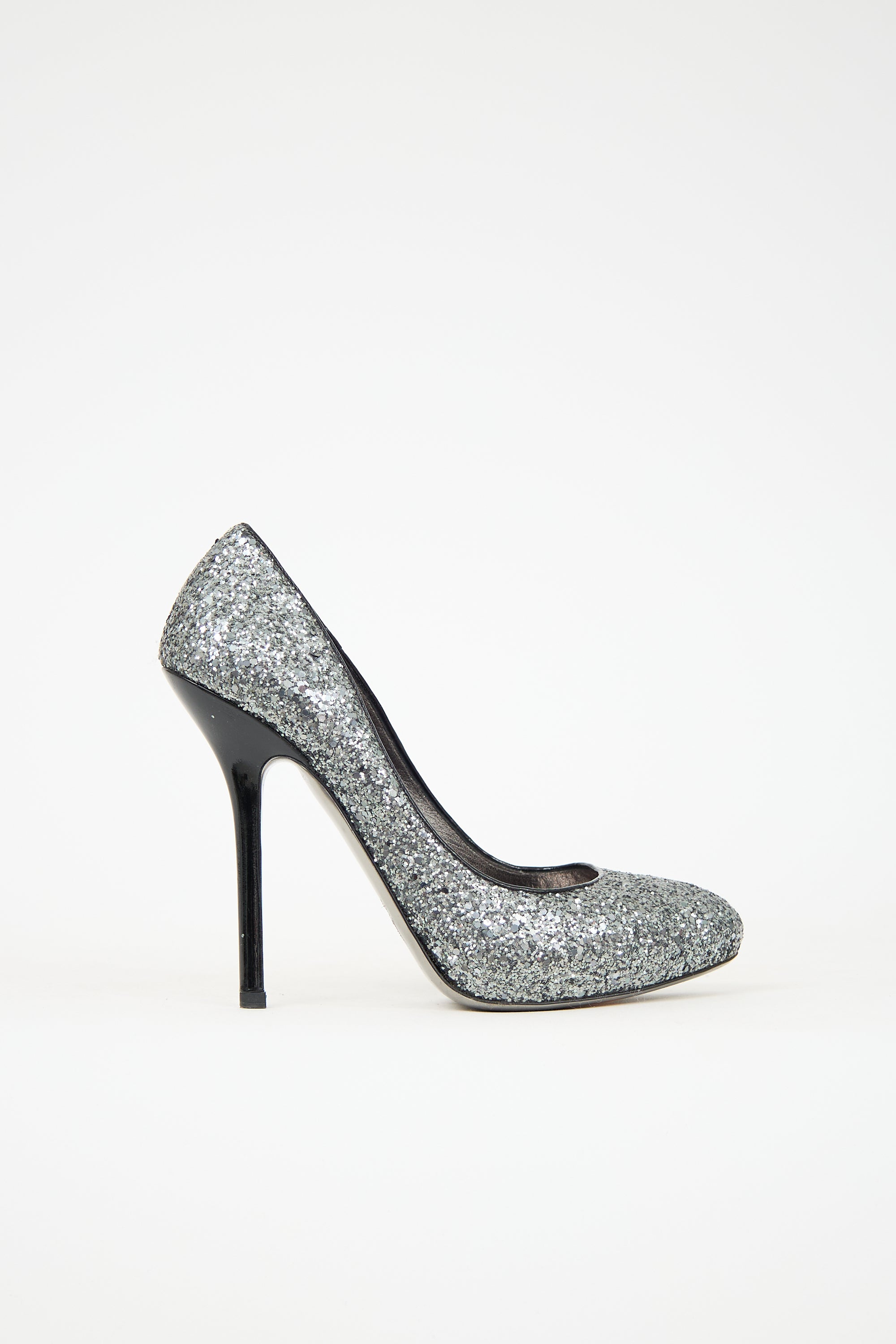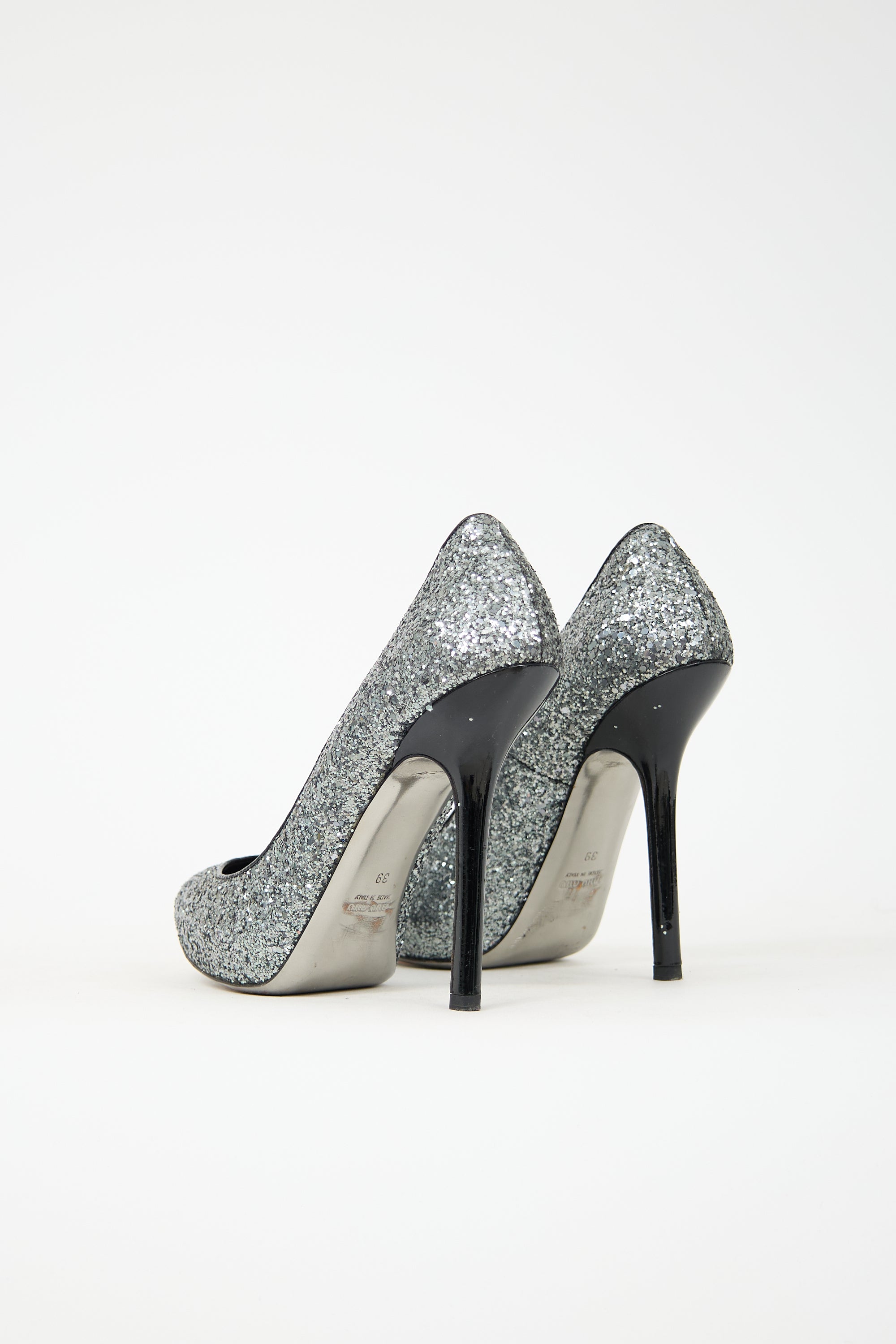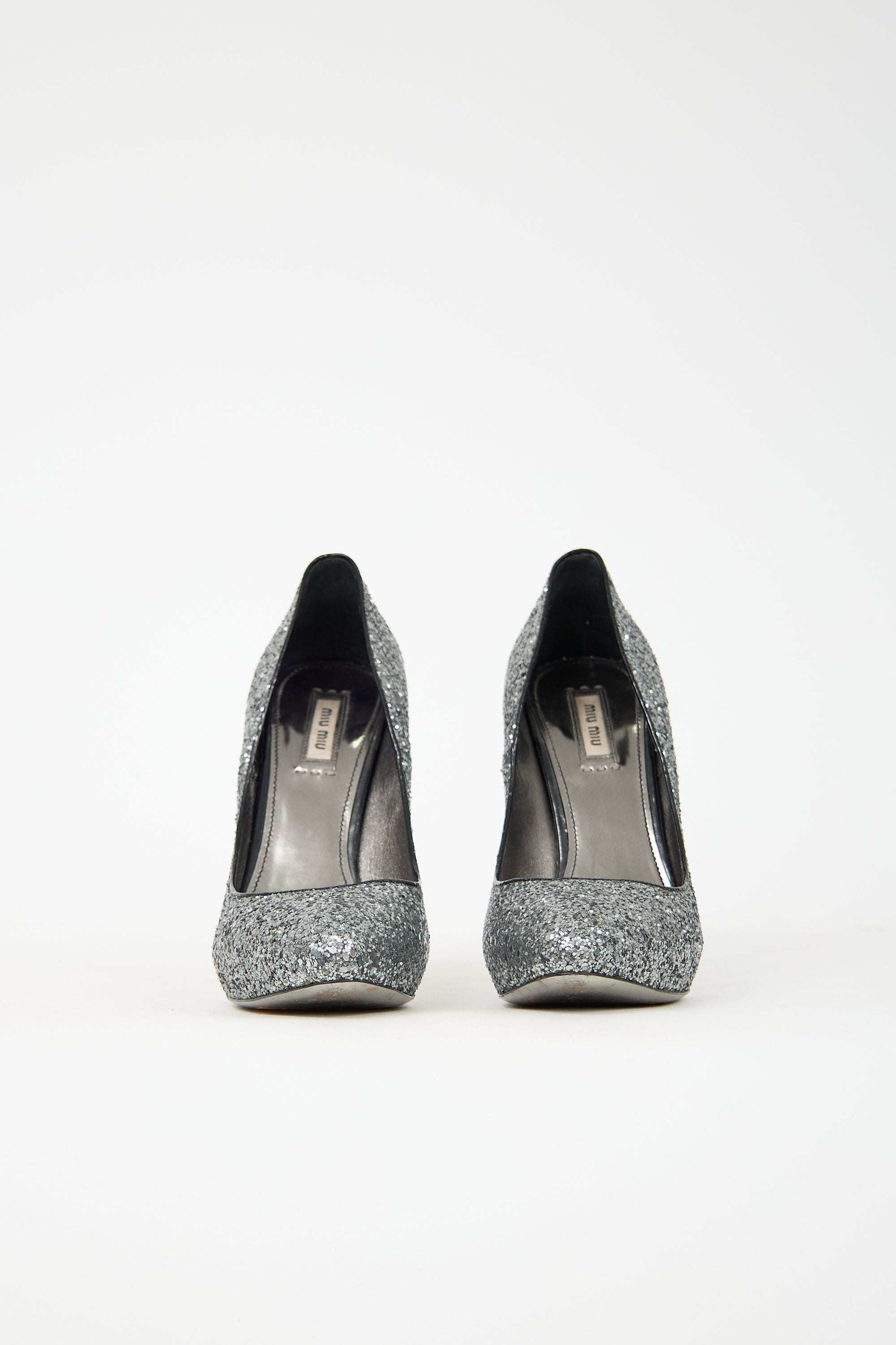 Pre-owned Miu Miu silver glitter platform pumps featuring an almond toe, slip on entry, and black patent leather covered stiletto heel.