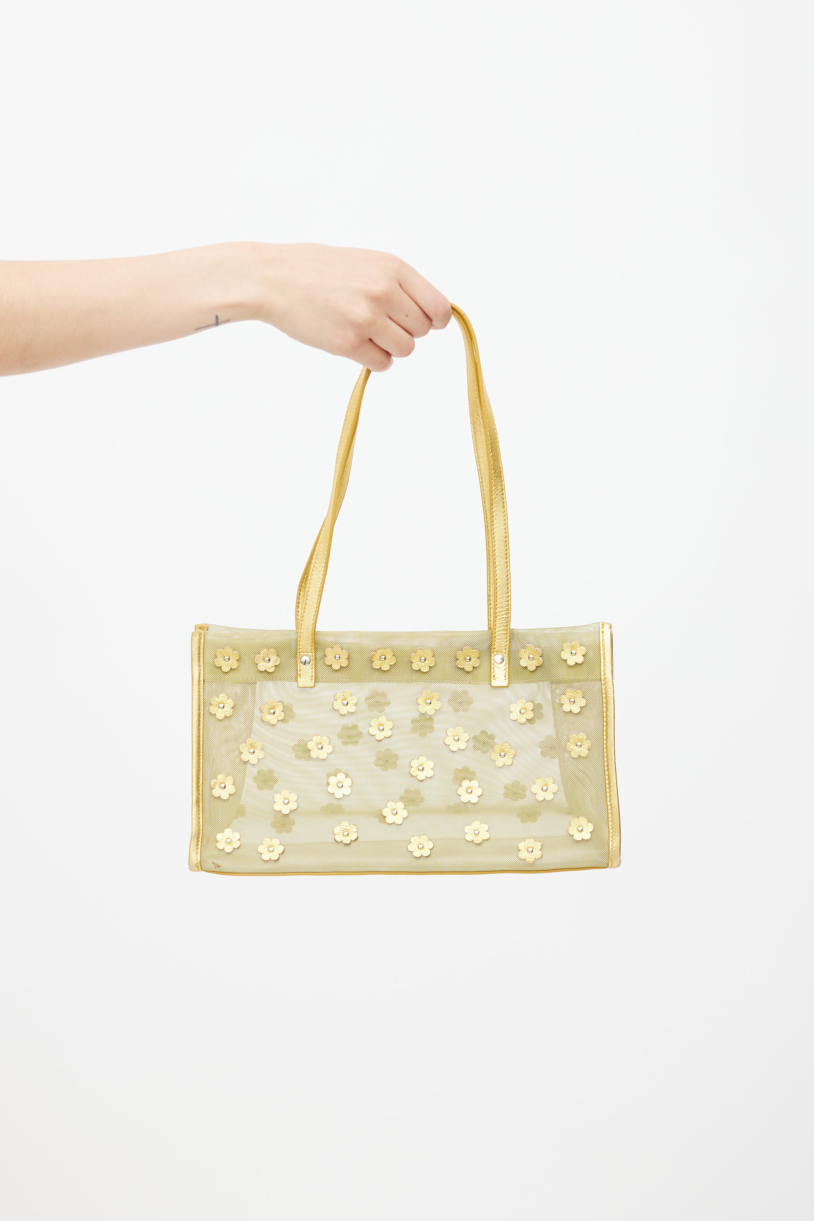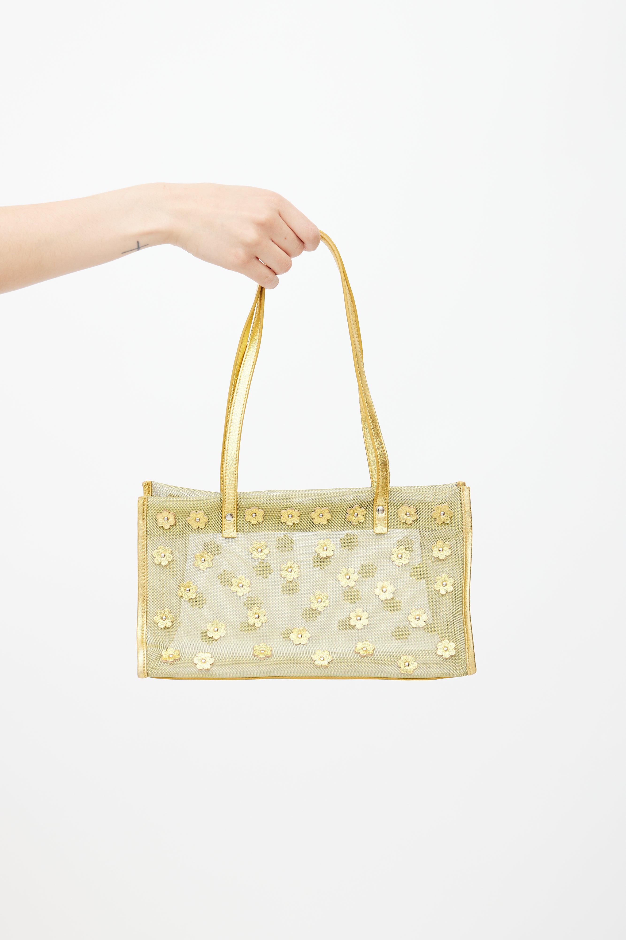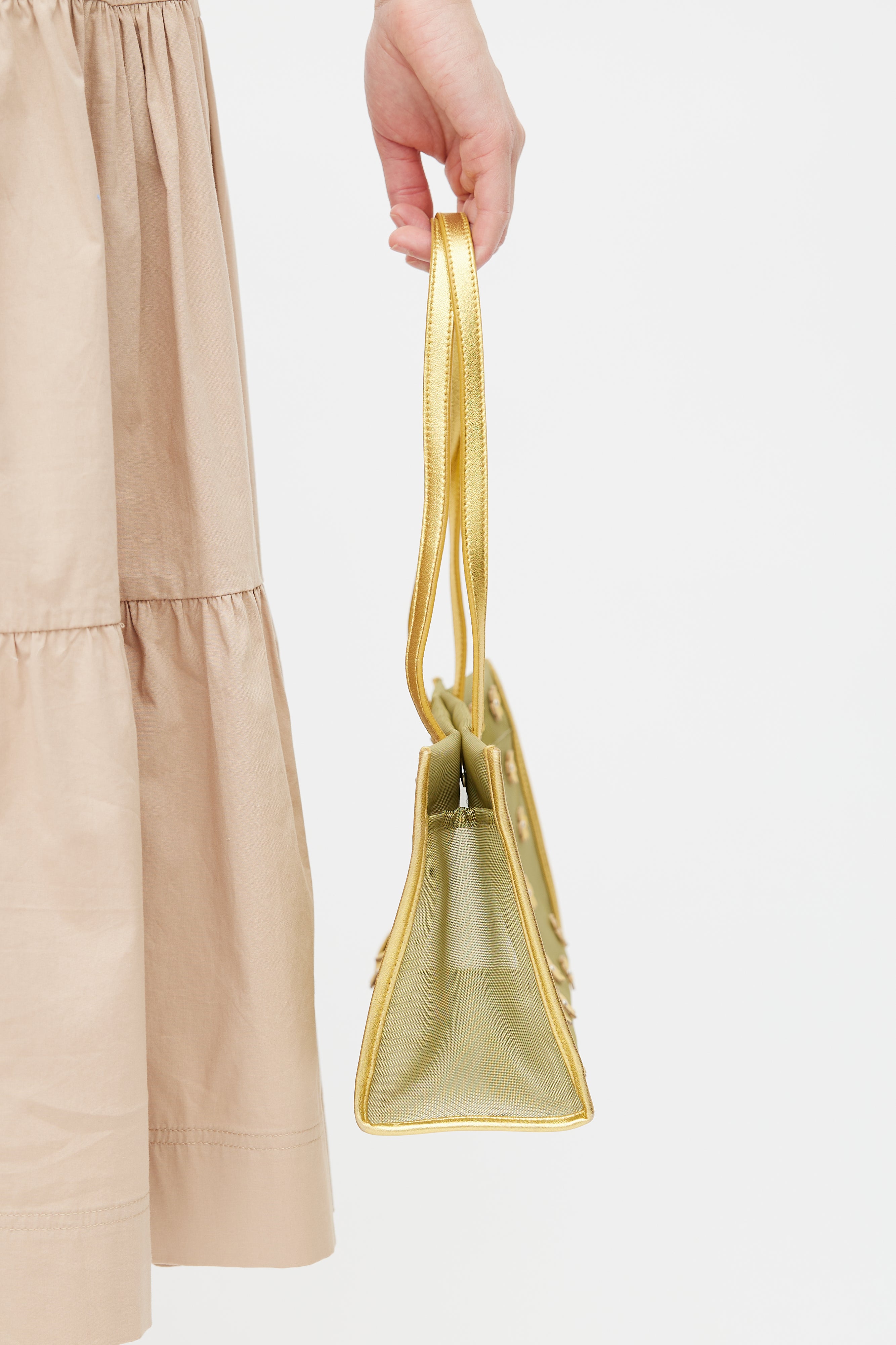 Pre-owned Miu Miu green mesh shoulder bag featuring gold tone floral embellishment, one main compartment with snap button closure, and gold tone shoulder straps. Comes with original dust bag. 1990's era design.