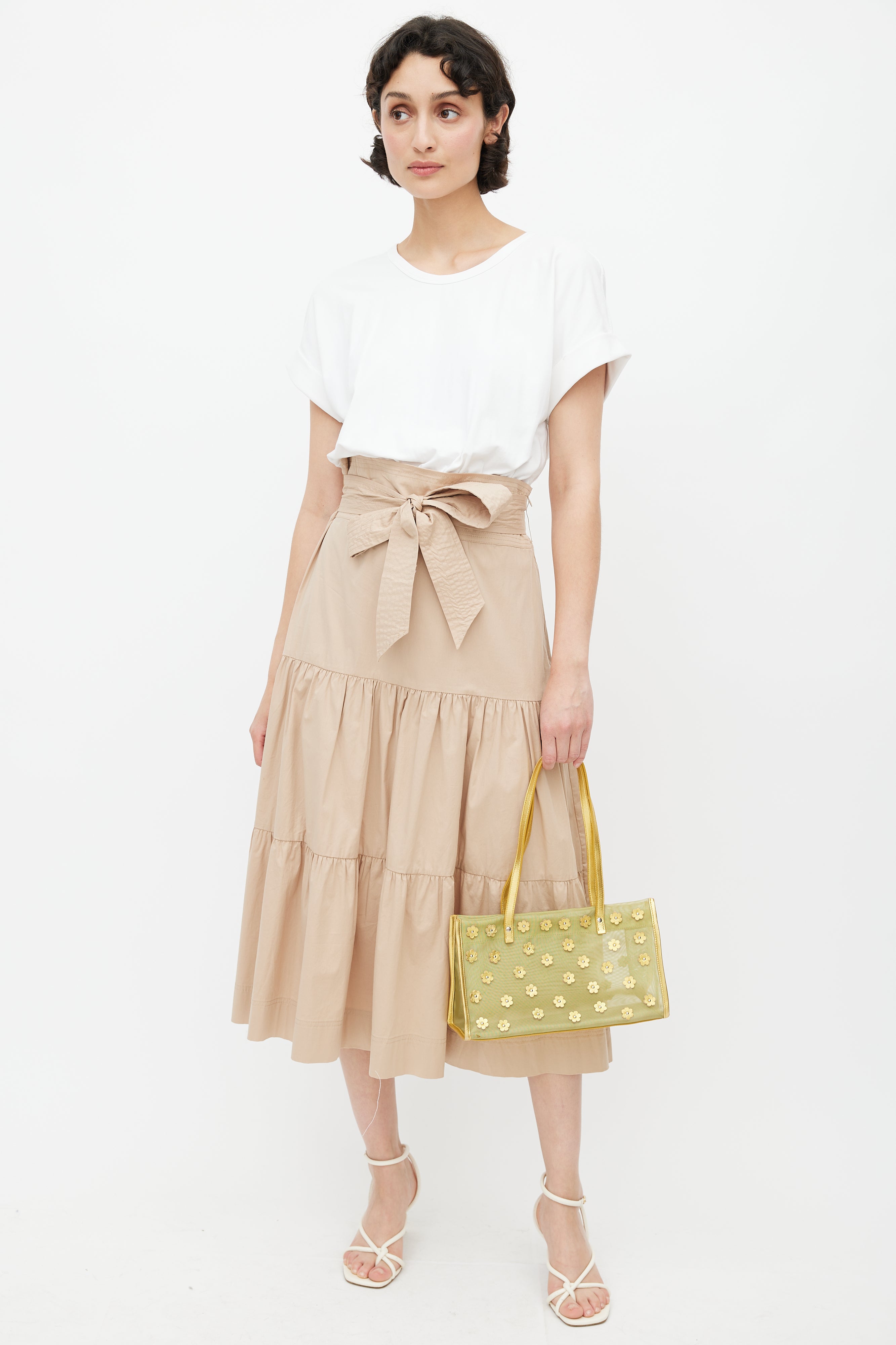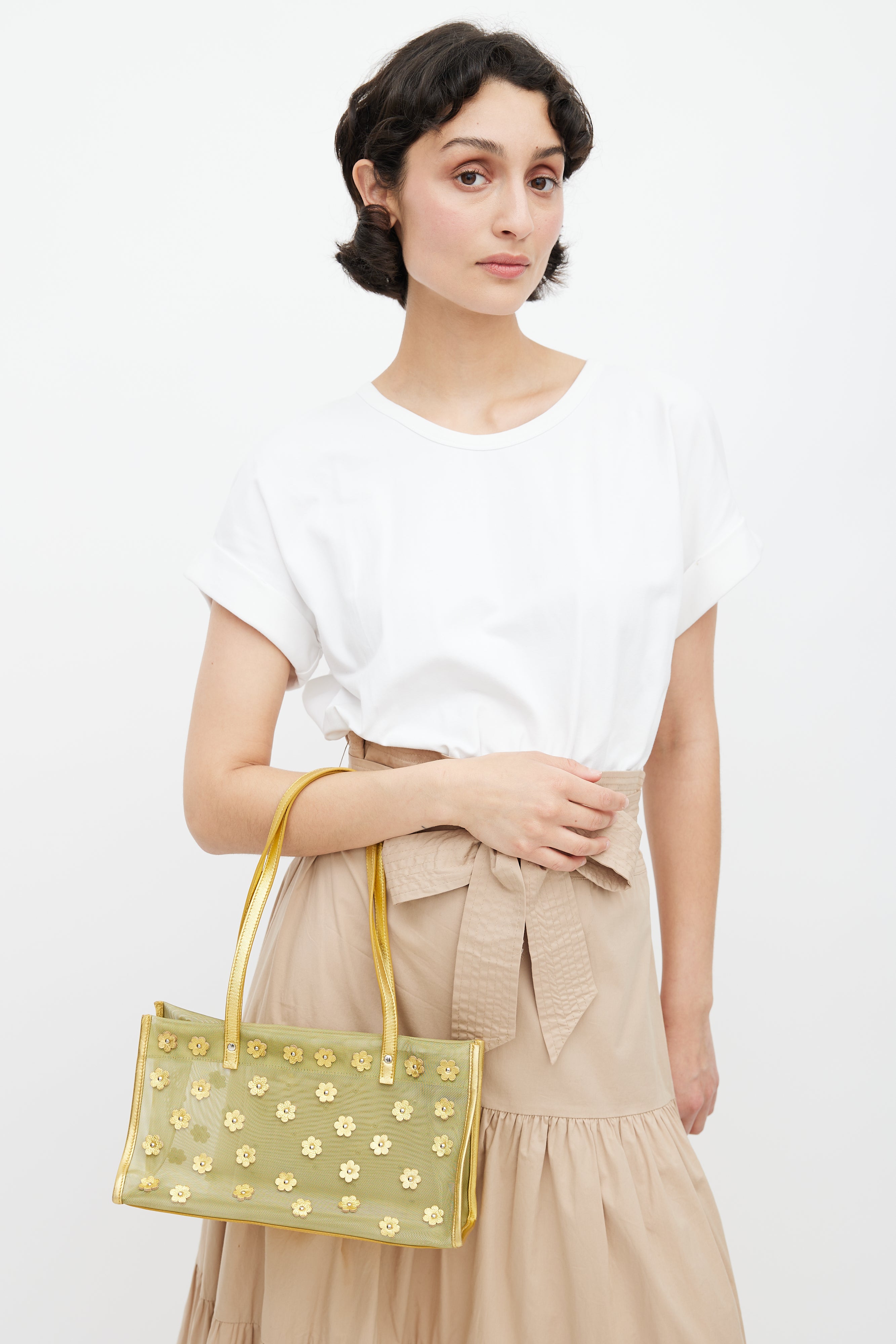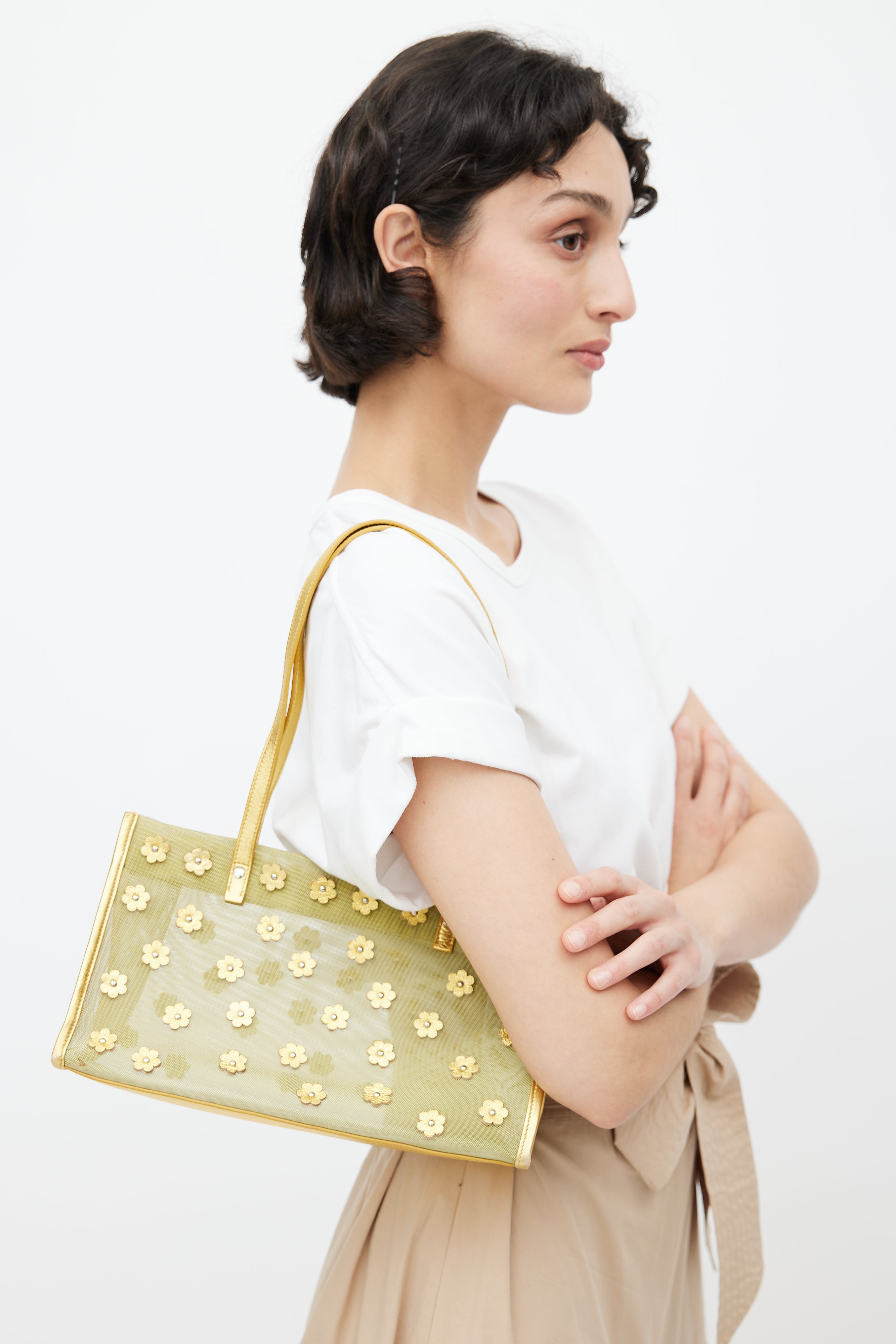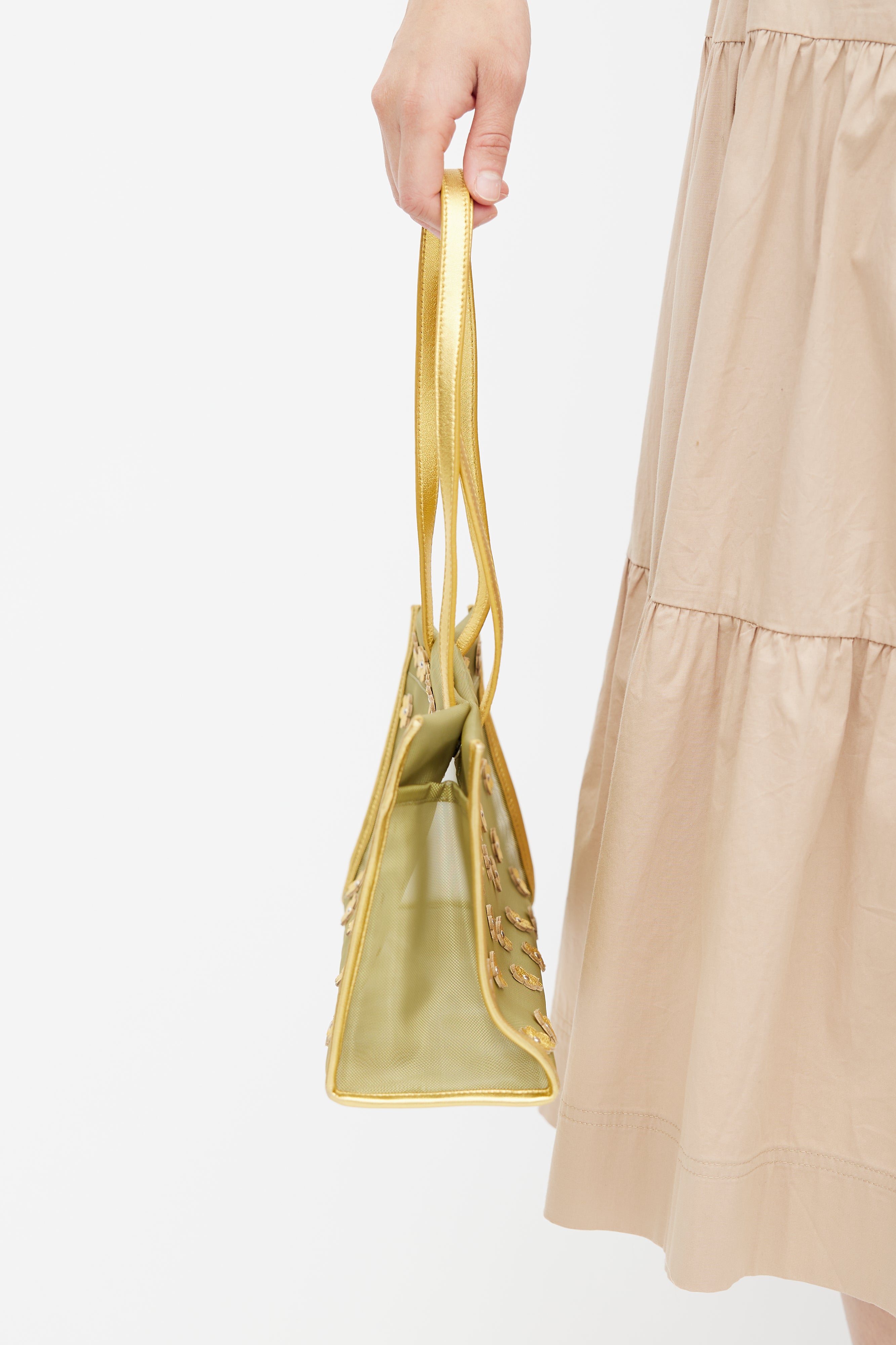 Pre-owned Miu Miu green mesh shoulder bag featuring gold tone floral embellishment, one main compartment with snap button closure, and gold tone shoulder straps. Comes with original dust bag. 1990's era design.