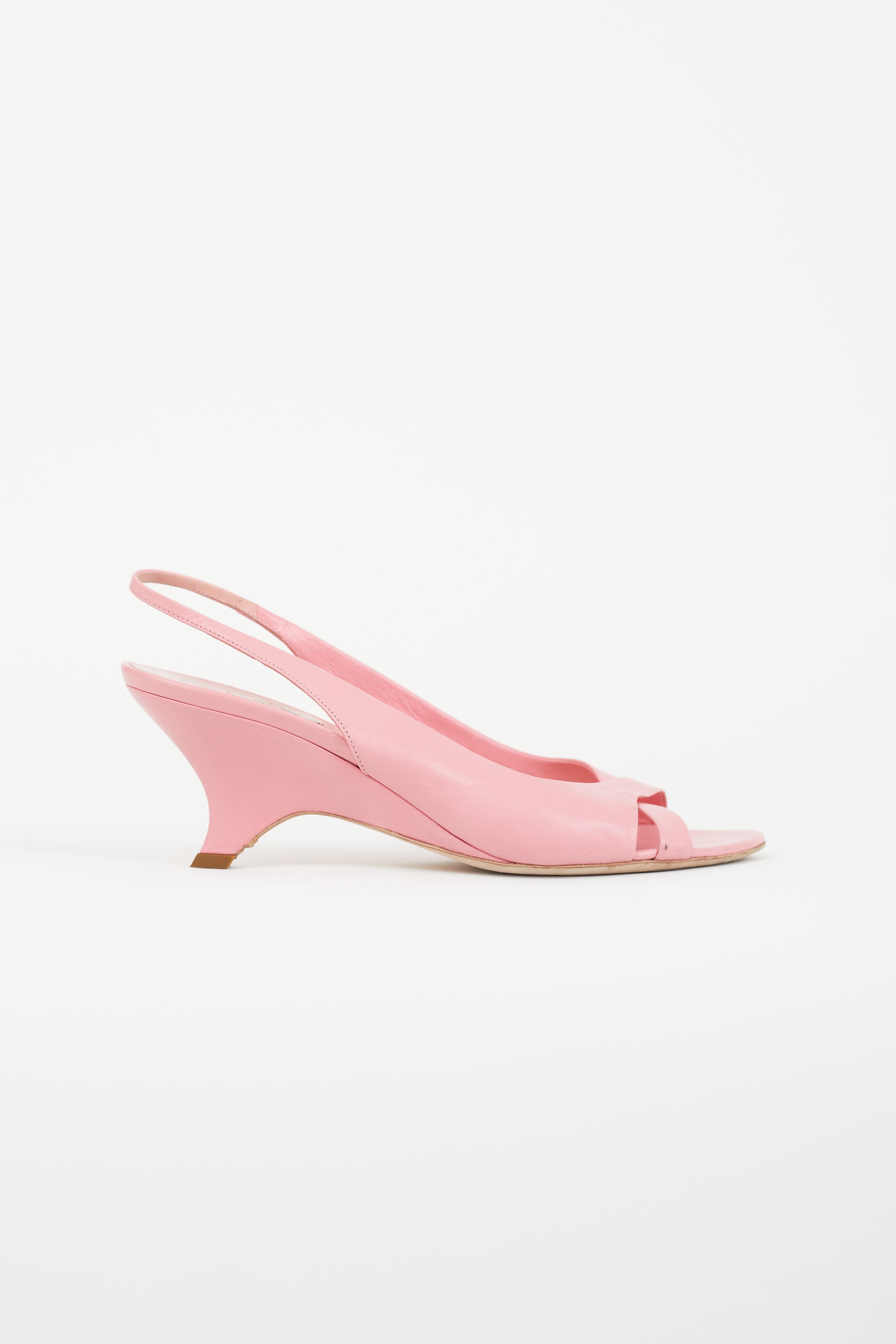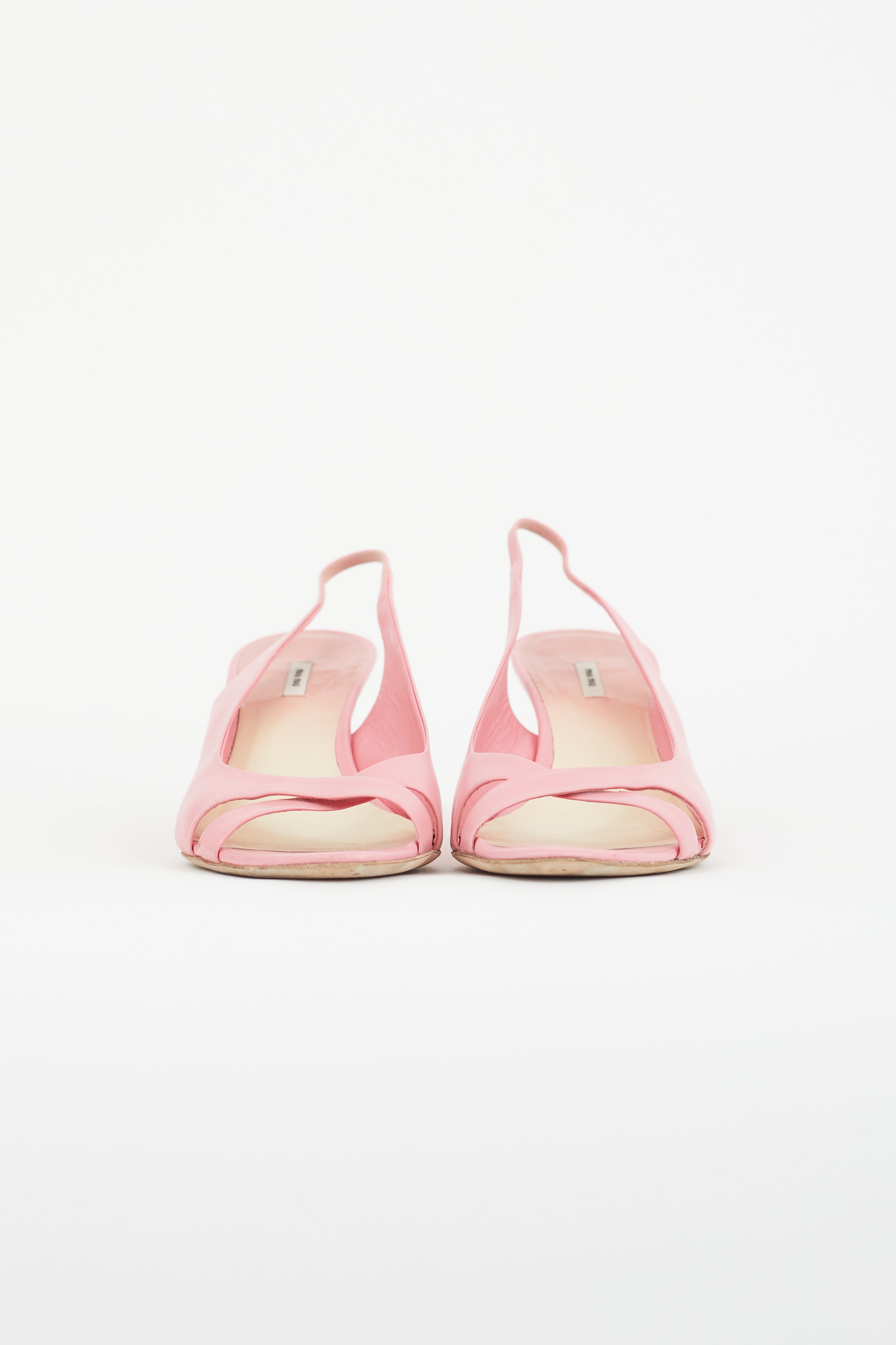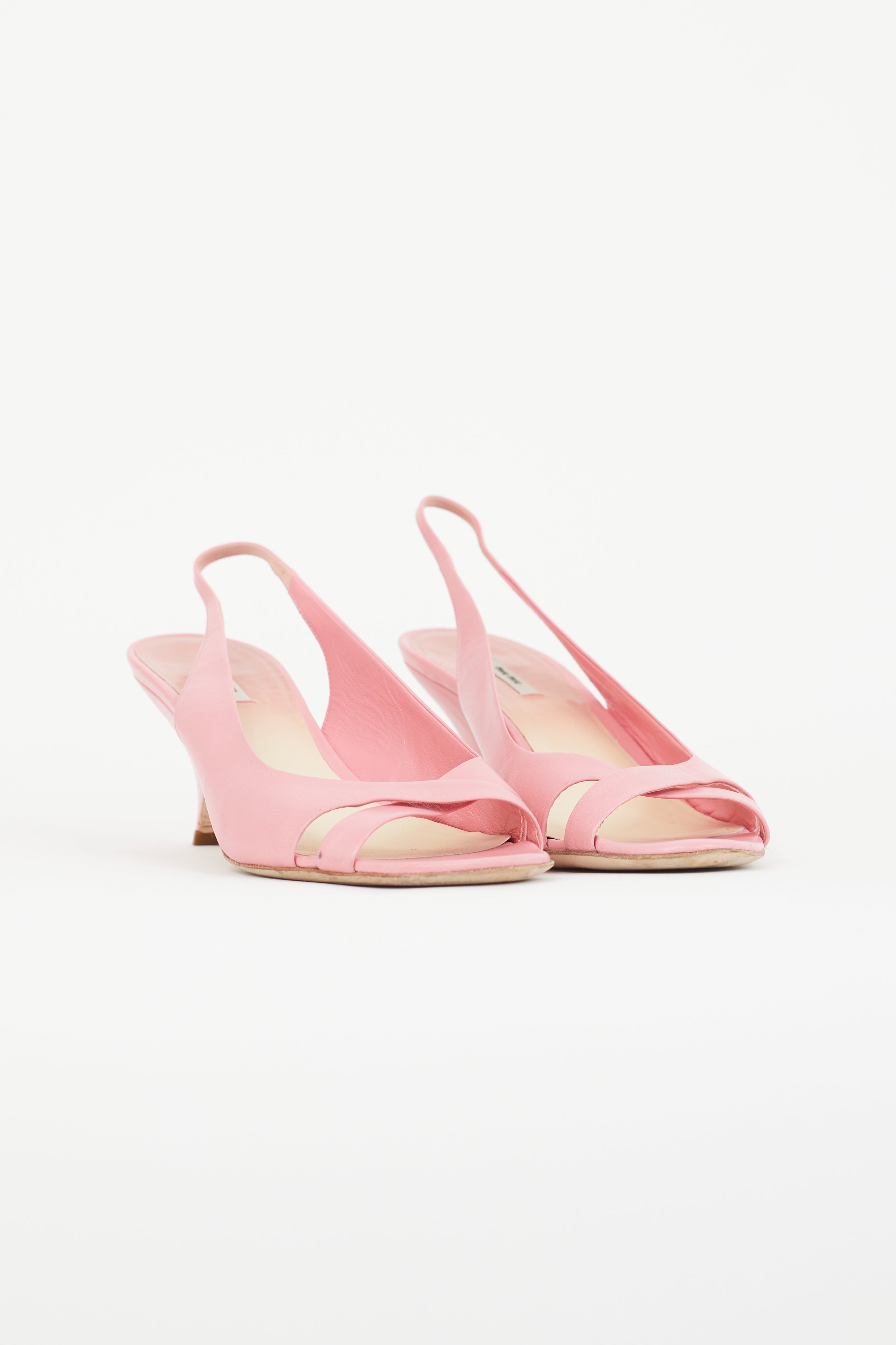 Pre-owned Miu Miu pink leather slingback heels featuring open almond toe, criss cross strap at vamp, and tapered heel.