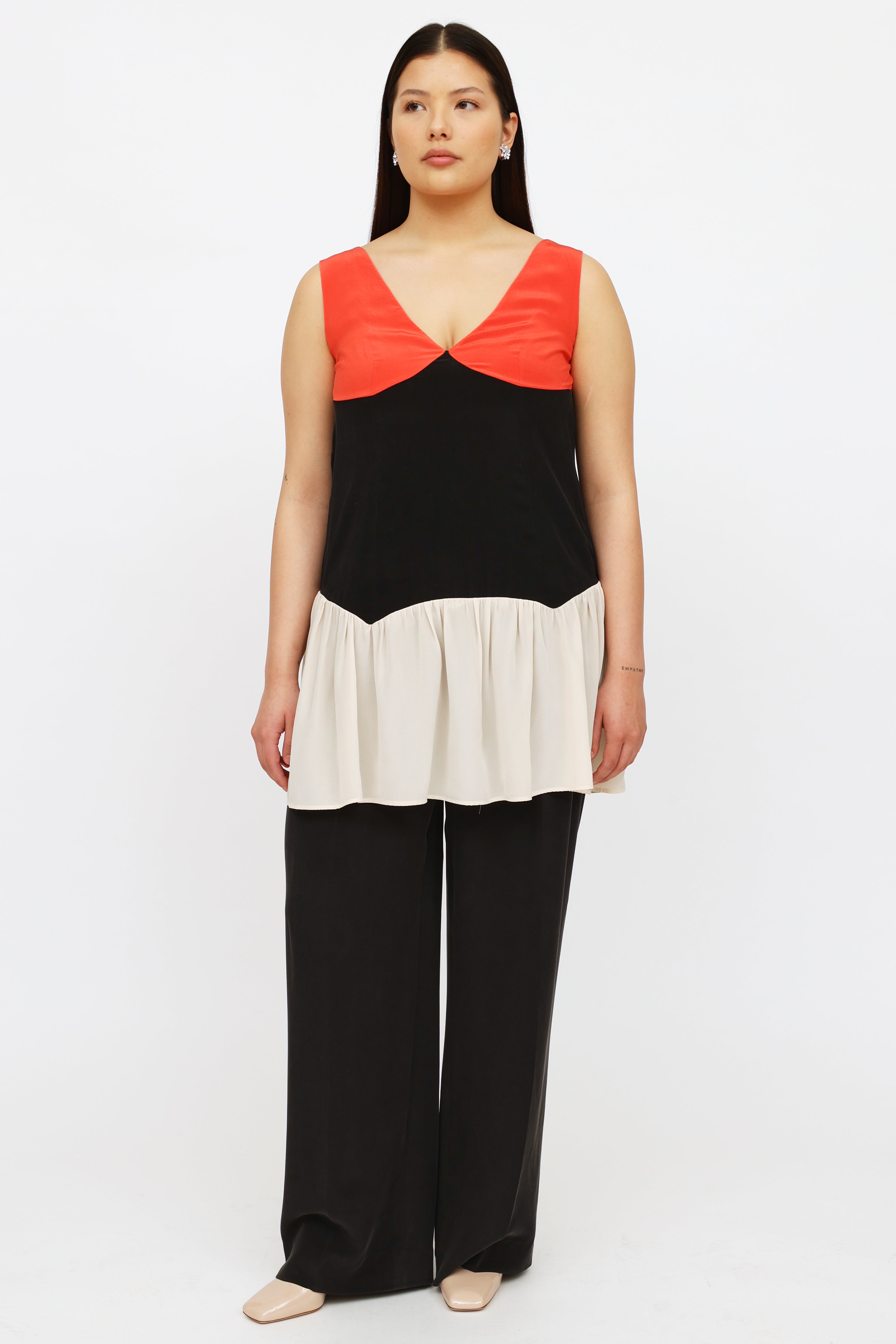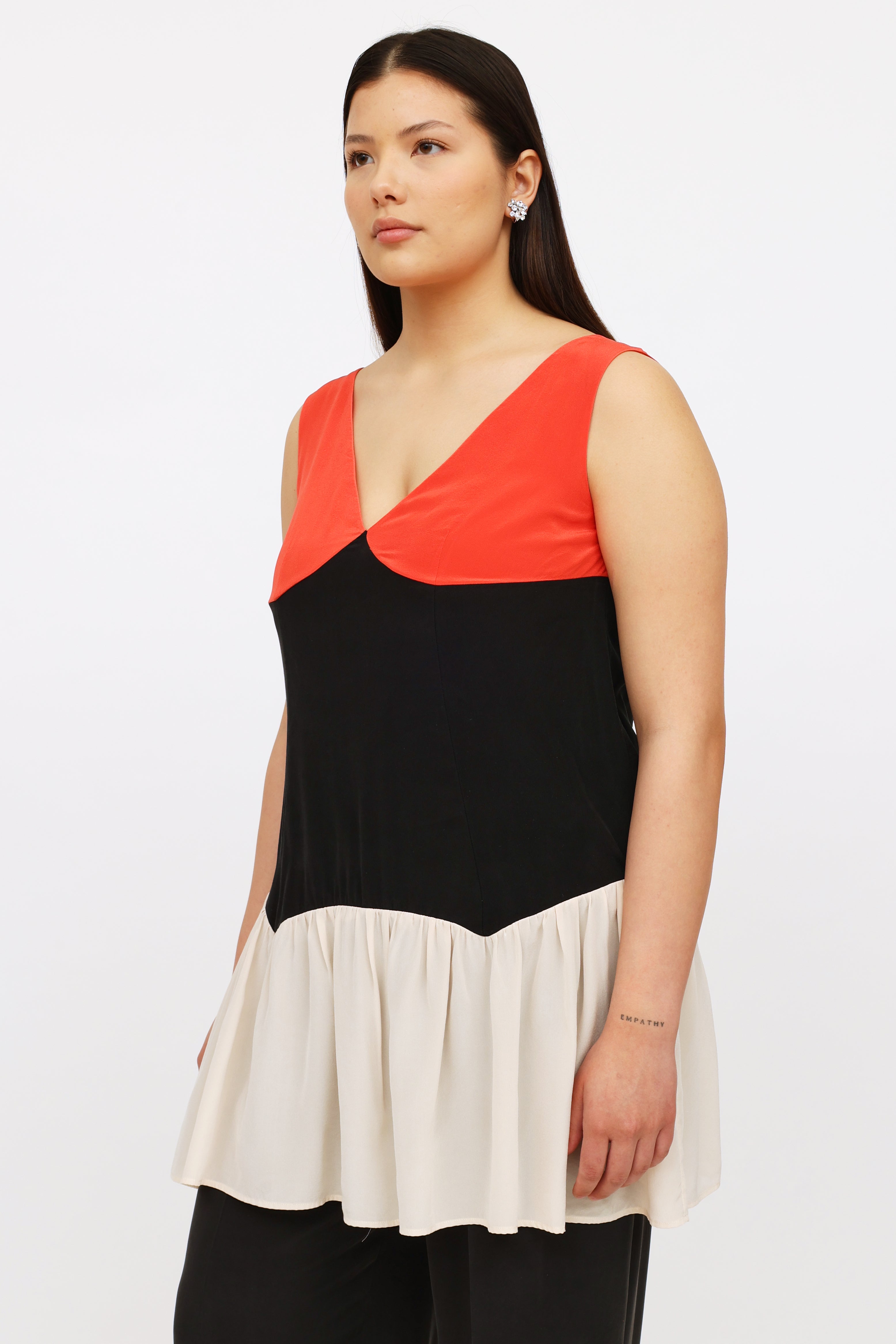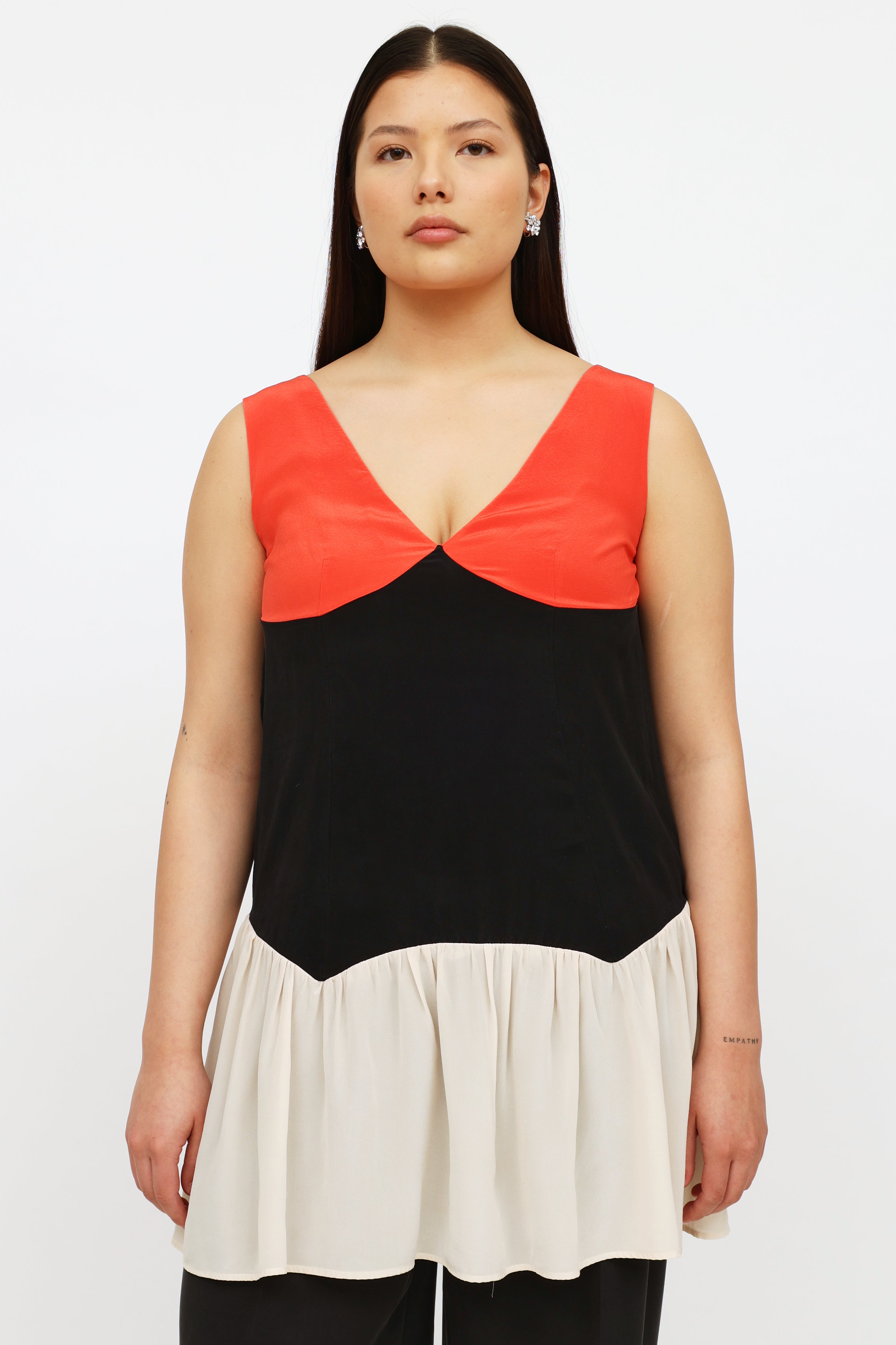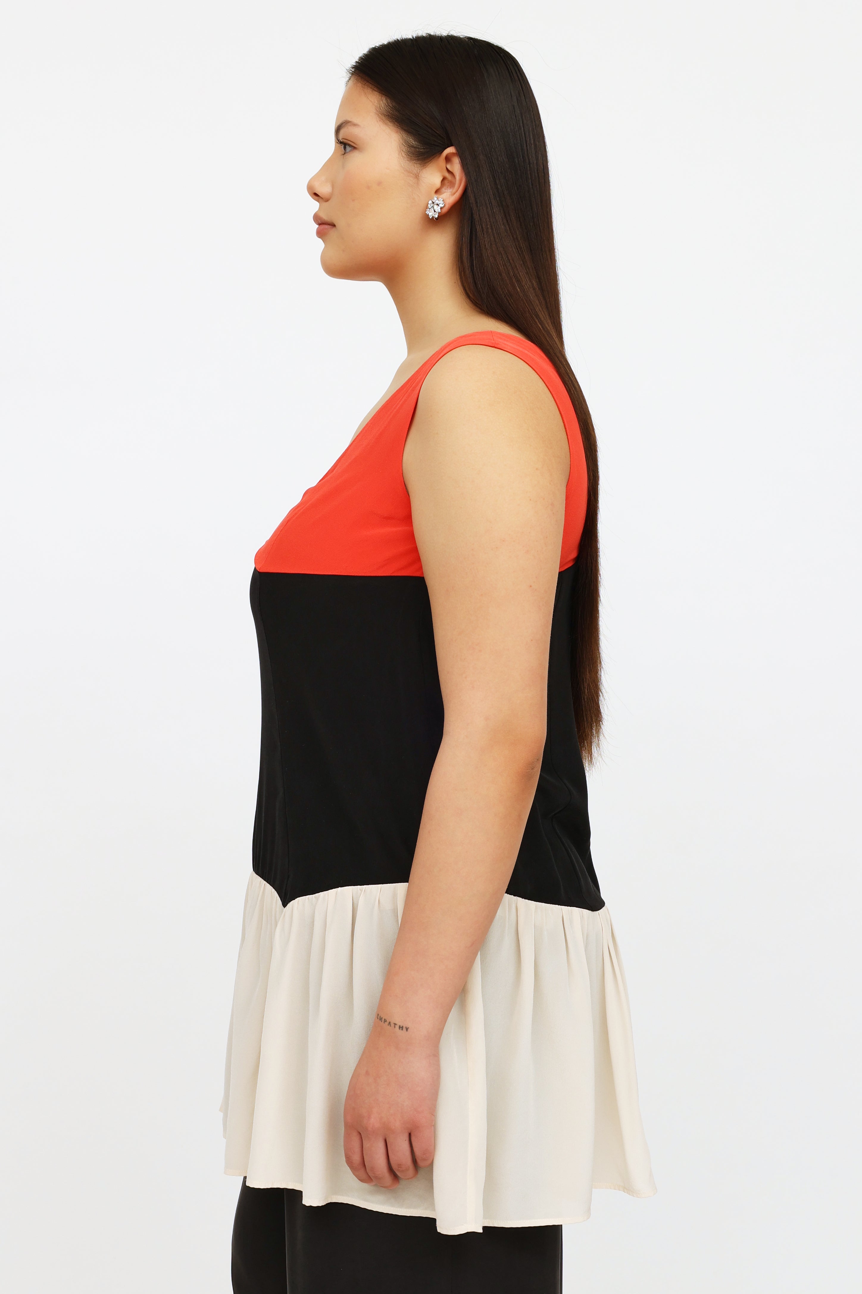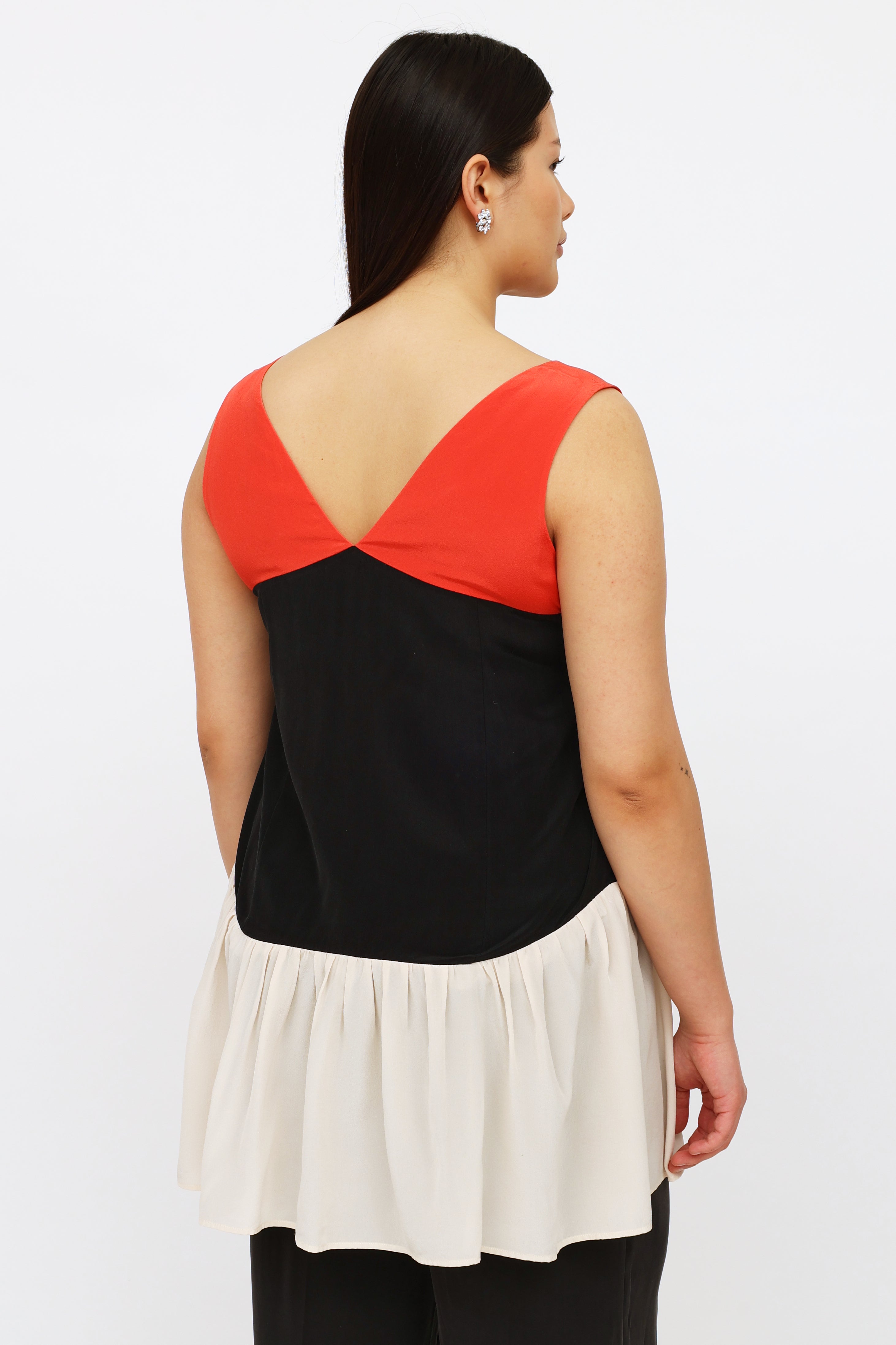 Pre-owned Miu Miu red black and cream sleeveless top featuring front and back v-neckline and gathered lower hem.