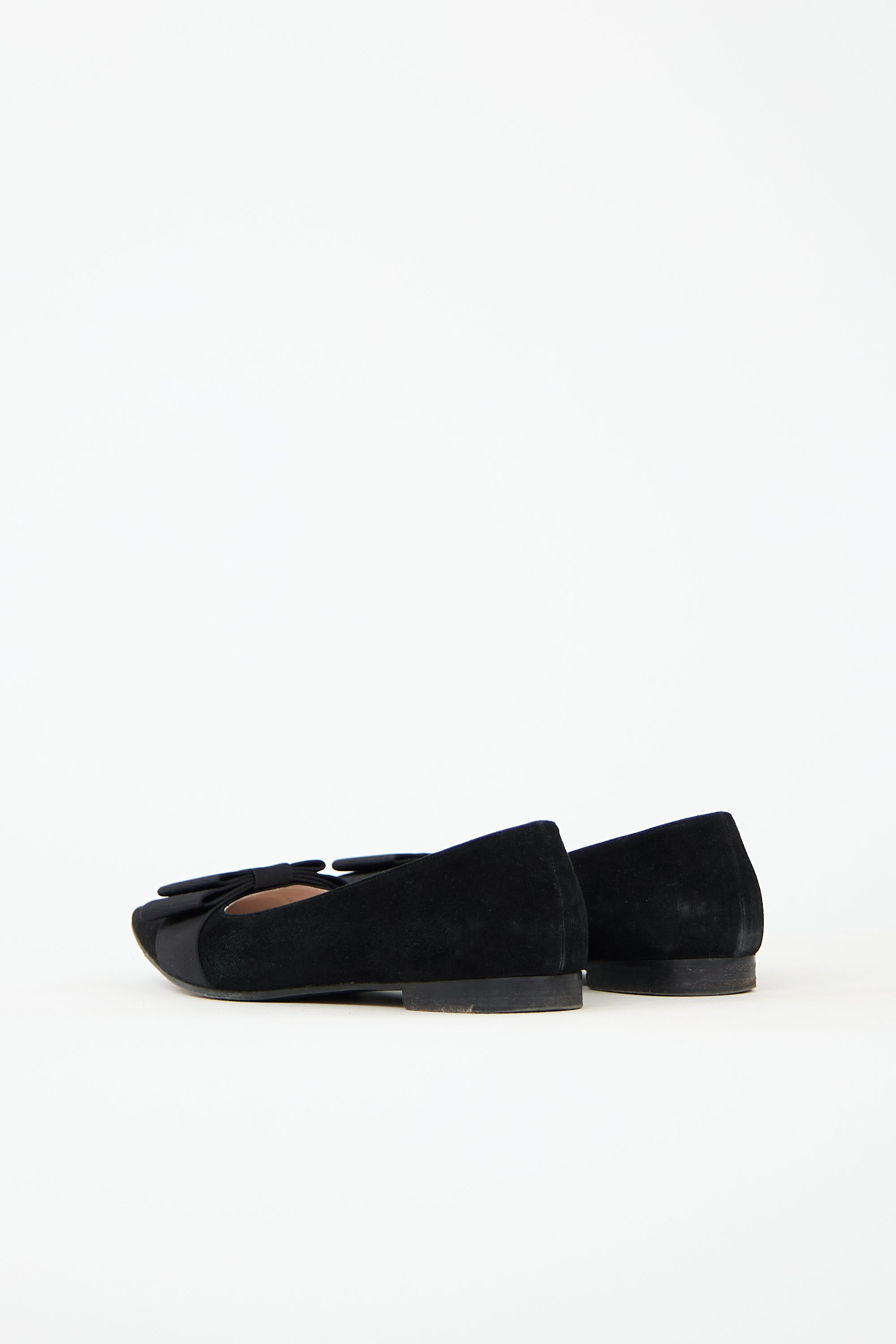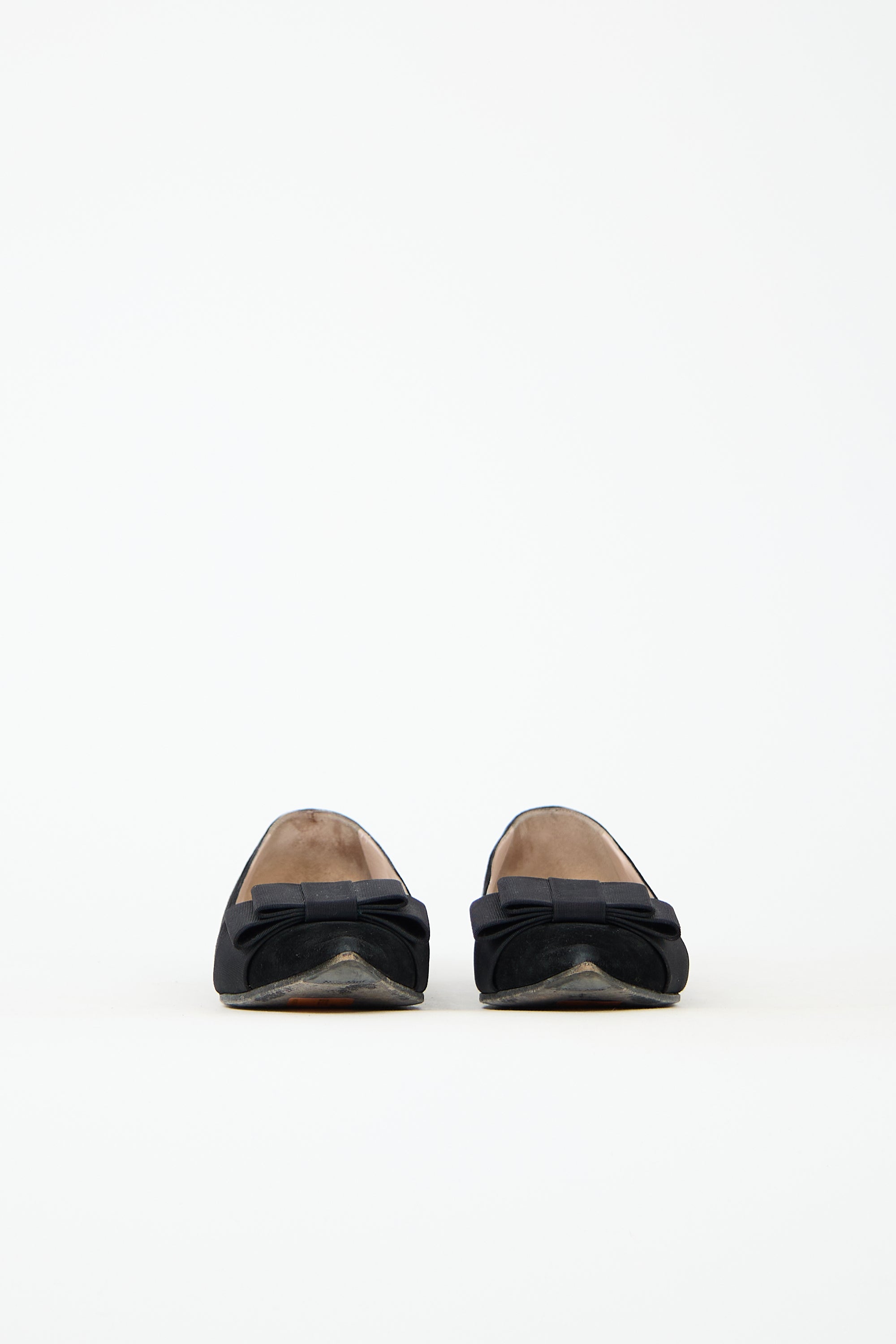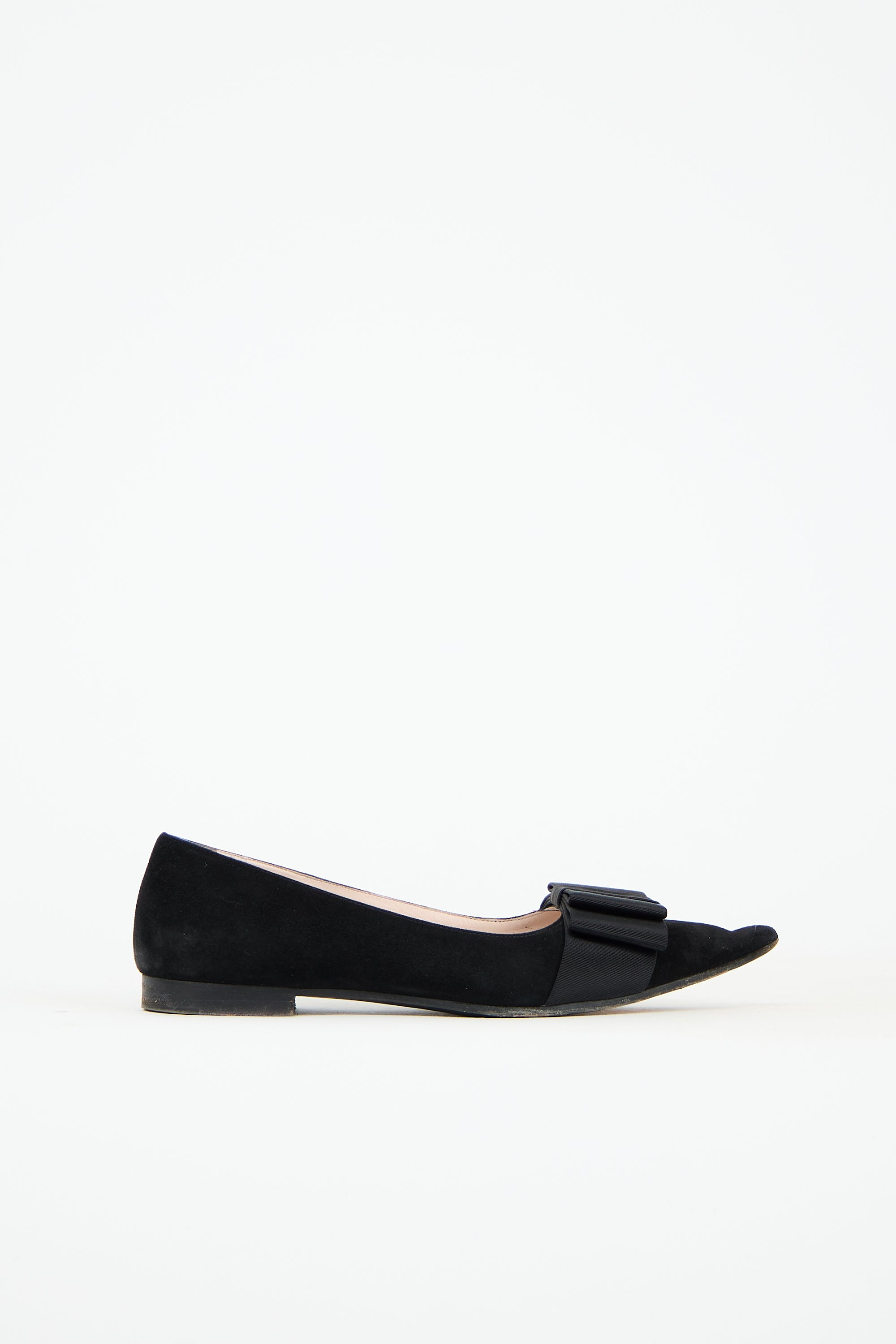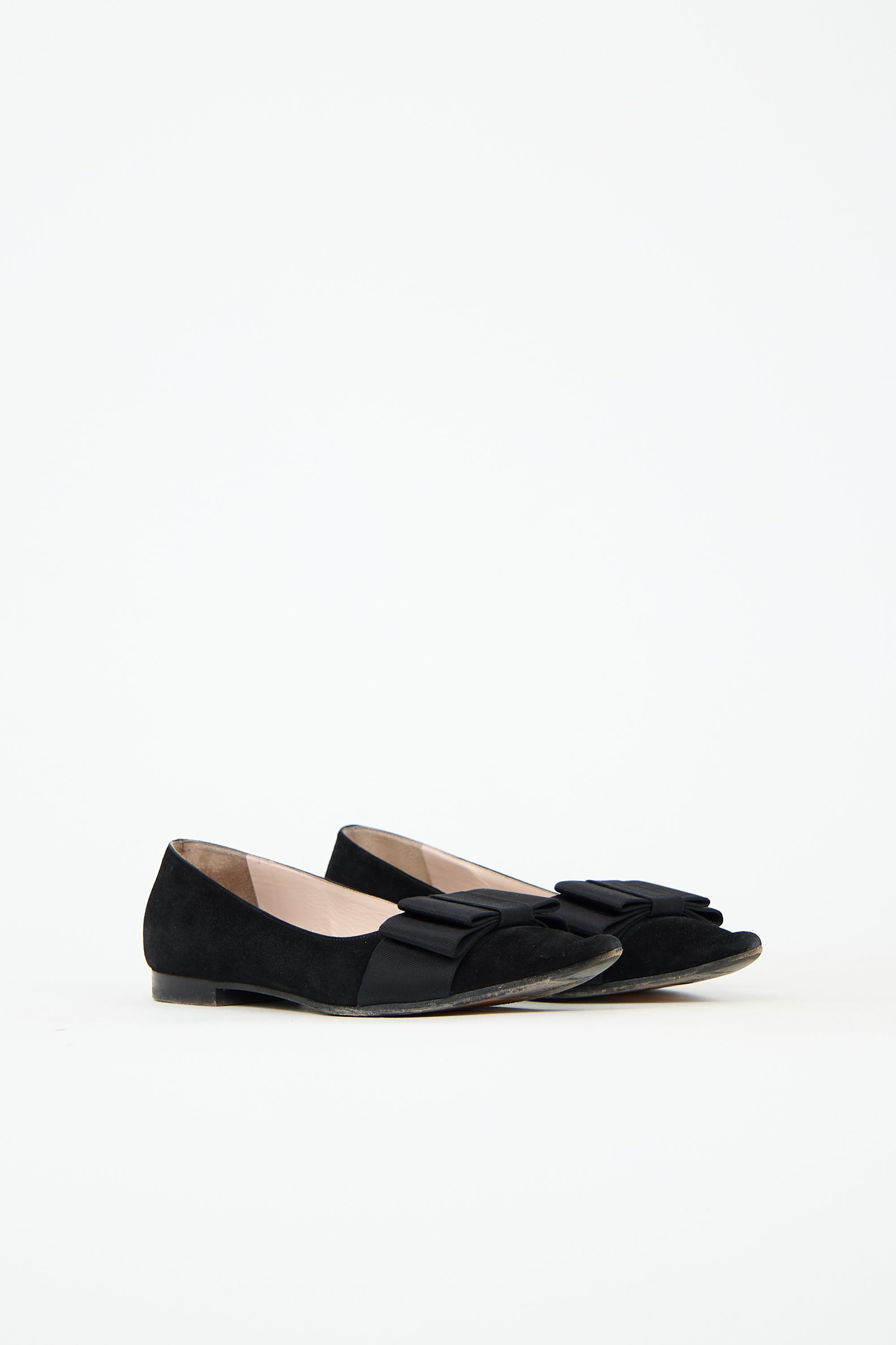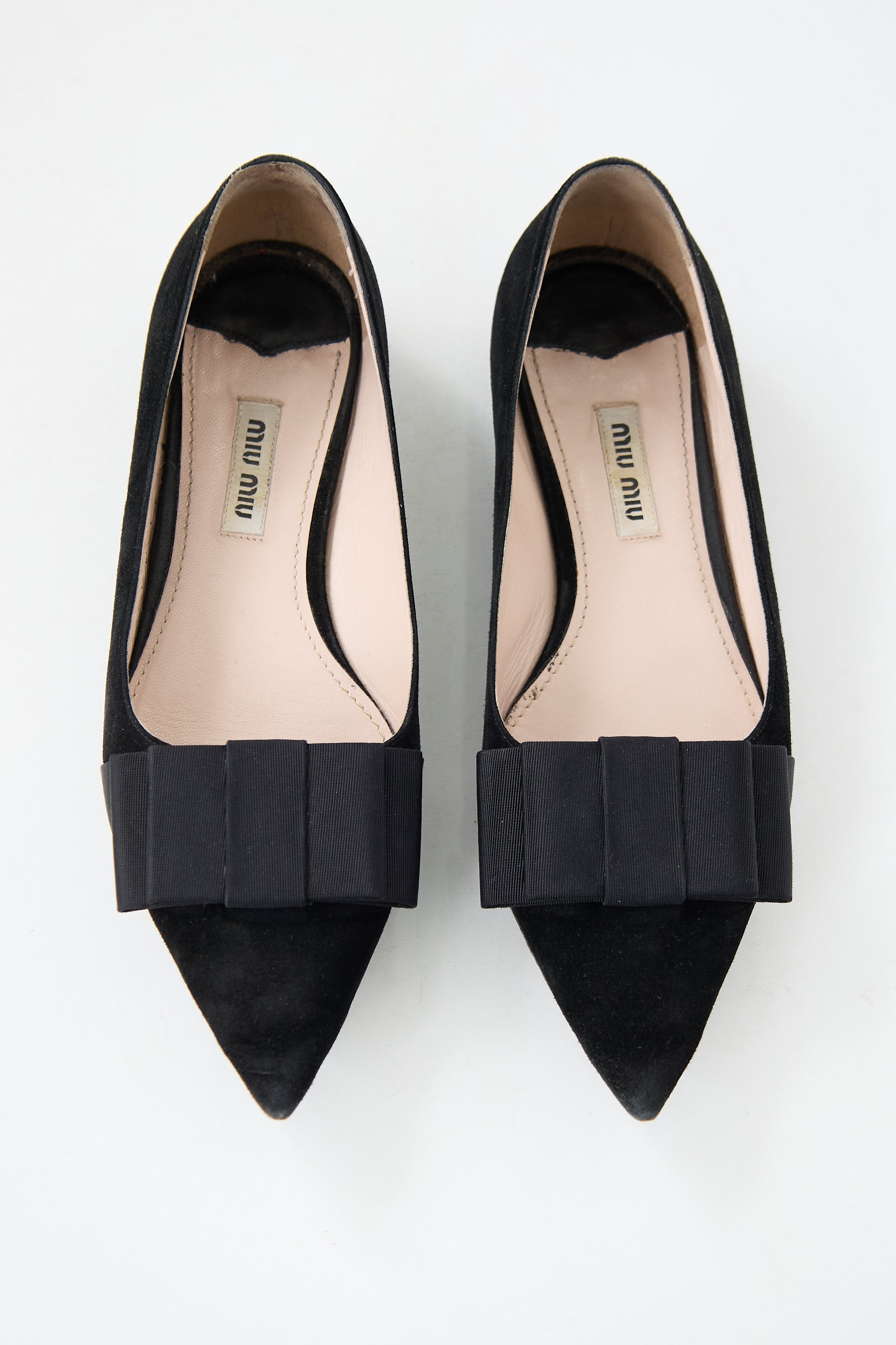 Pre-owned Miu Miu black suede ballet flats featuring pointed toe and bow at vamp. Comes with original dust bags.