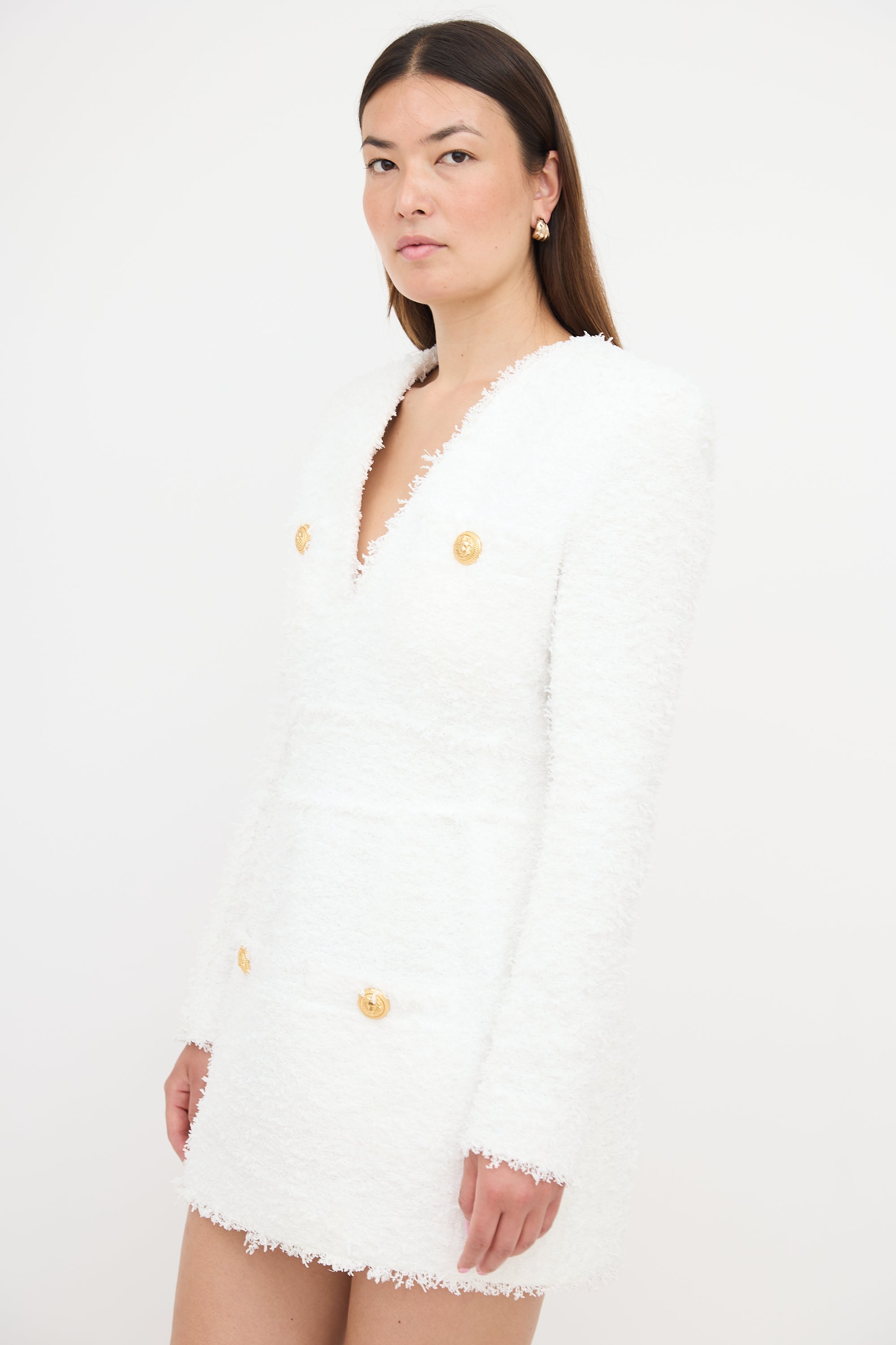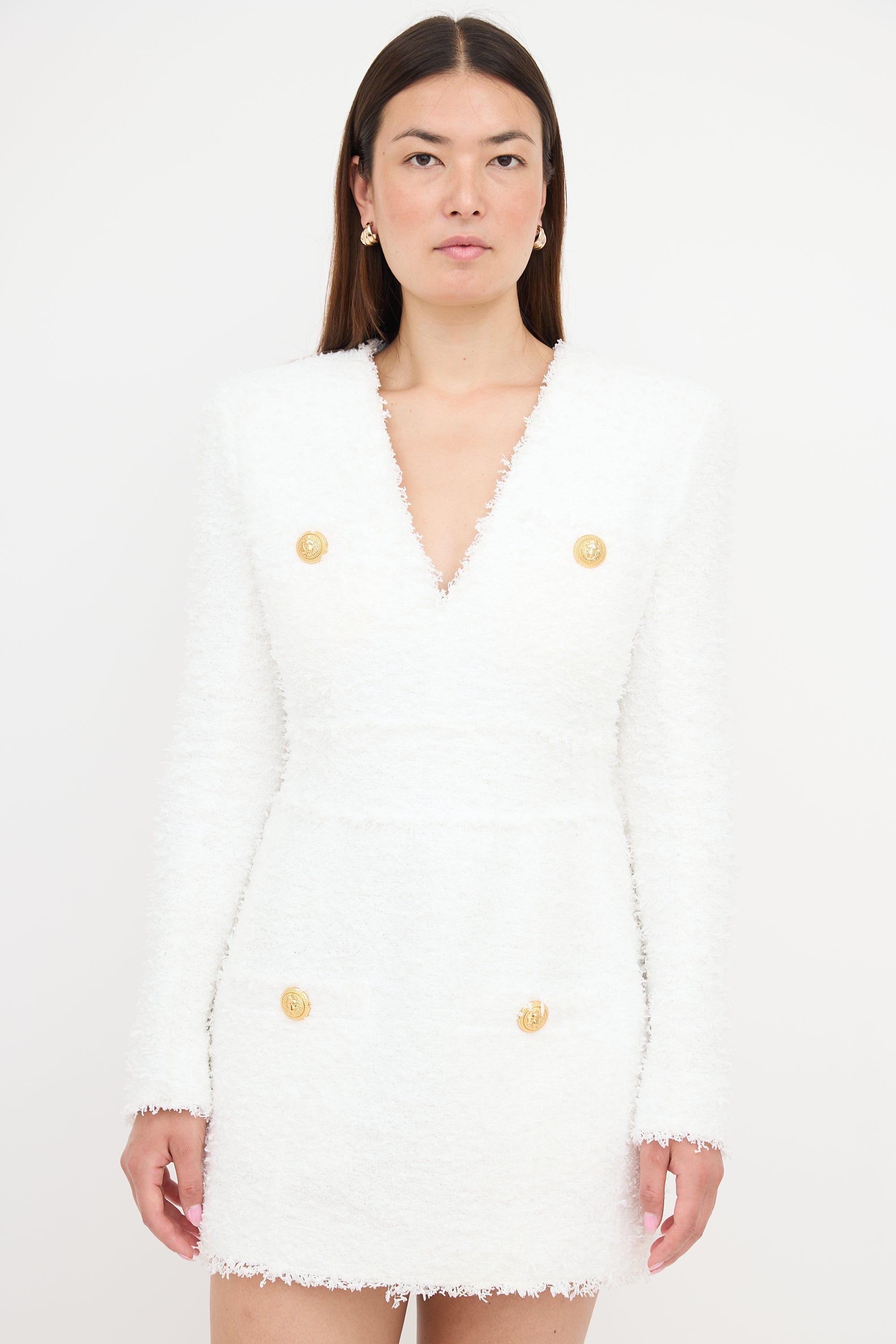 Pre-owned Balmain white frayed tweed mini dress featuring V-neckline, four front patch pockets with gold tone buttons, padded shoulders, and back zip. Lined.