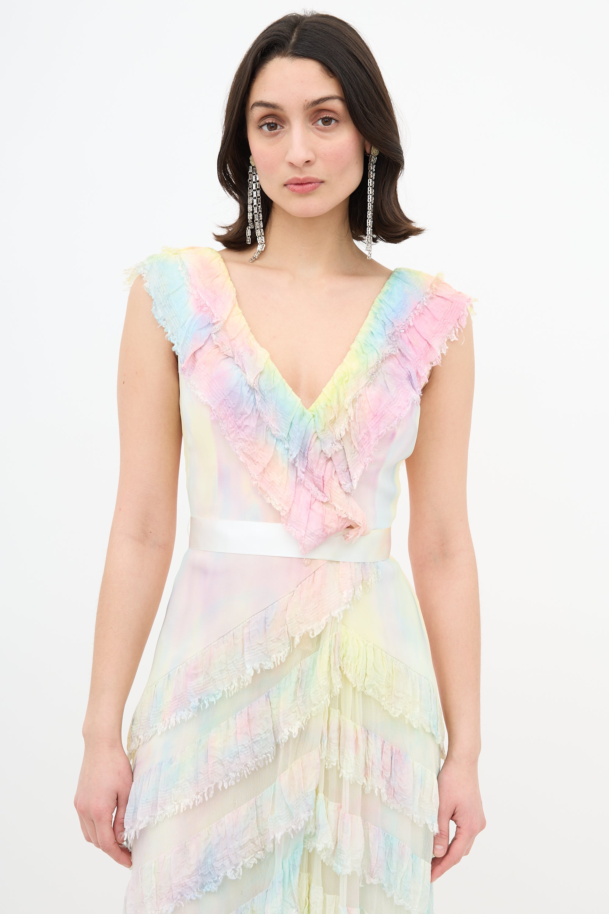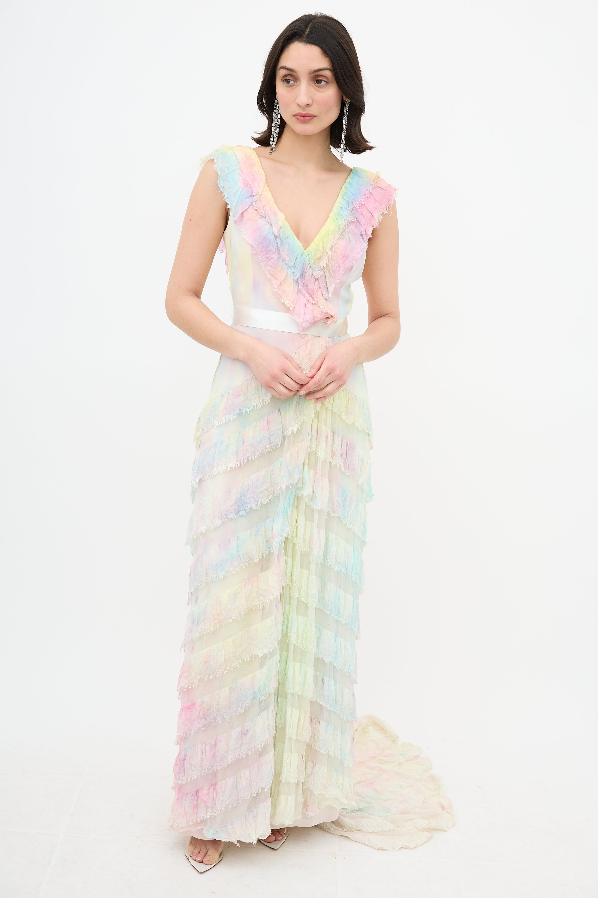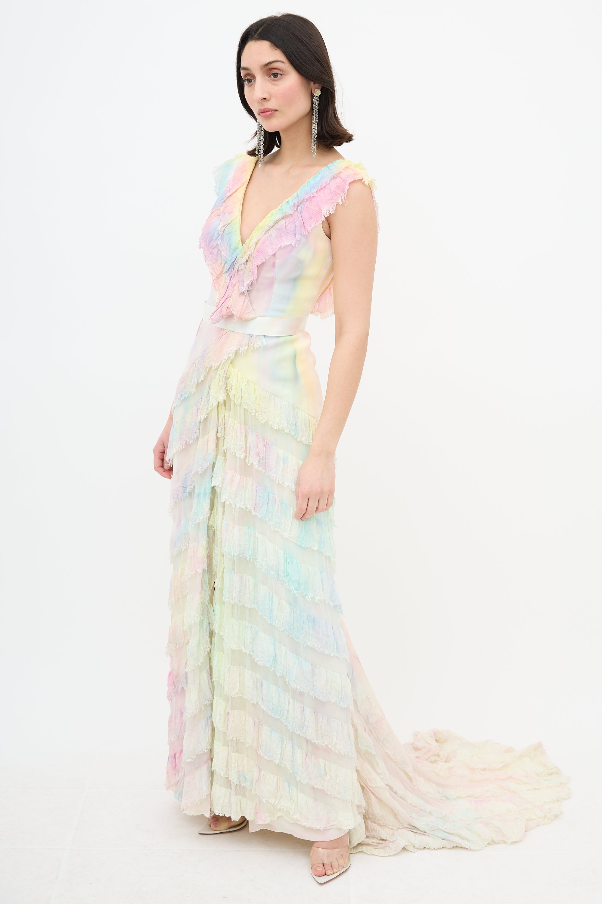 Pre-owned Carolina Herrera silk gradient tie dye gown featuring a V-neckline, frayed edge ruffles throughout, vented front hem, train skirt, waist belt with dual hook fastenings, and a back zip closure with hook fastening. Lined.
