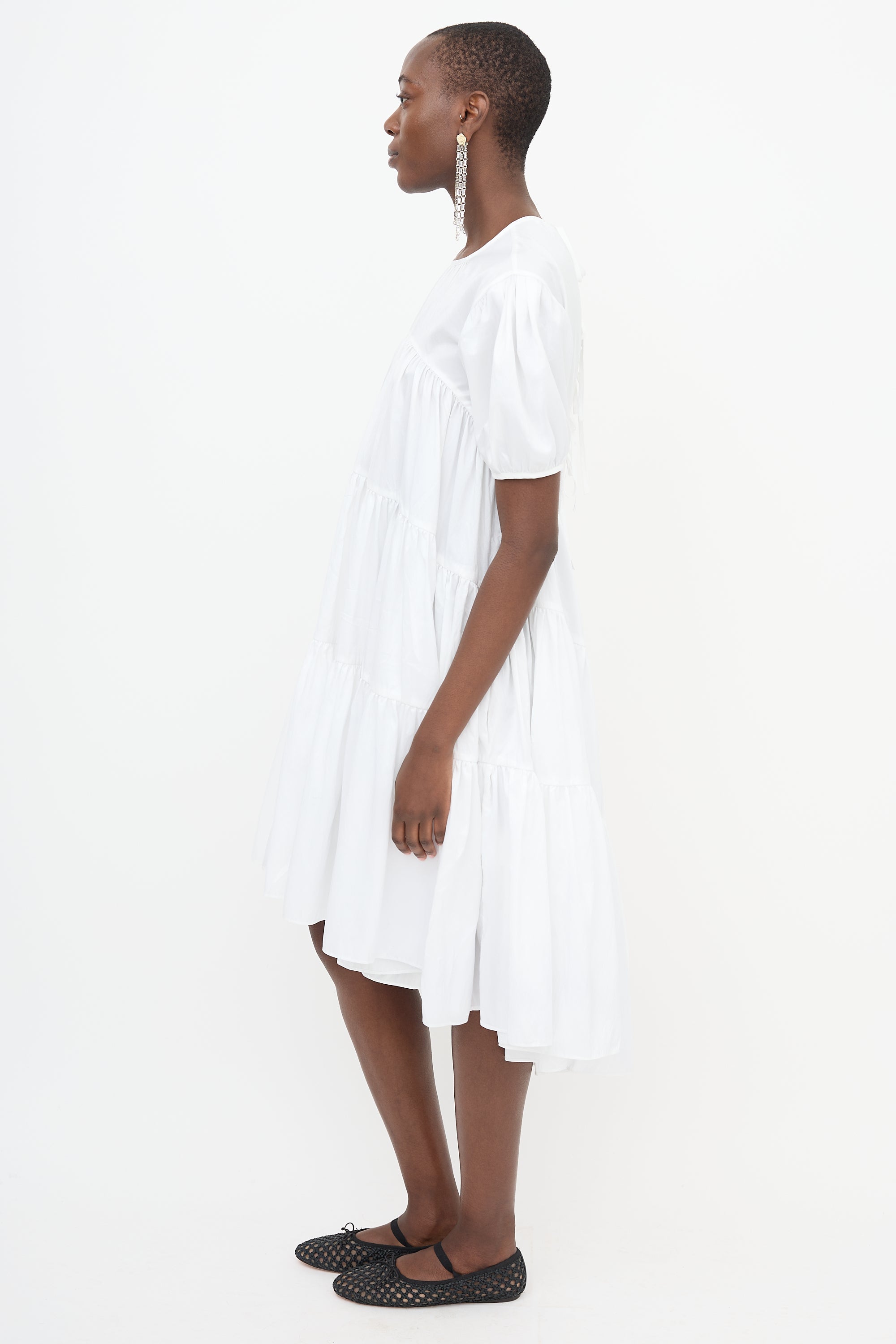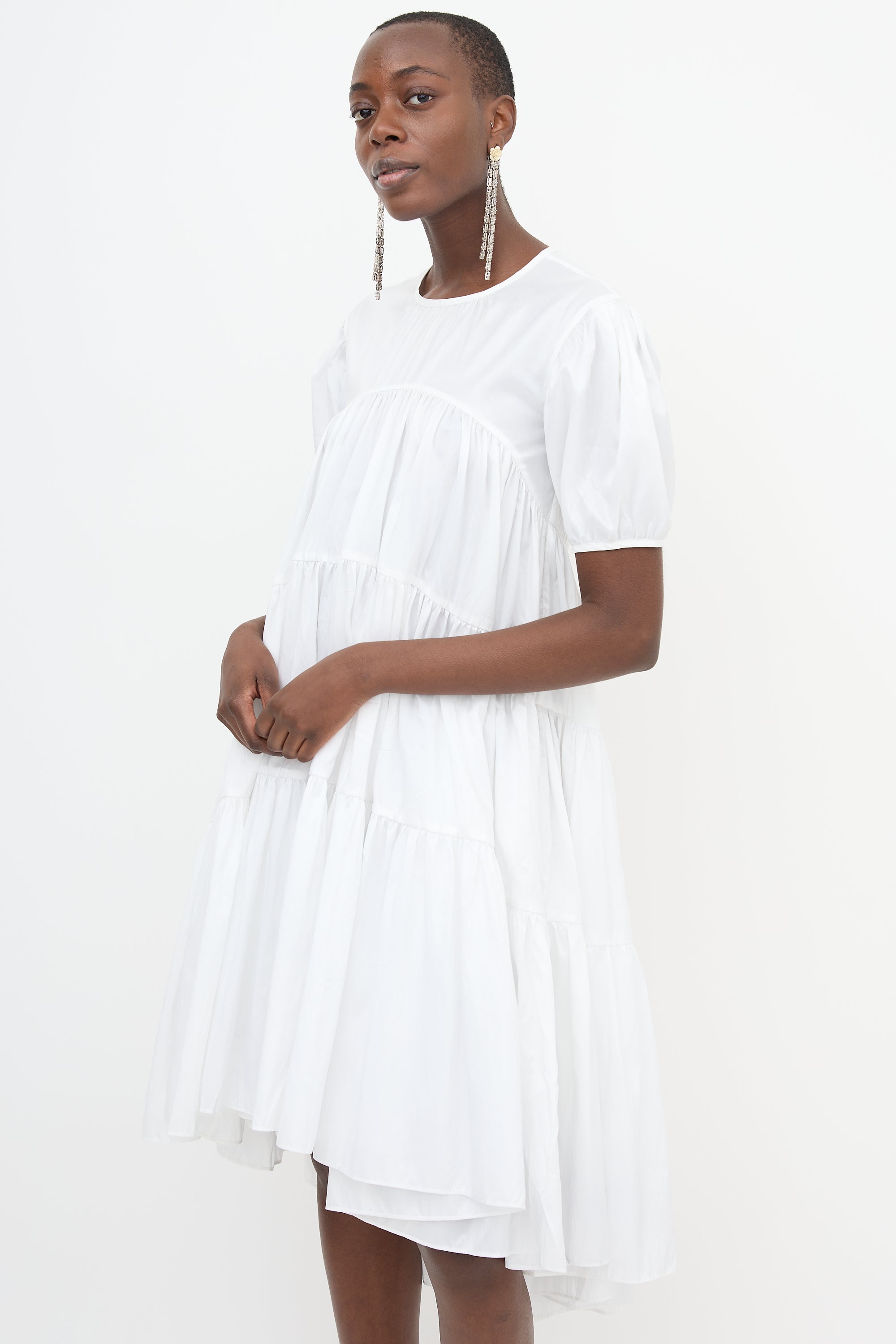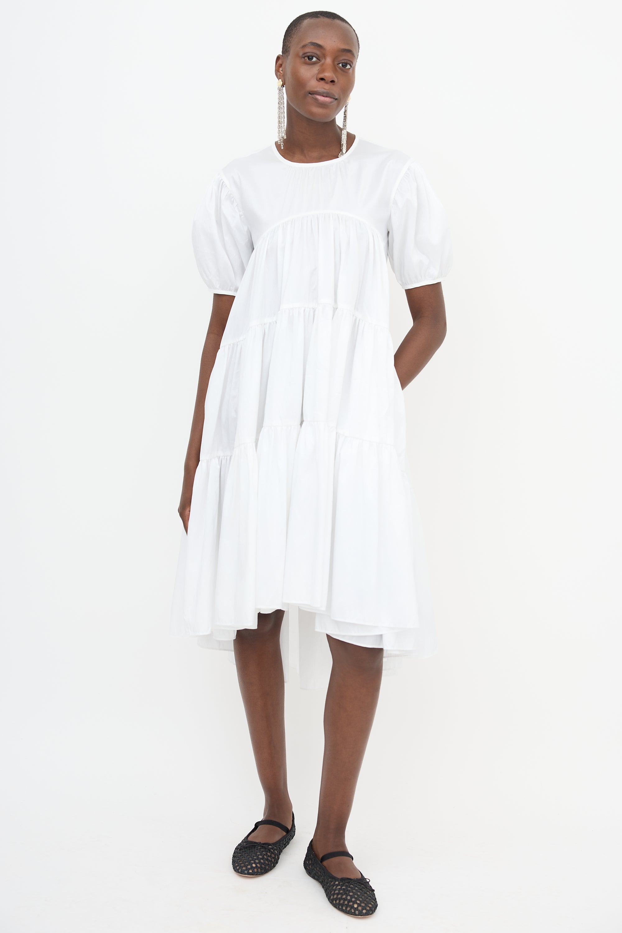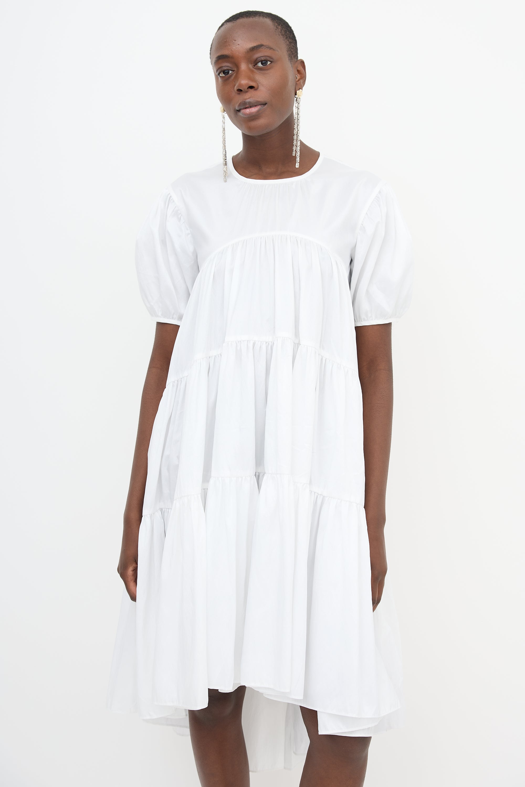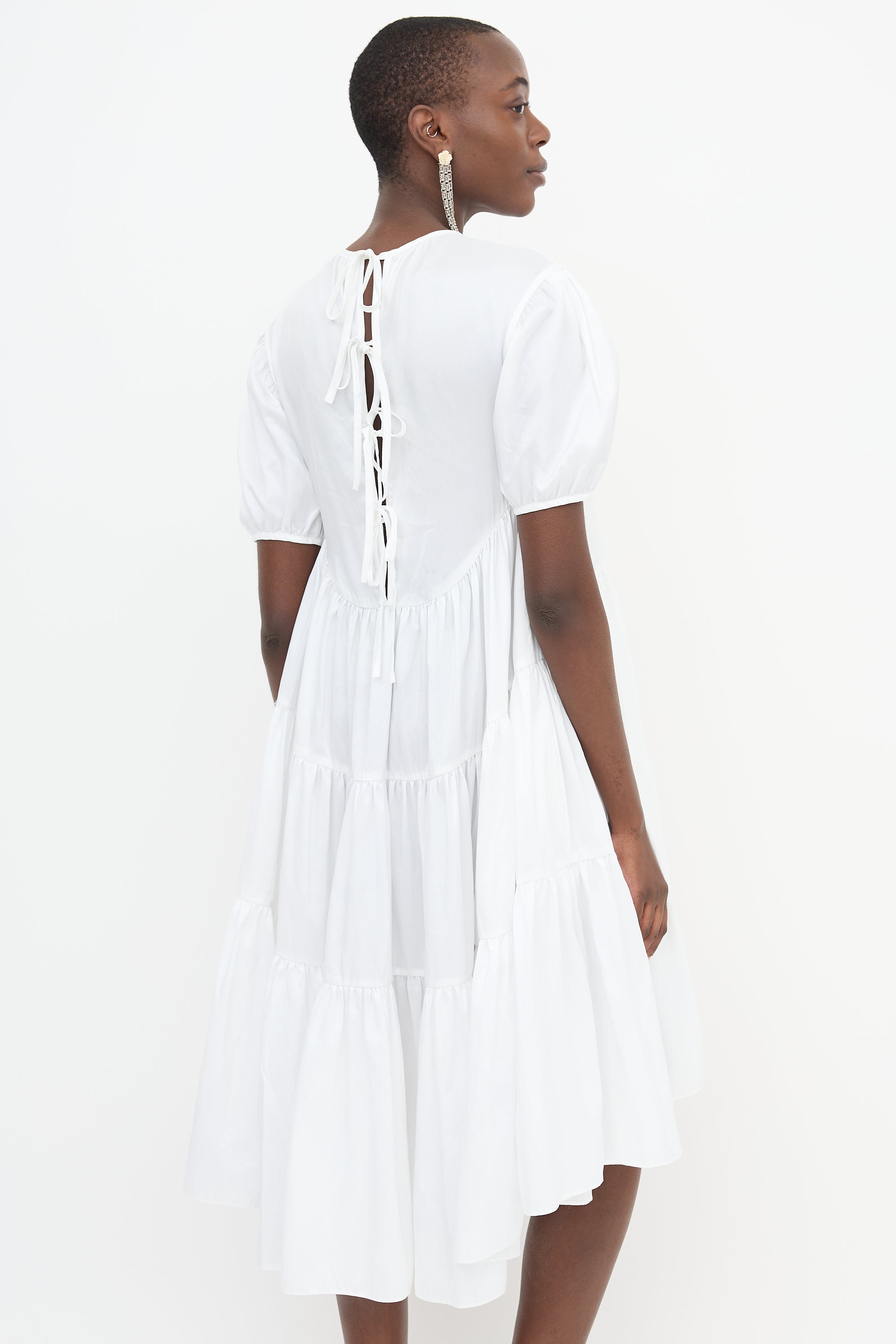 Pre-owned Cecilie Bahnsen white taffeta Esme midi dress featuring round neckline, in seam pockets, gathered tiers, four tie back, high low hem, and puff sleeves.