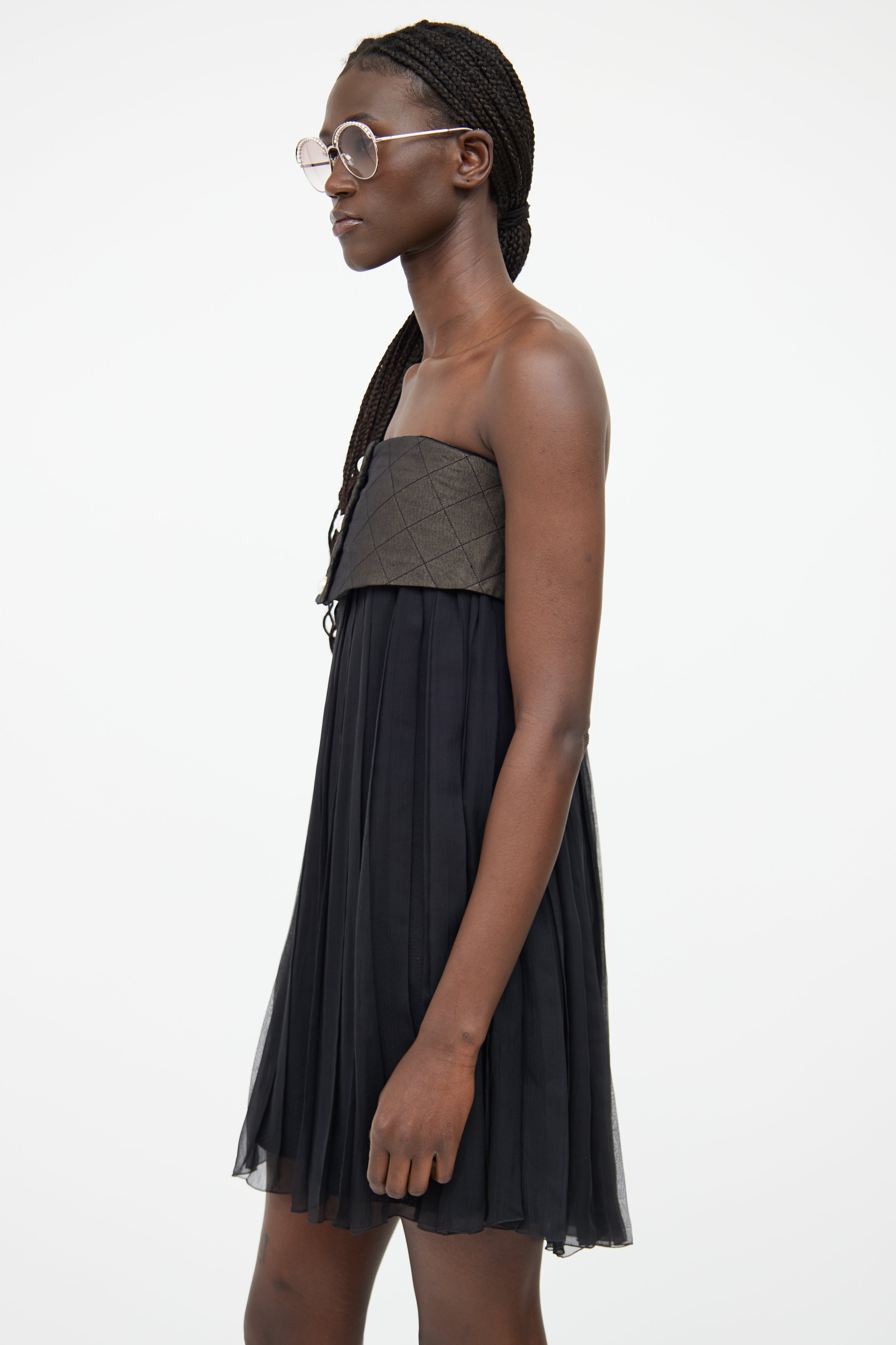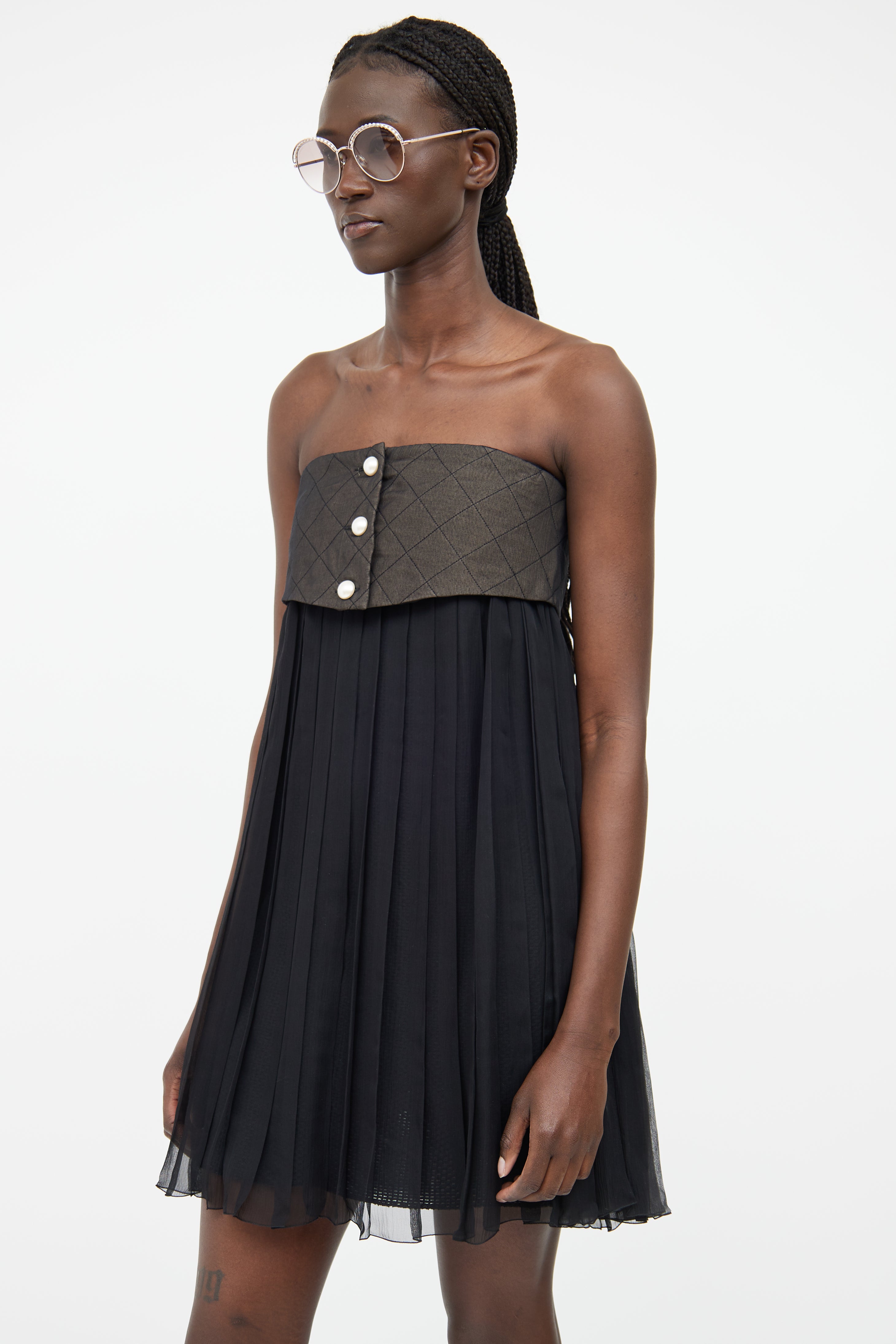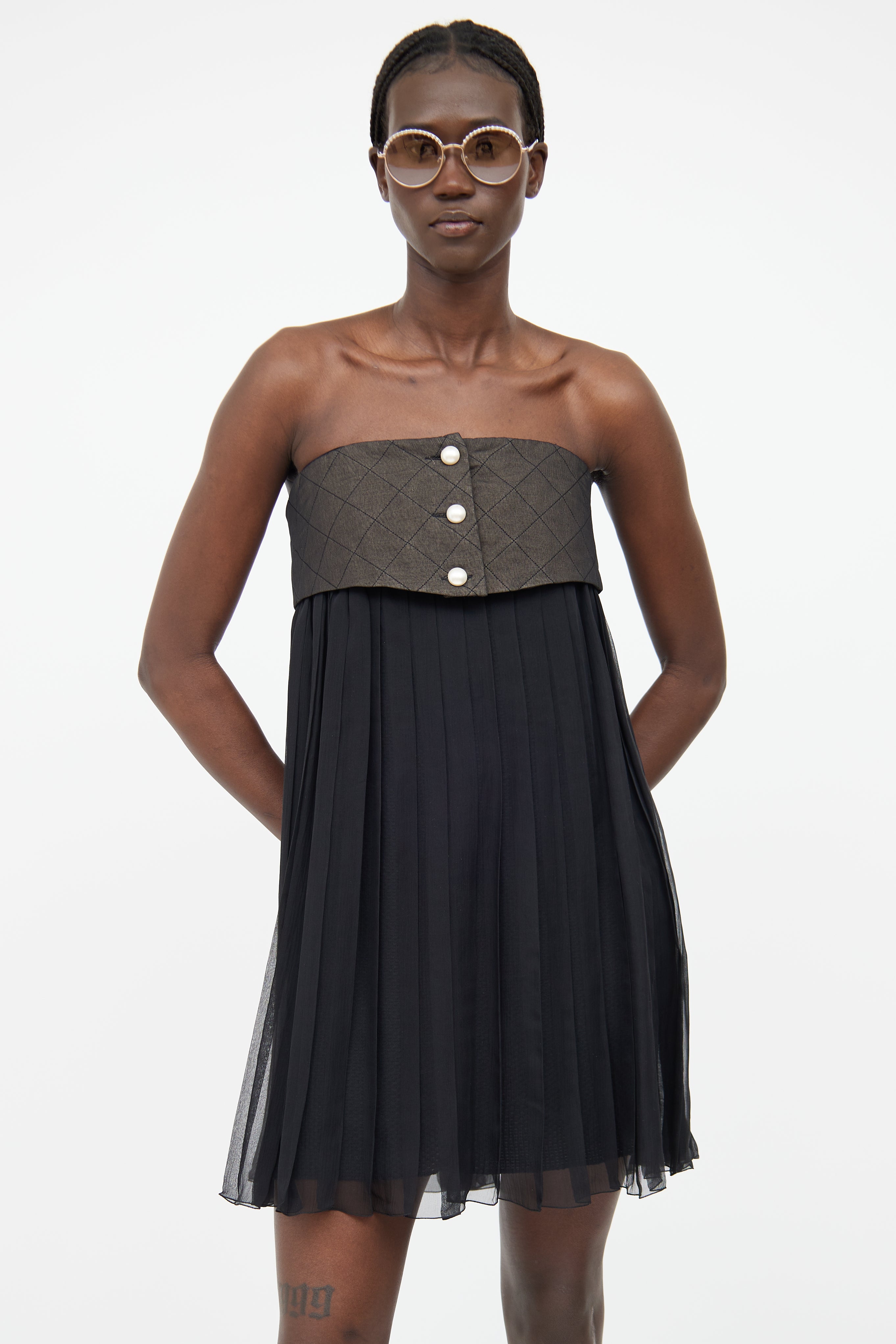 Pre-owned Chanel Spring/Summer 2013 dark grey and black dress featuring a straight across neckline, pearlescent logo stamped button detail, pleated sheer skirt with mesh underlay, and concealed zip at front.