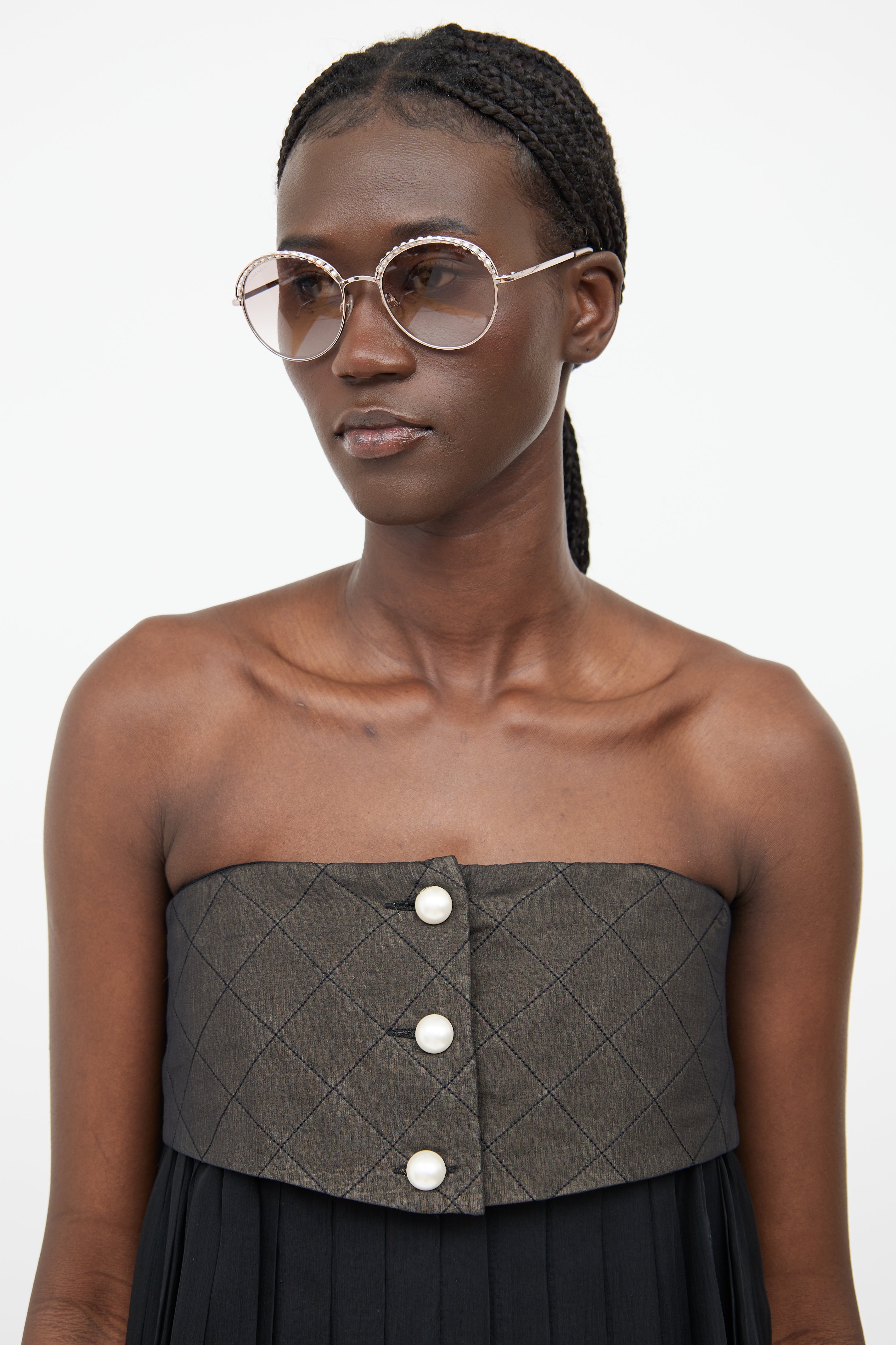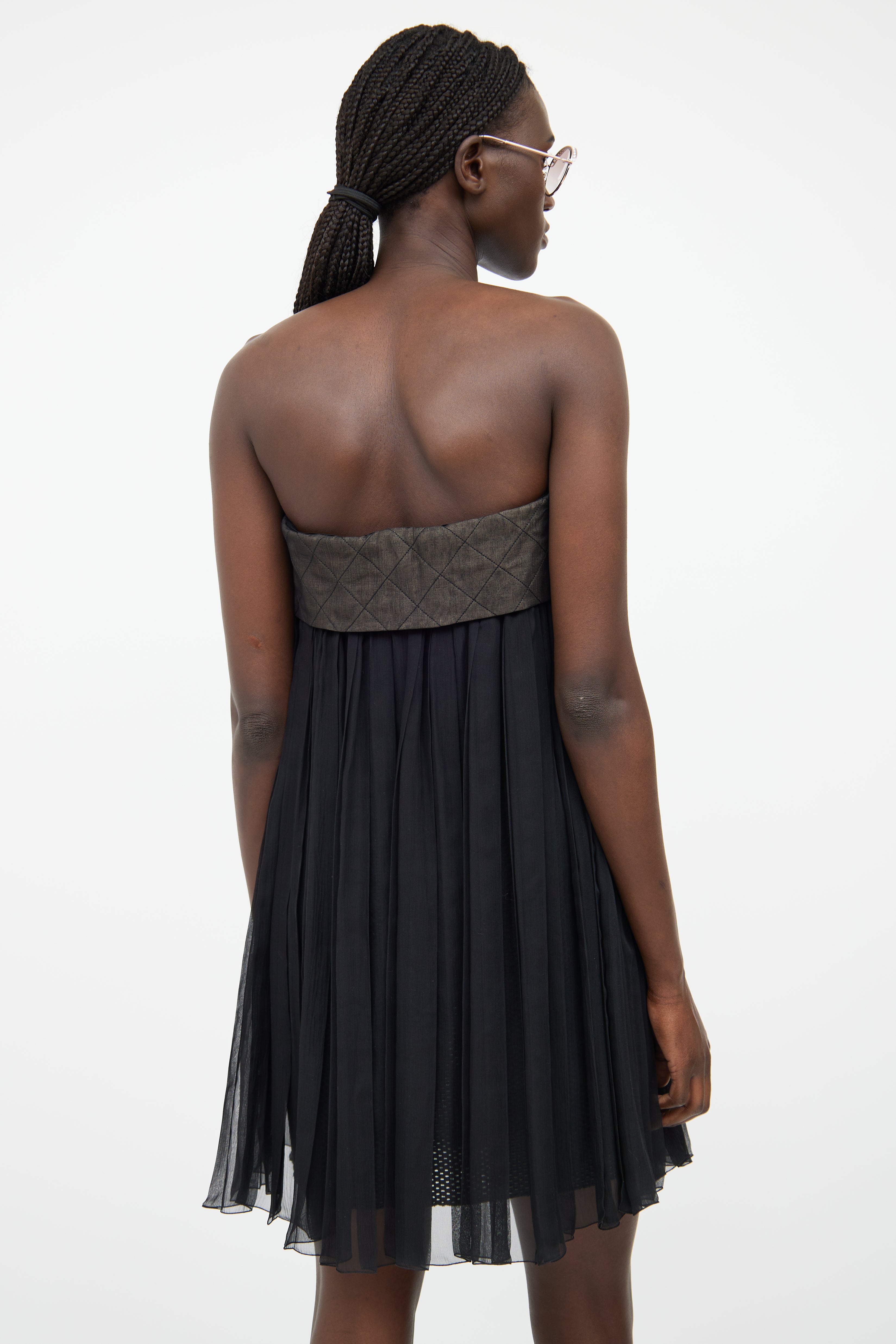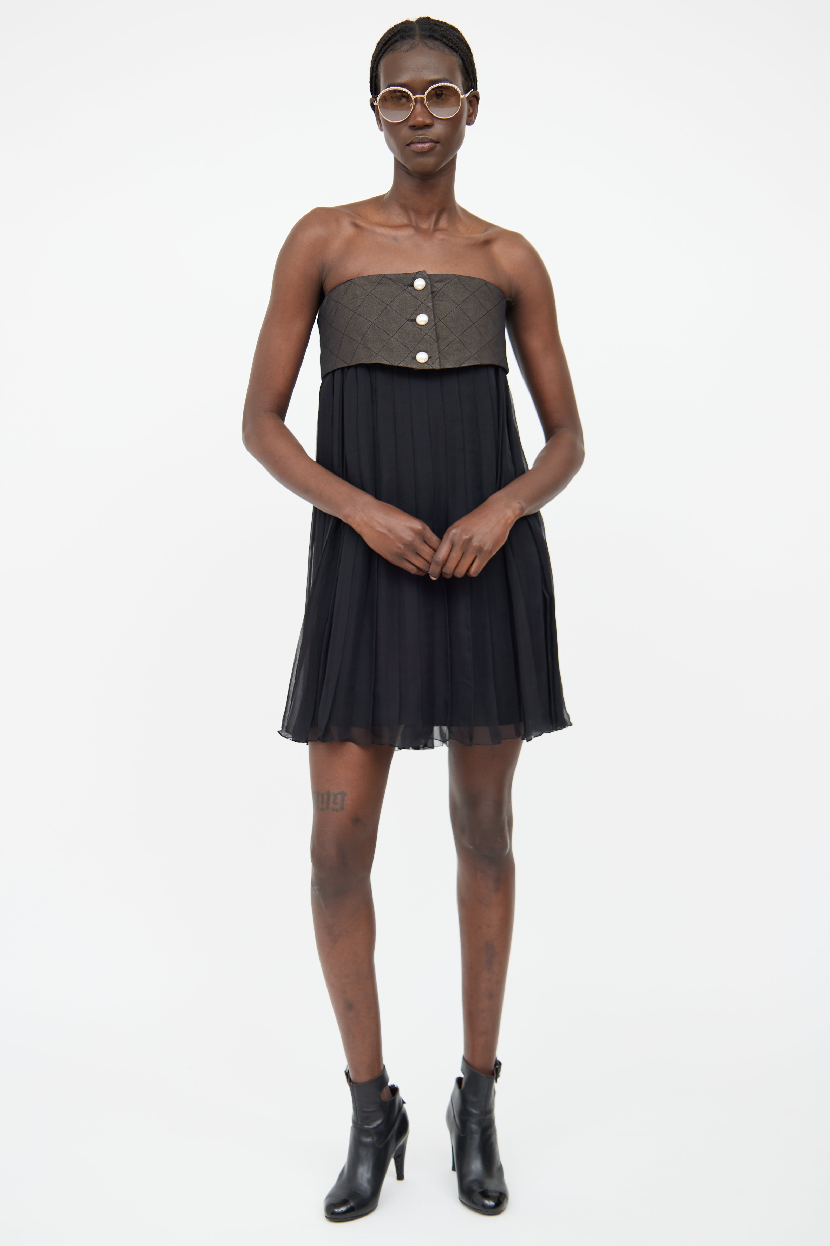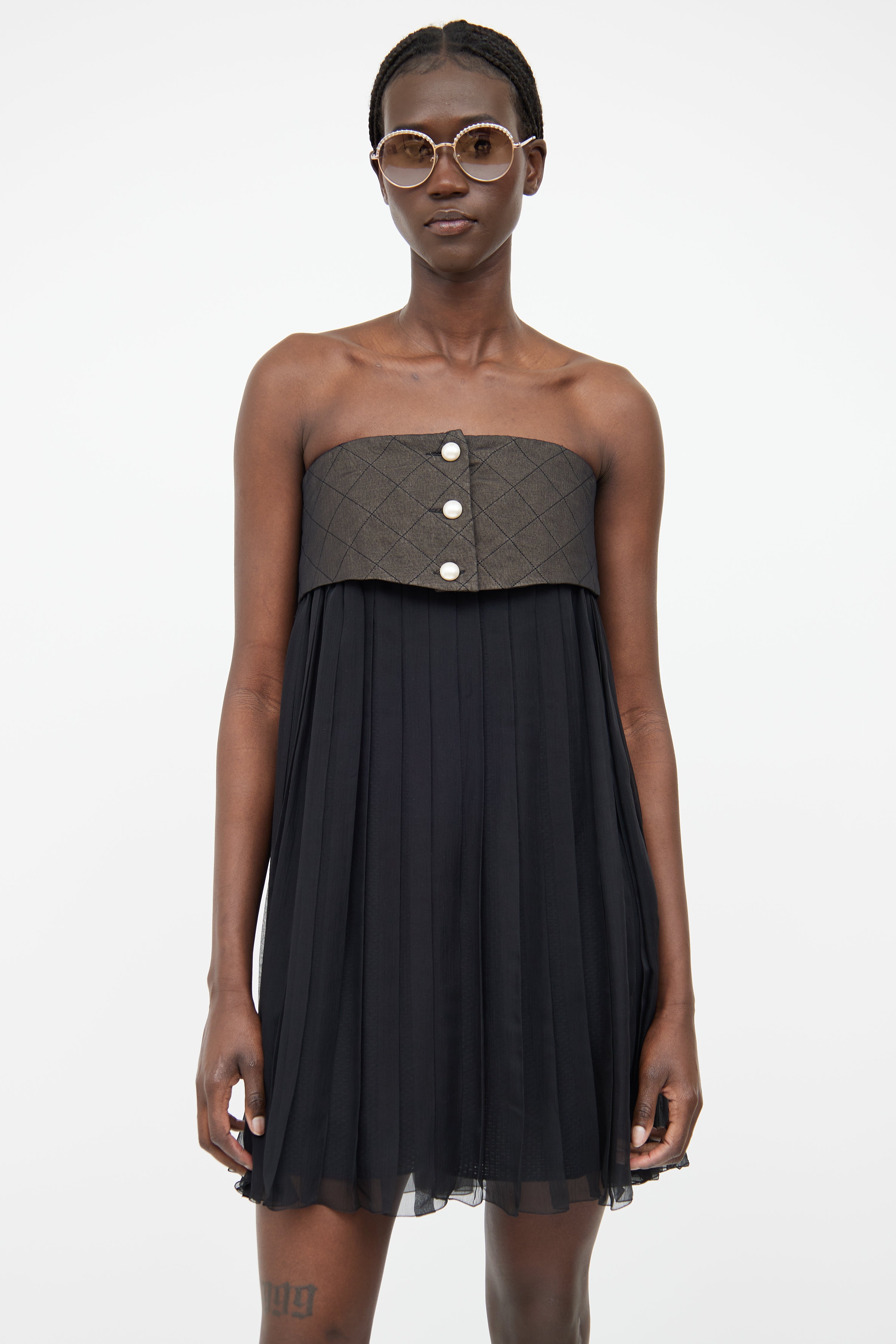 Pre-owned Chanel Spring/Summer 2013 dark grey and black dress featuring a straight across neckline, pearlescent logo stamped button detail, pleated sheer skirt with mesh underlay, and concealed zip at front.