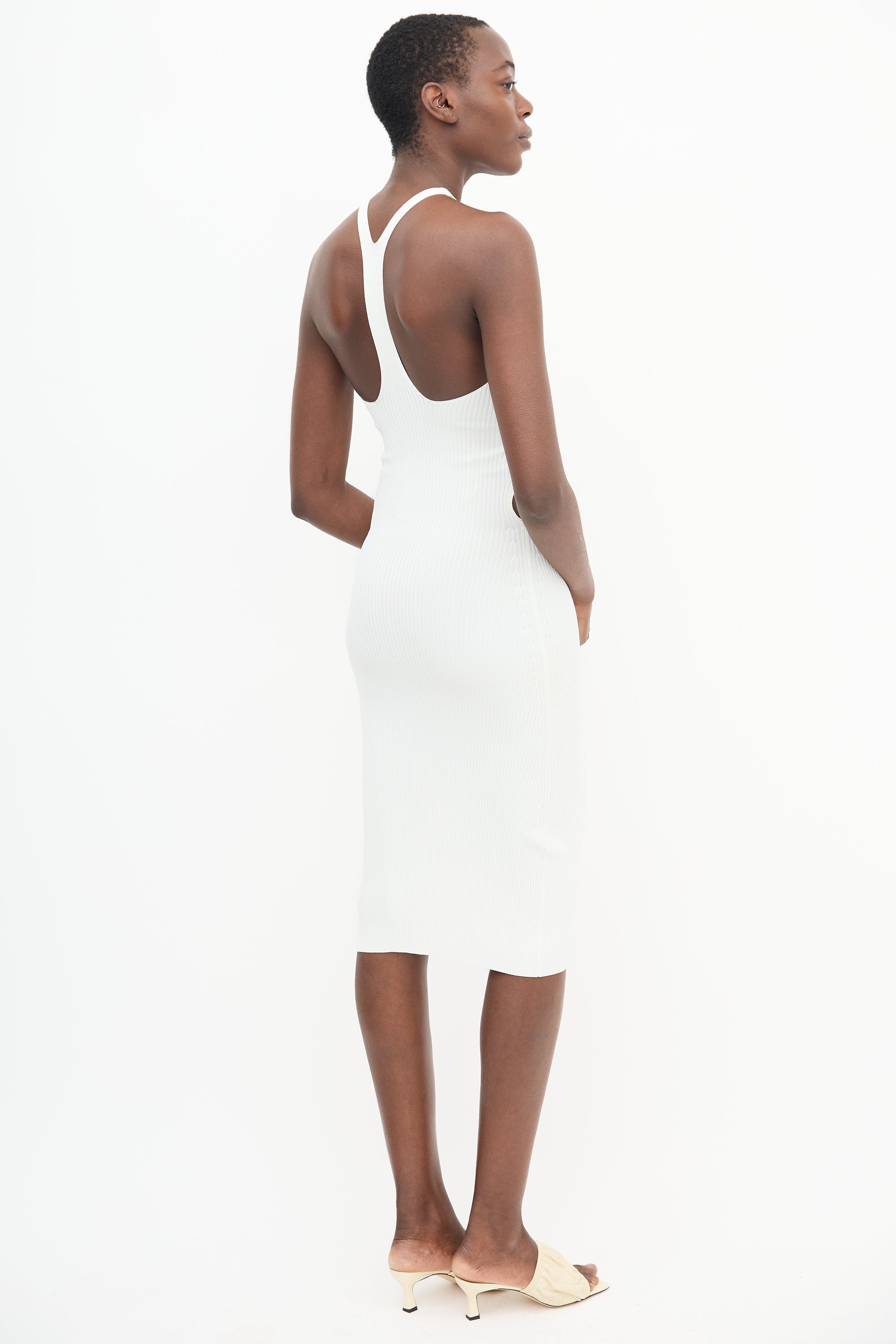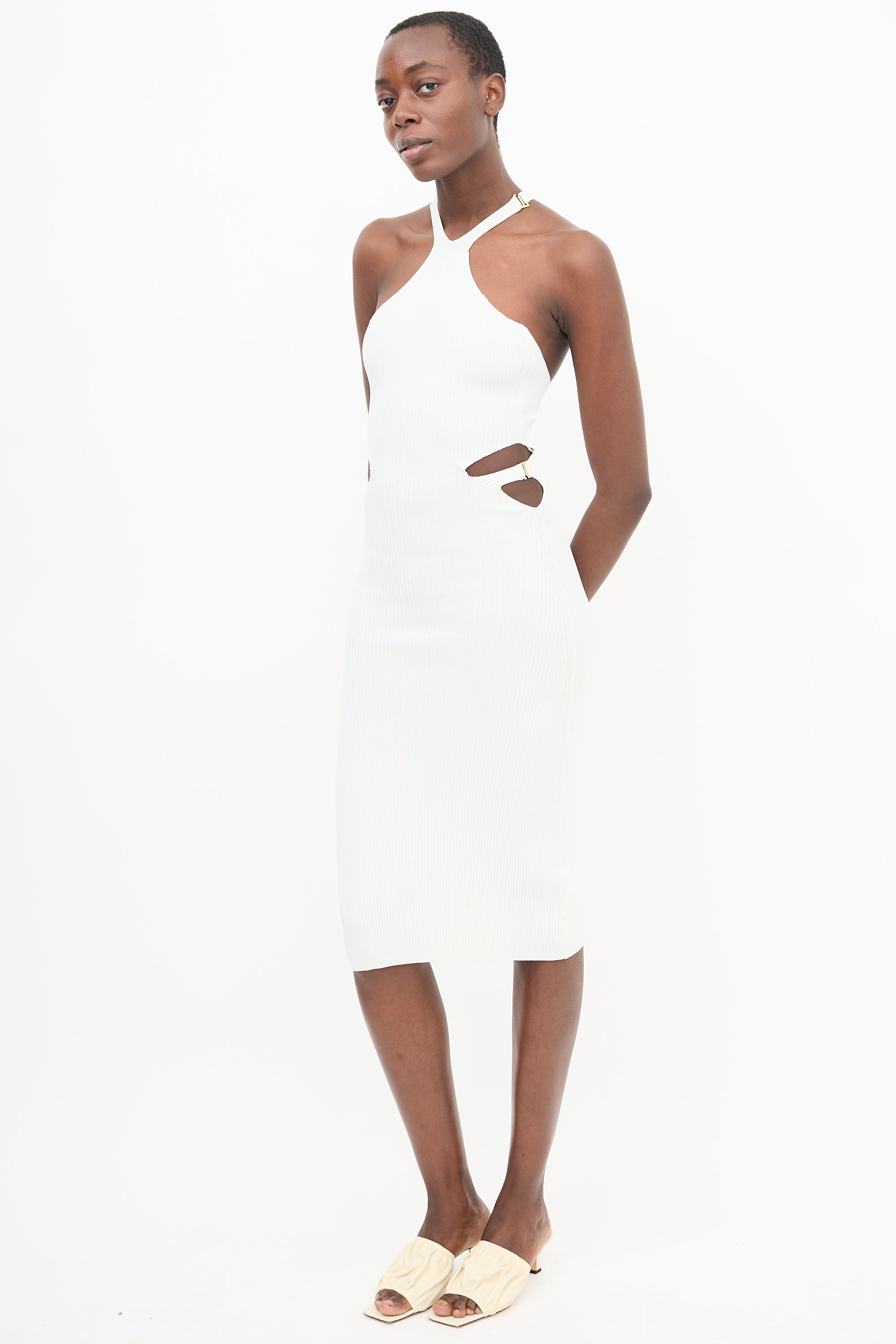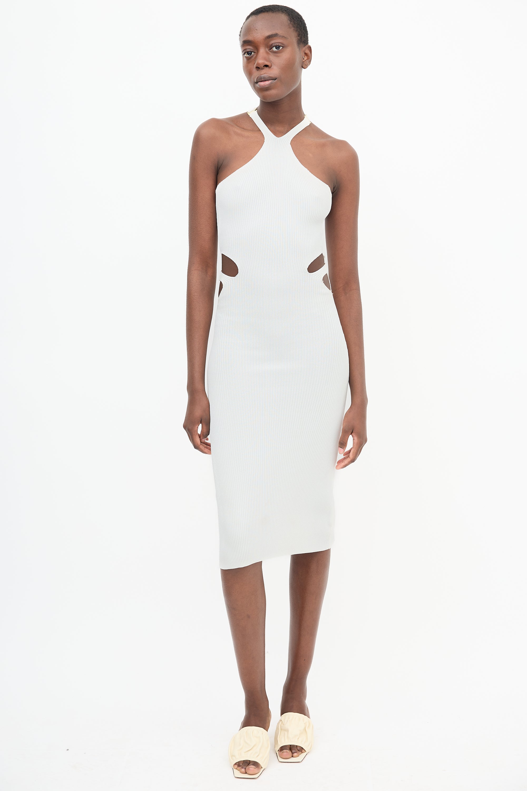 Pre-owned Dion Lee white Lustrate Fork dress featuring a ribbed stretch knit construction, a halter neckline, racerback, waist cutouts, and hook fastenings with gold tone hardware at neck and waist.