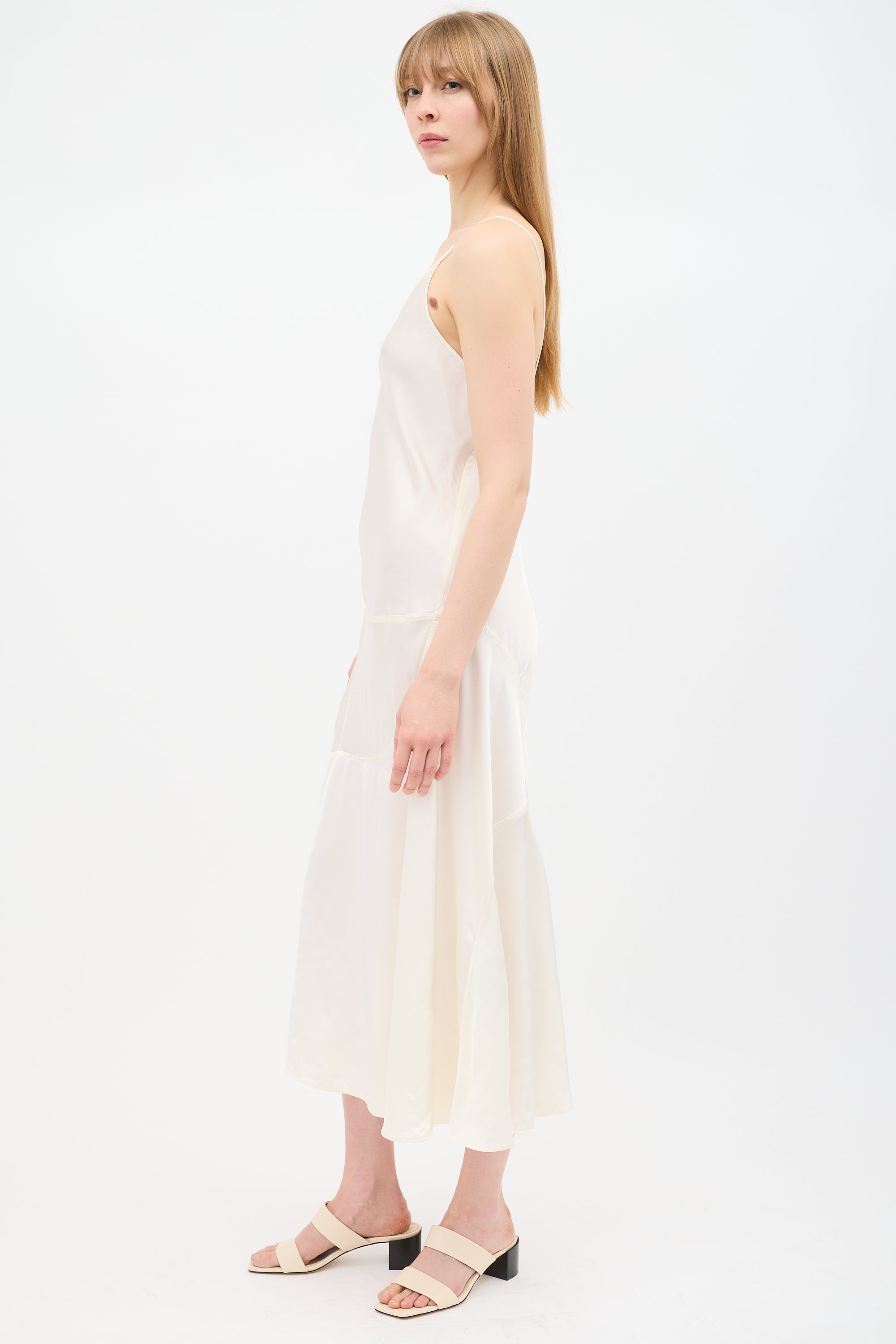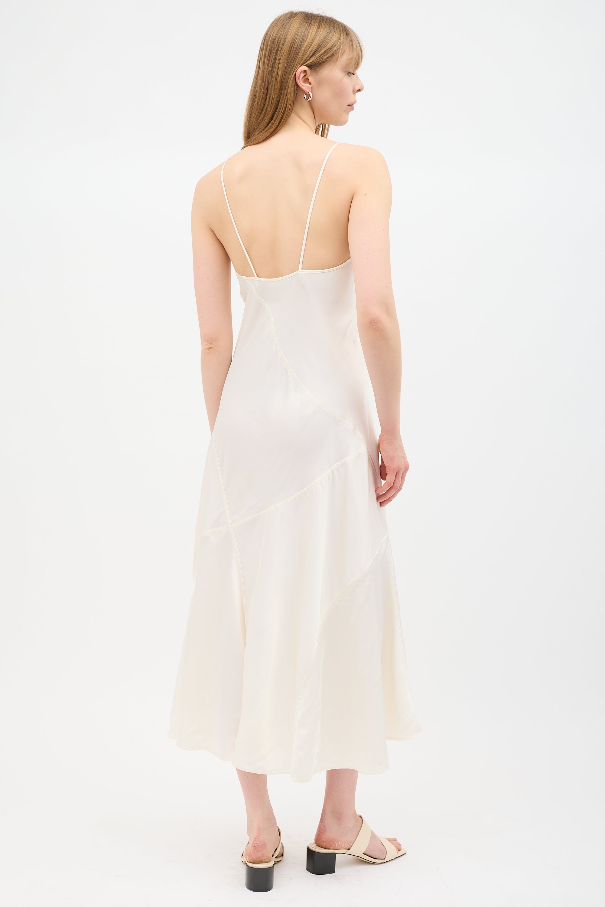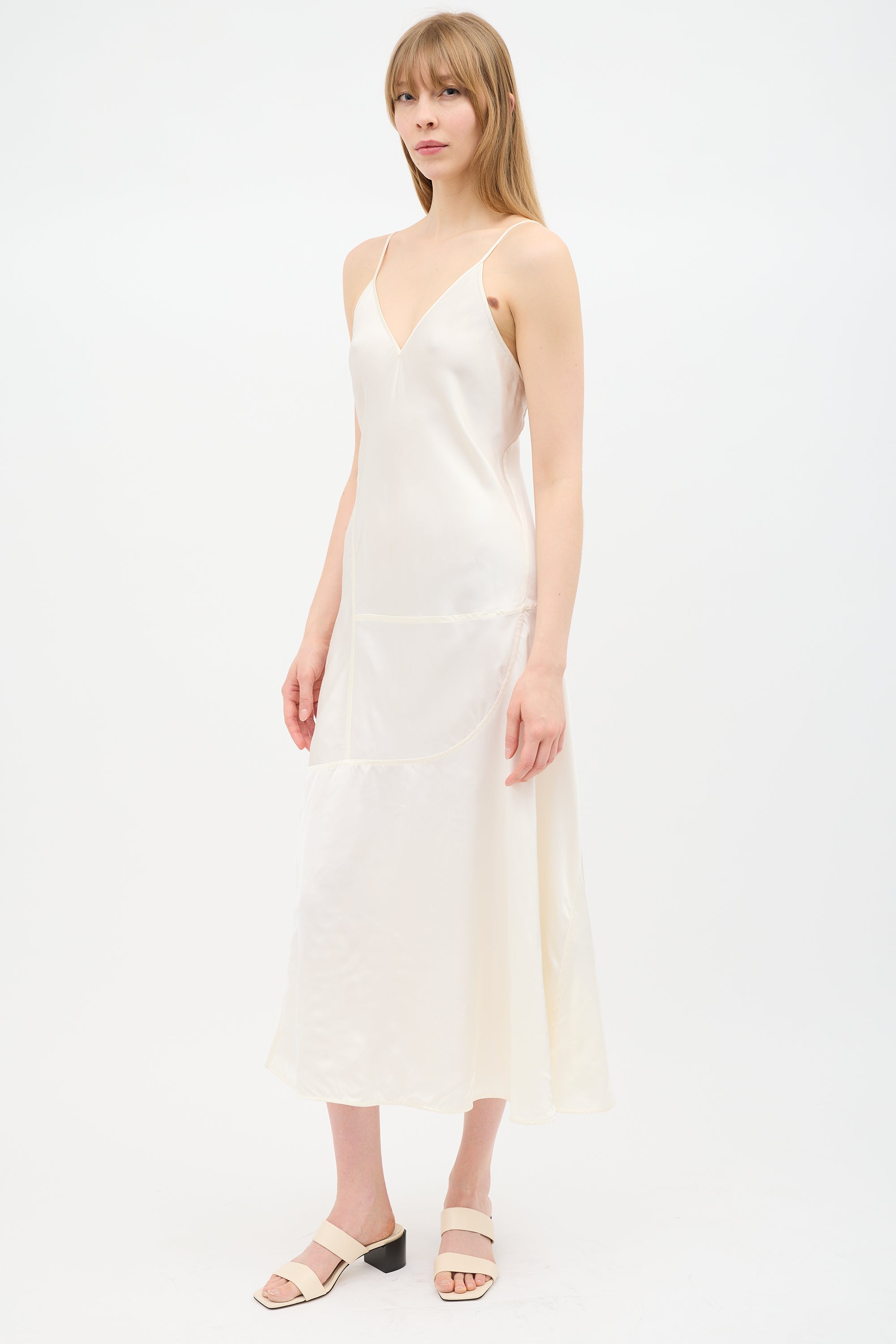 Pre-owned Jil Sander cream satin midi dress featuring fixed thin straps, V-neckline, and panelled design.