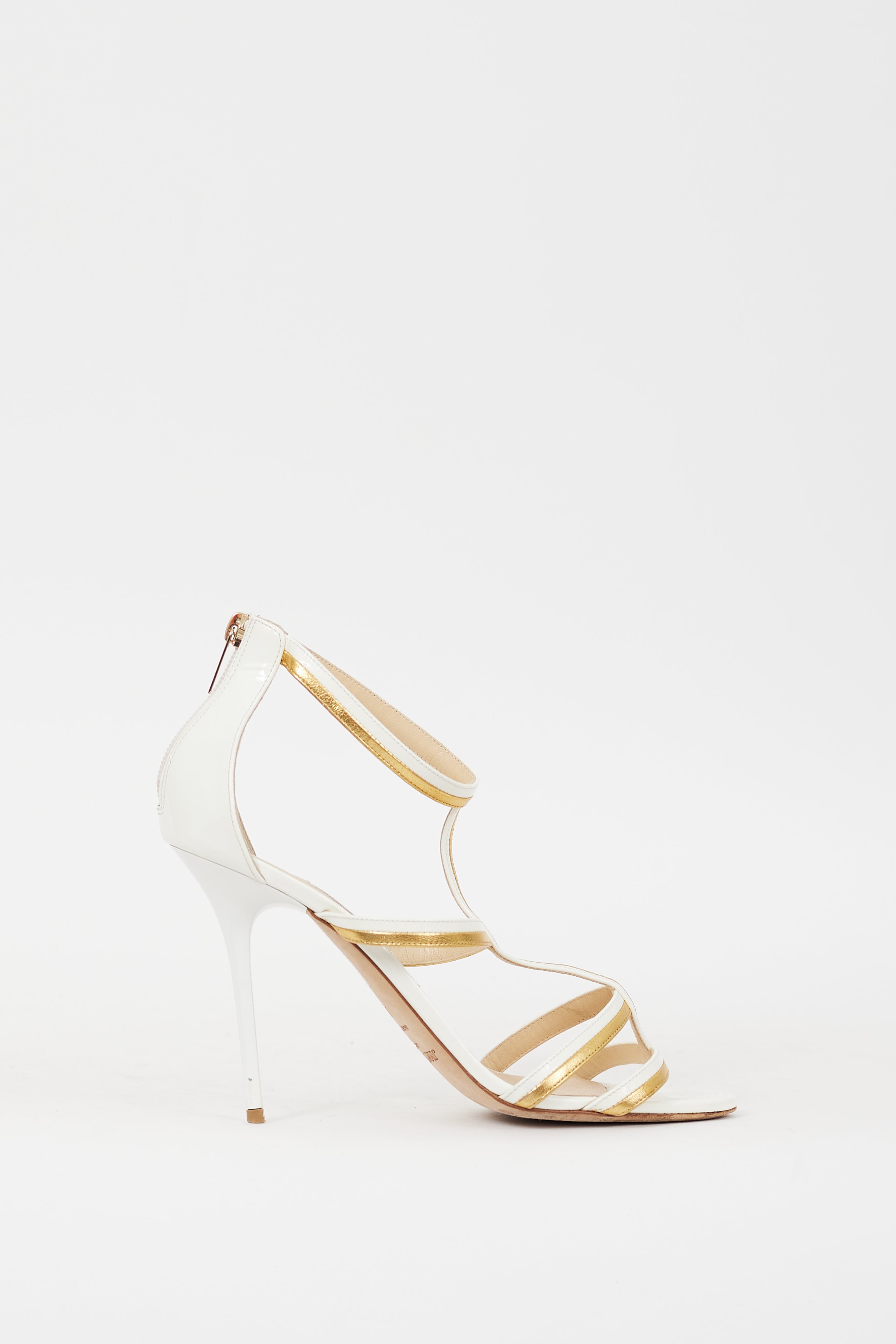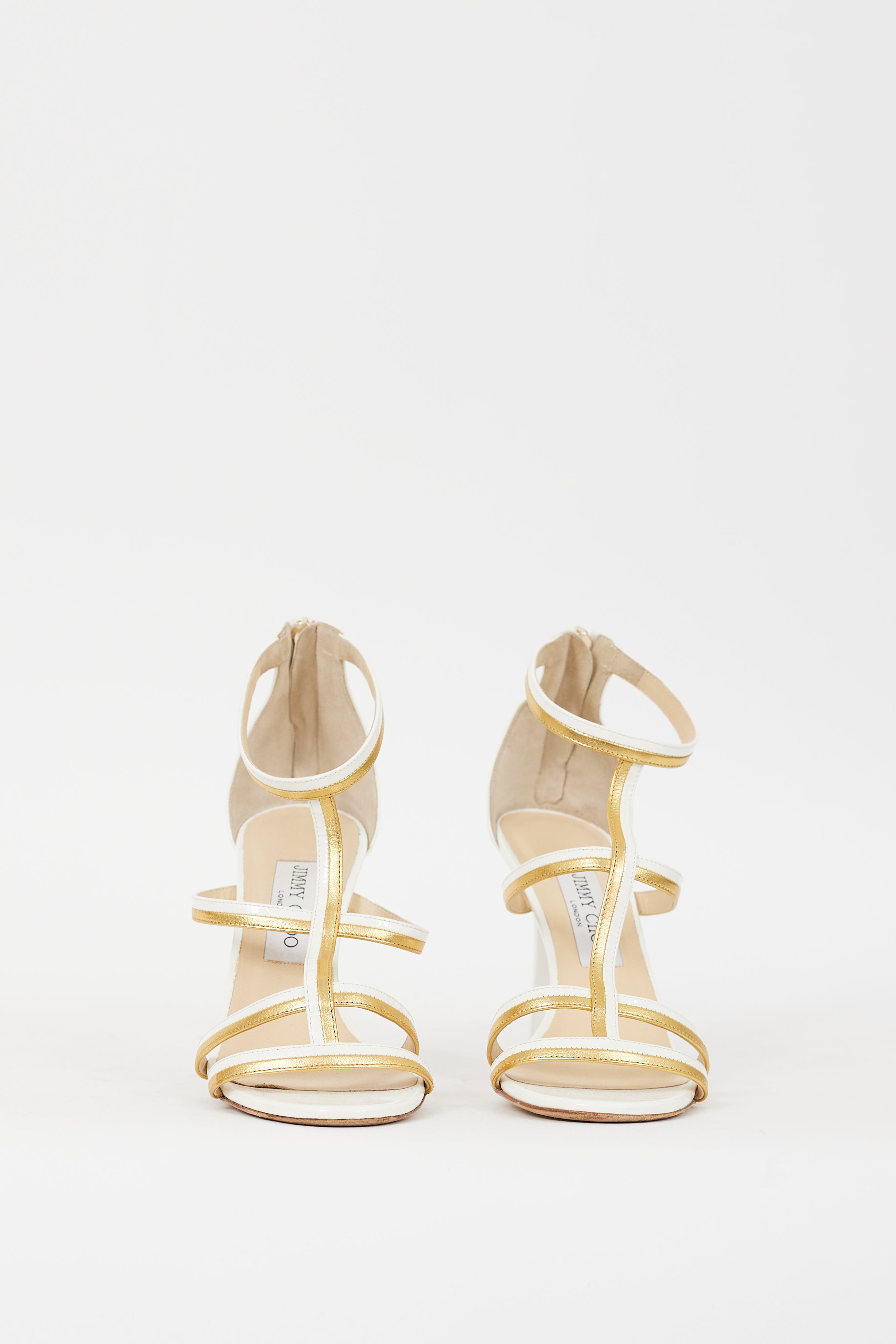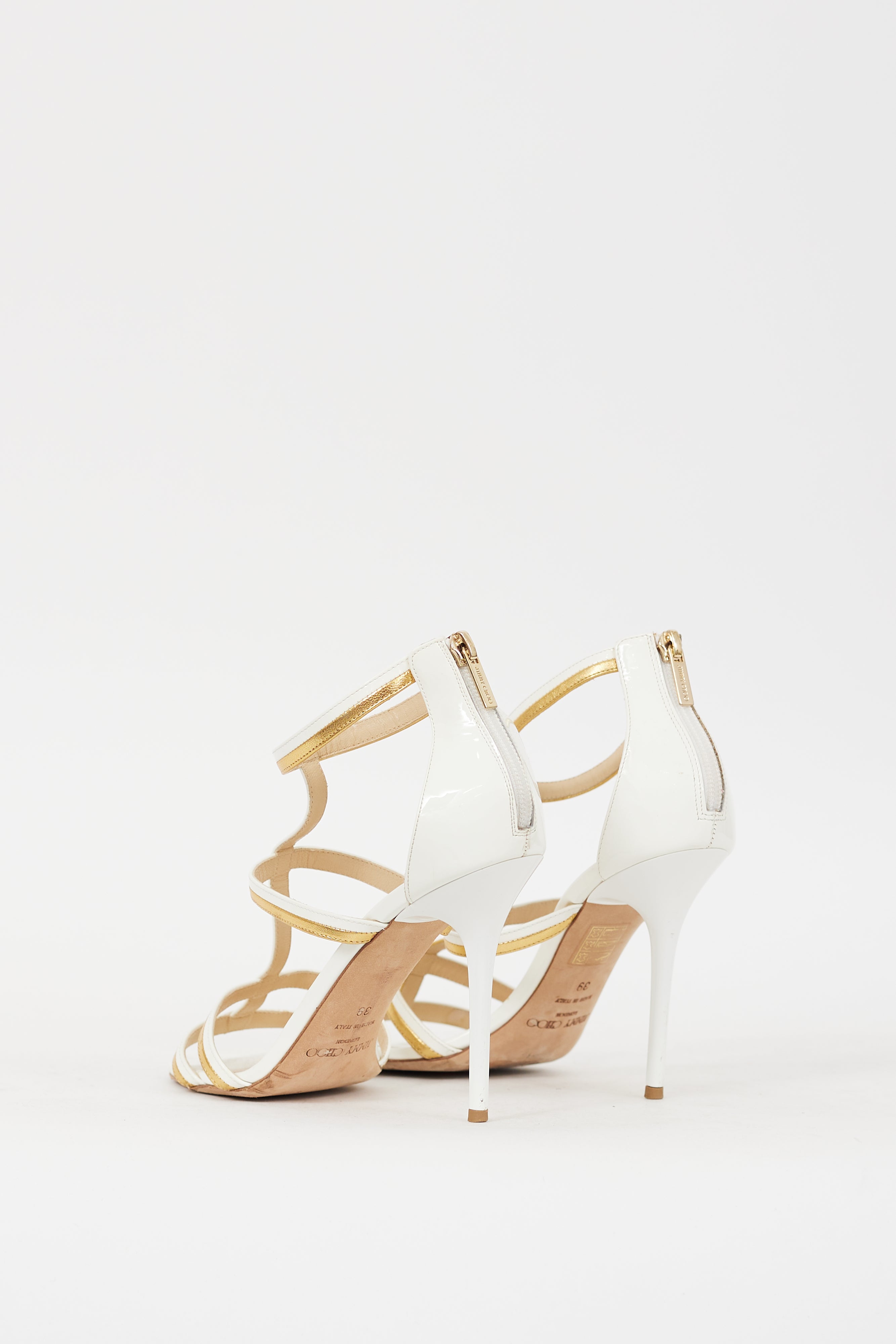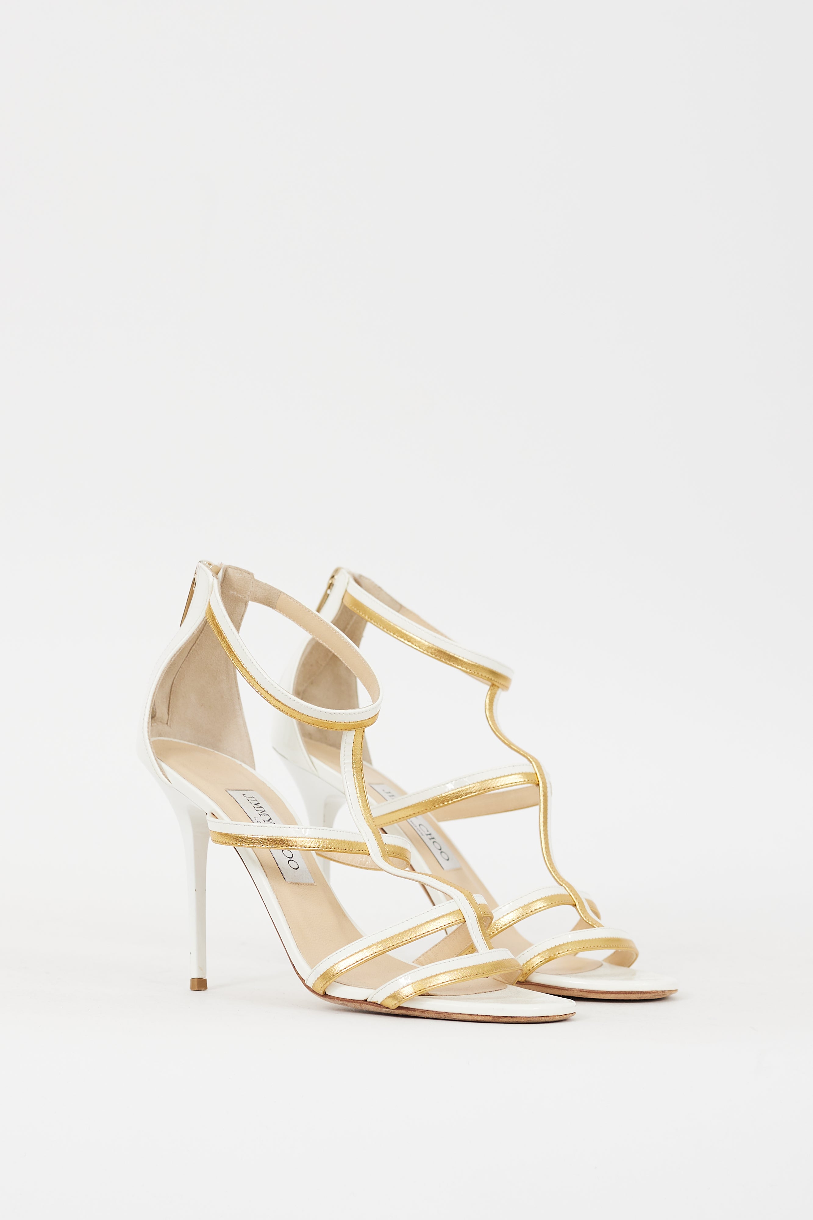 Pre-owned Jimmy Choo Thistle 100 heels featuring an open rounded toe, white patent leather and gold tone metallic leather upper, four strap cage across vamp, instep, and ankle, back zip closure, and covered stiletto heel. Comes with original dust bag.