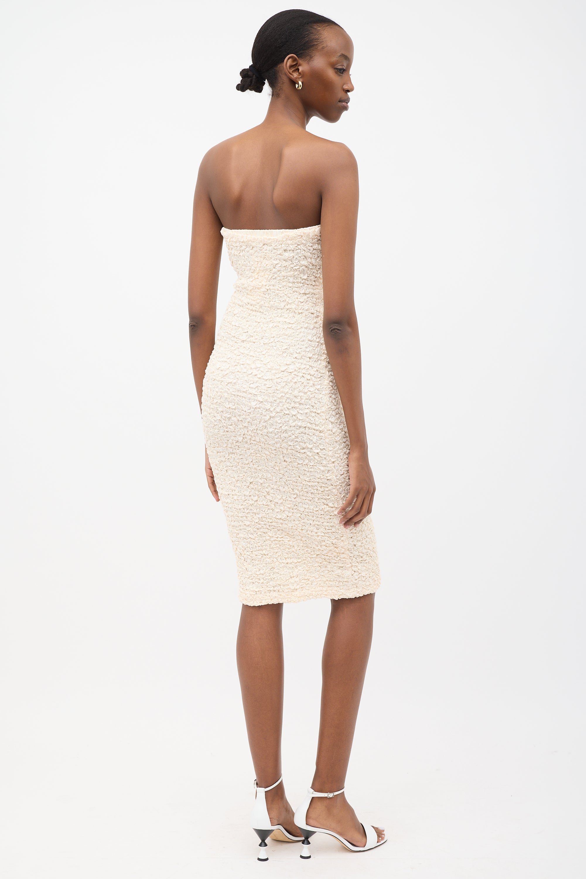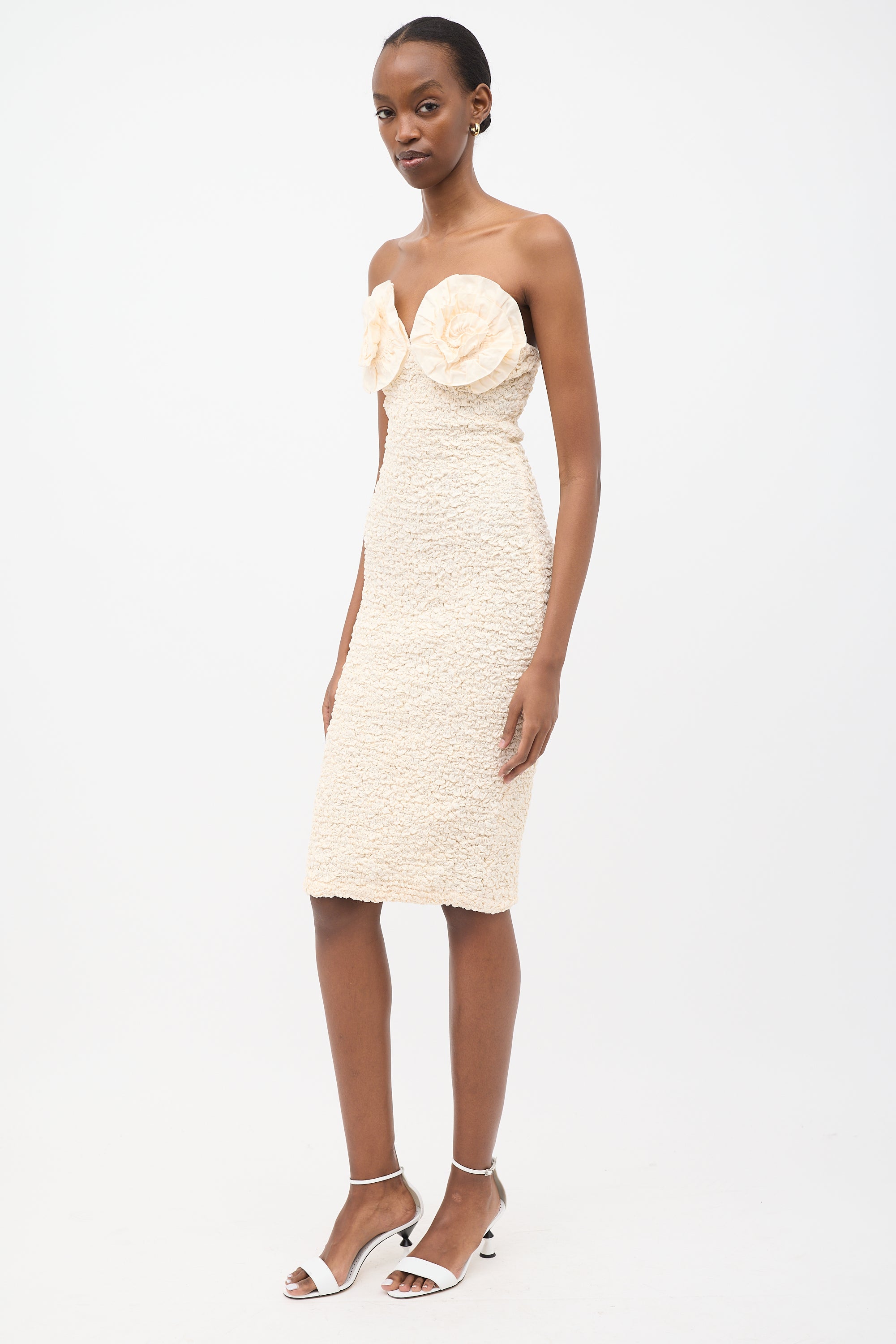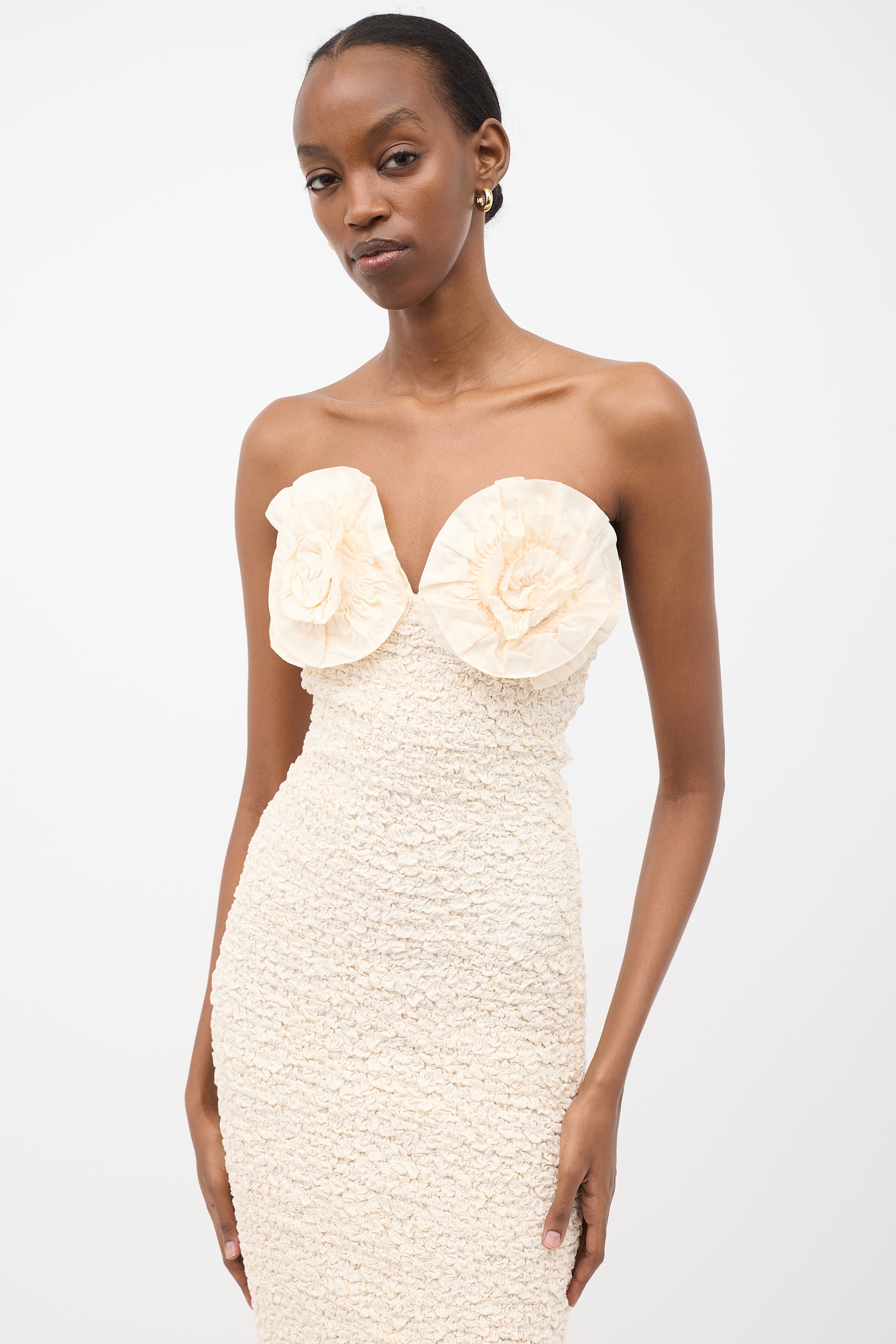 Pre-owned Mara Hoffman cream Mona mini dress featuring strapless design, sweetheart neckline with ruffle design, and smocking throughout.