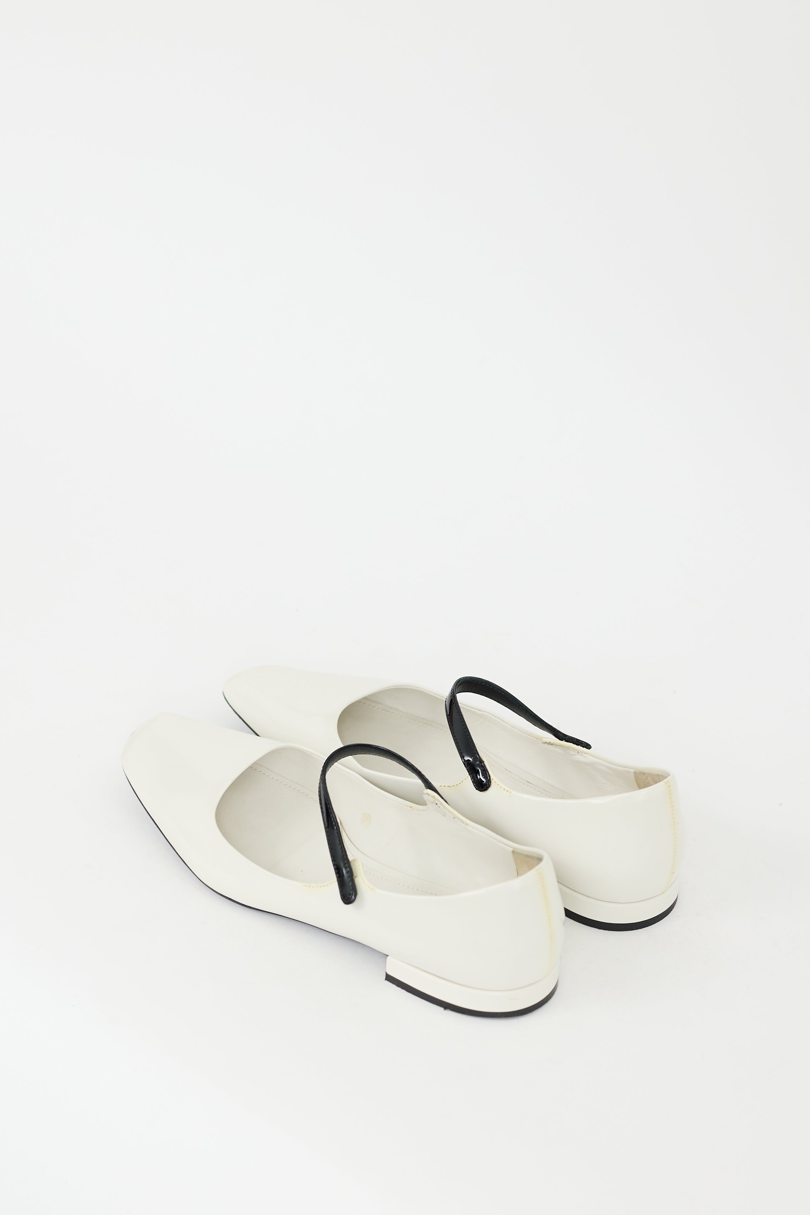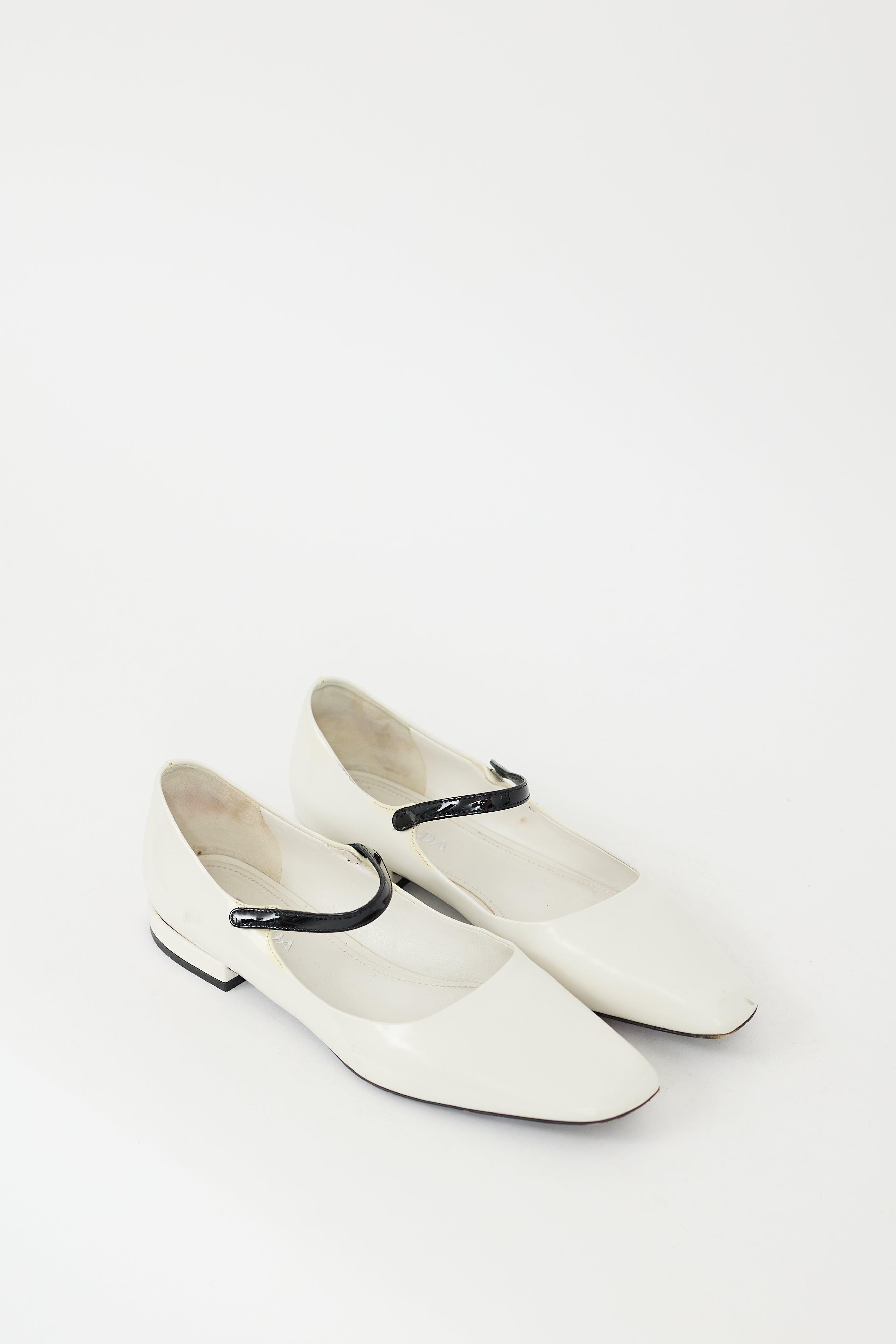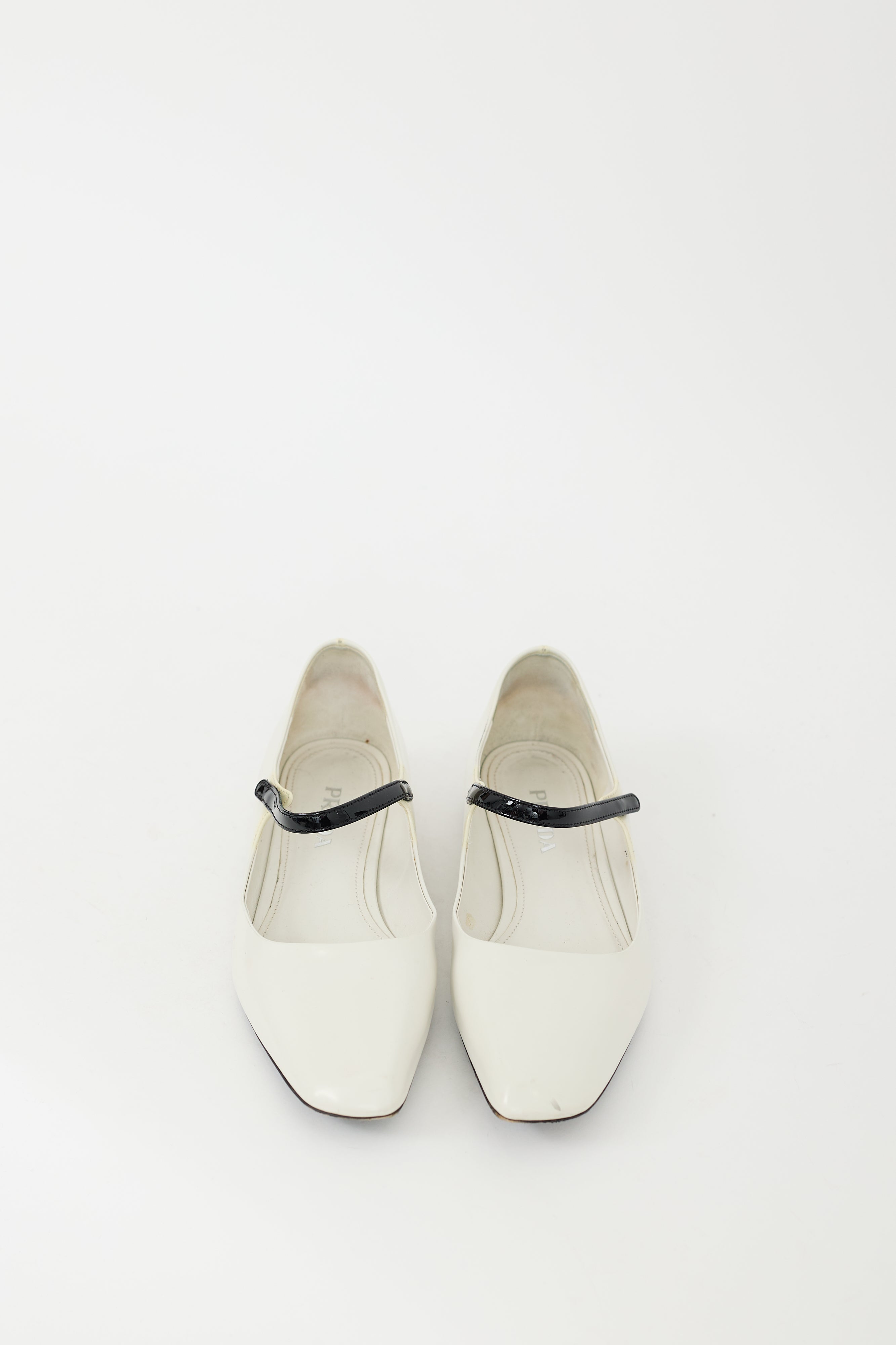 Pre-owned Prada Fall Winter 1998 white leather Mary Jane flats featuring a tapered square toe, rounded topline, thin elasticized black patent leather strap across instep, and short covered heel.