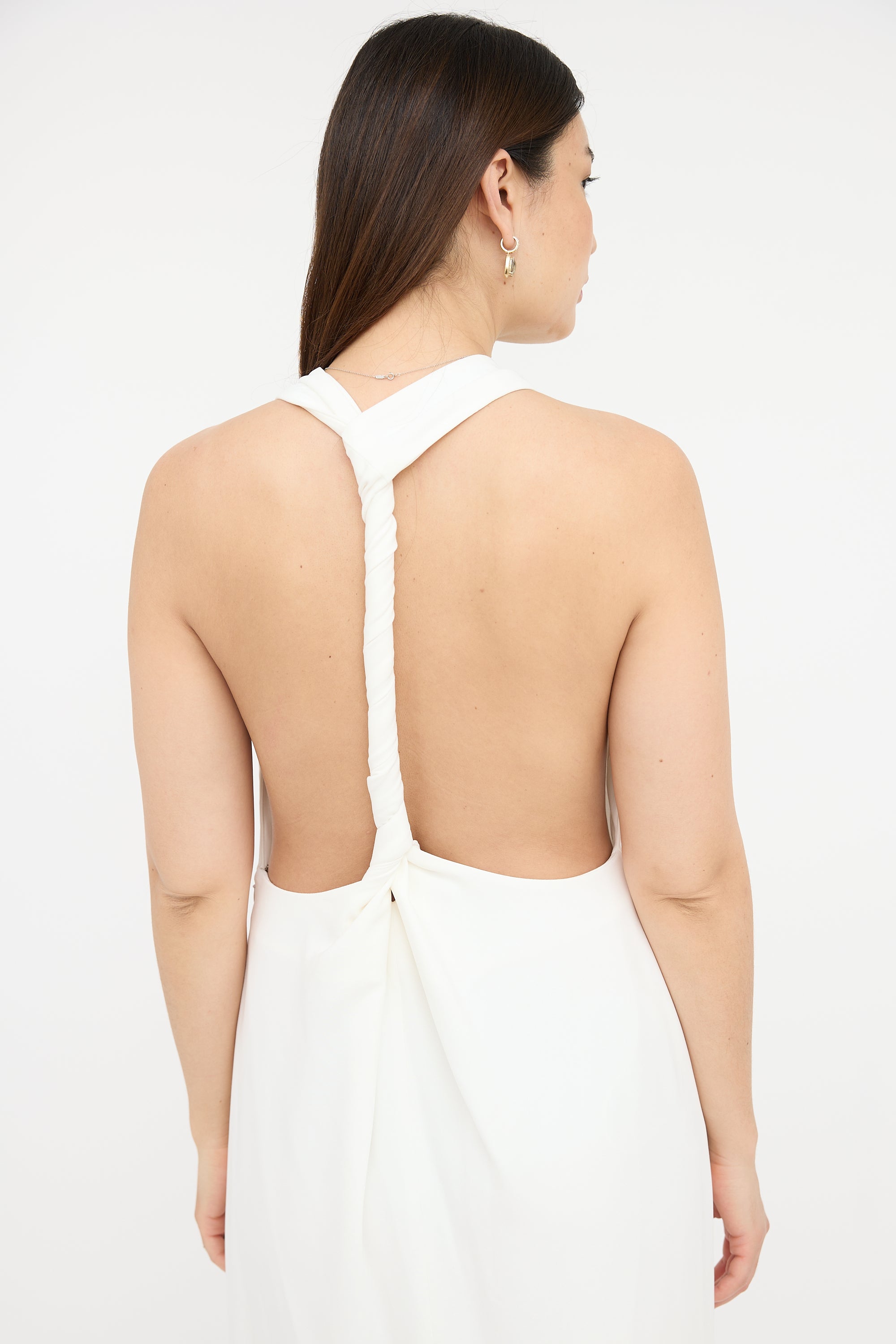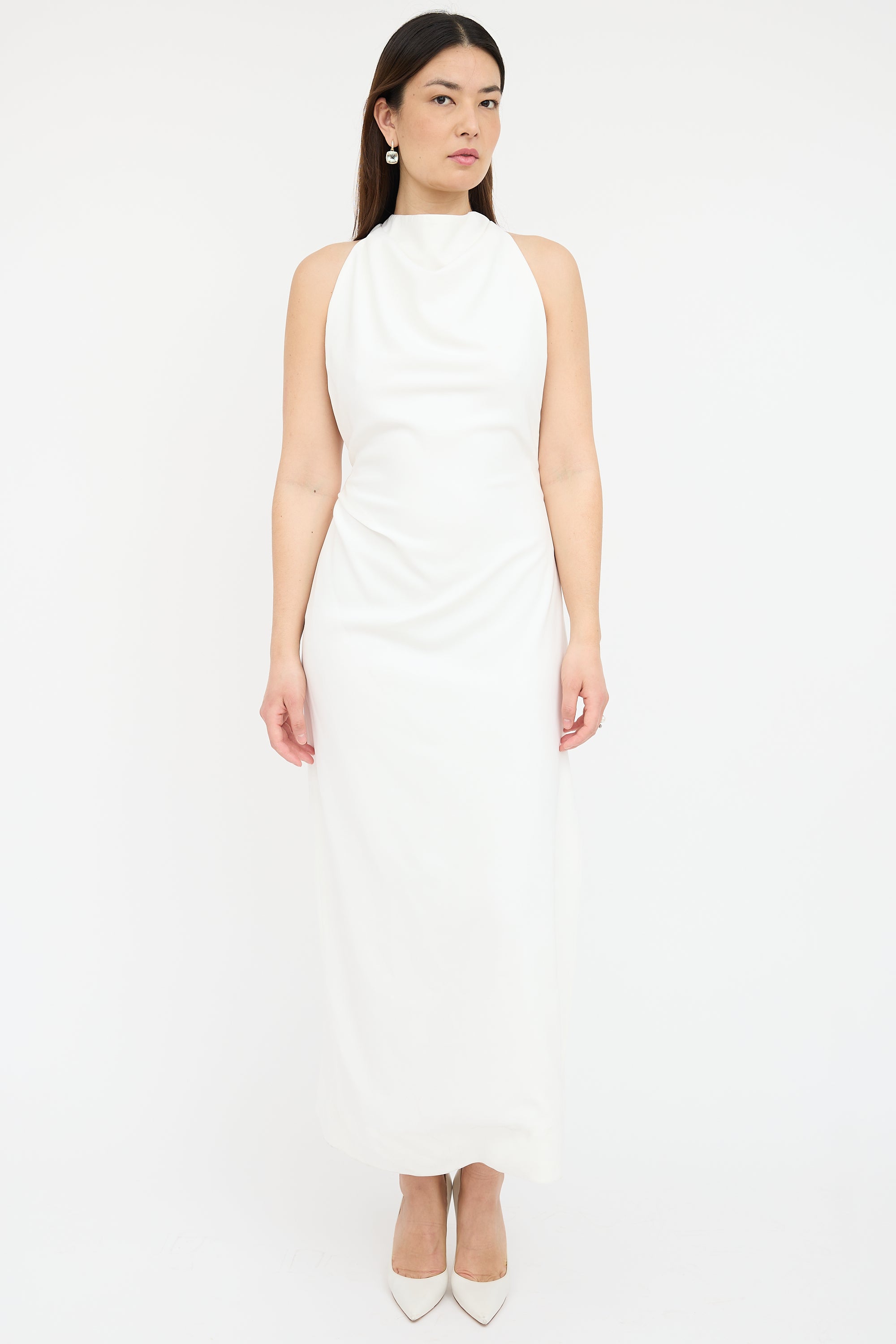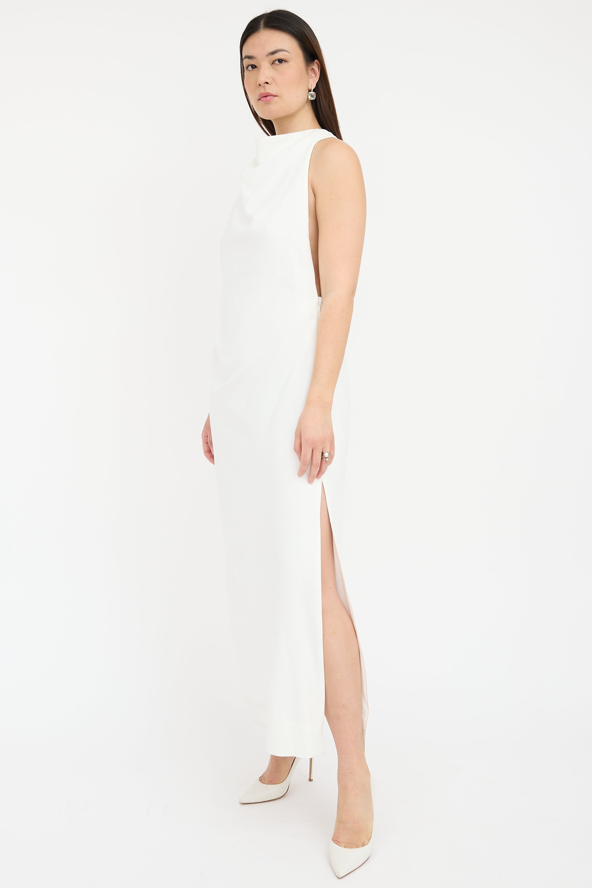 Pre-owned Proenza Schouler white crepe Faye maxi dress featuring cowl neck, backless twist design, pleating at right waist, front leg slit, and concealed zip side. Lined. Clipped to fit model.