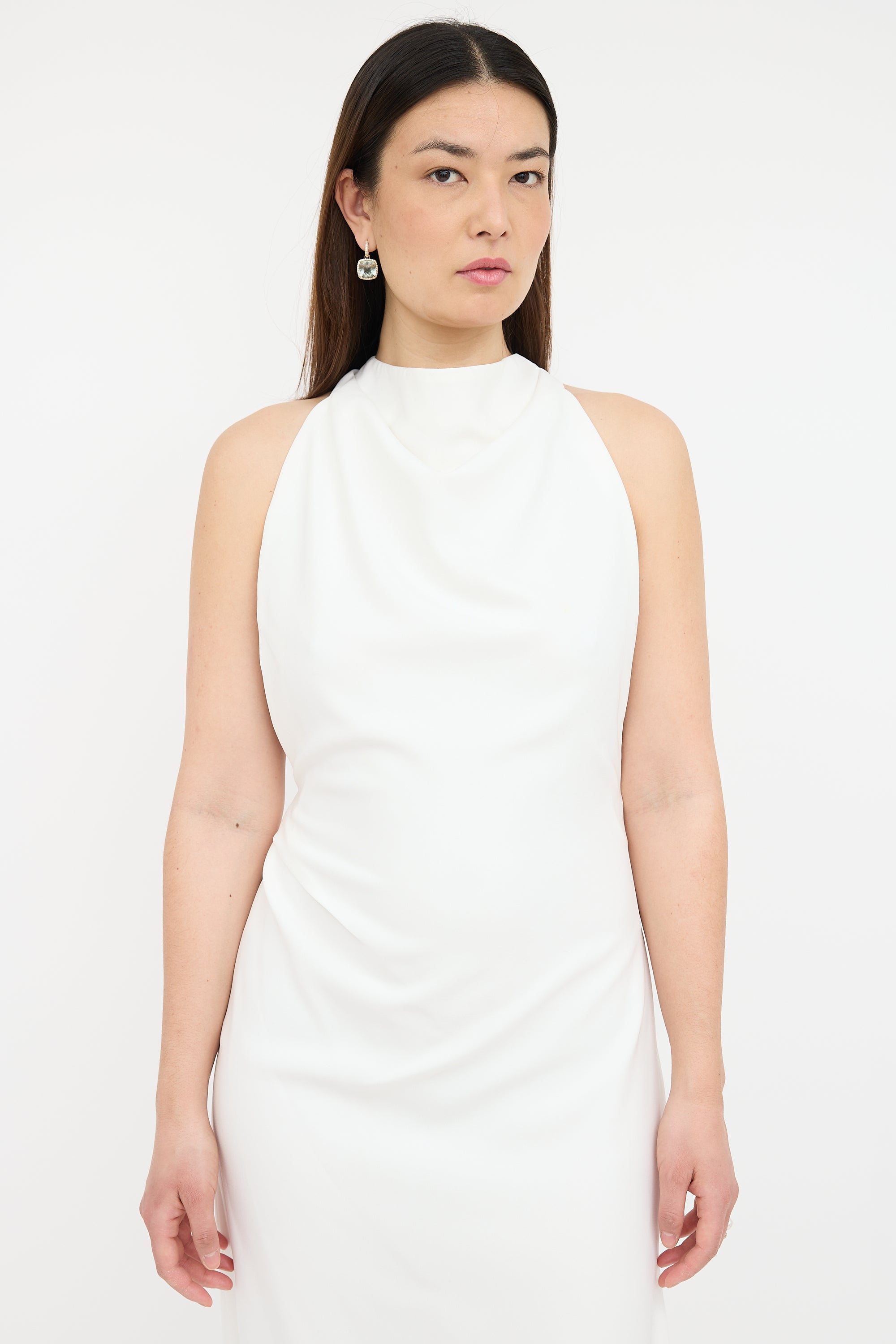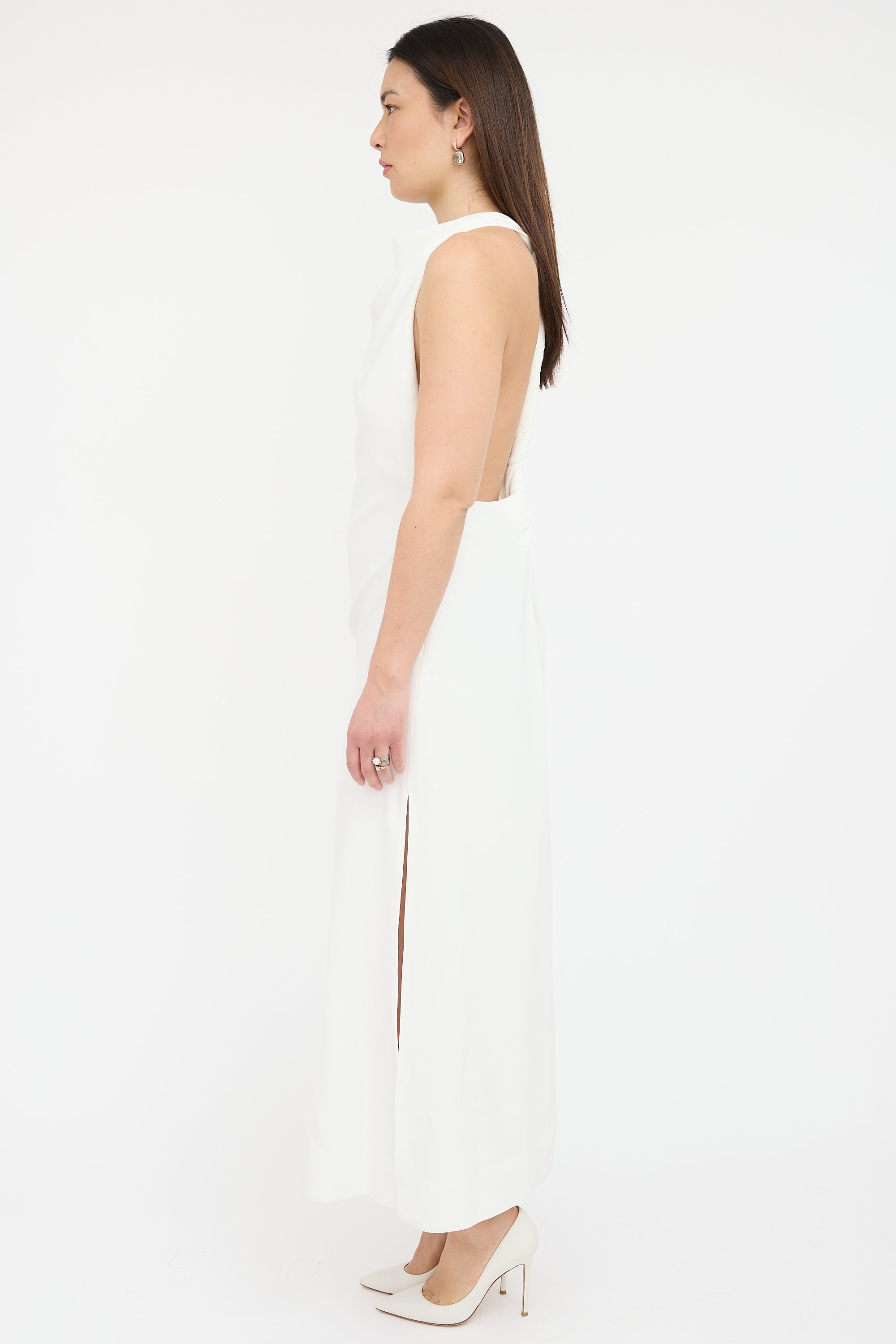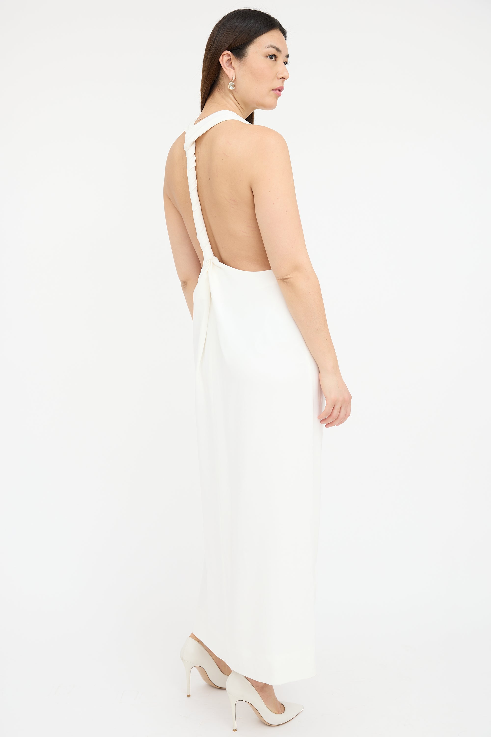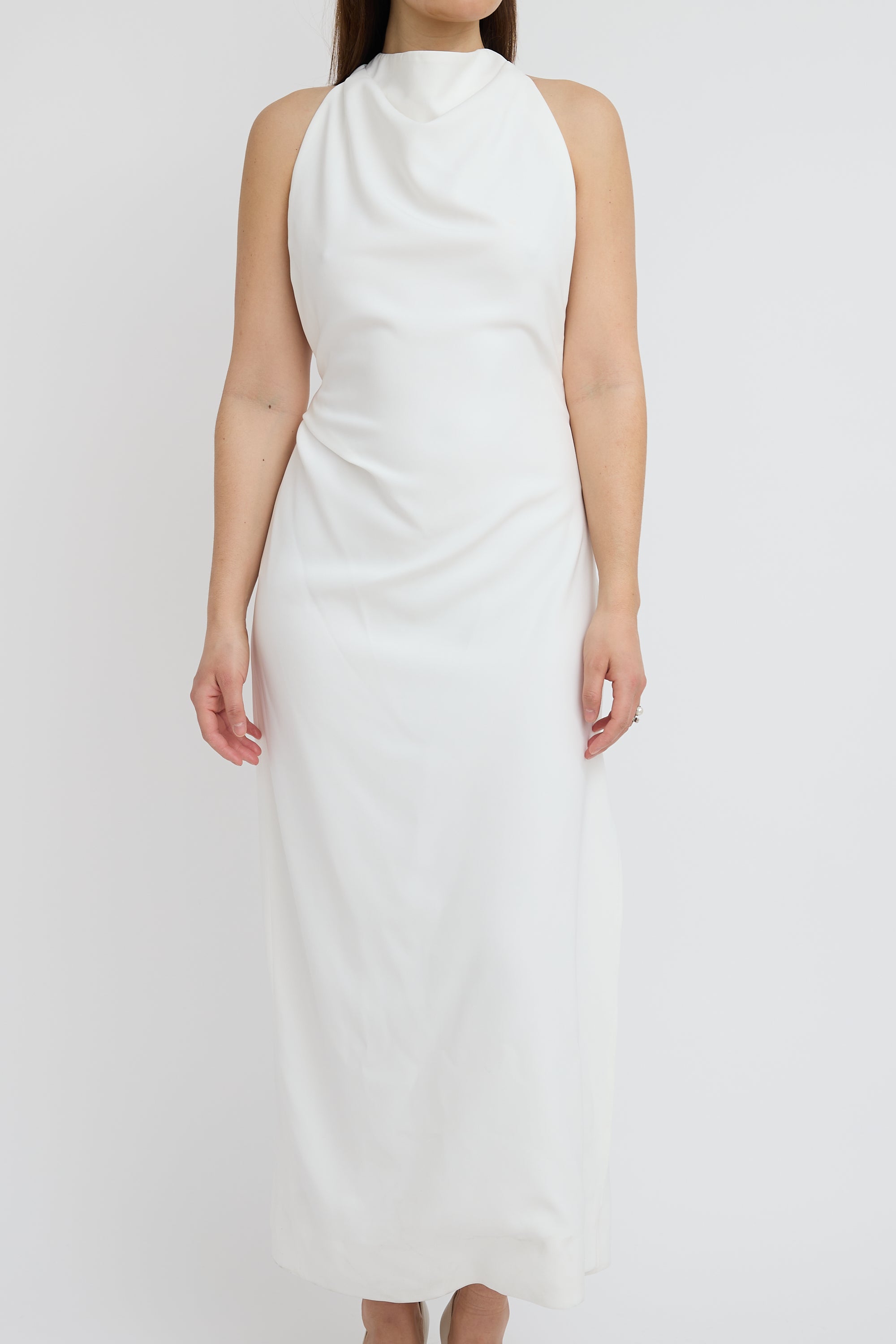 Pre-owned Proenza Schouler white crepe Faye maxi dress featuring cowl neck, backless twist design, pleating at right waist, front leg slit, and concealed zip side. Lined. Clipped to fit model.