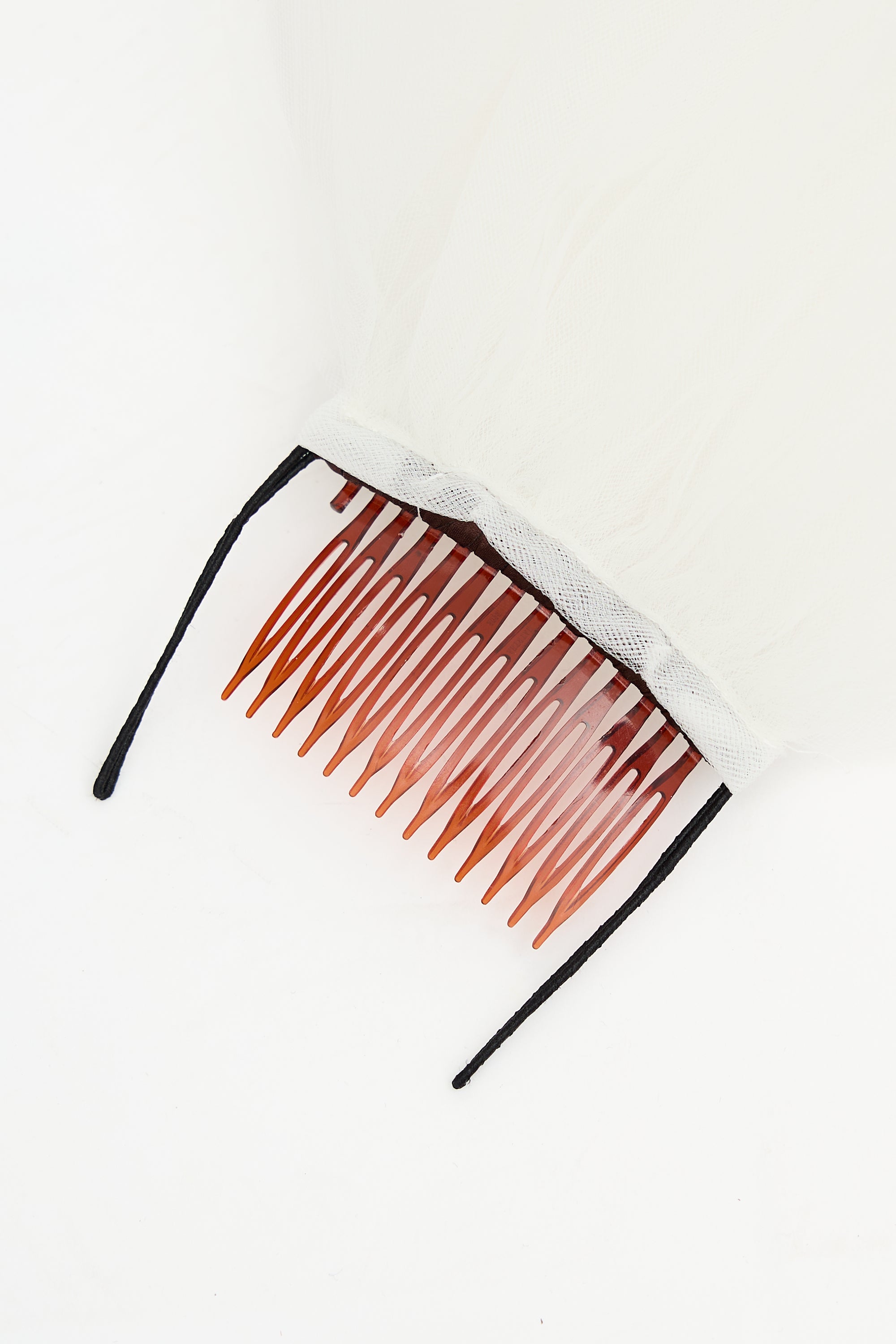Good Minor pulls on skirt and at hem, and discolouration at inner and outer bodice. Small red stain on veil near comb.