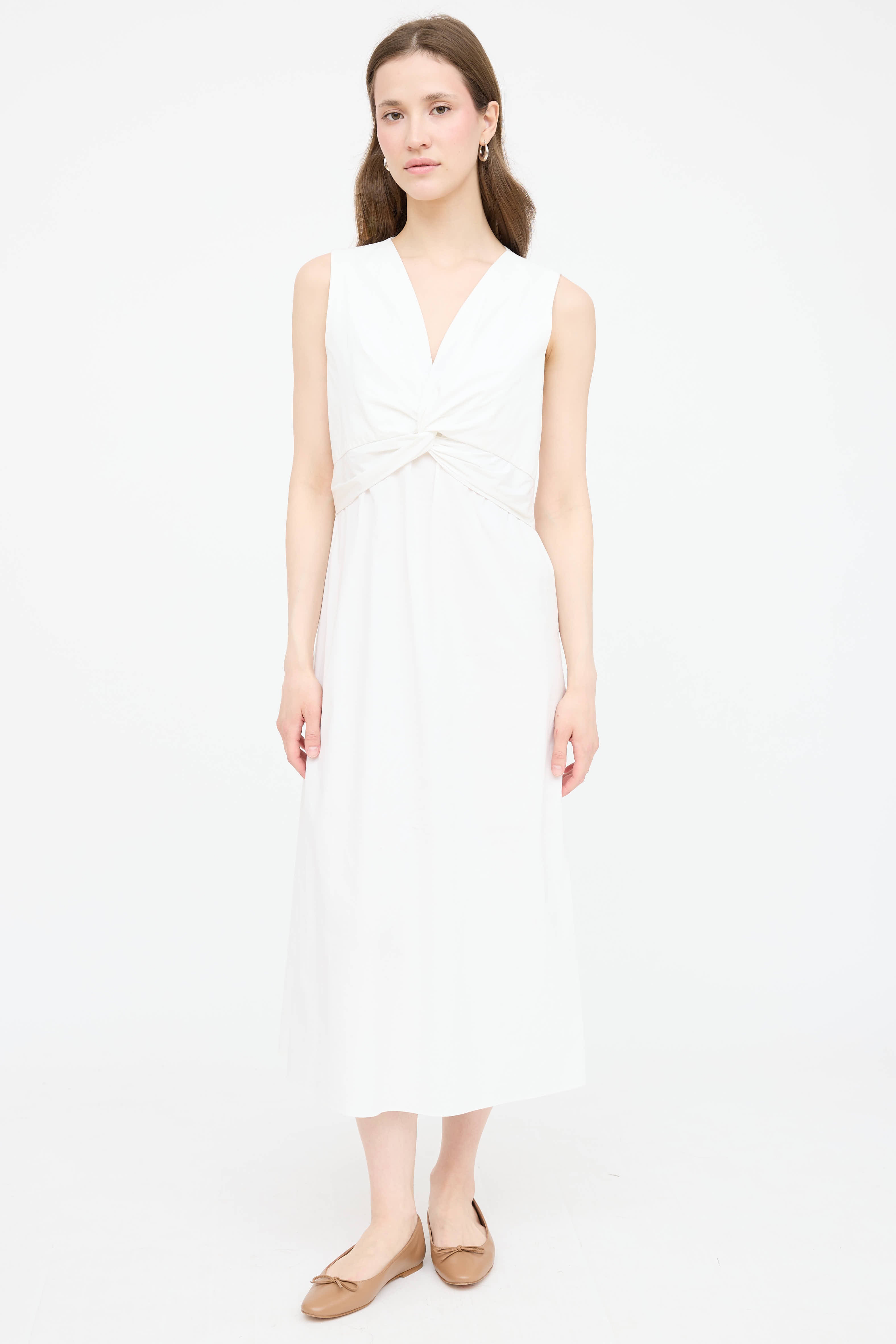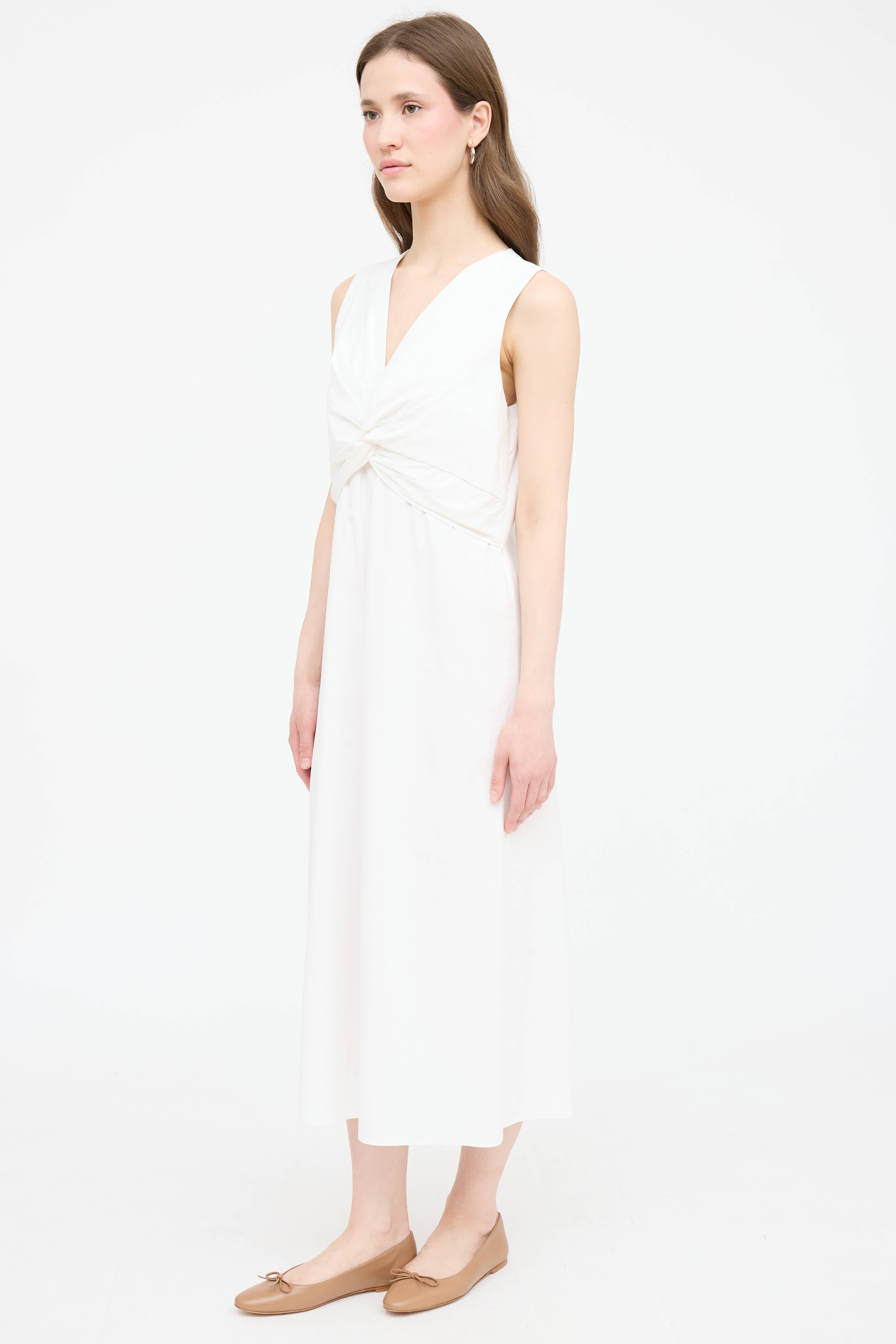 Pre-owned The Row white poplin dress featuring a V-neckline, knotted bust, sleeveless styling, and darted back.