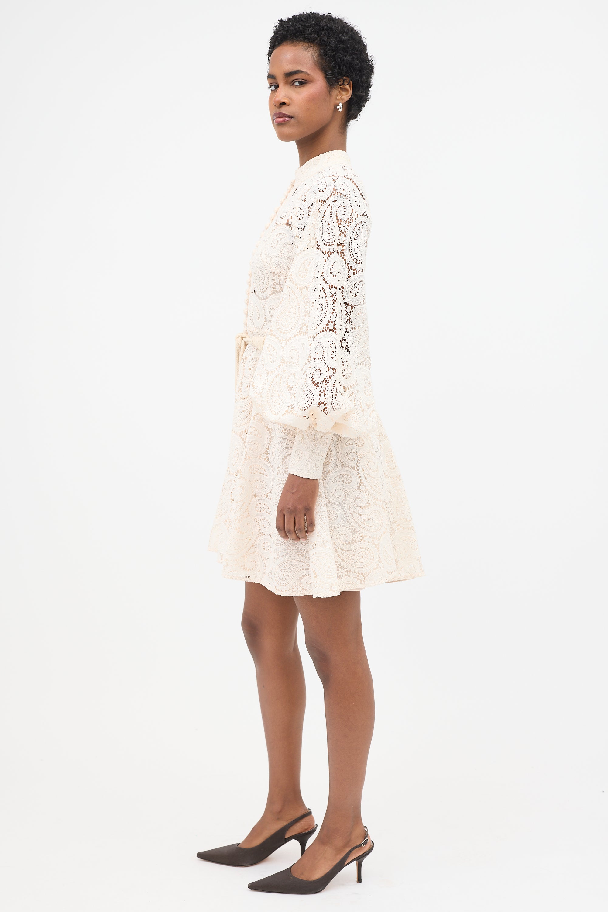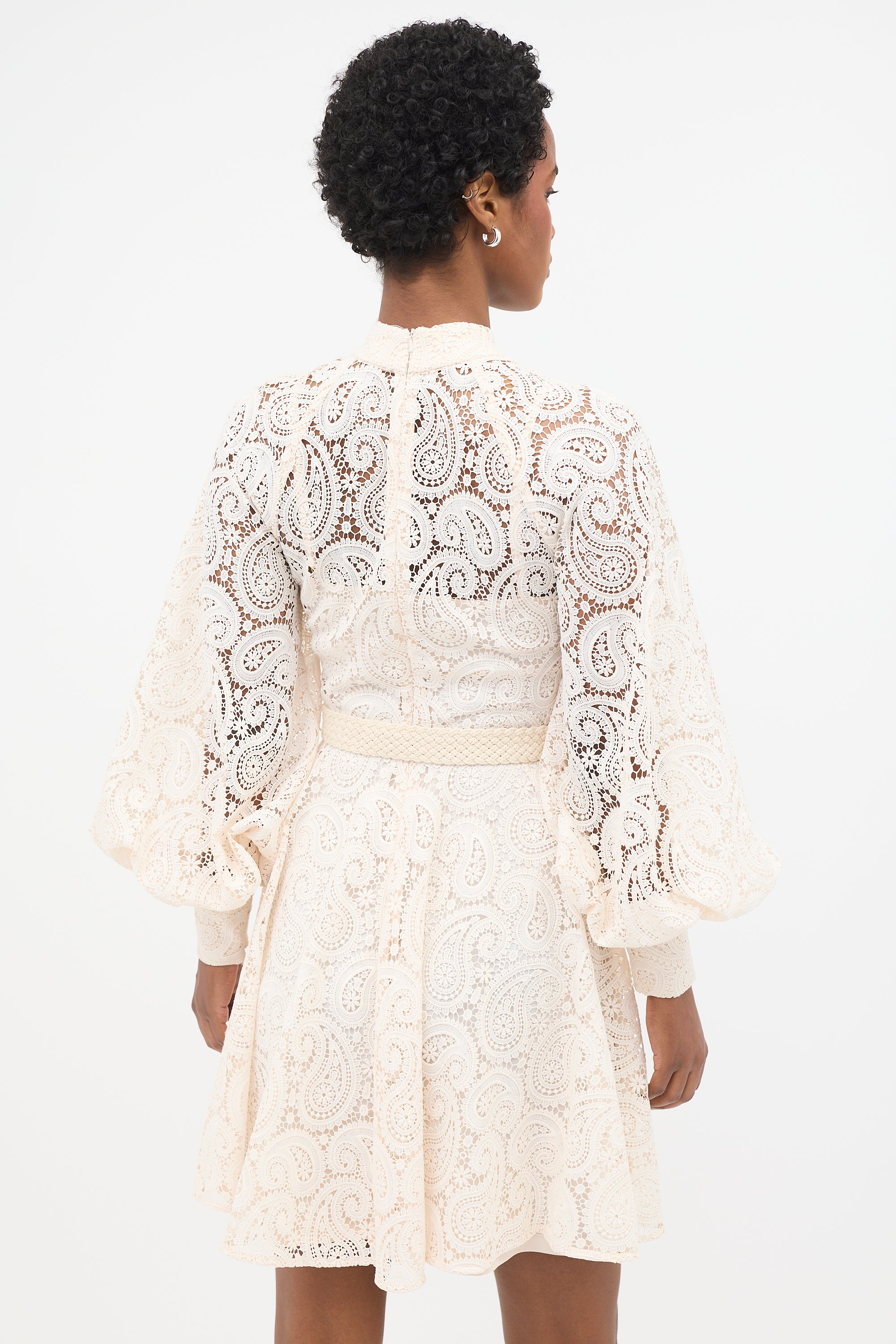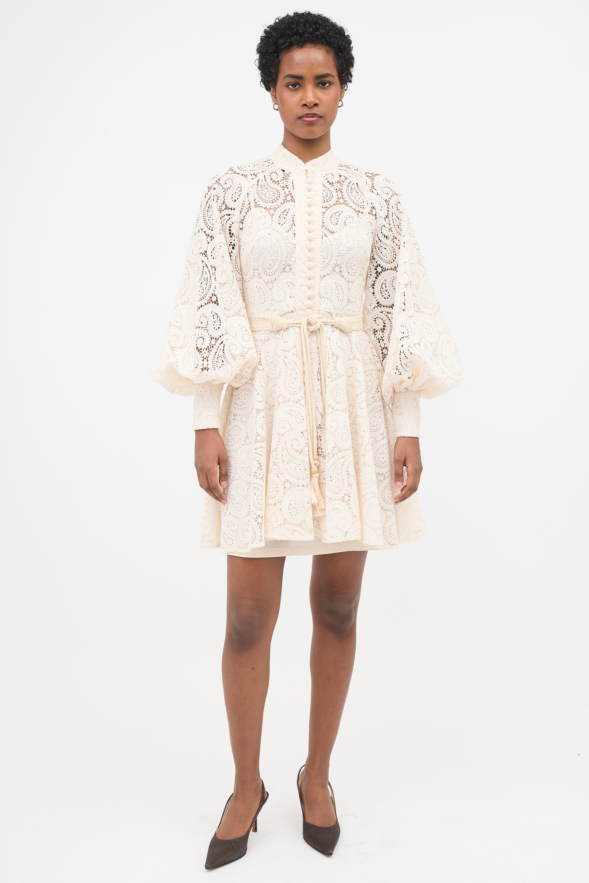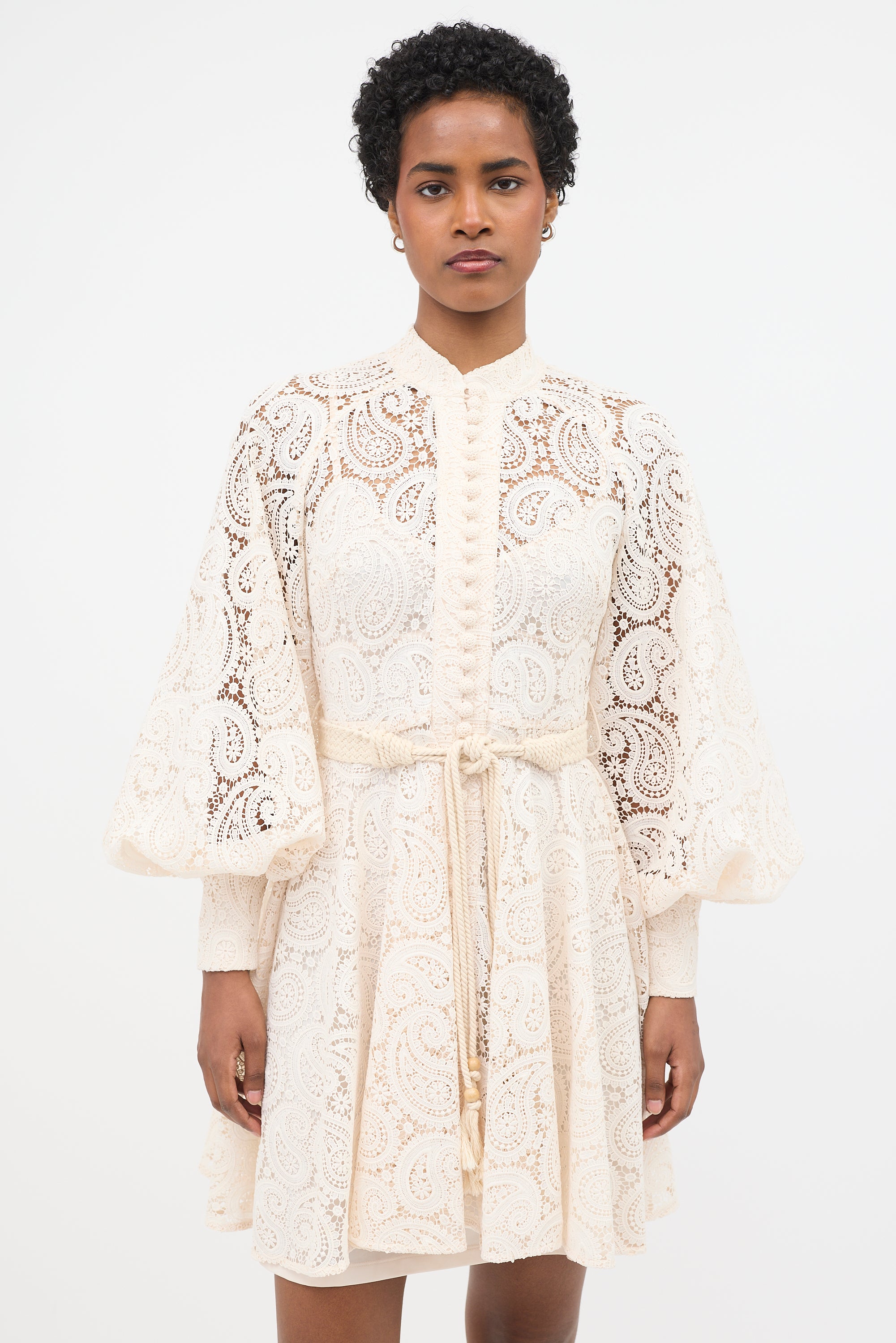 Pre-owned Zimmermann cream Amari mini dress featuring paisley lace, stand collar, decorative button front, crochet waist belt, bishop sleeves, zipped cuffs, concealed back zip, and detached slip.