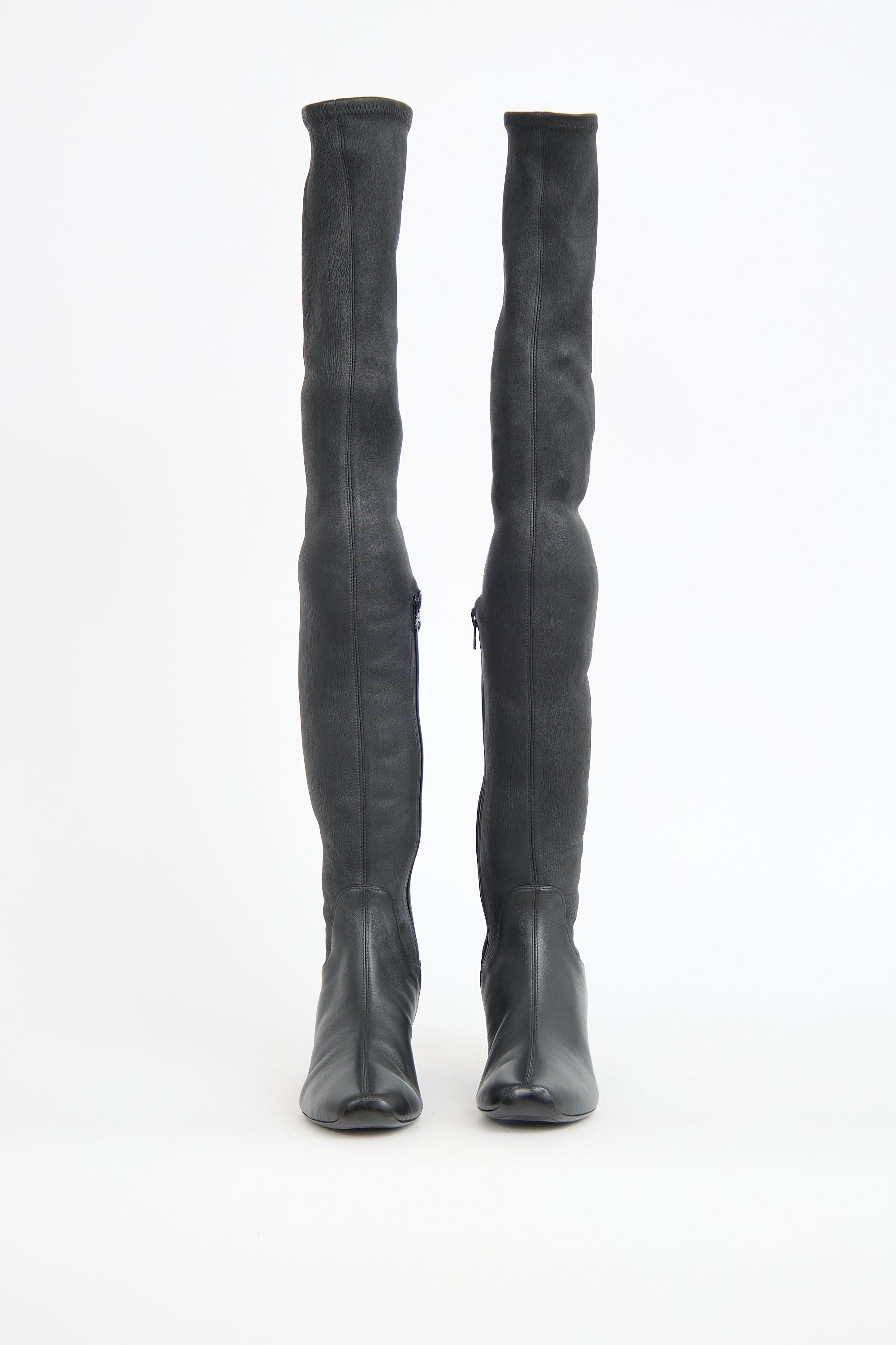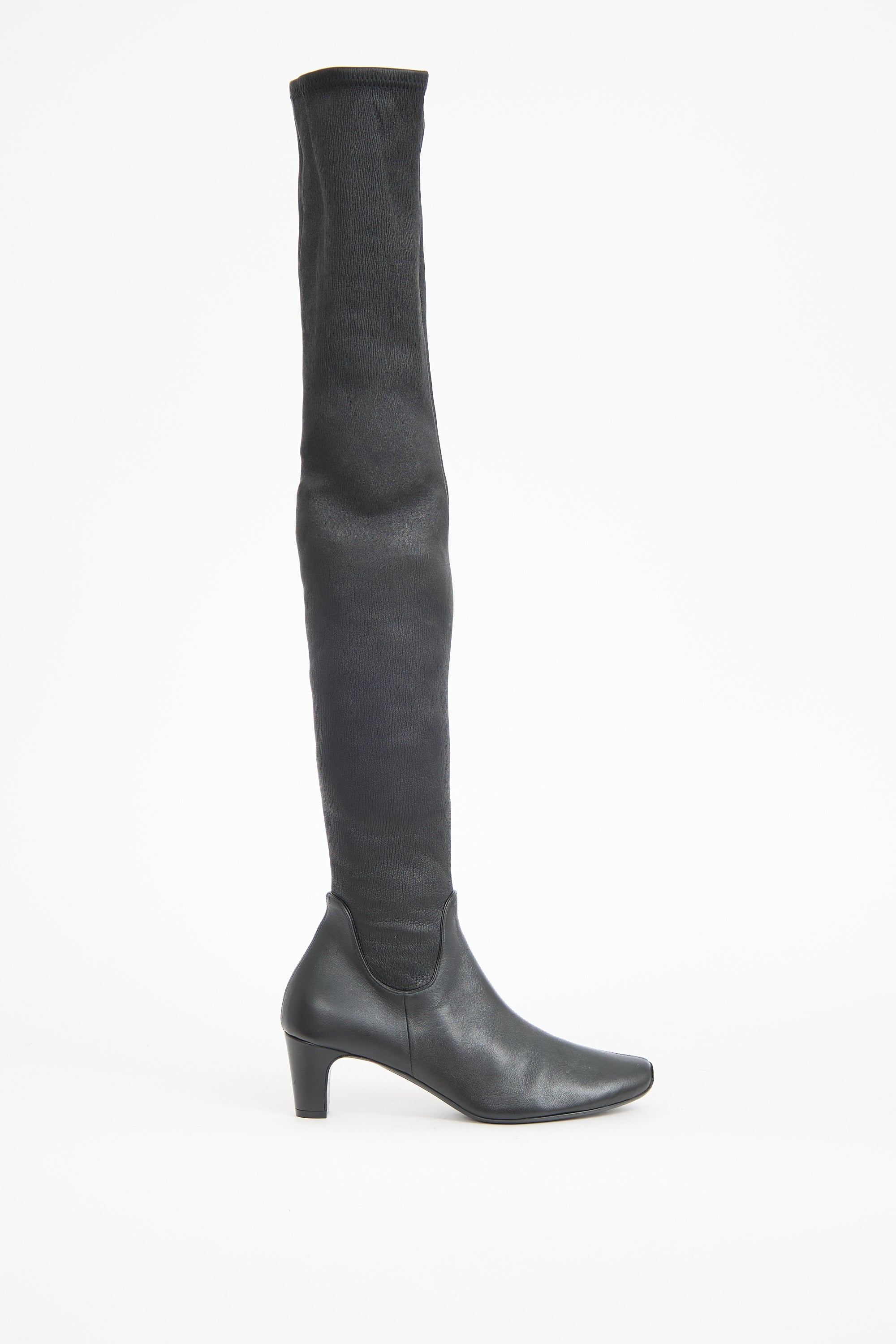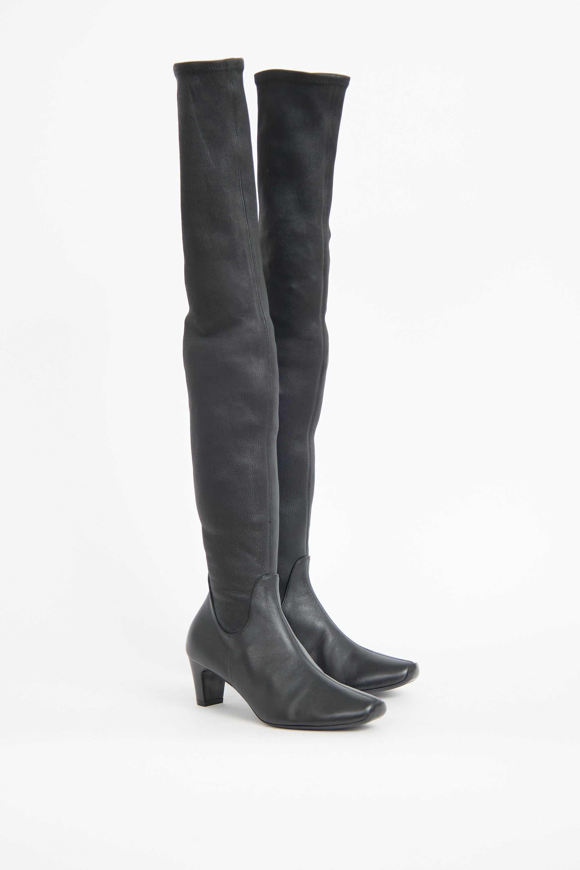 Pre-owned Khaite black leather over the knee stretch boots featuring a squared toe, inner zip closure, pull on entry, and a covered block heel.