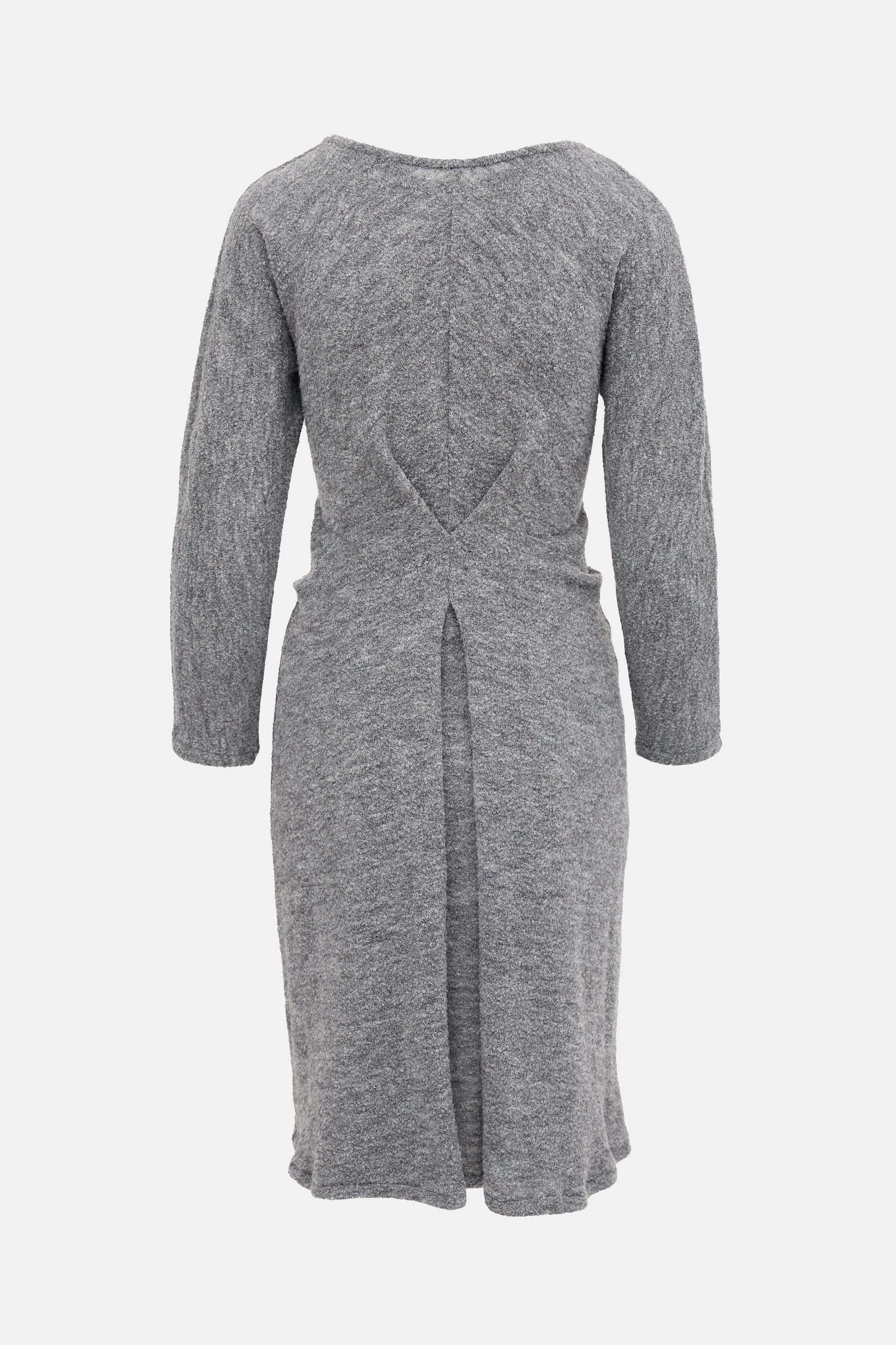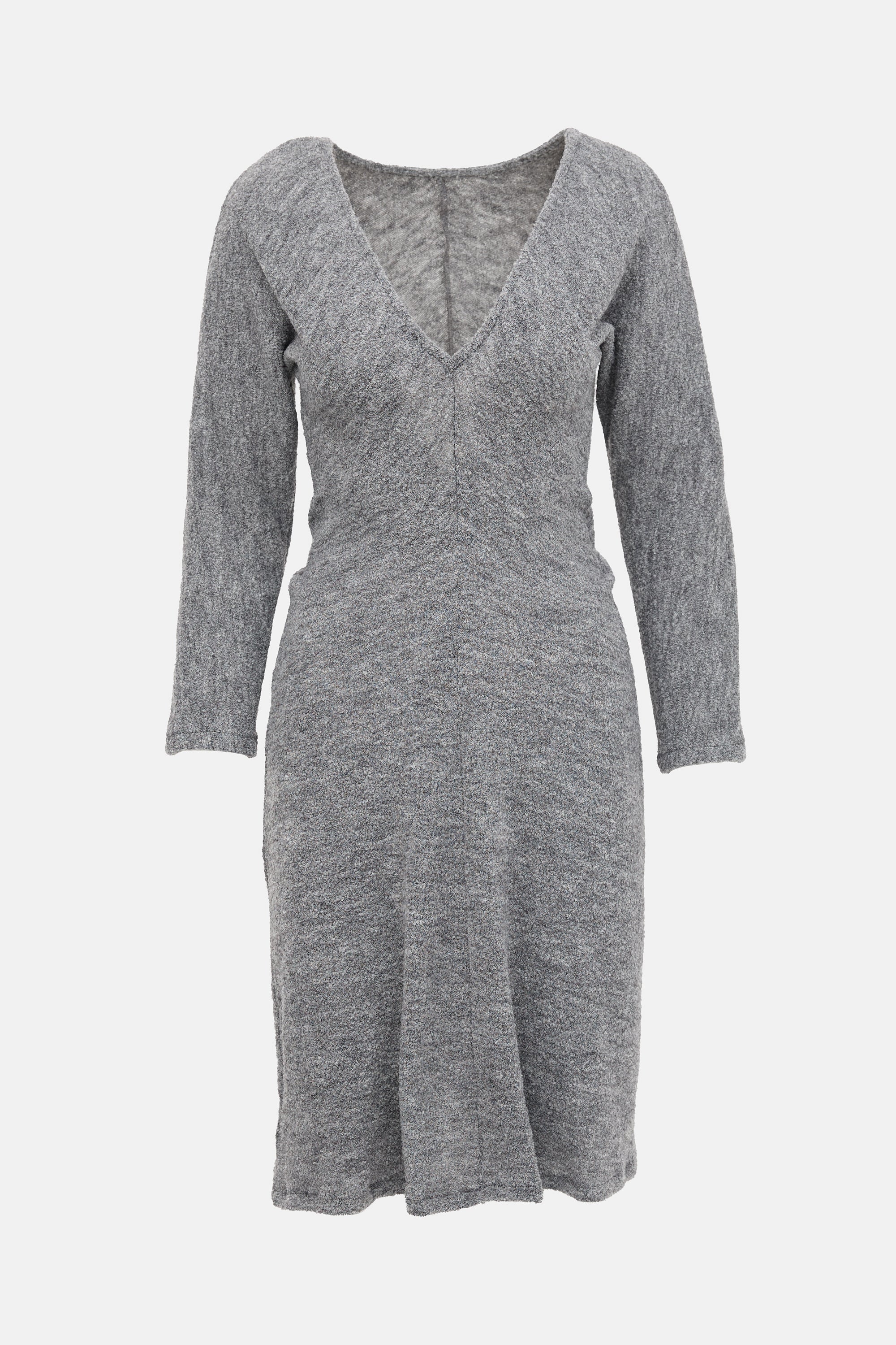 Pre-owned Proenza Schouler grey bouclé knit midi dress featuring a V-neckline, pleated back, long sleeve styling, and ruched sides.
