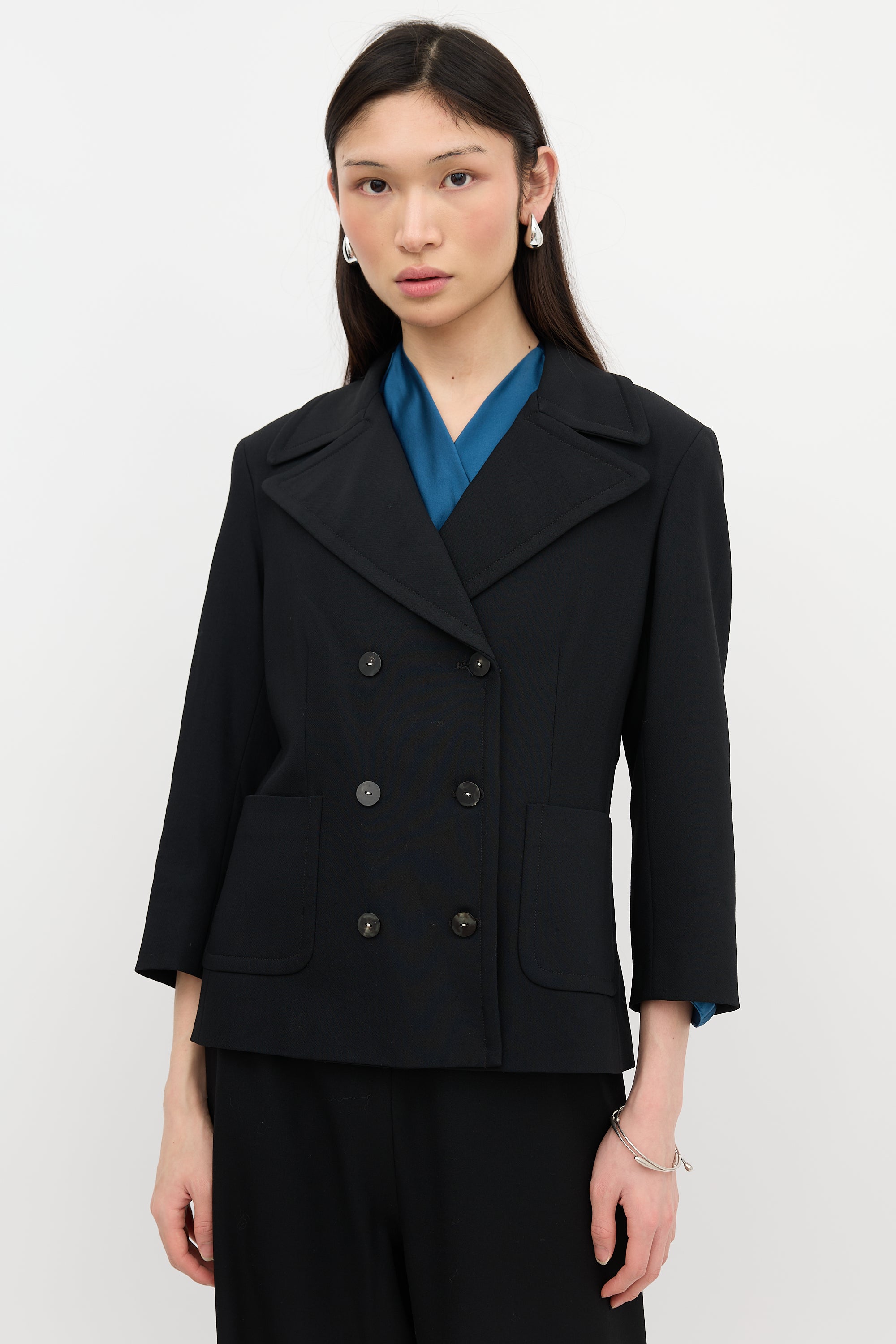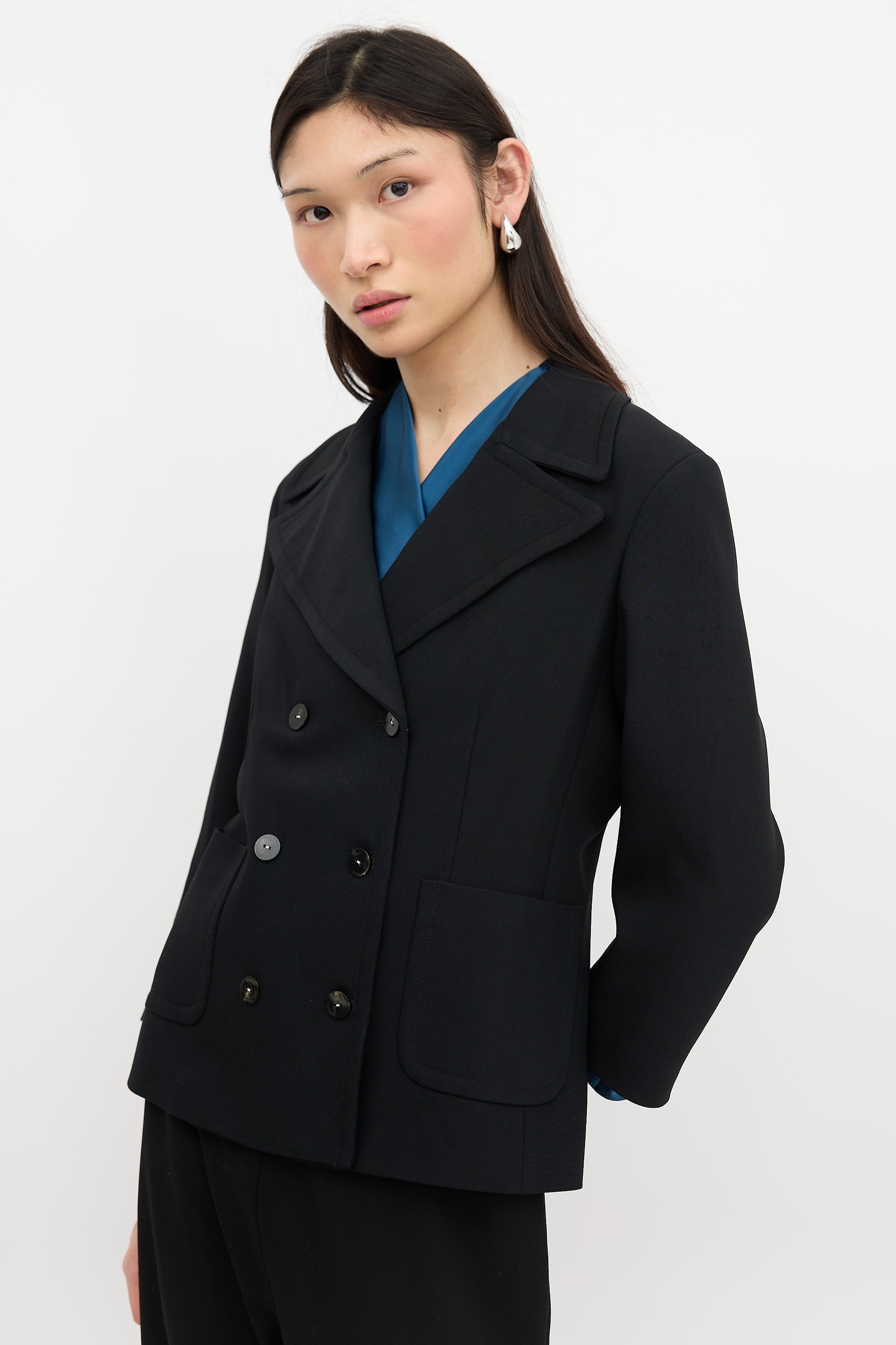 Pre-owned The Row black wool blazer featuring wide collar and lapel, double breasted button up front, two front patch pockets, and back vent. Lined.