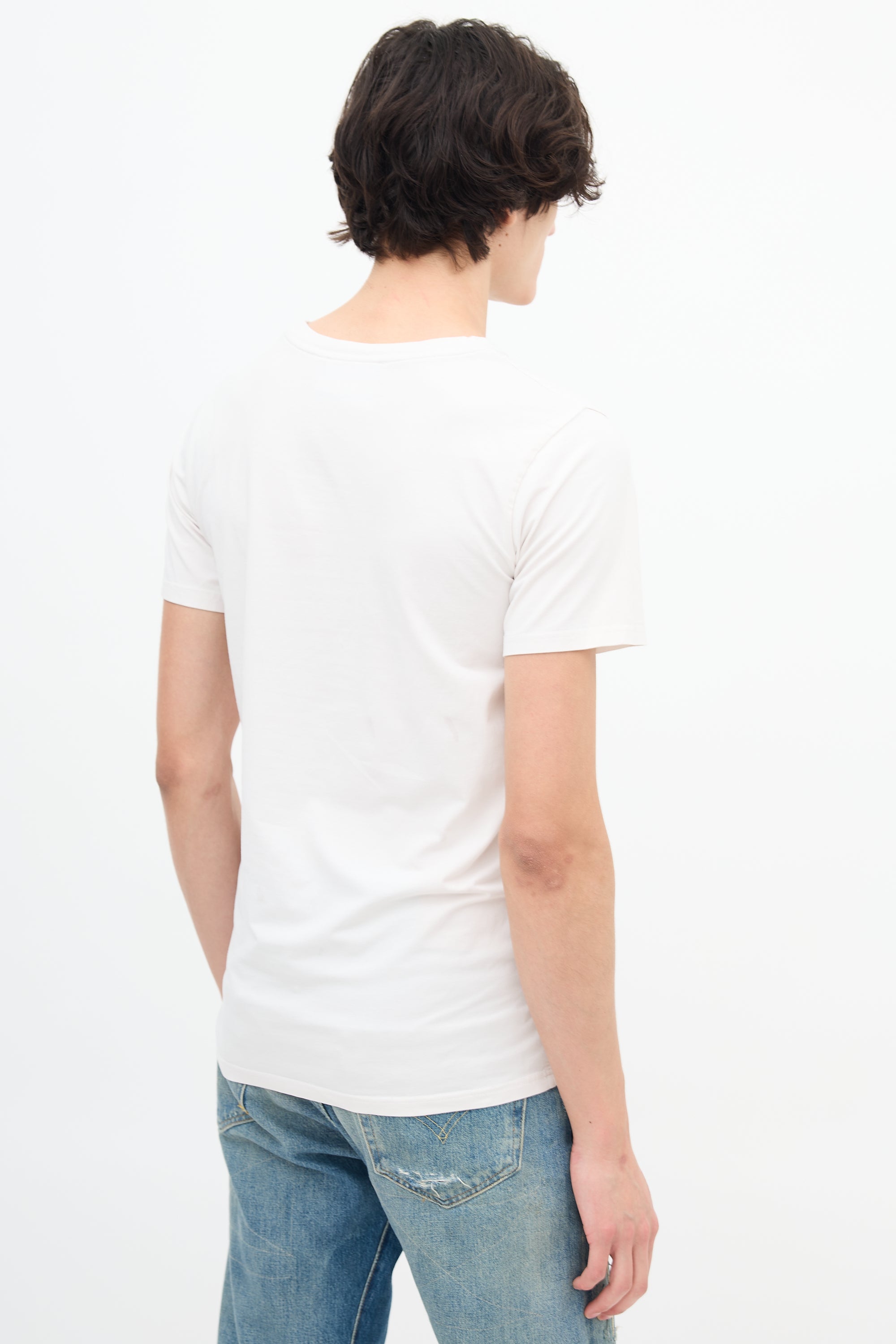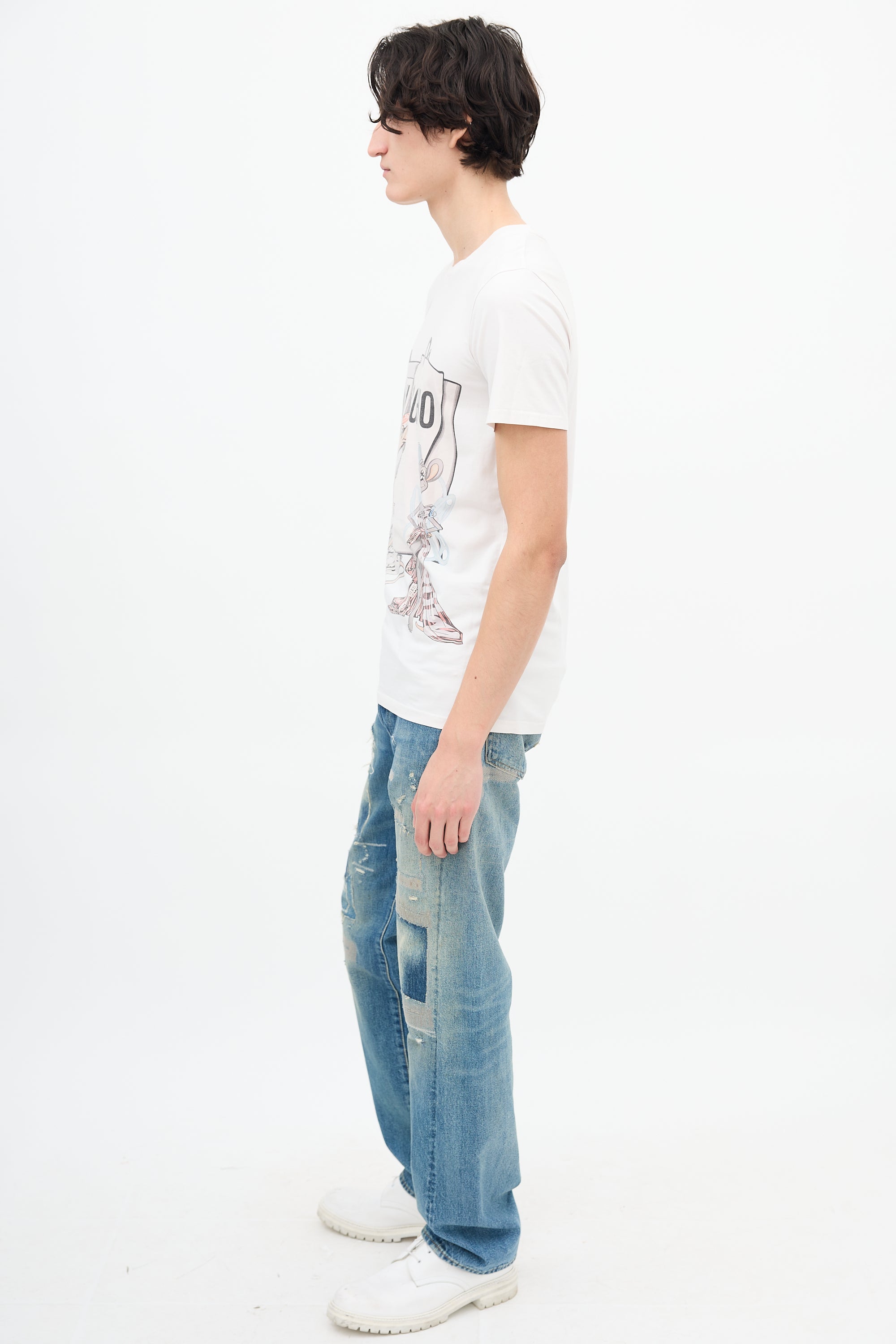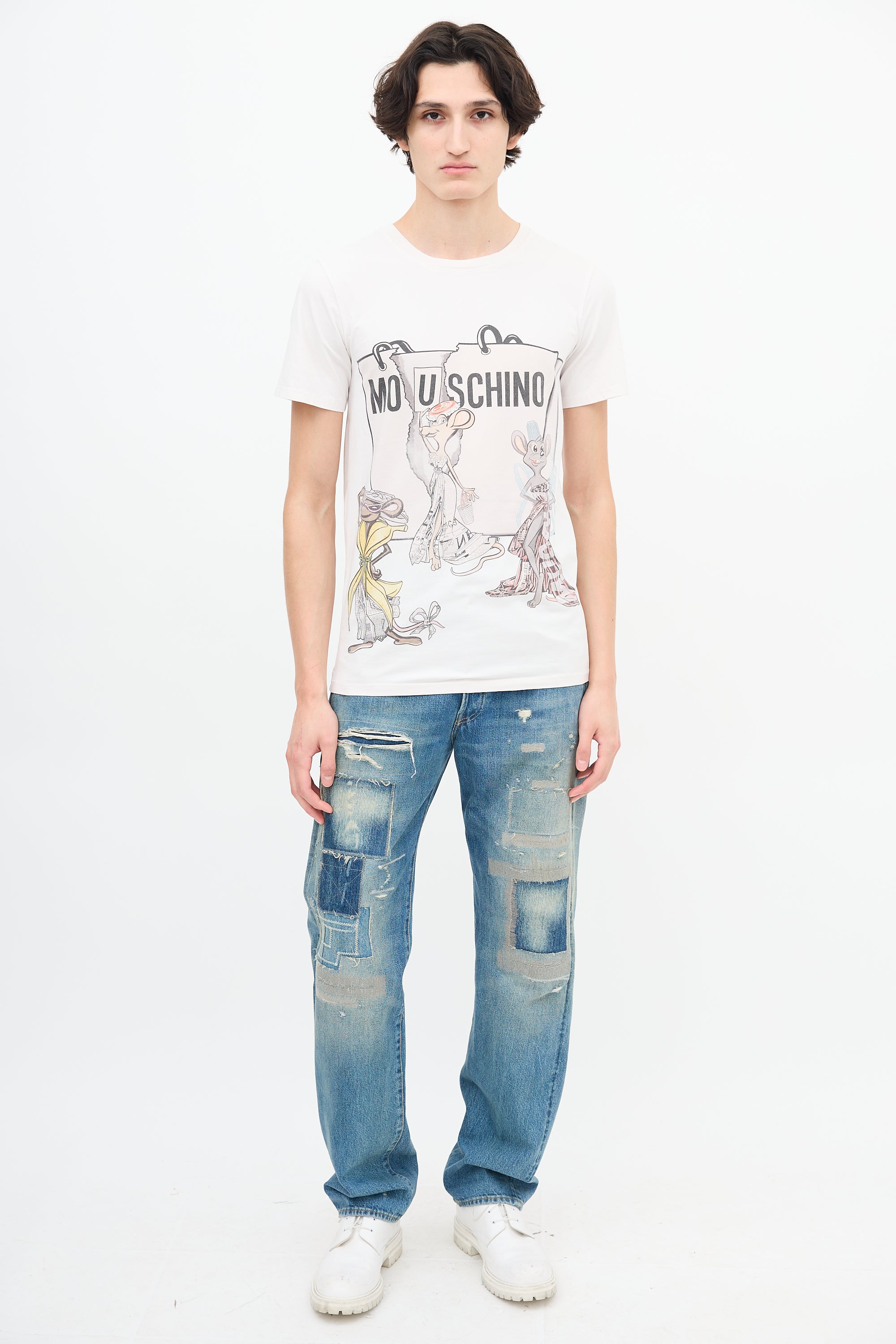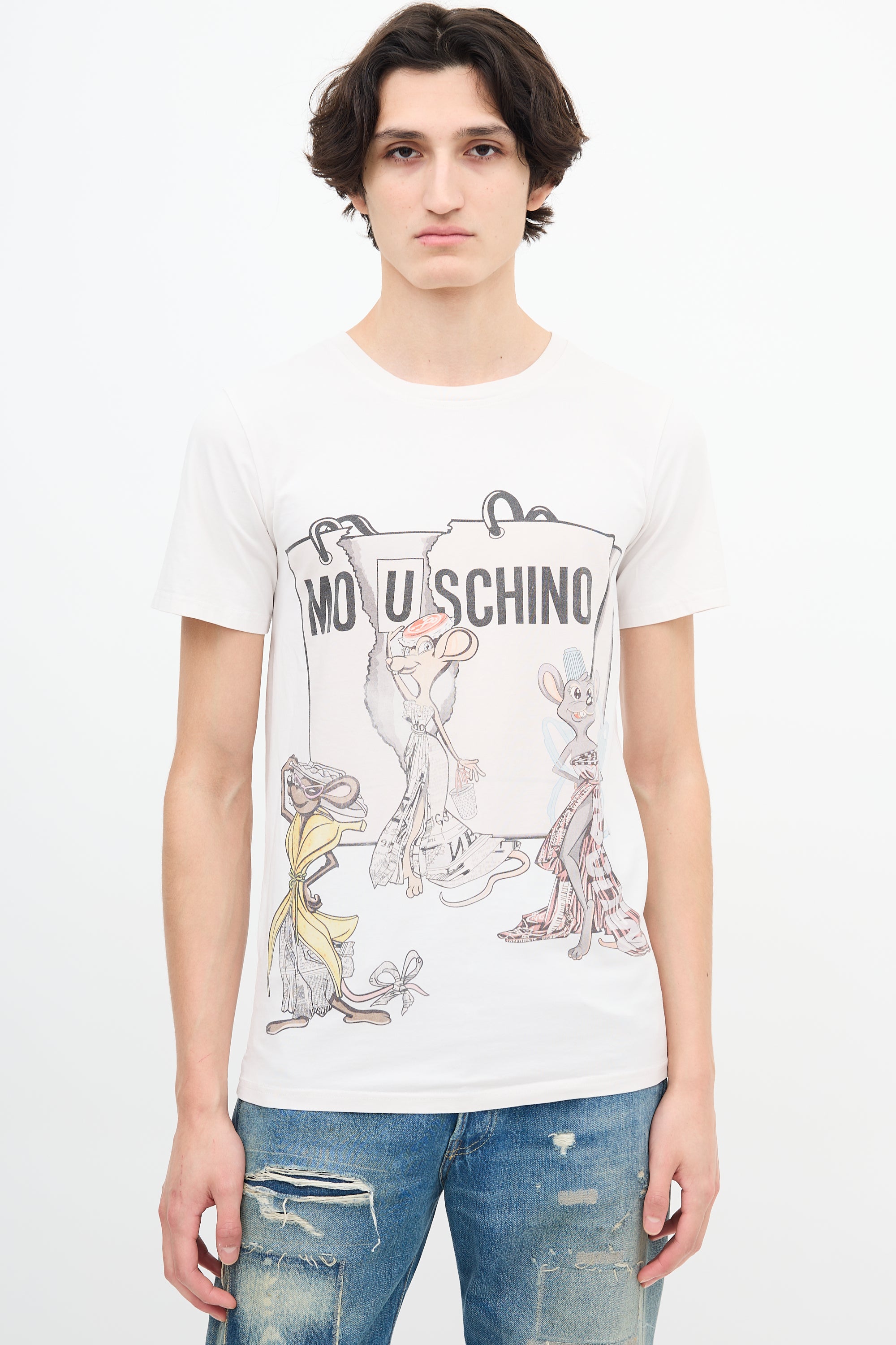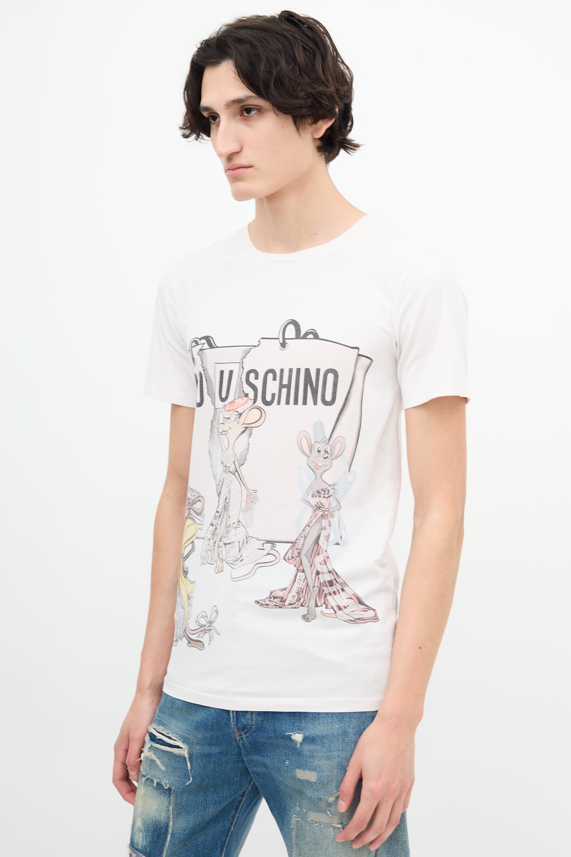 Pre-owned Moschino Couture white Rat-A-Porter T-shirt featuring round neckline, black Mous-chino logo with three mice graphic.