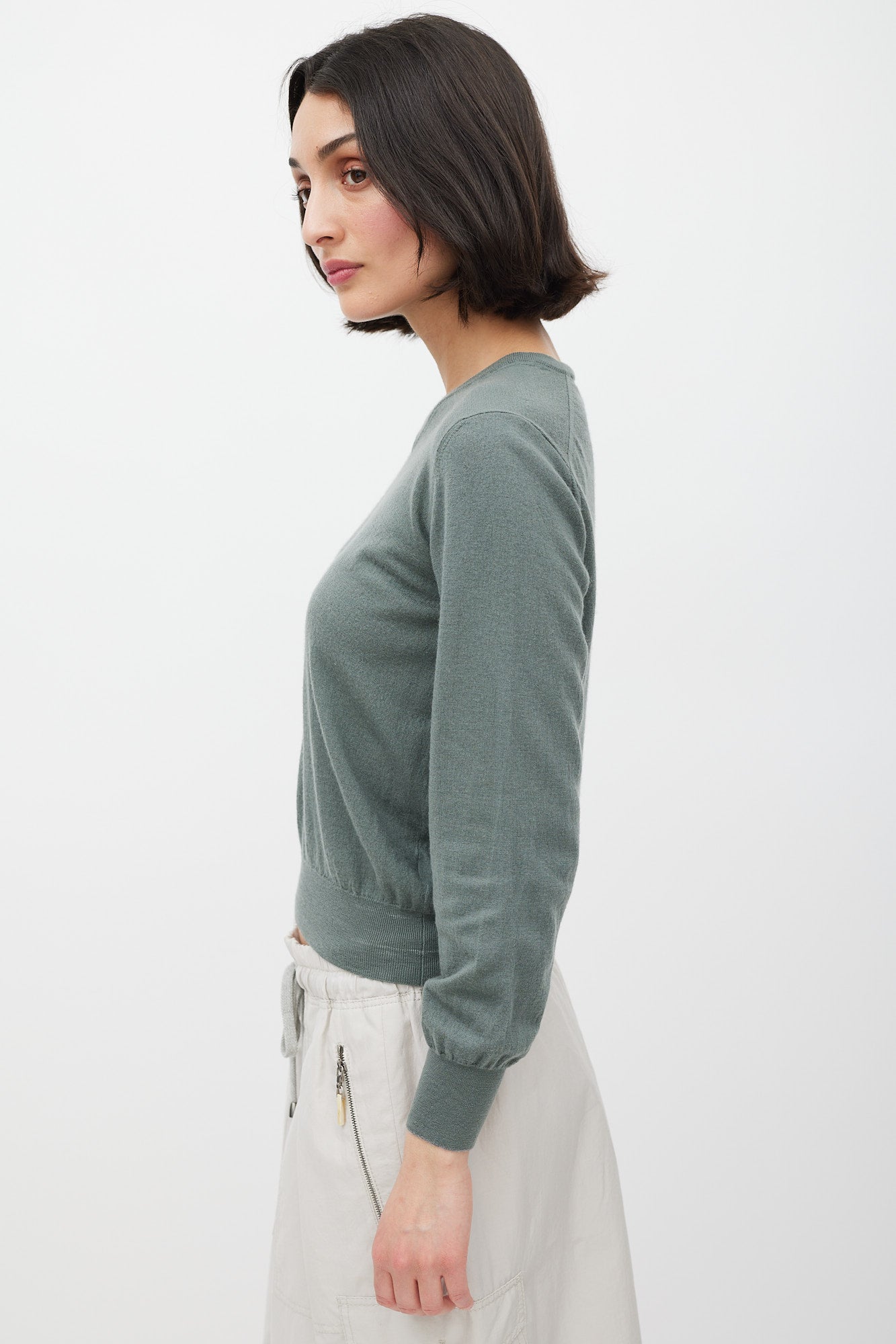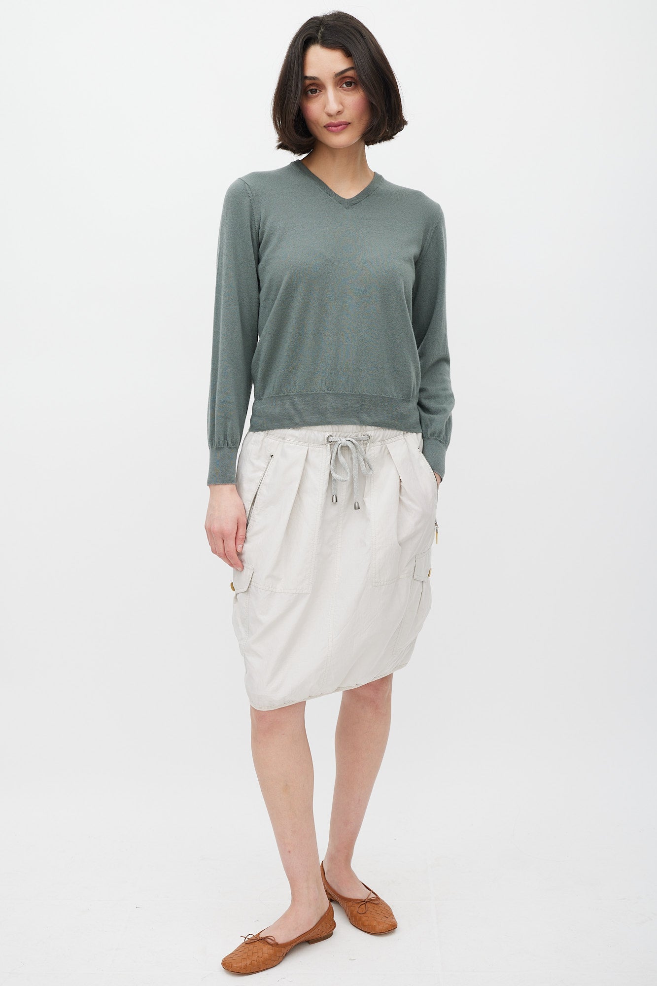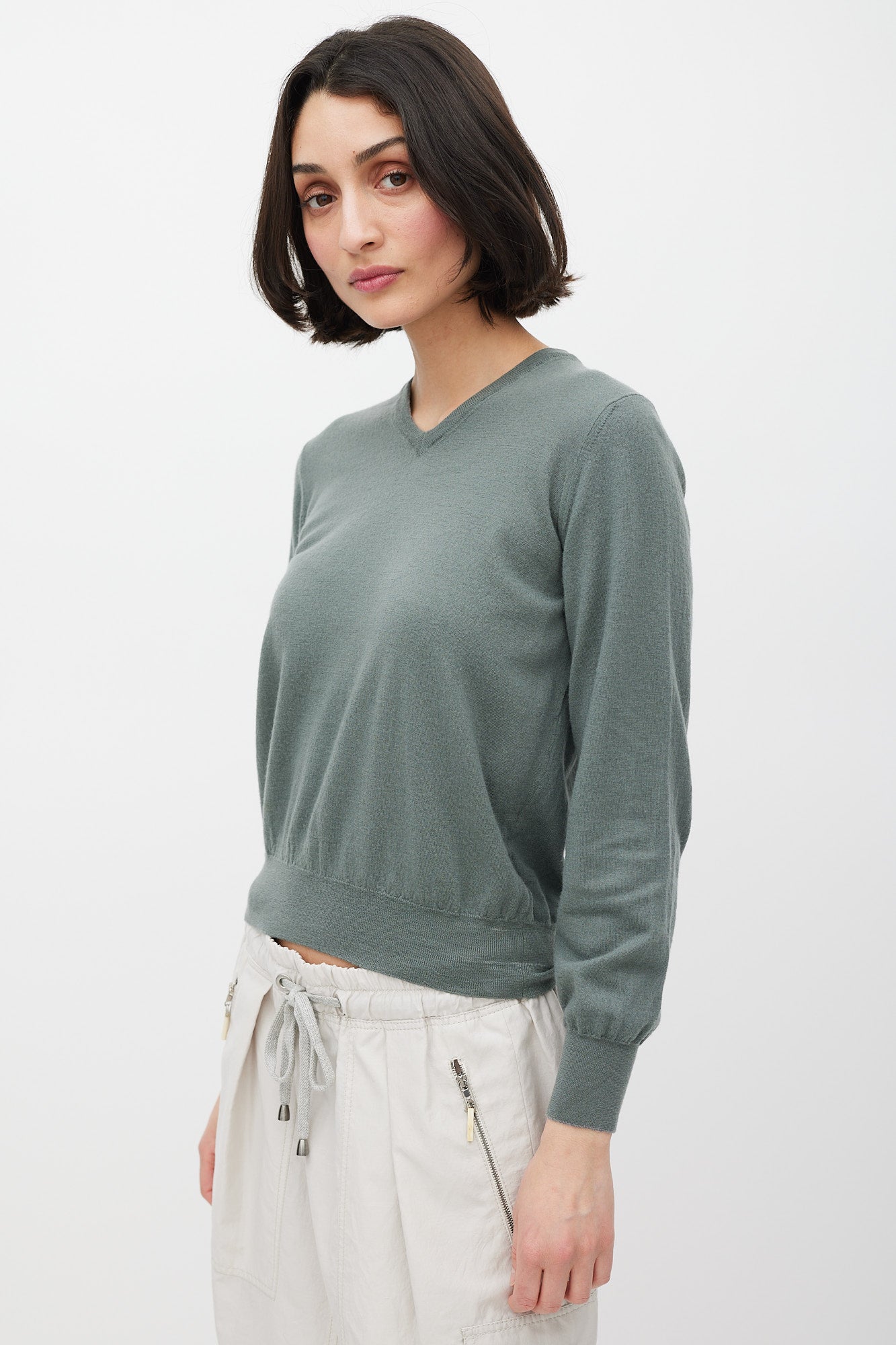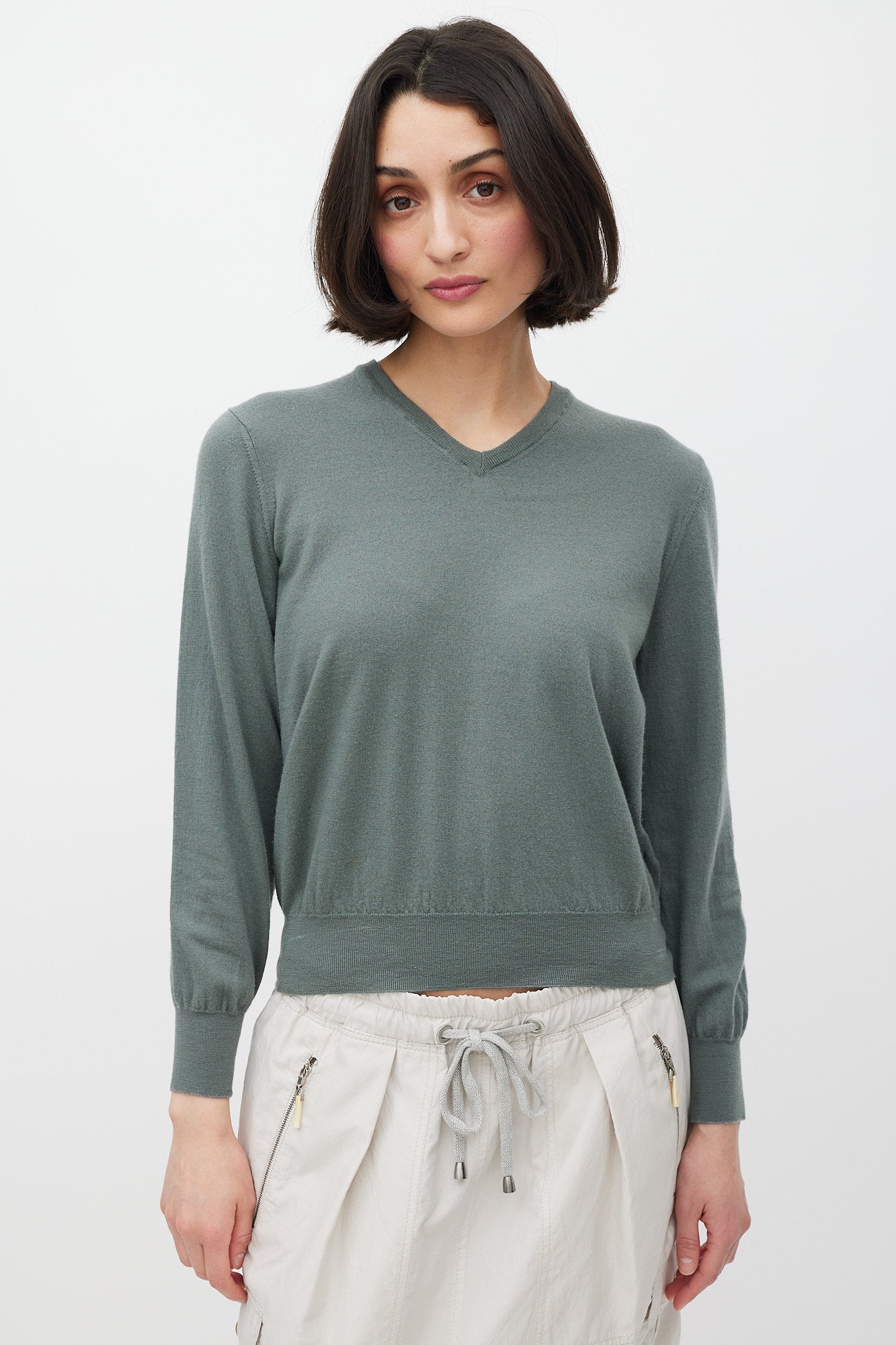 Pre-owned Brunello Cucinelli green cashmere knit sweater featuring a V-neckline, long sleeves, and ribbed hem.