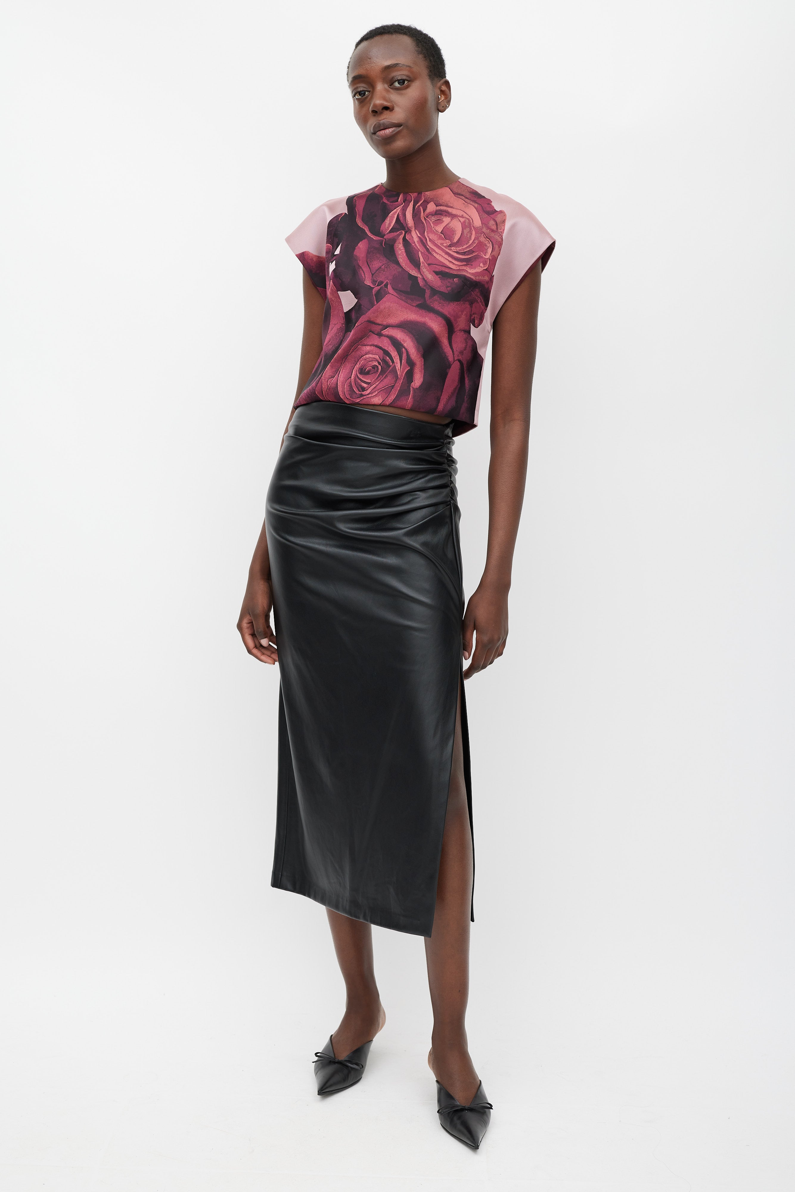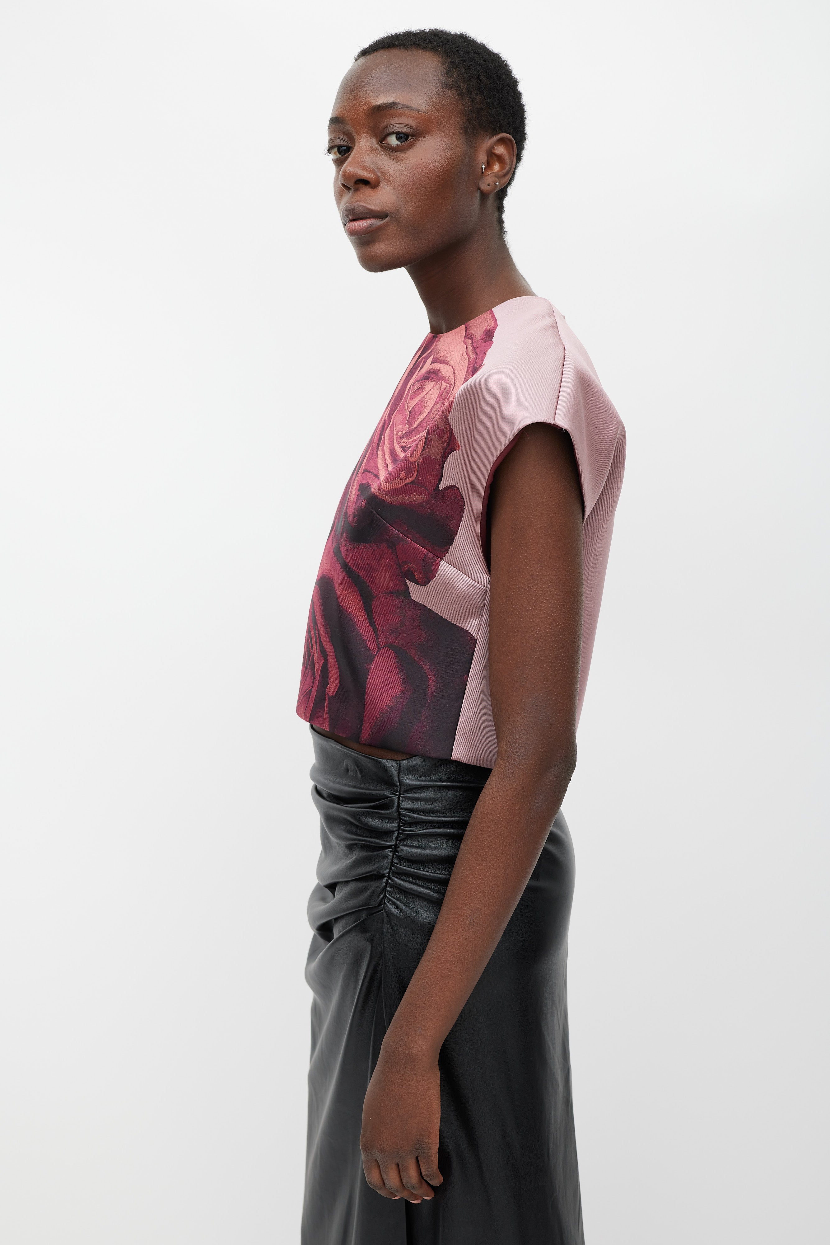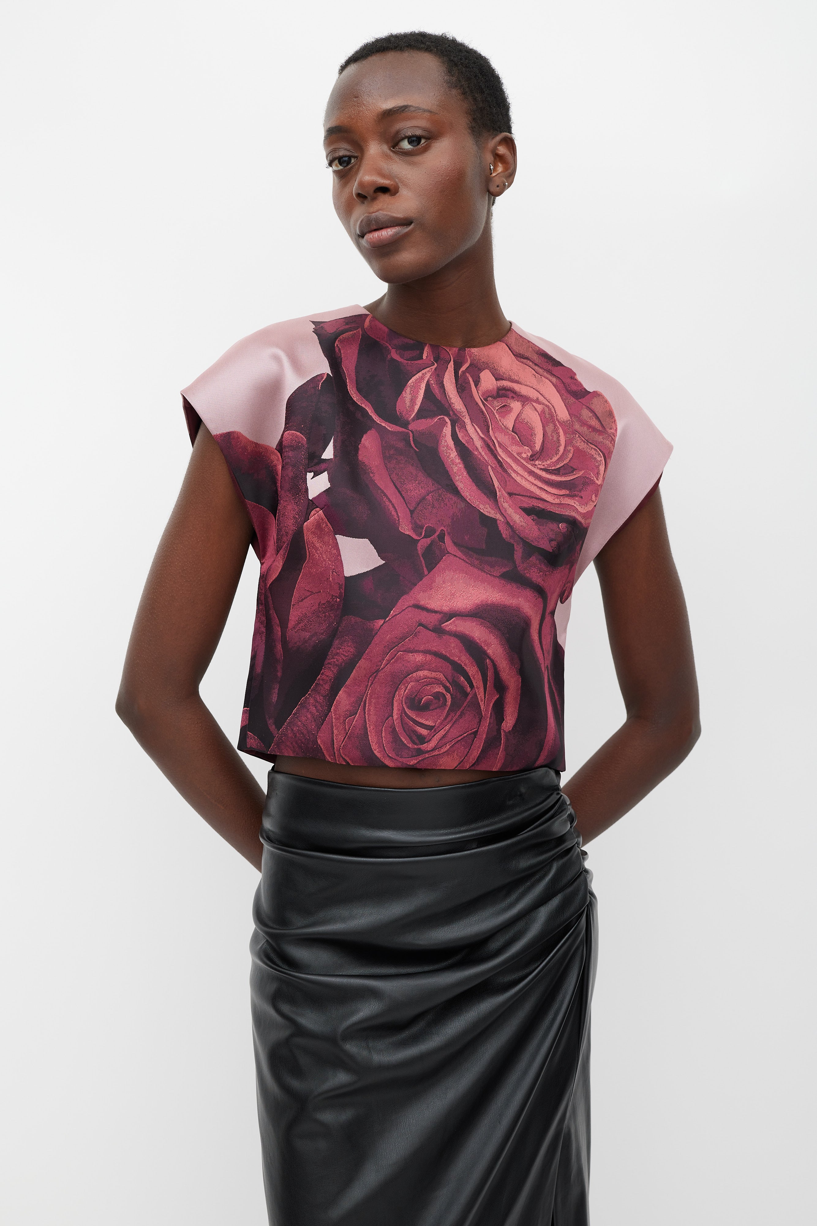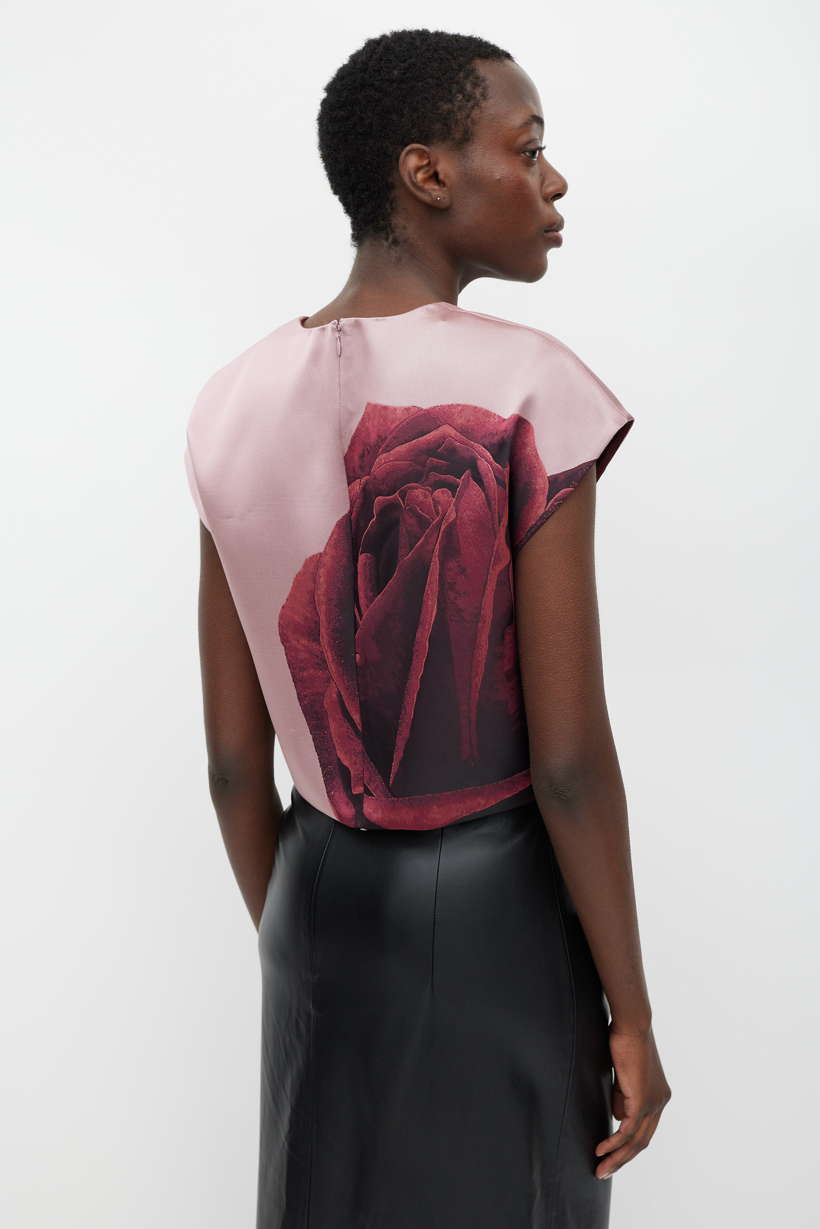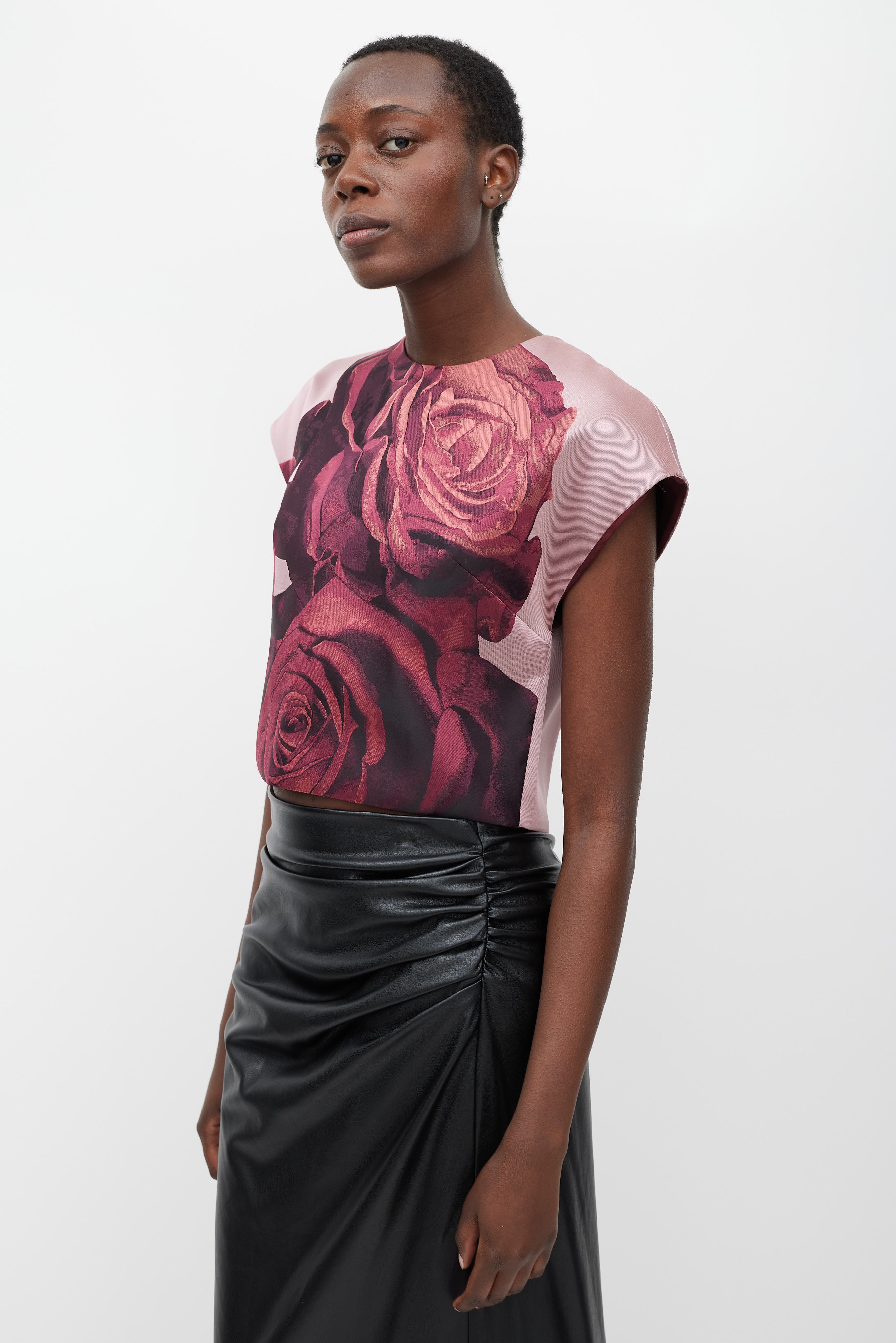 Pre-owned Giambattista Valli pink silk top featuring a red jacquard rose pattern throughout, round neckline, sleeveless styling, darted bust, and concealed zip at back with hook and eye closure. Lined.