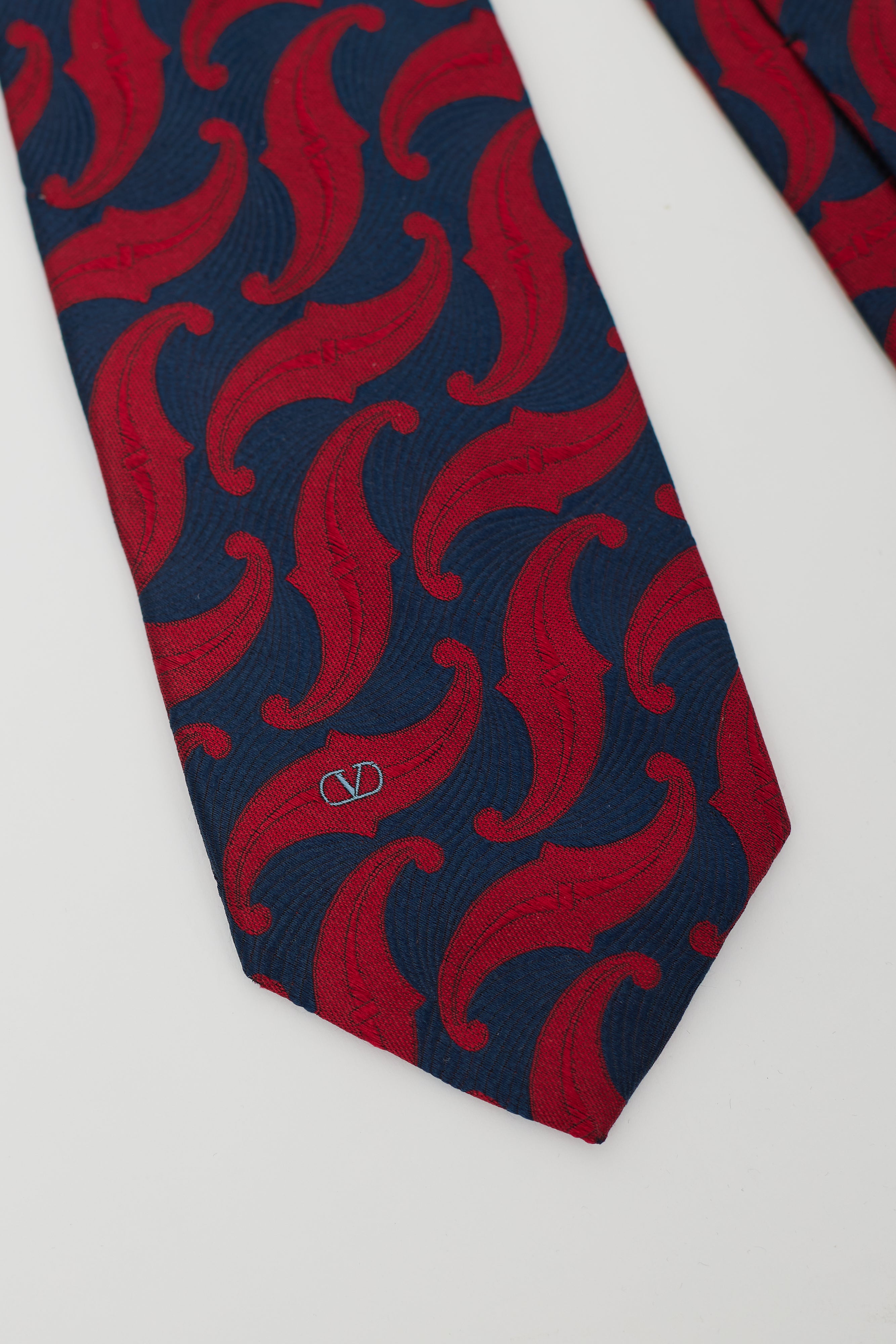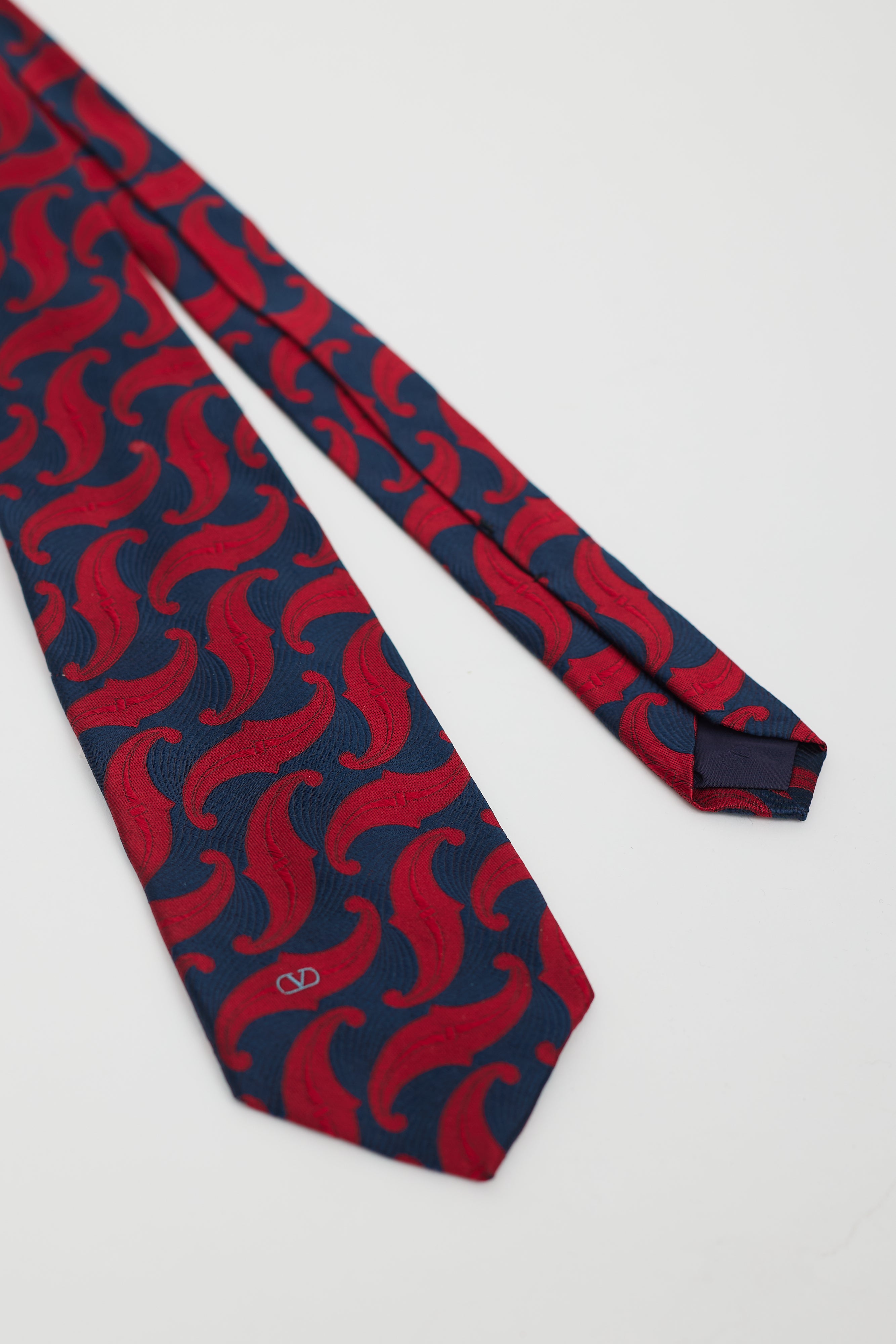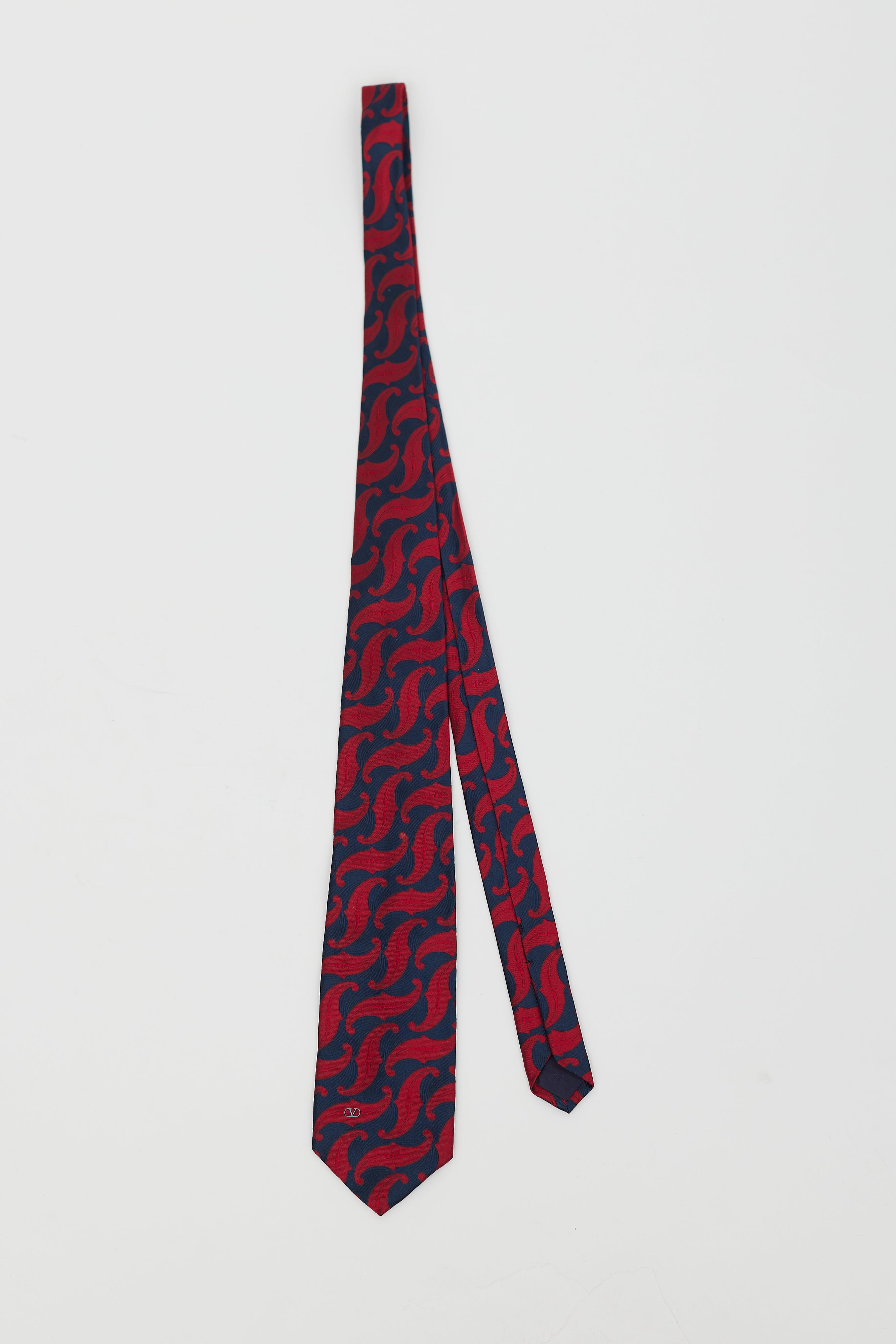 Pre-owned Valentino navy and red silk tie featuring paisley print, blue V logo print throughout, and logo tab at back.