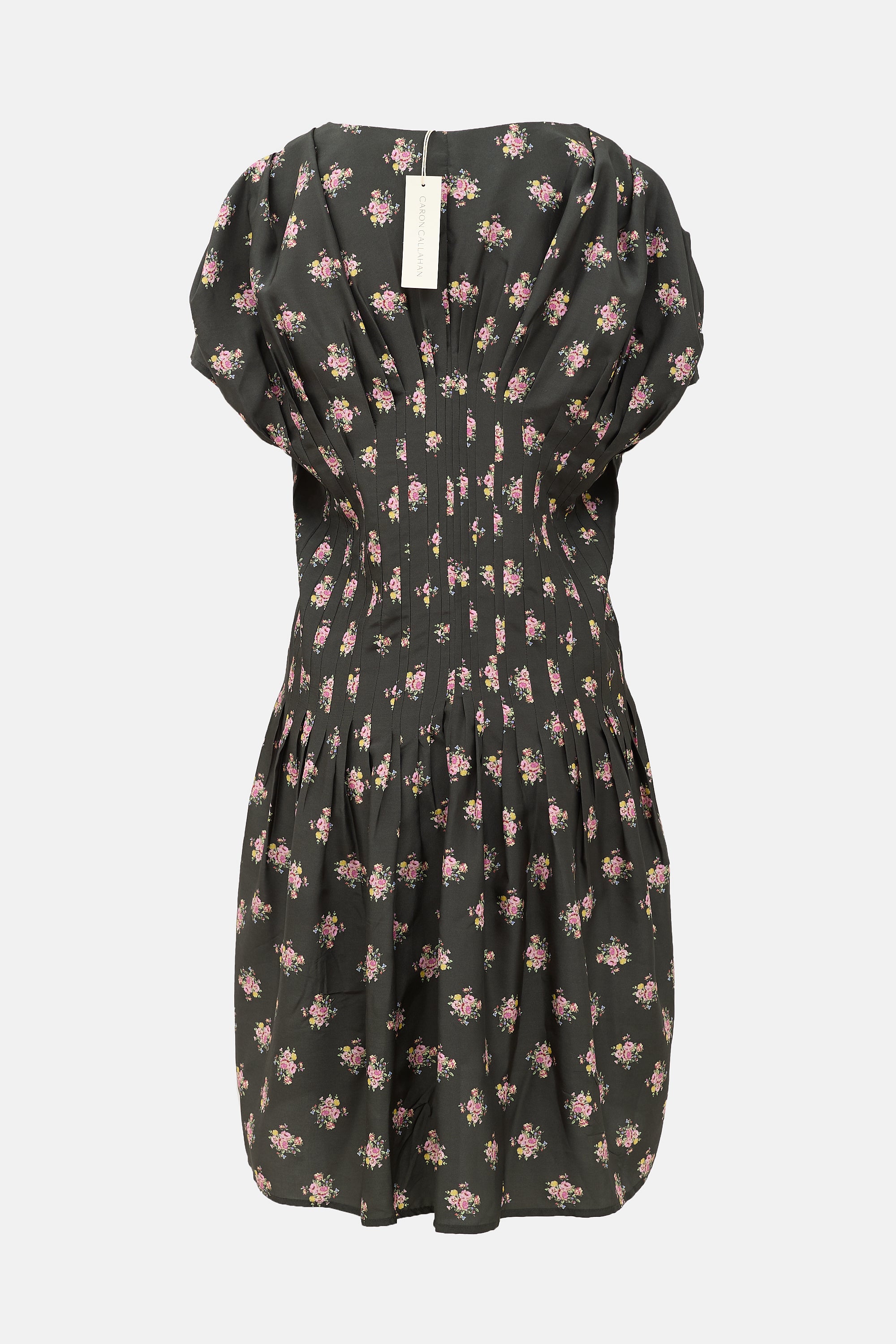 Caron Callahan dark grey and multicolour silk dress featuring V-neckline, tapered pleated waist, floral print, and wide cap sleeves.