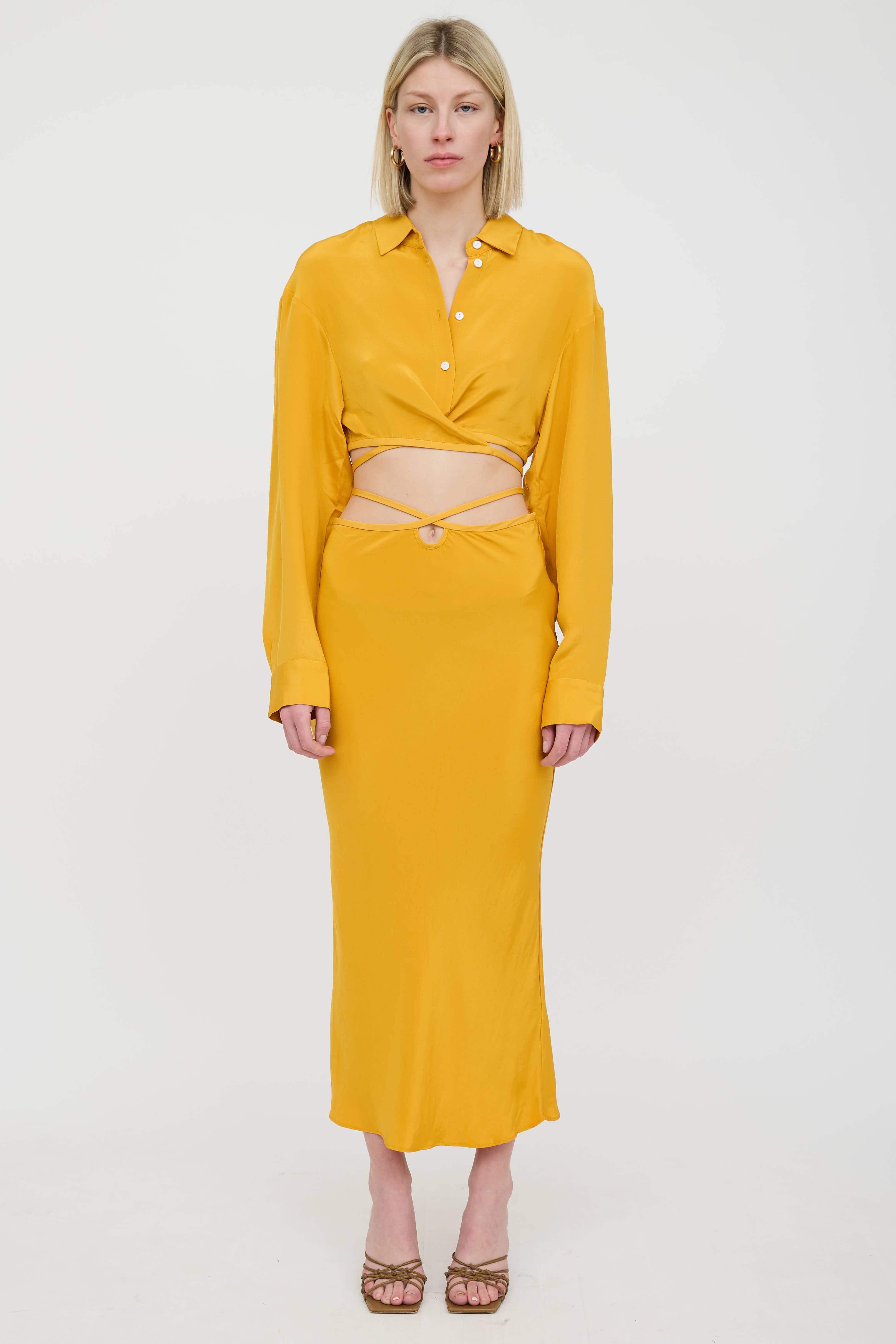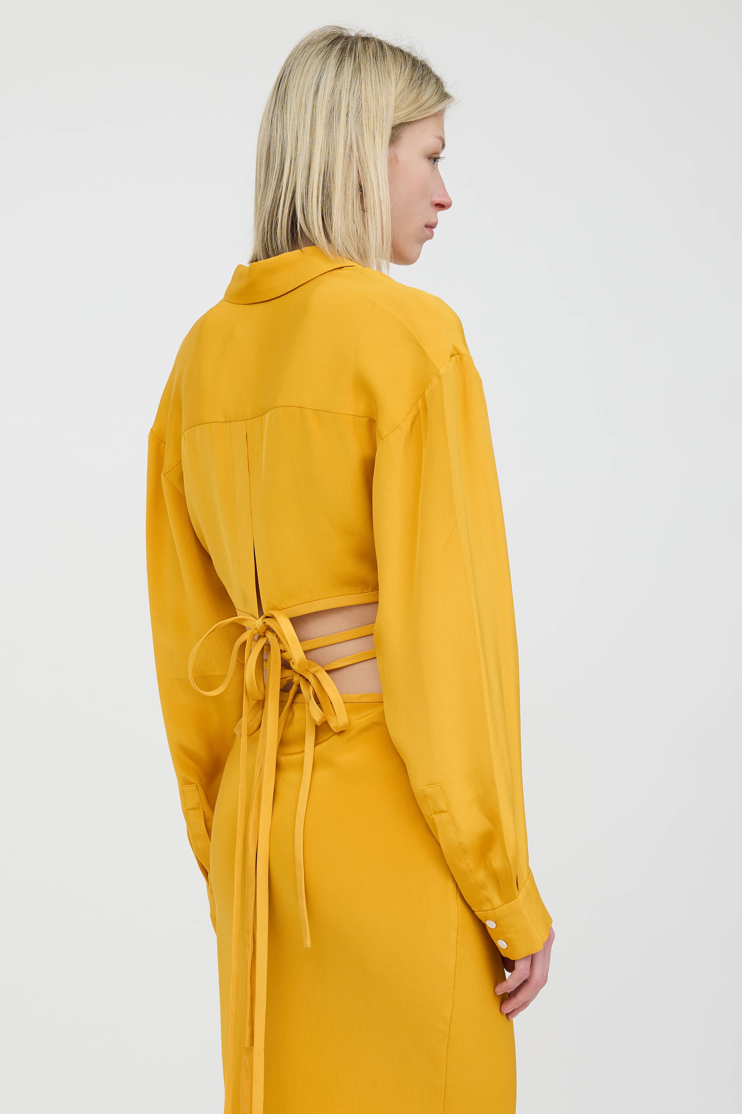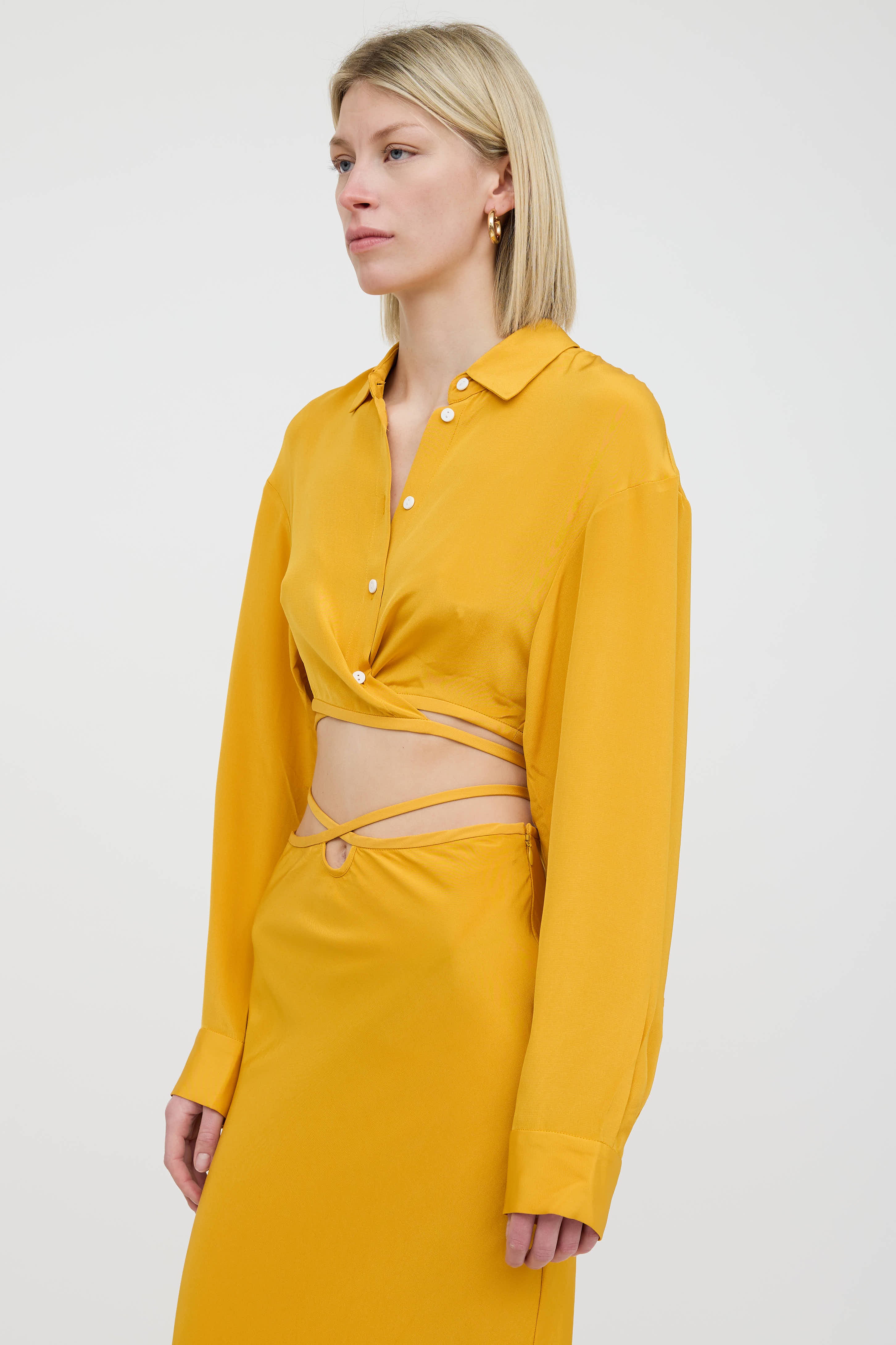Pre-owned Christopher Esber yellow silk shirt featuring a pointed collar, long sleeves with buttoned cuffs, cropped fit, tie hem, and button up closure.
