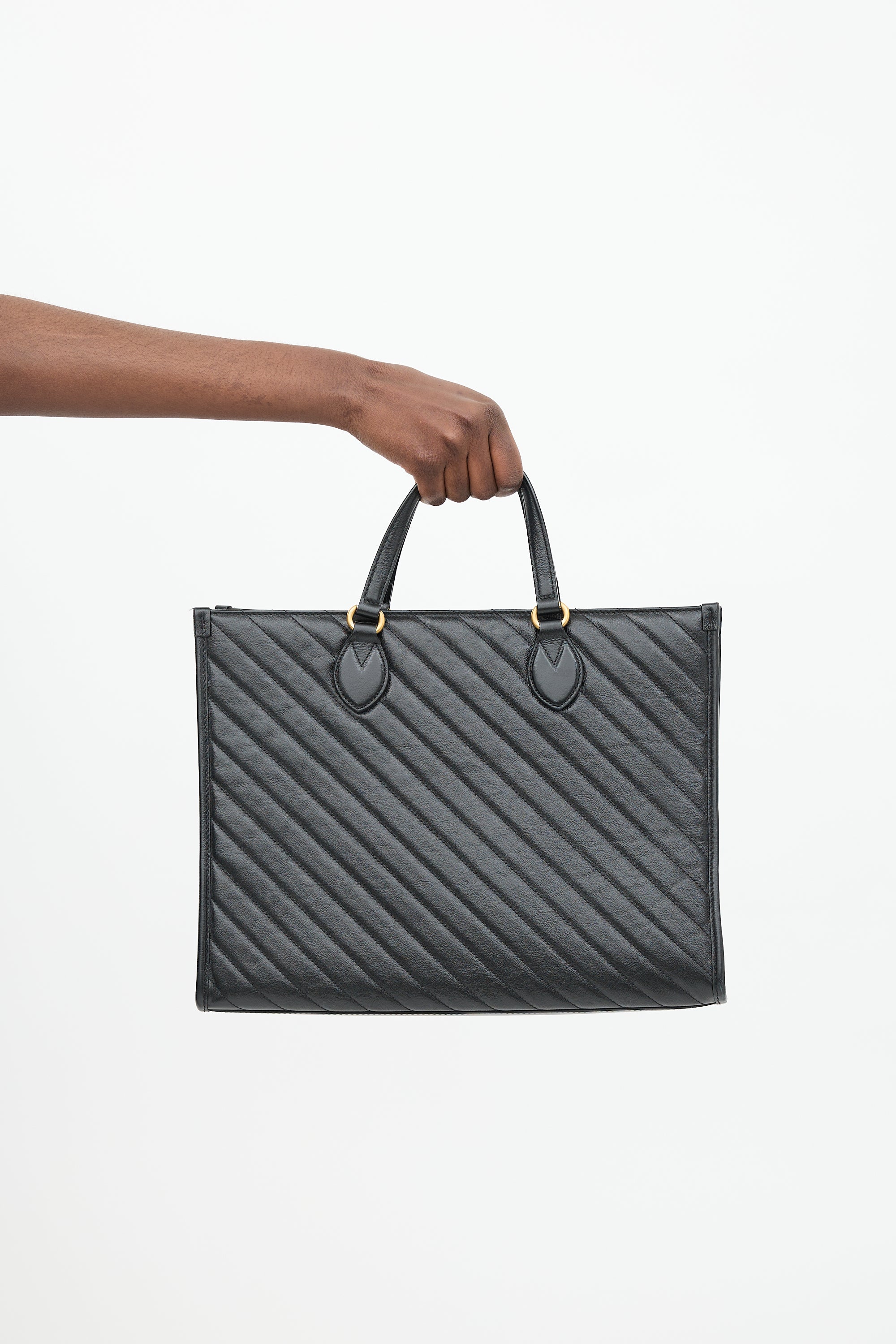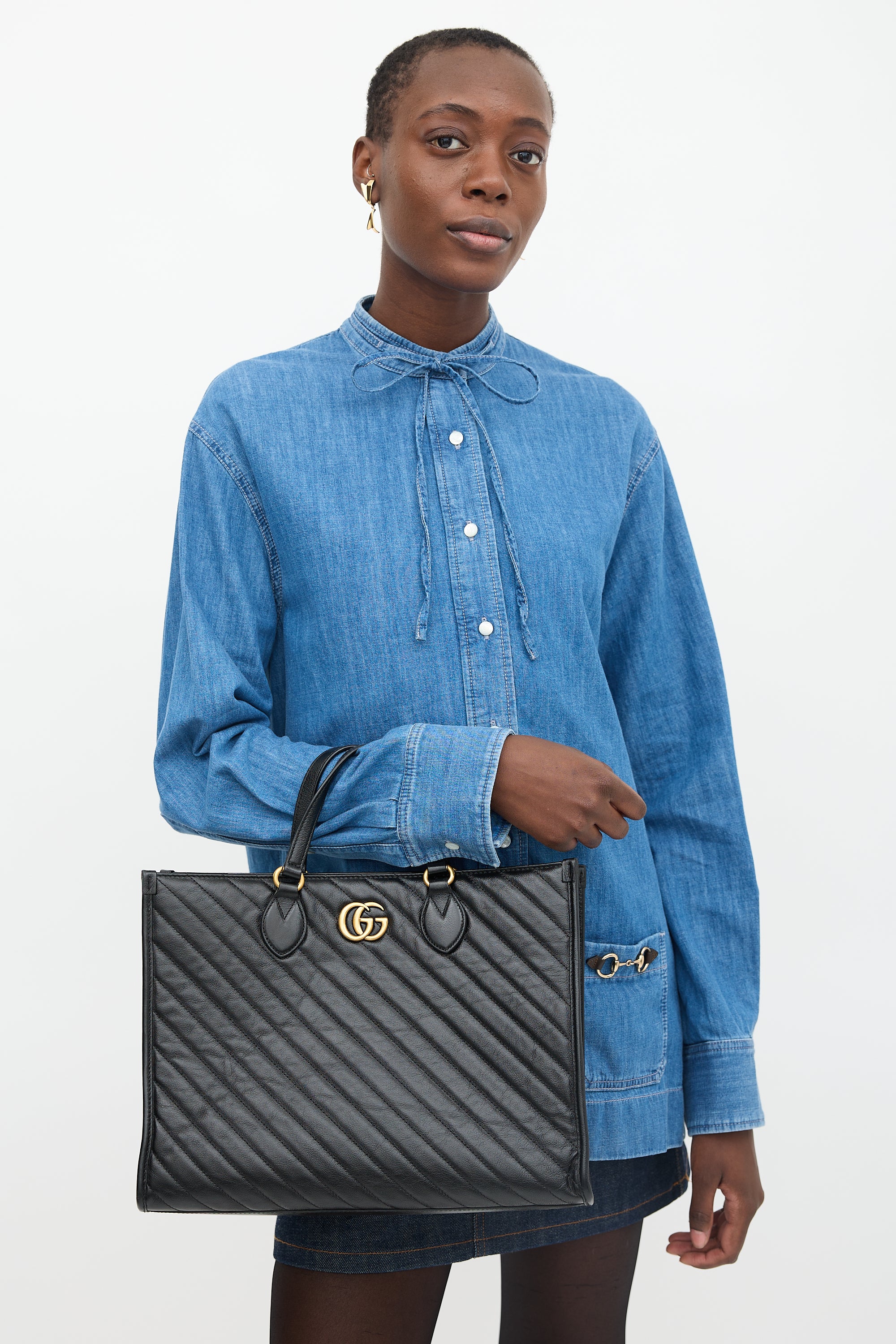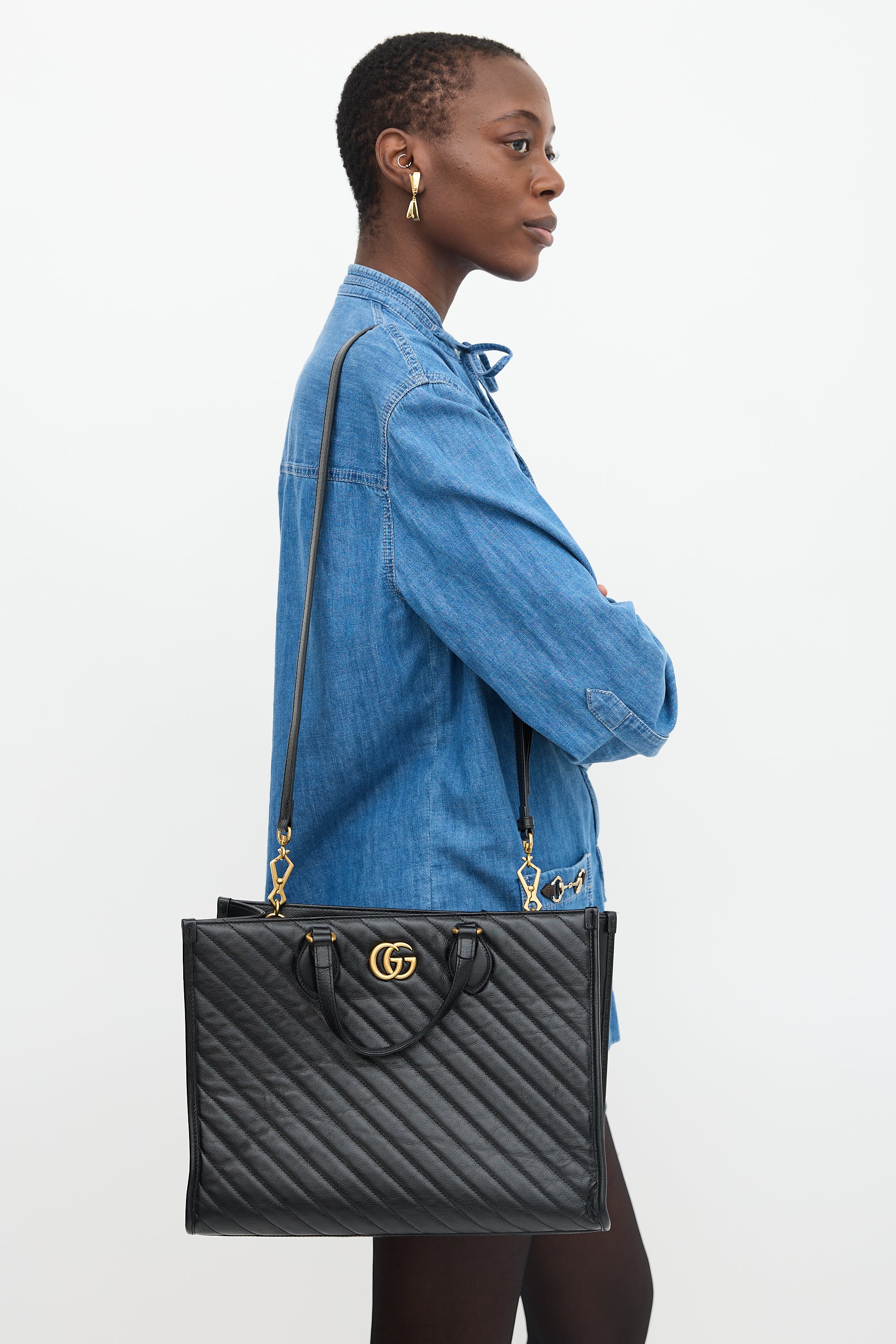 Pre-owned Gucci black leather Marmont 2.0 tote bag featuring gold tone hardware, matelasse quilted body, dual flat top handles, detachable and adjustable shoulder strap, GG logo hardware at front collar, open top with magnetic closure, and one lined main compartment with one zip pocket and one slip pocket. Comes with original dust bag.