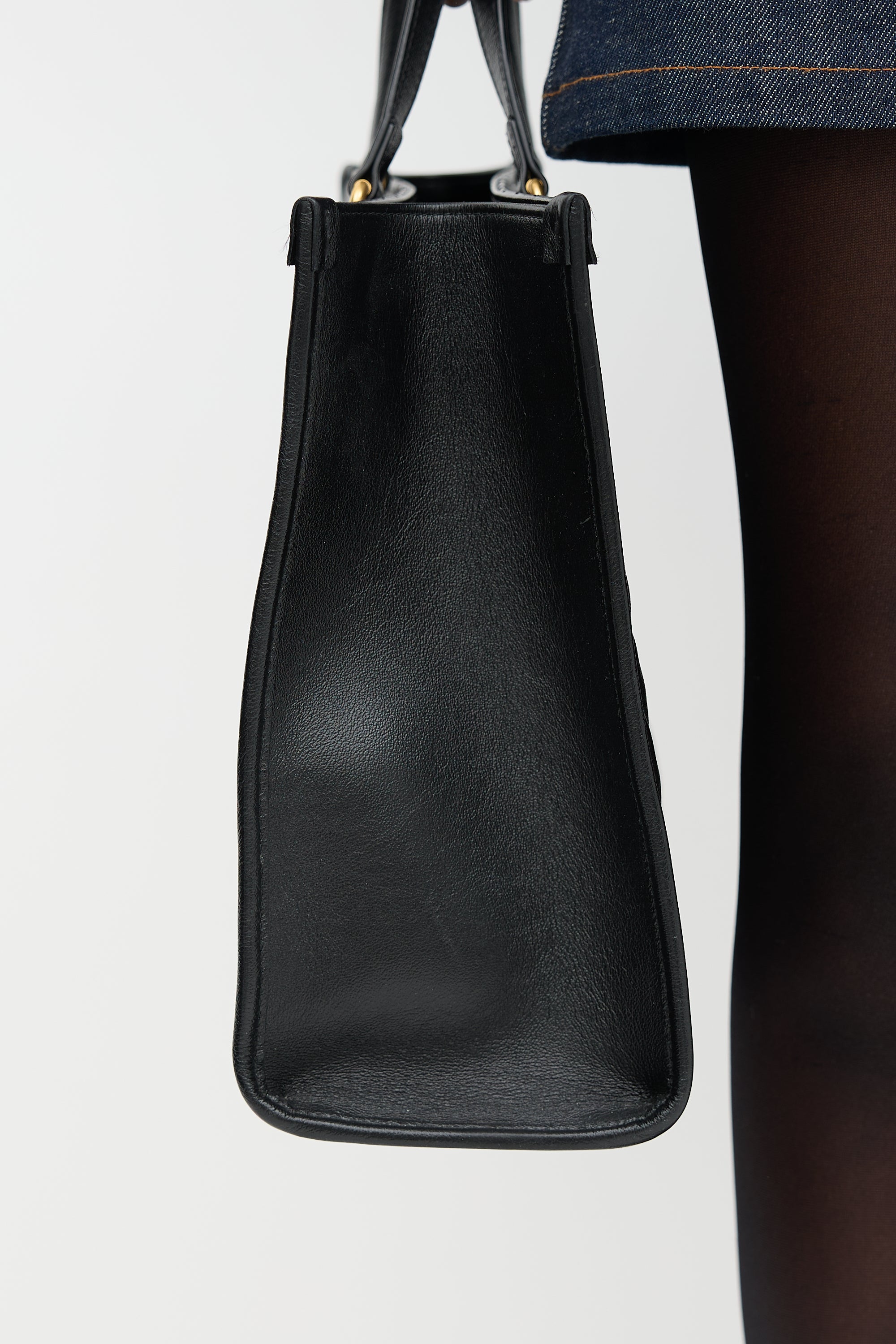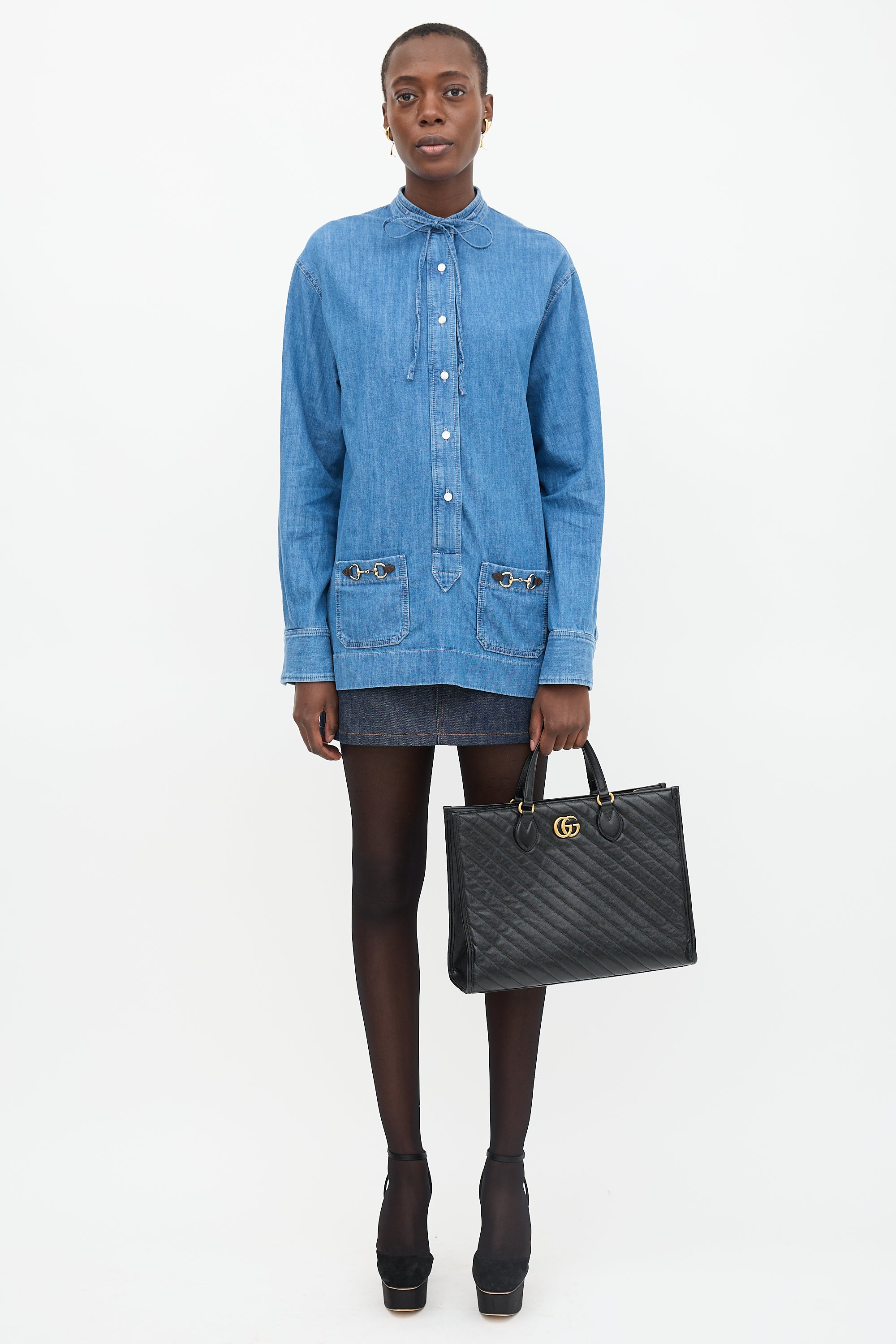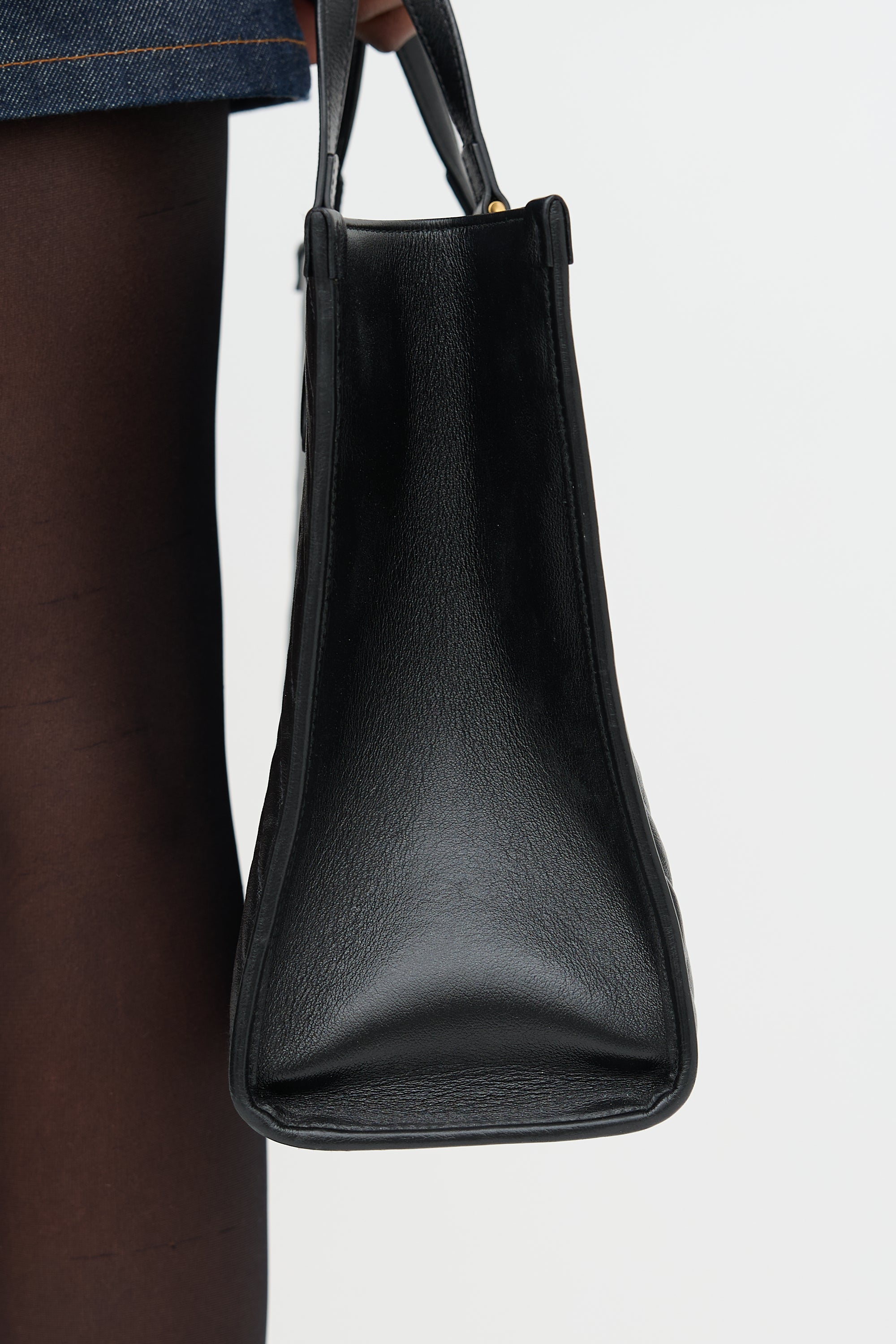 Pre-owned Gucci black leather Marmont 2.0 tote bag featuring gold tone hardware, matelasse quilted body, dual flat top handles, detachable and adjustable shoulder strap, GG logo hardware at front collar, open top with magnetic closure, and one lined main compartment with one zip pocket and one slip pocket. Comes with original dust bag.