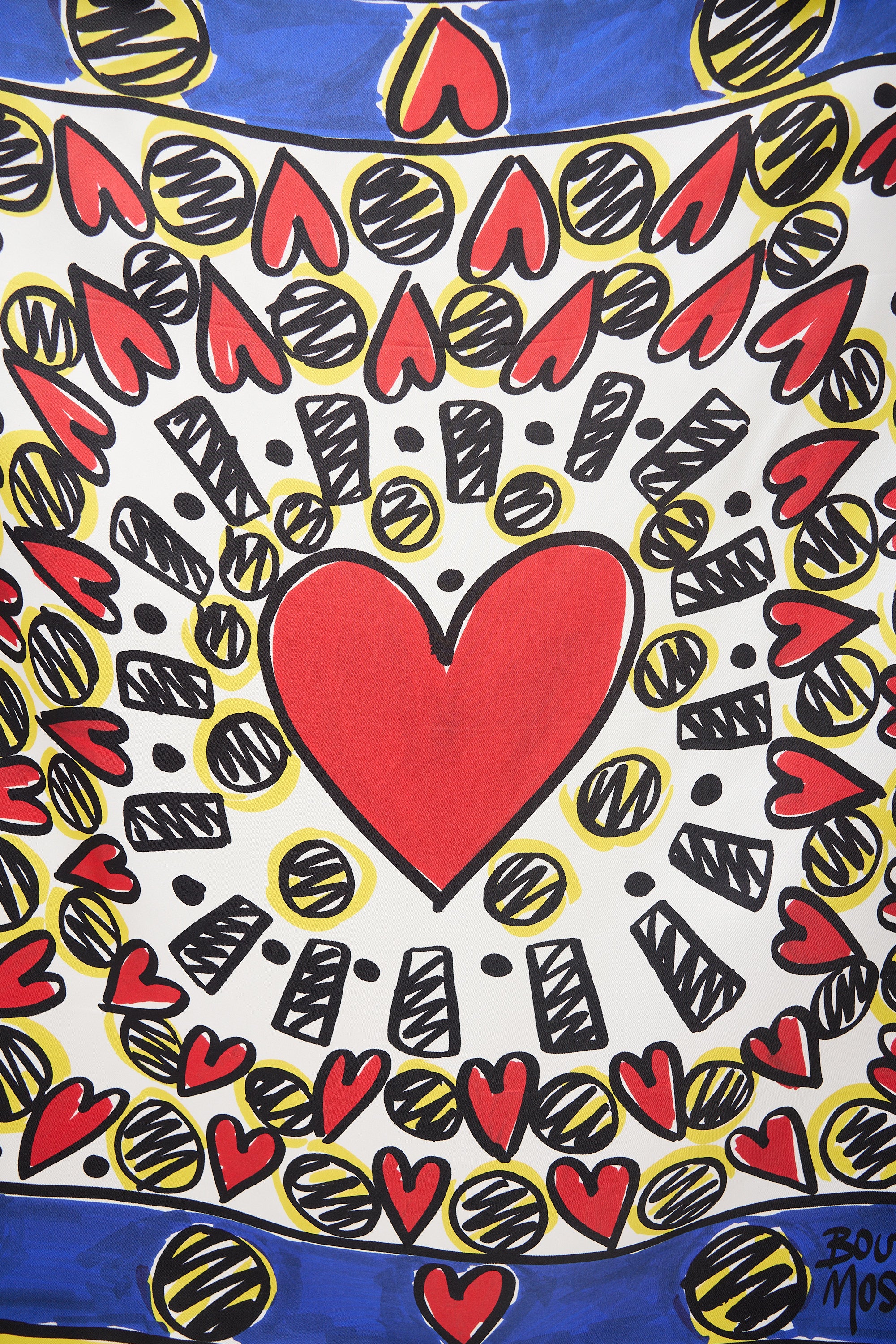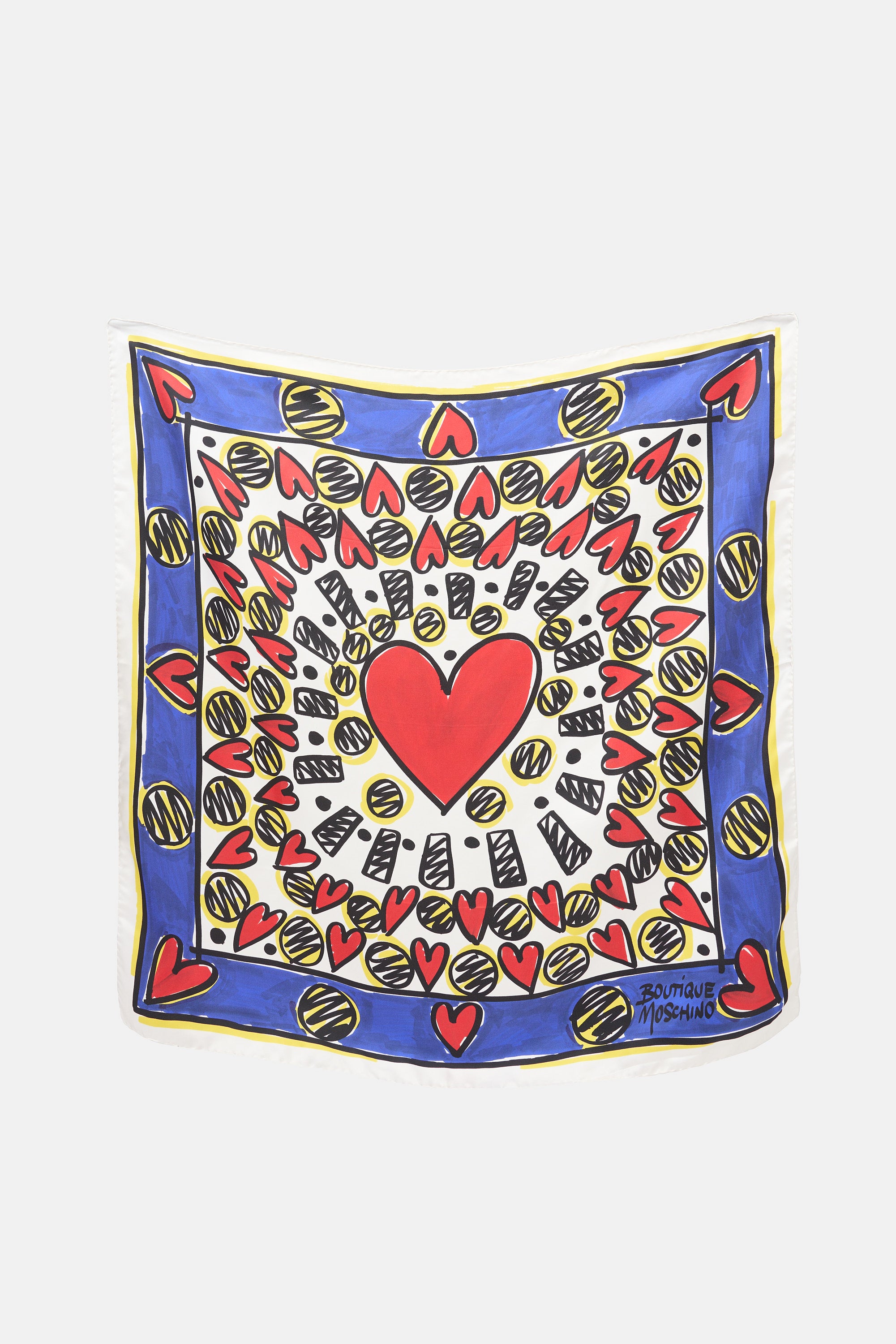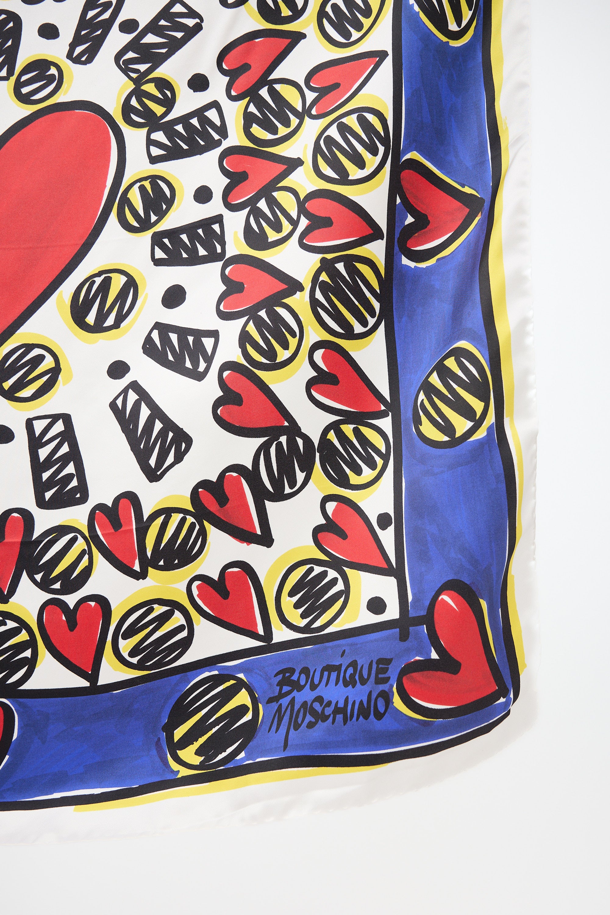 Pre-owned Moschino red, yellow, and blue satin scarf featuring a graphic heart print throughout and hand rolled edges.