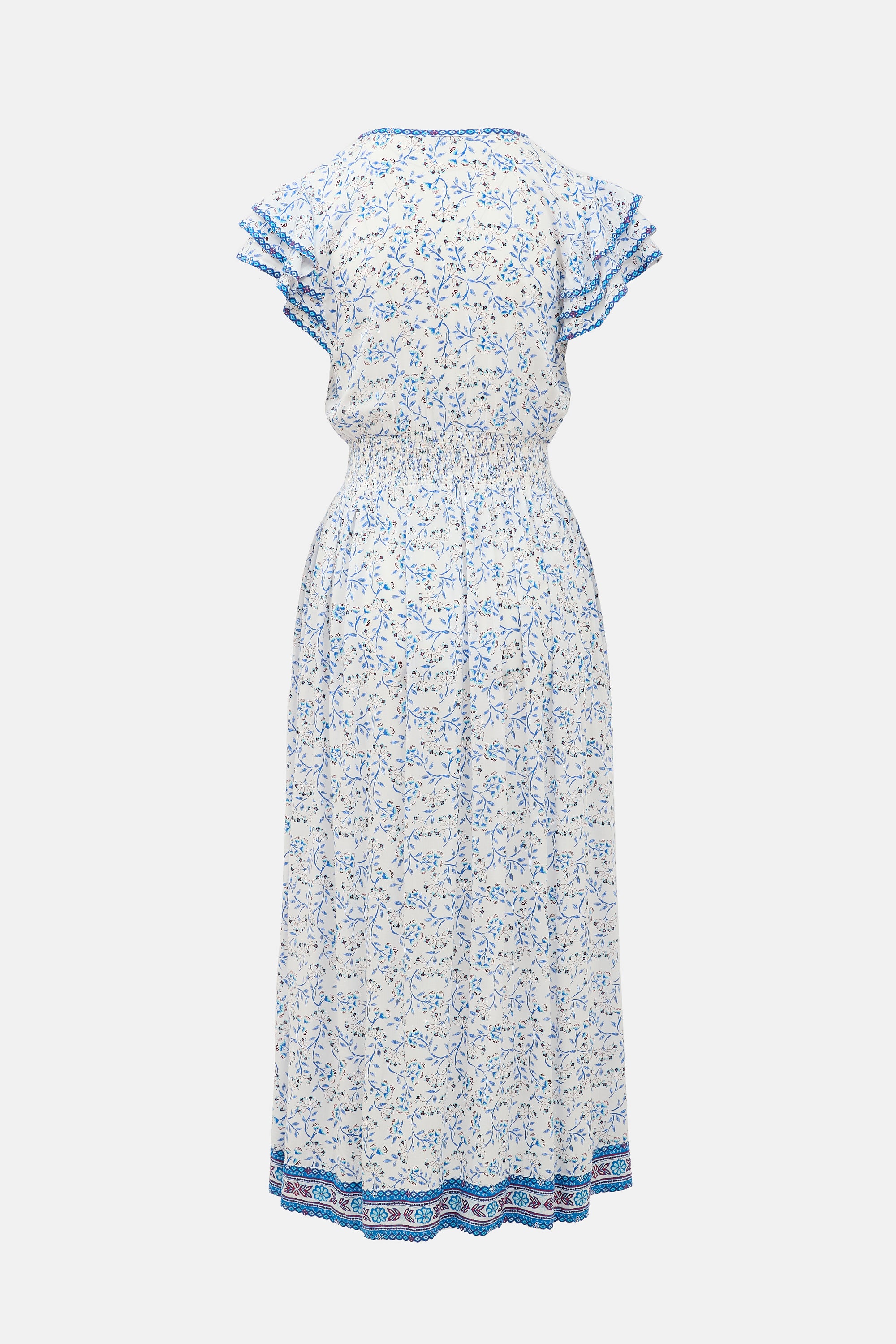 Pre-owned Poupette St Barth white and navy dress featuring floral print, V-neckline, flutter sleeves, two inseam pockets, button front, and smocked waist.