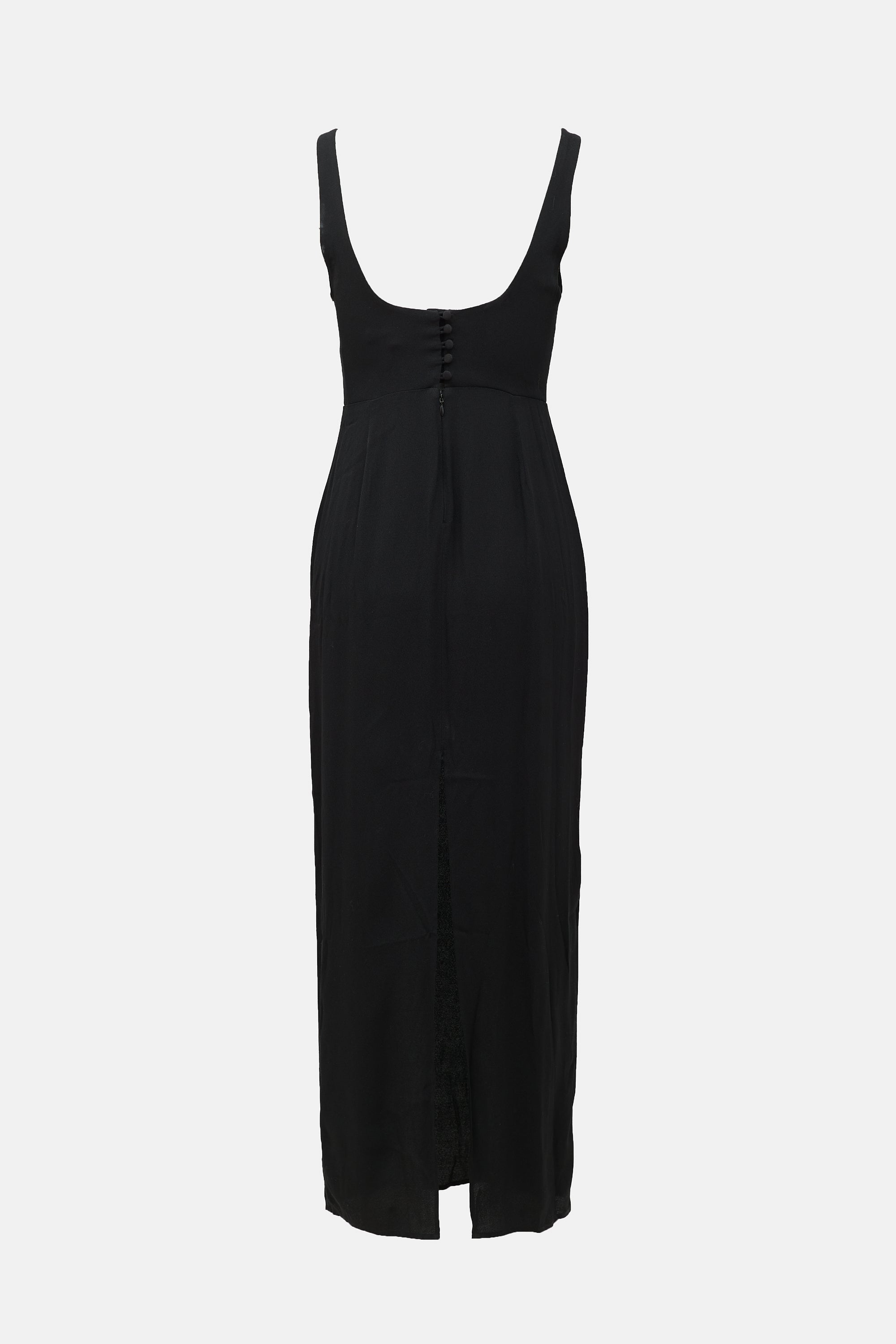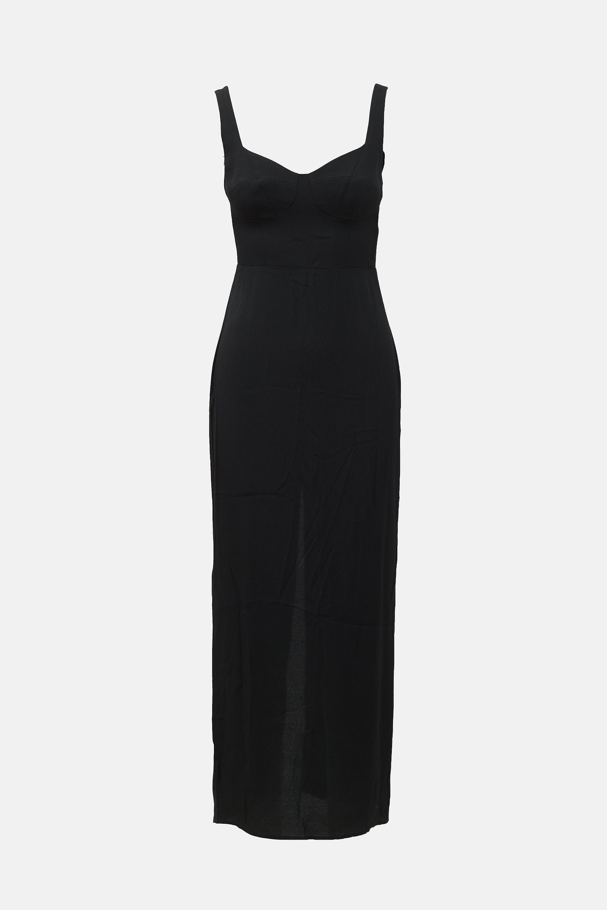 Reformation black Reverie dress featuring sweetheart neckline, bust cups, back vent, and zip and button closure at back.