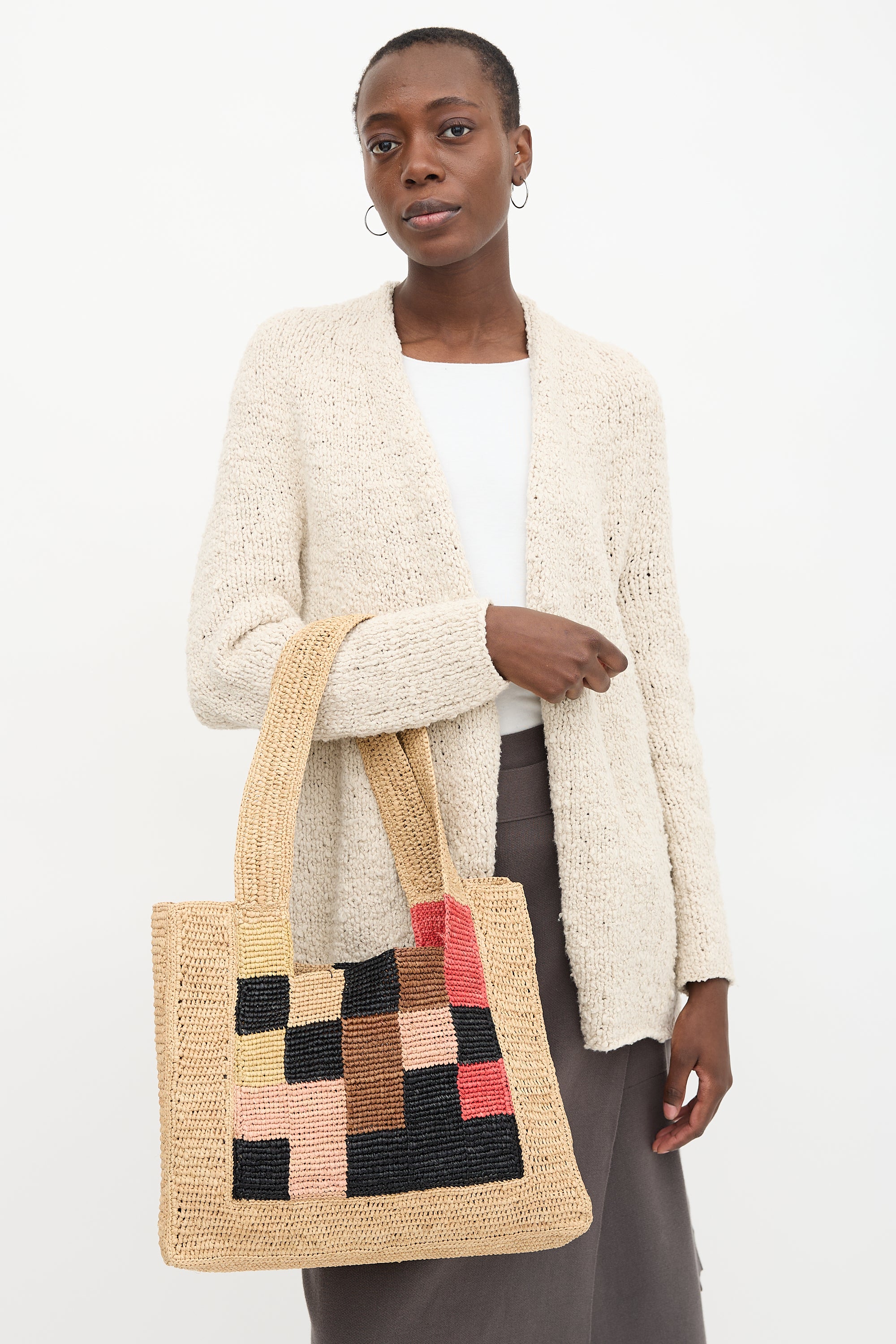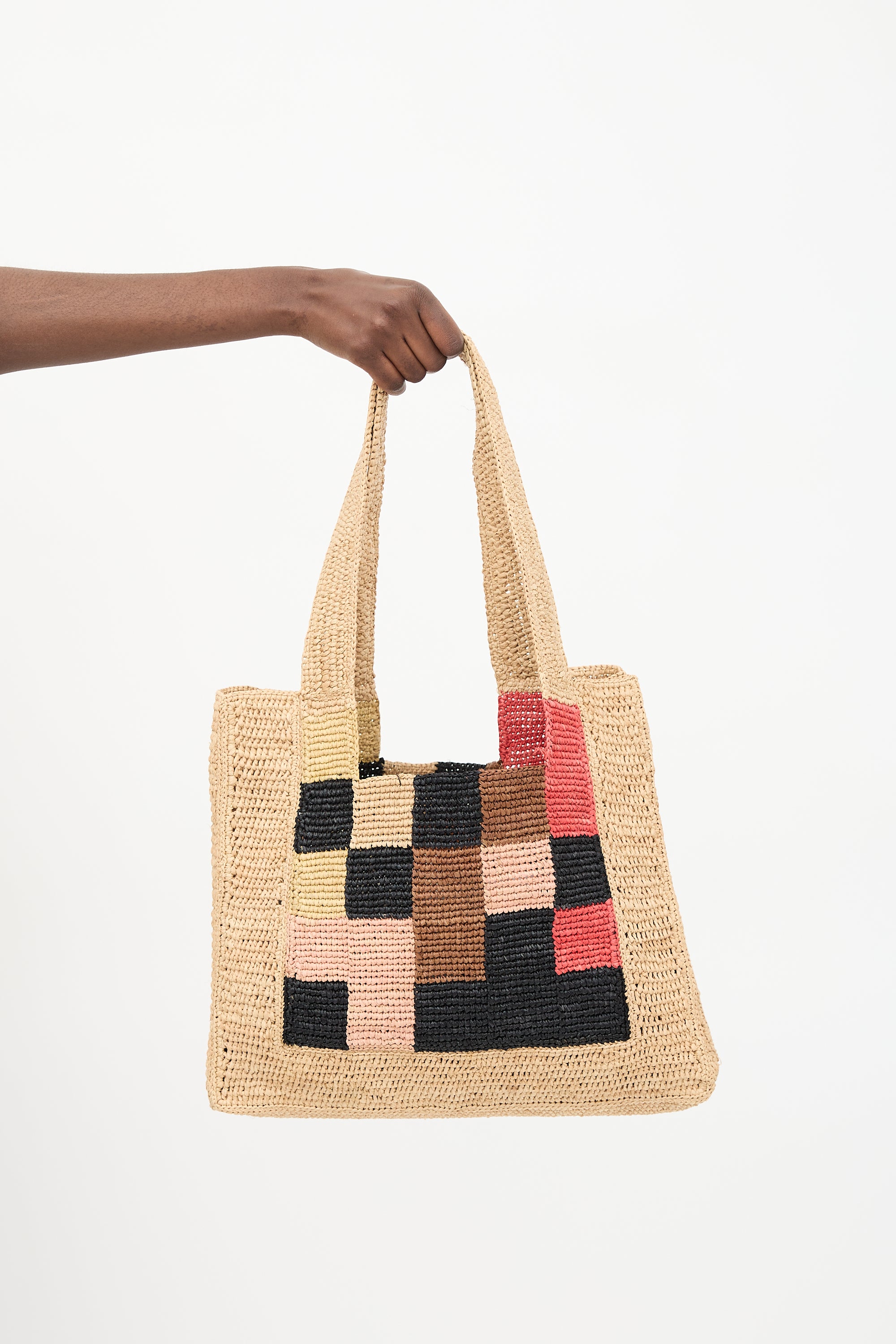 Pre-owned Sandro x Louis Barthélemy brown raffia tote bag featuring multicolour checkerboard panelling, dual flat shoulder straps, open top, and one main compartment.