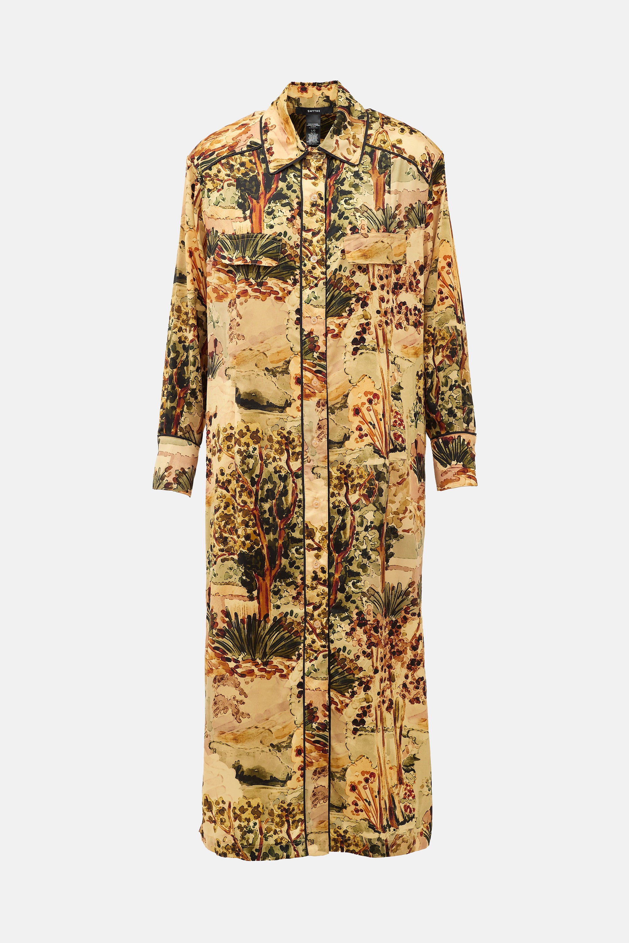 Pre-owned Smythe satin maxi shirt featuring a multicolour forest print, black piped trim, spread collar, padded shoulder, button front, and side vents.