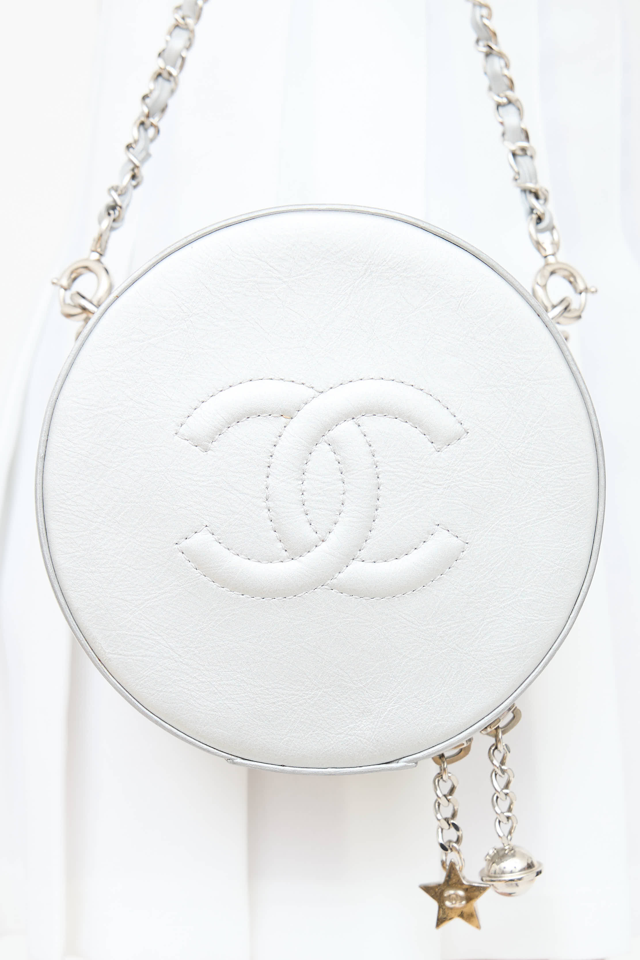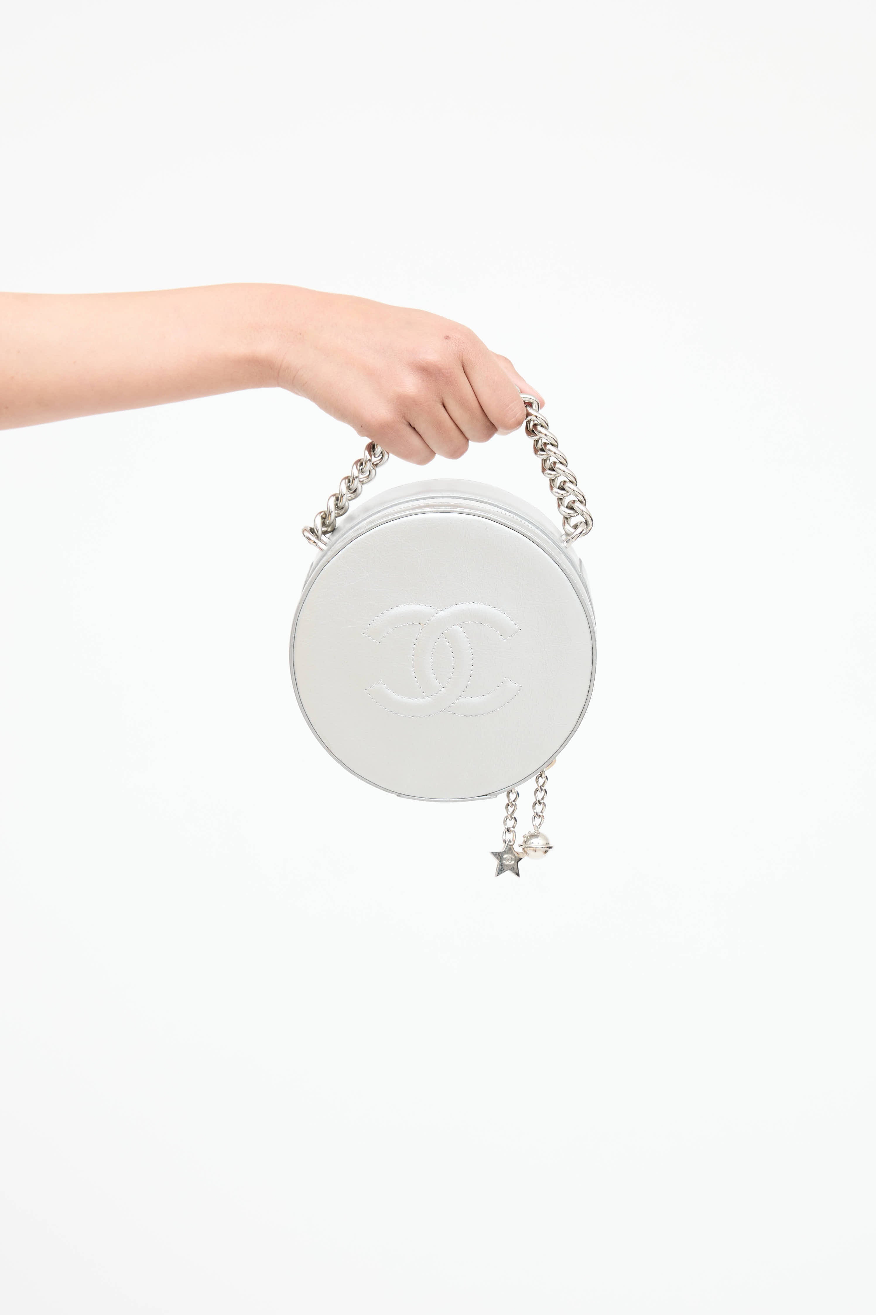 Pre-owned Chanel 25 Series silver Round As Earth leather bag featuring an embroidered logo at front, silver tone chain link top handle, one main compartment with one slip pocket, removable braided leather and chain shoulder strap, and top zip closure with planet pull charms. From the 2018 Collection by Karl Lagerfeld.