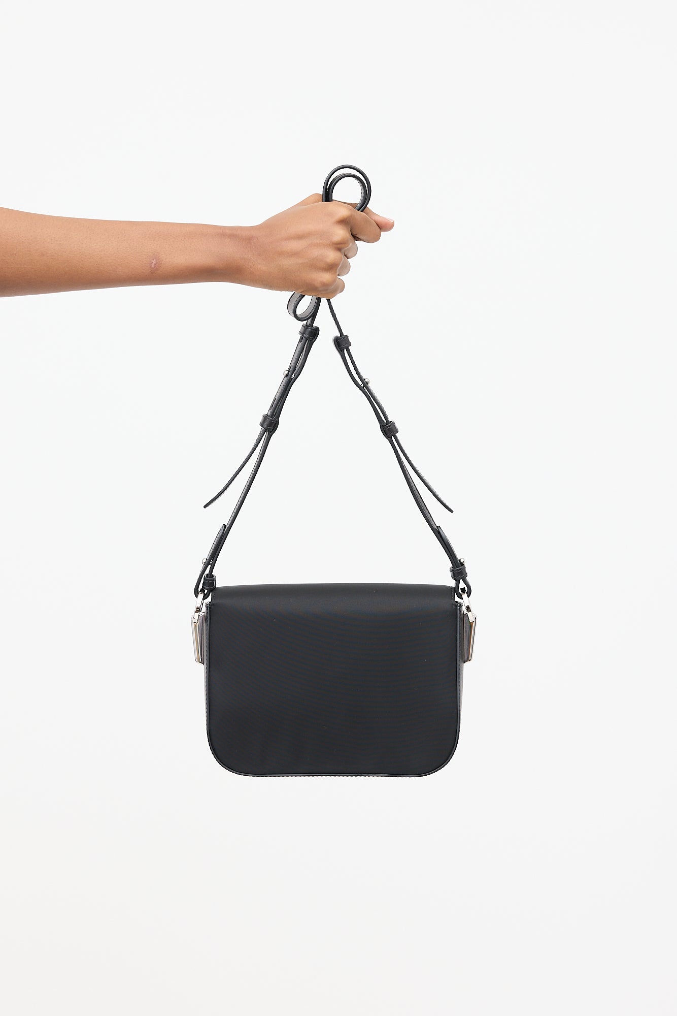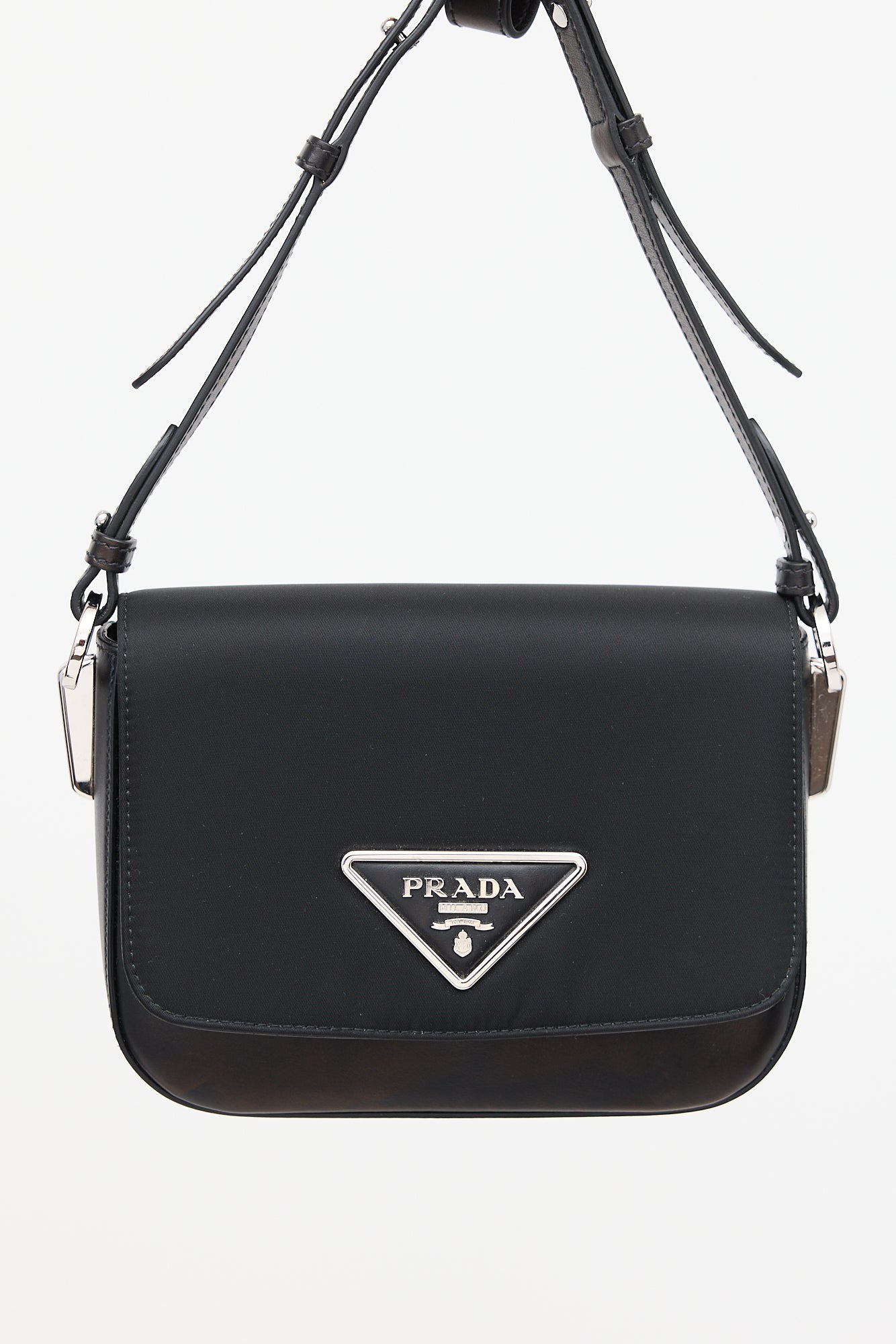 Pre-owned Prada black Identity Logo Plaque shoulder bag featuring nylon and leather body, tonal stitching, silver tone hardware, removable chain link shoulder strap, removable and adjustable leather crossbody strap, front flap with signature triangle logo, magnetic closure, logo stamp under flap, and one lined main compartment with one slip pocket. Comes with original dust bag, care guide, and certificate of authenticity card.