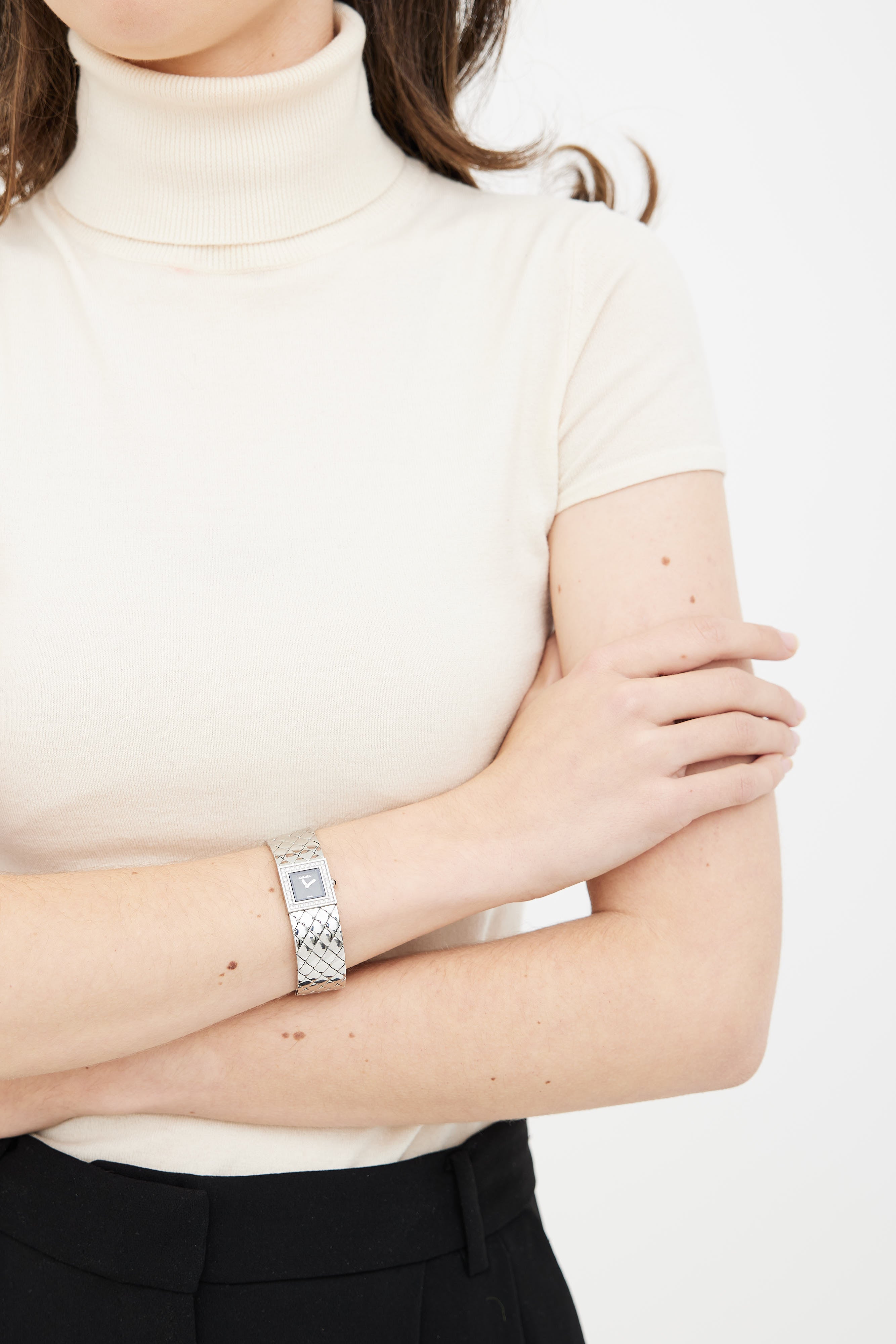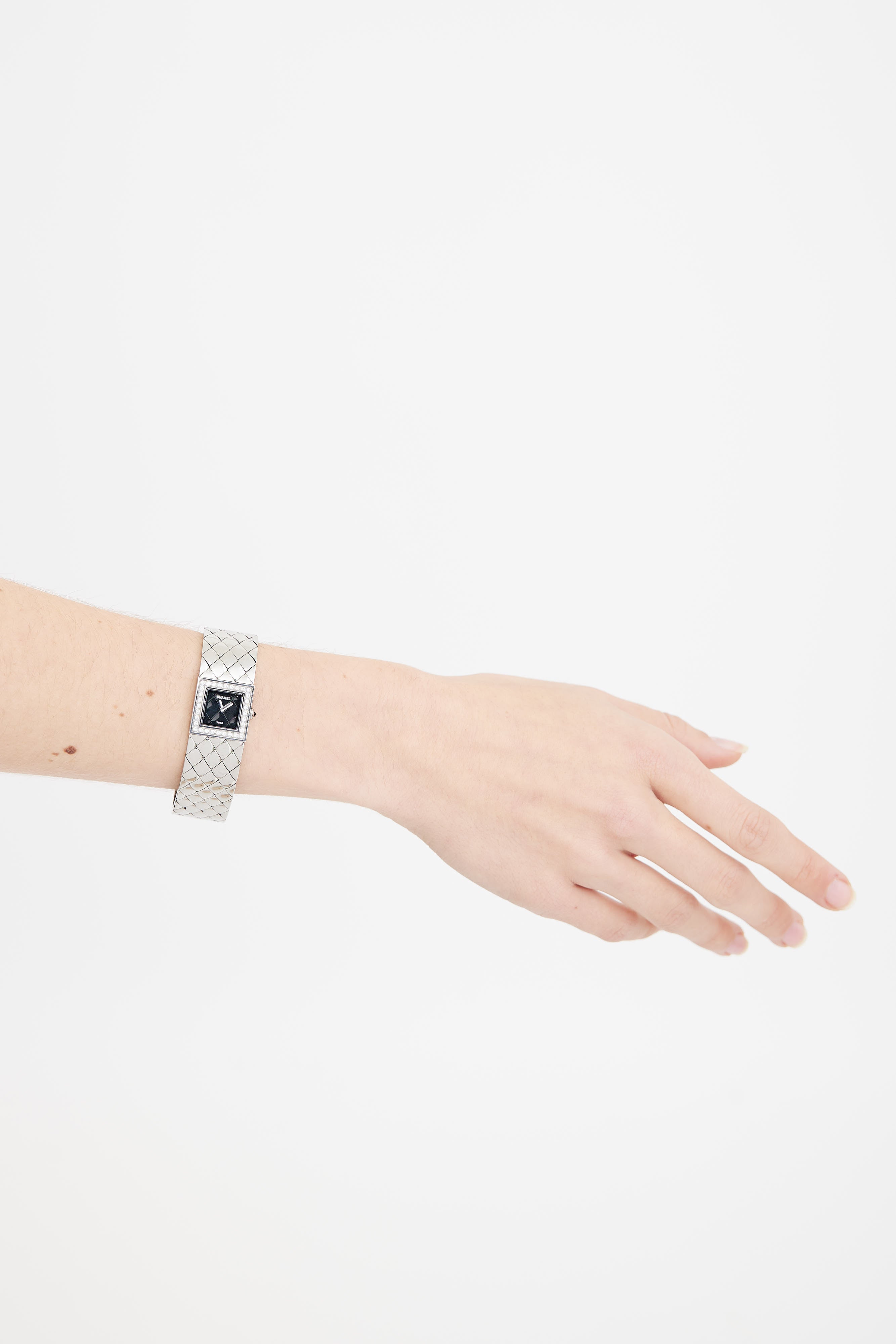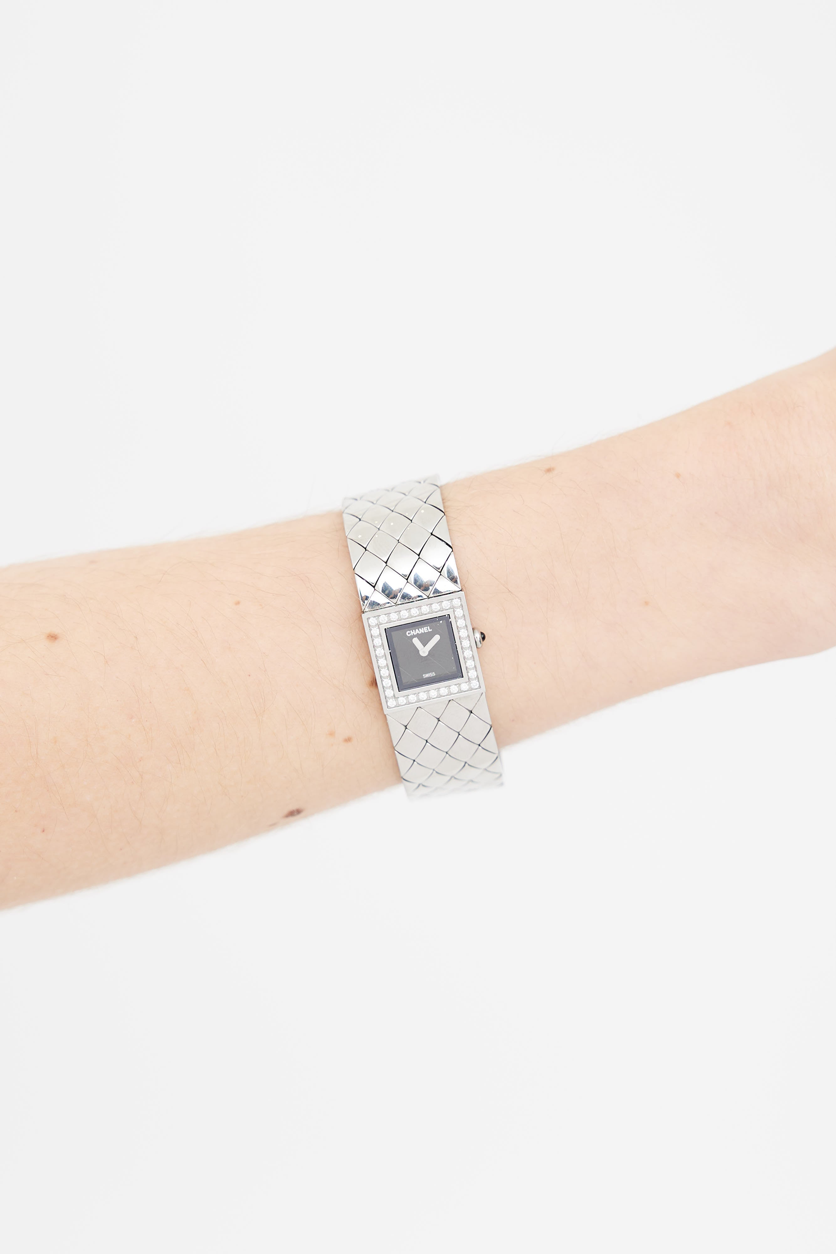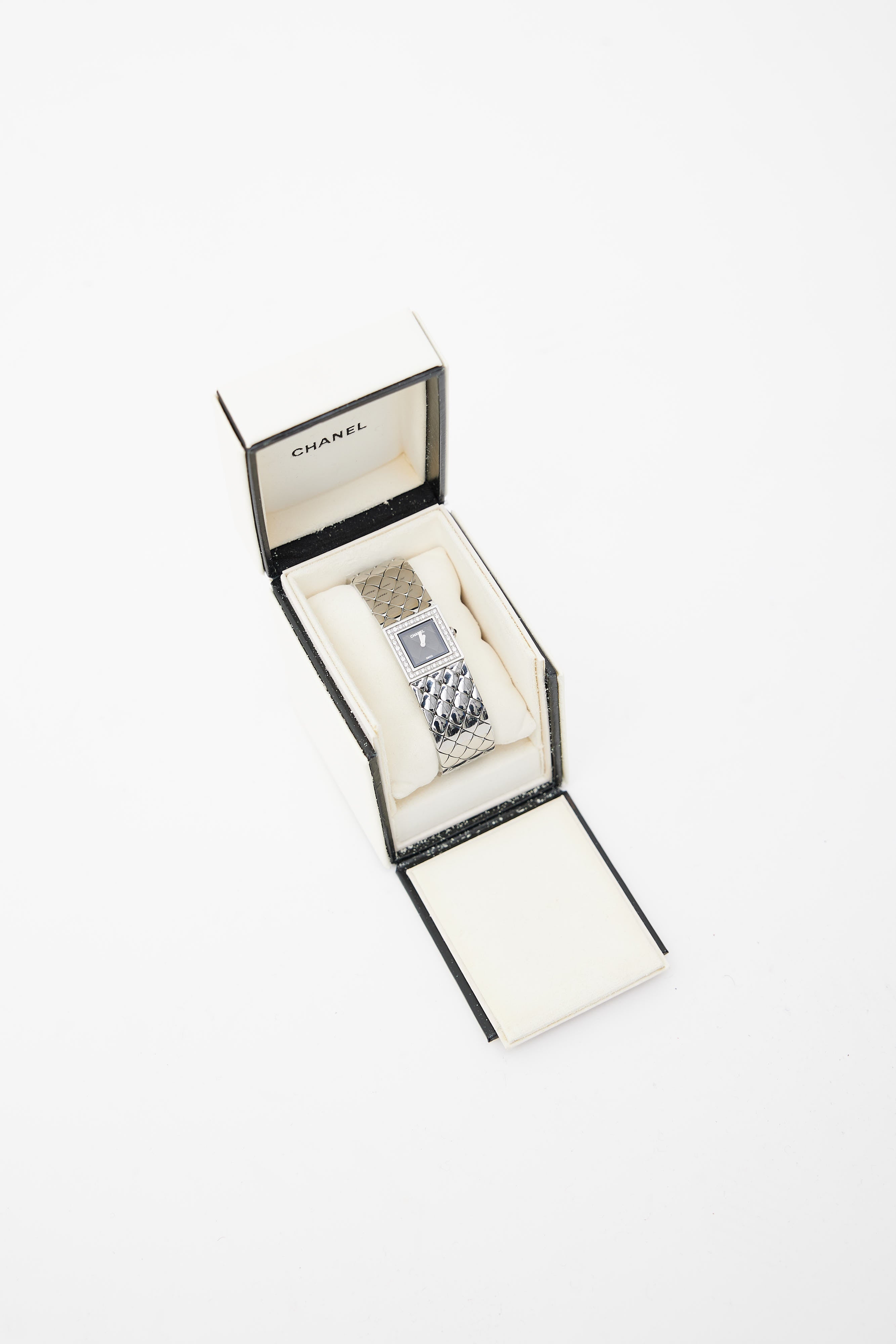 Pre-loved Chanel 1993 Swiss-Made steel watch in silver featuring quilted diamond-shape band, folding clasp closure, square shaped black face with diamond encrusted border and silver arms. Comes with original box.