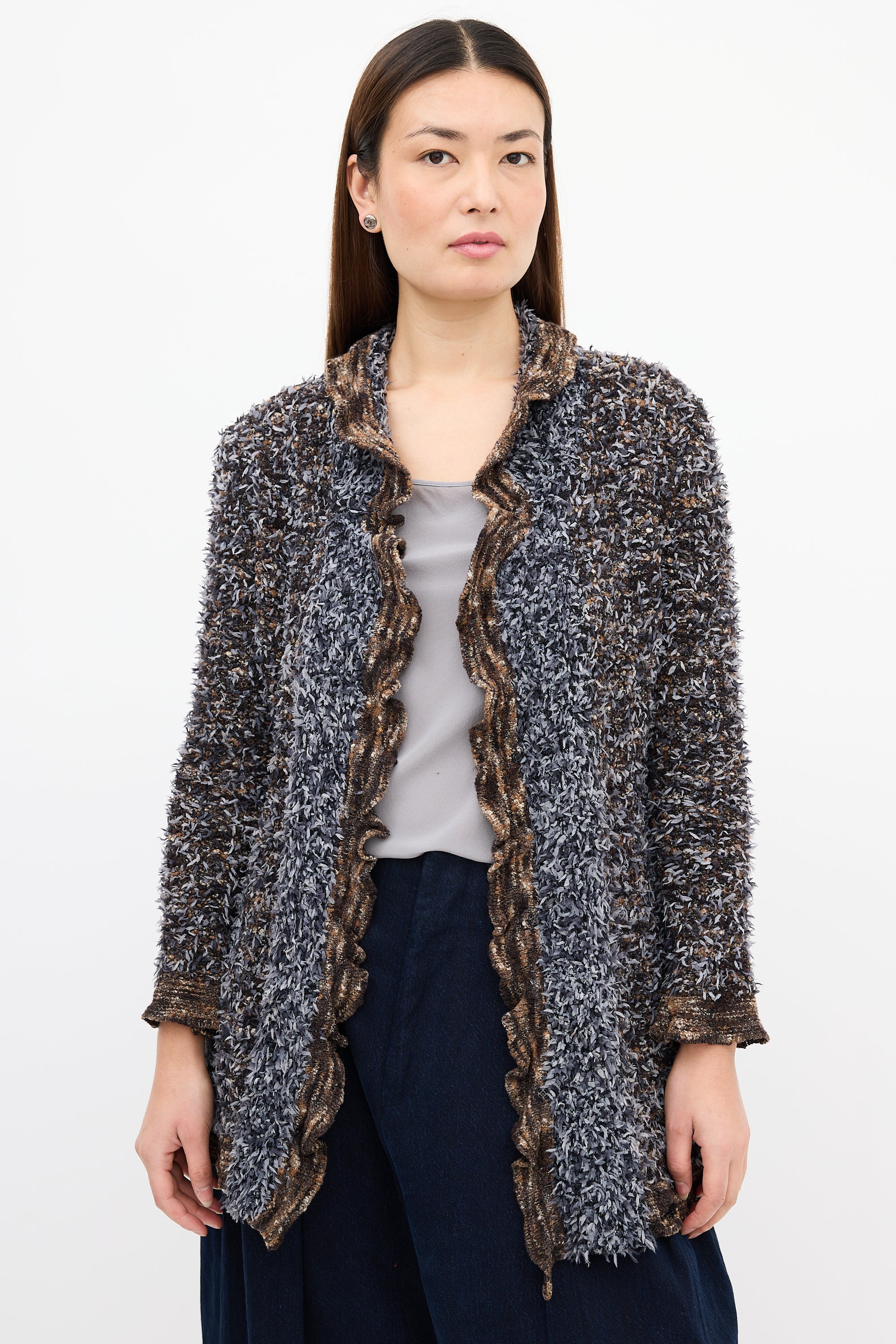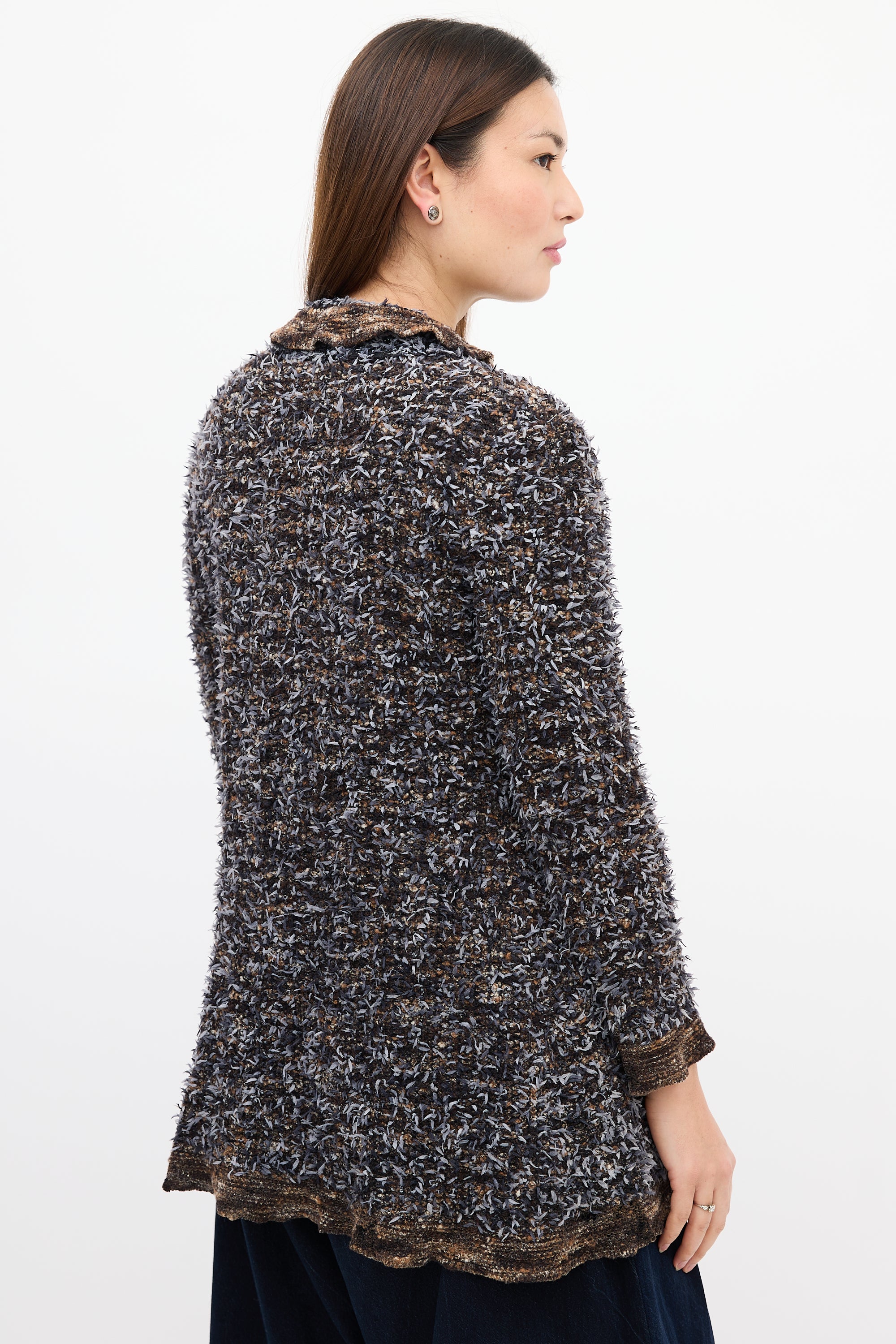 Pre-owned Chanel Fall 1997 blue and brown Fringed Fantasy cardigan featuring signature fringe tweed, open front, and marled ruffle trim at edges, hem, and cuffs.